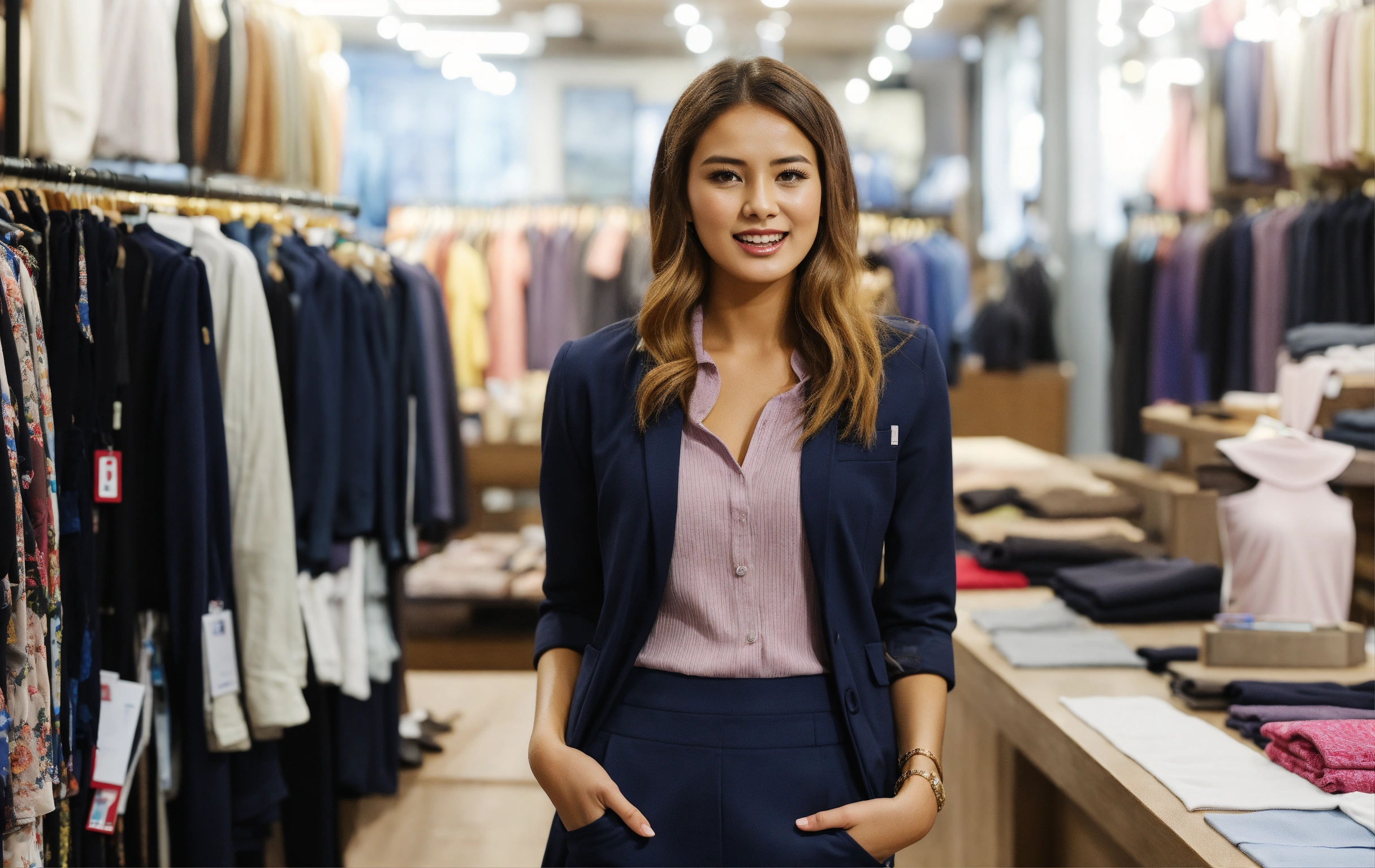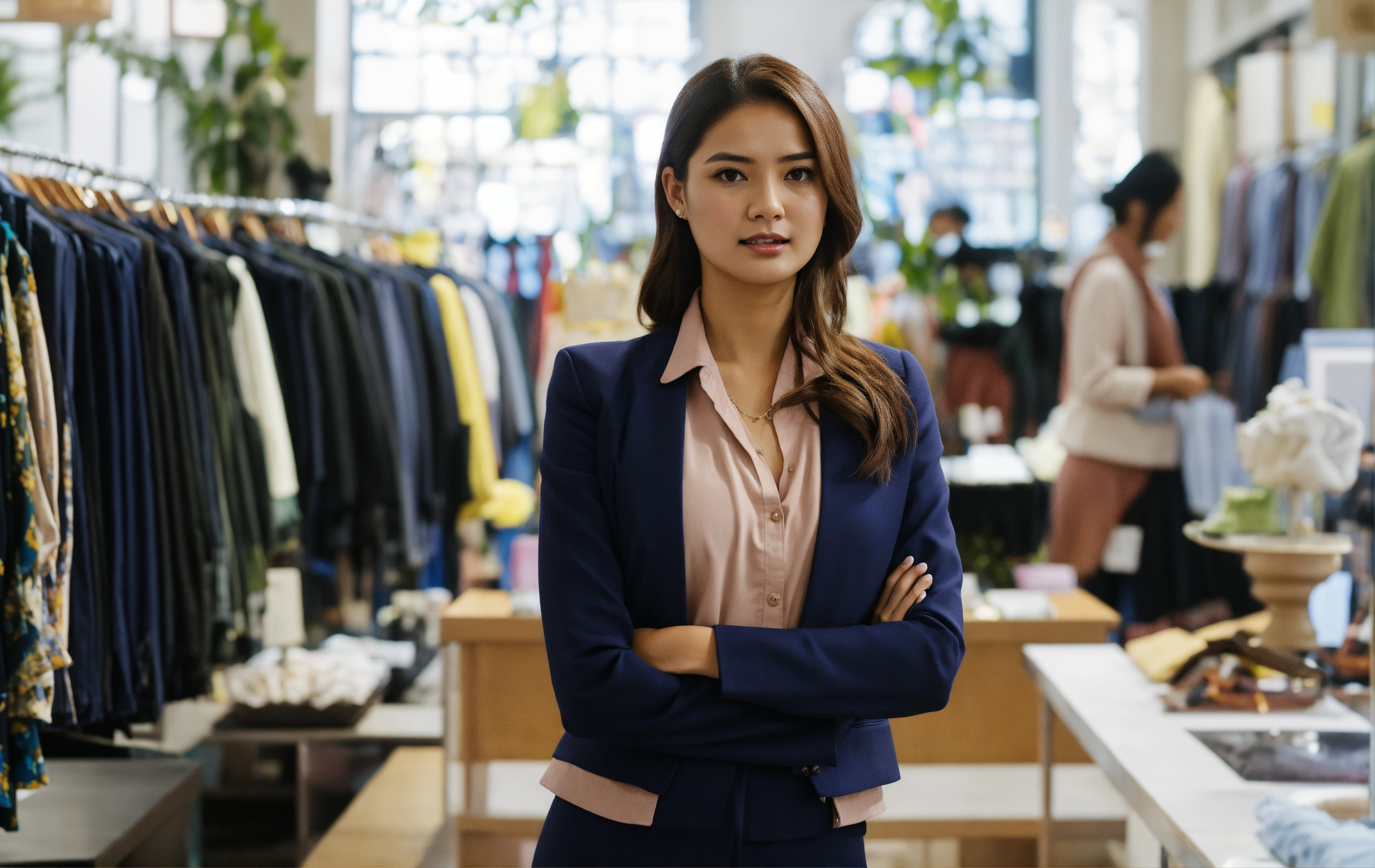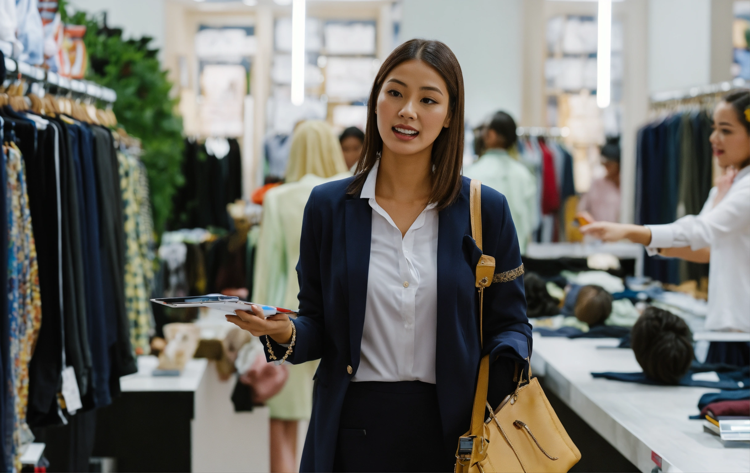 A sales girl standing talking to manager in cloth store