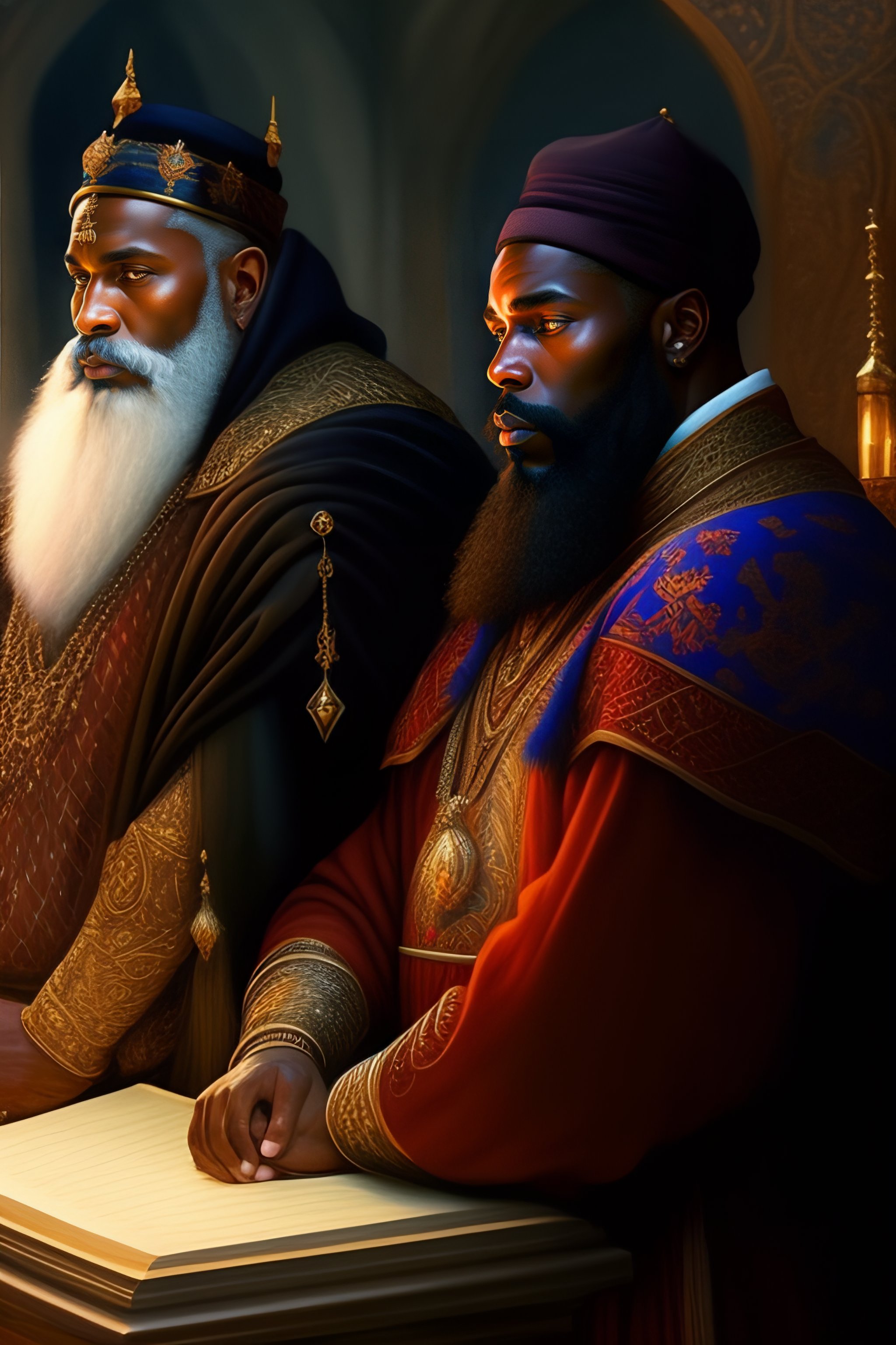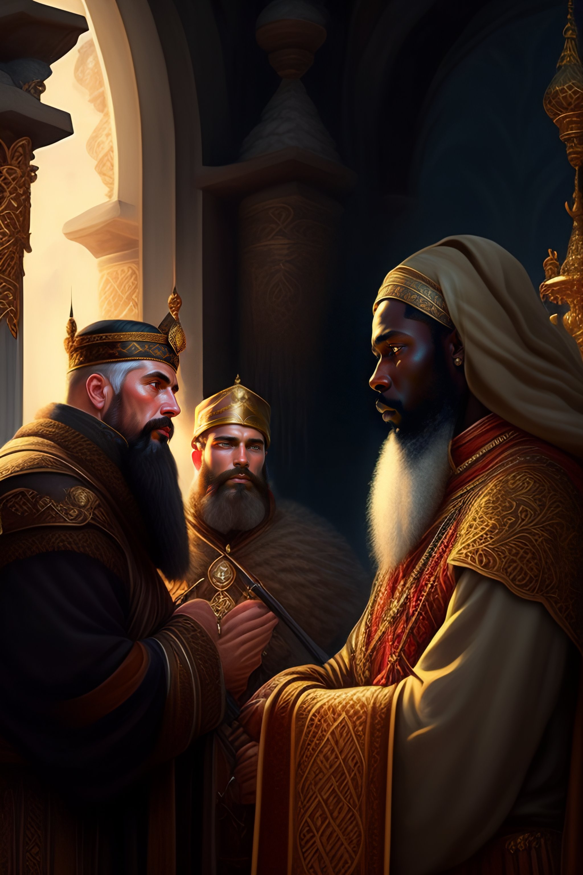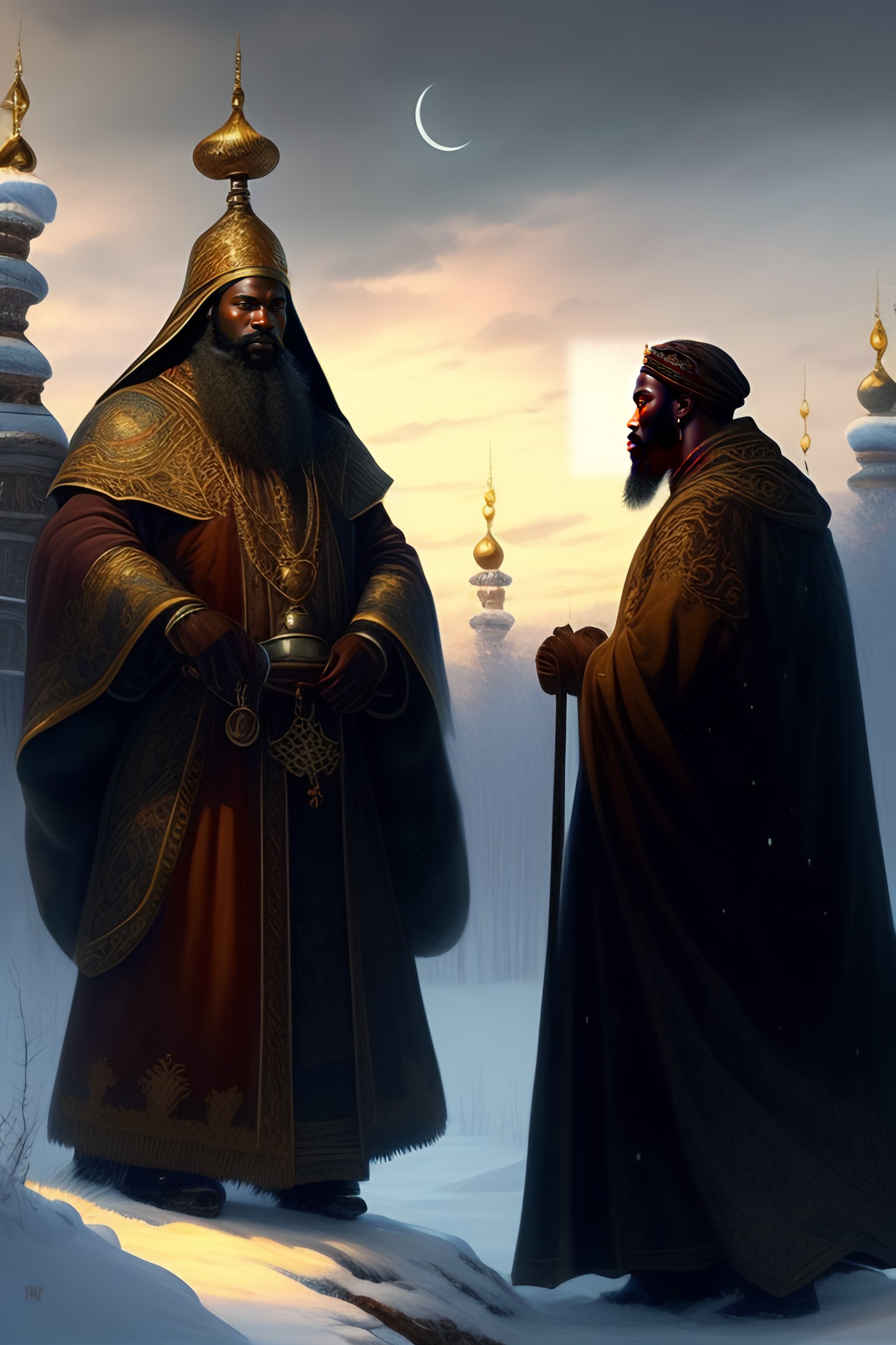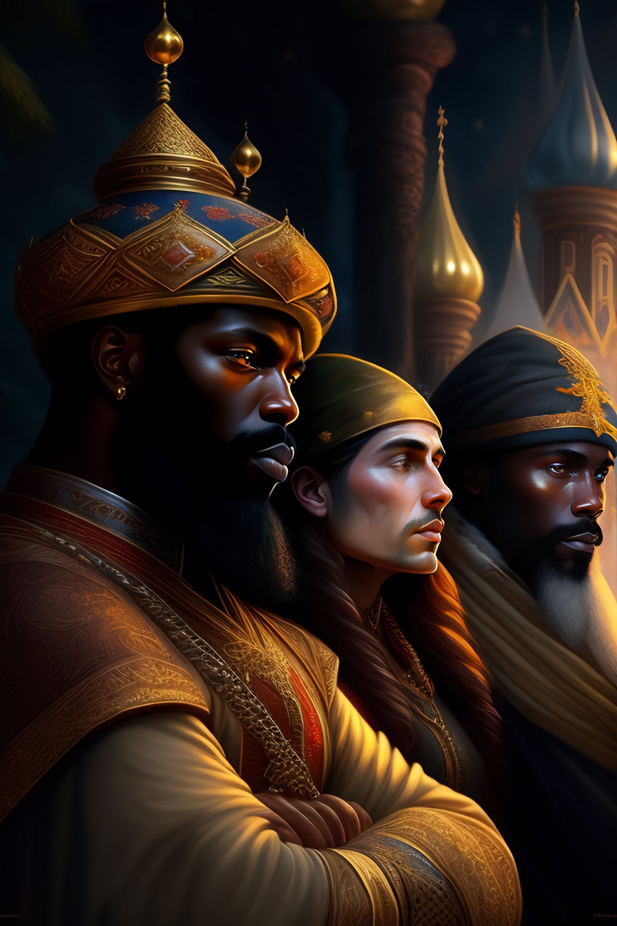 Russian folk fairytale, story, three wise men, three bizzard kings, one black man, praying, fable, dramatic, fantasy art, matte painting, an ultrafine detailed painting, academic art, ornate, inticate, elegant, sharp focus, artstation, by pavel korin, viktor vasnetsov