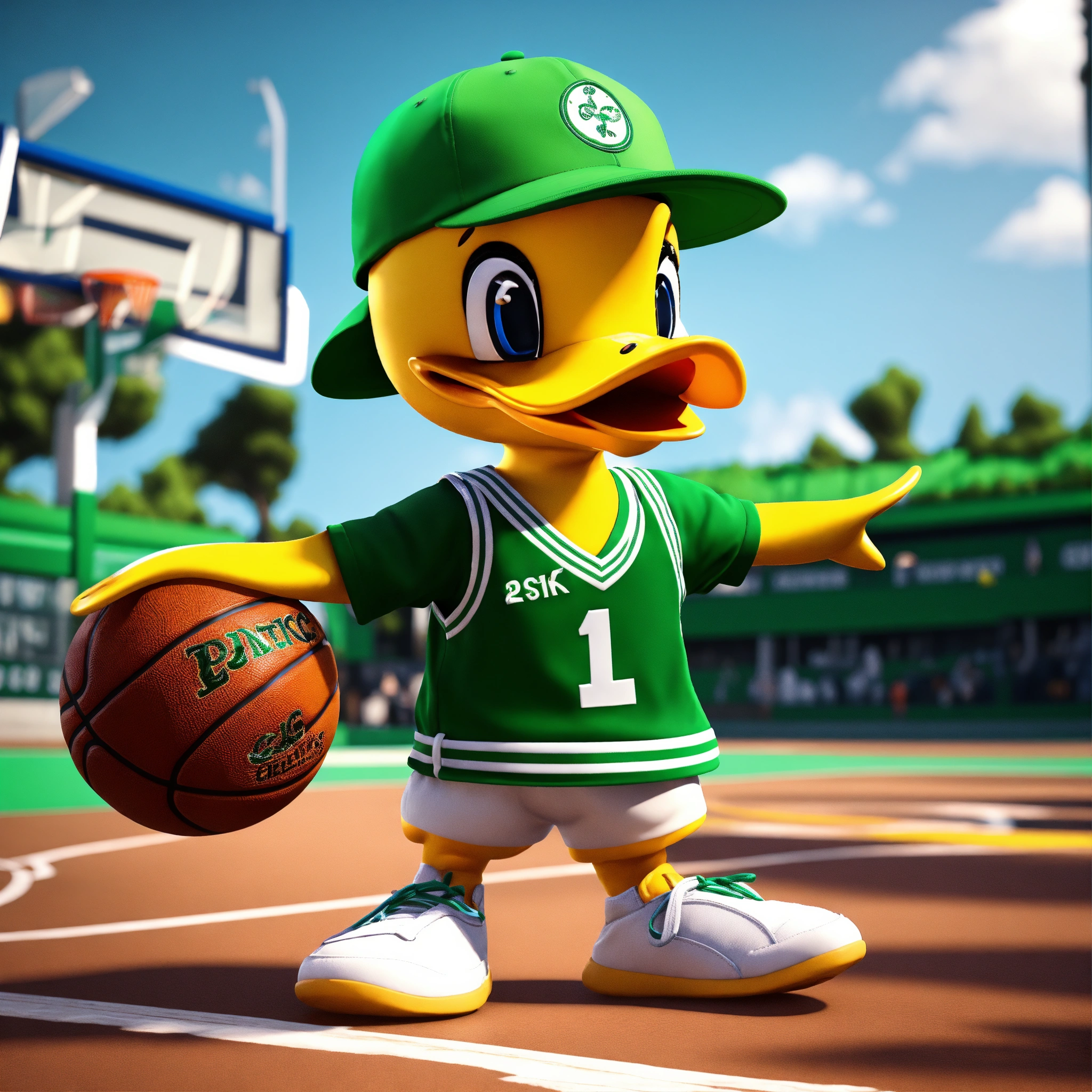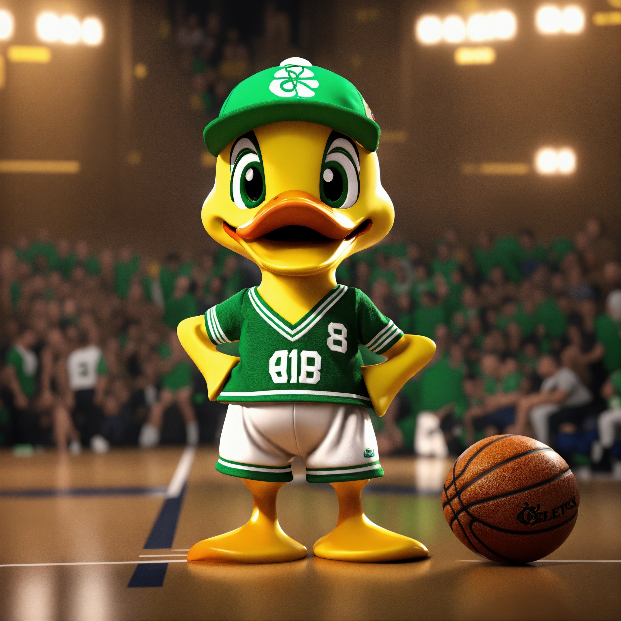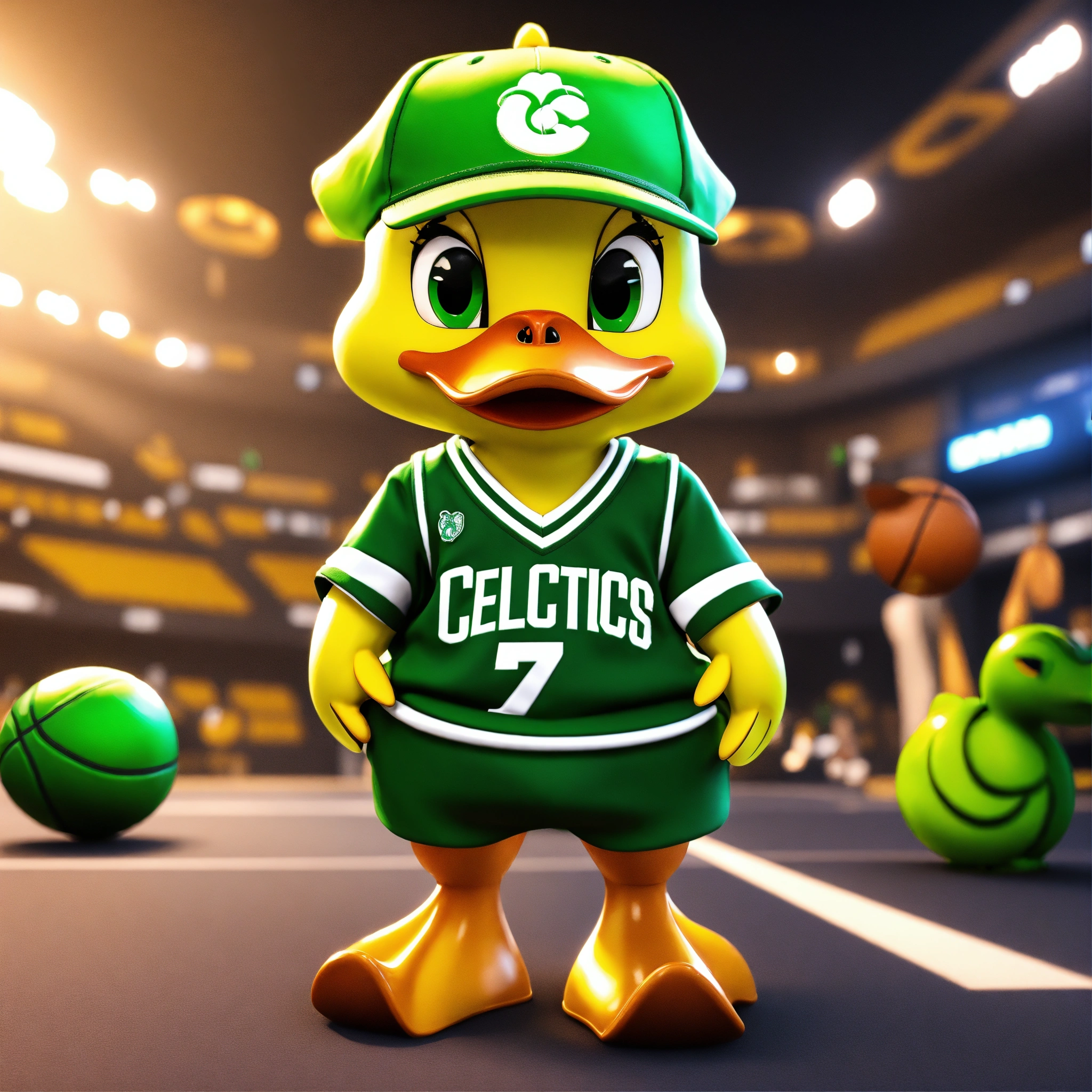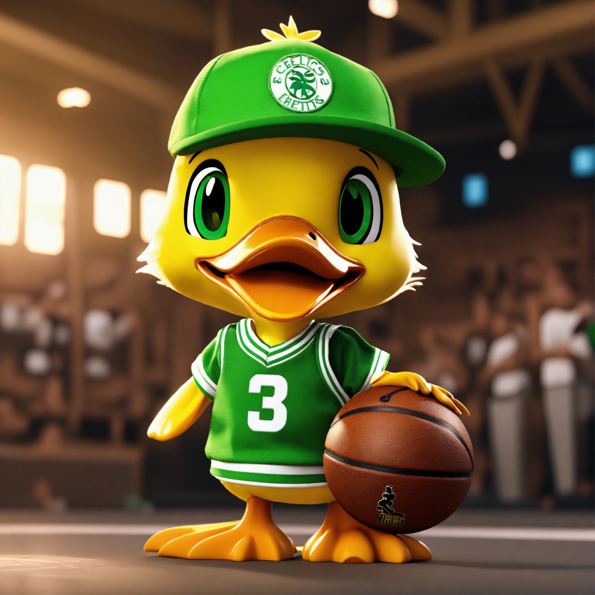 A cute yellow boy duck wearing celtics basketball jersey, green cap worn backwards, unreal engine render 8k