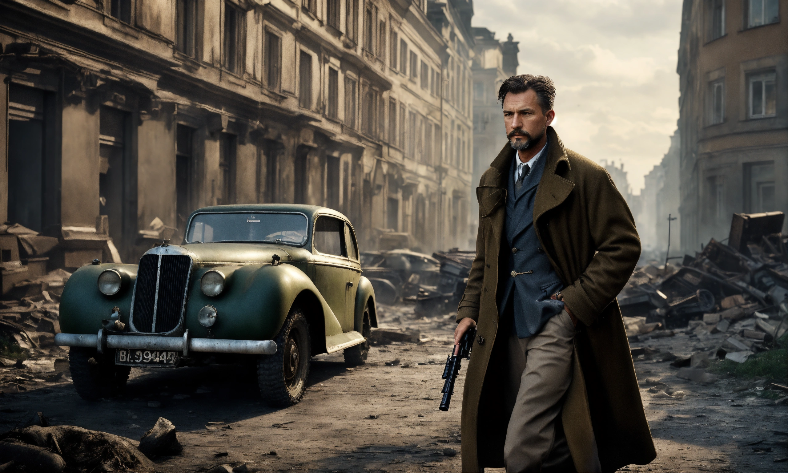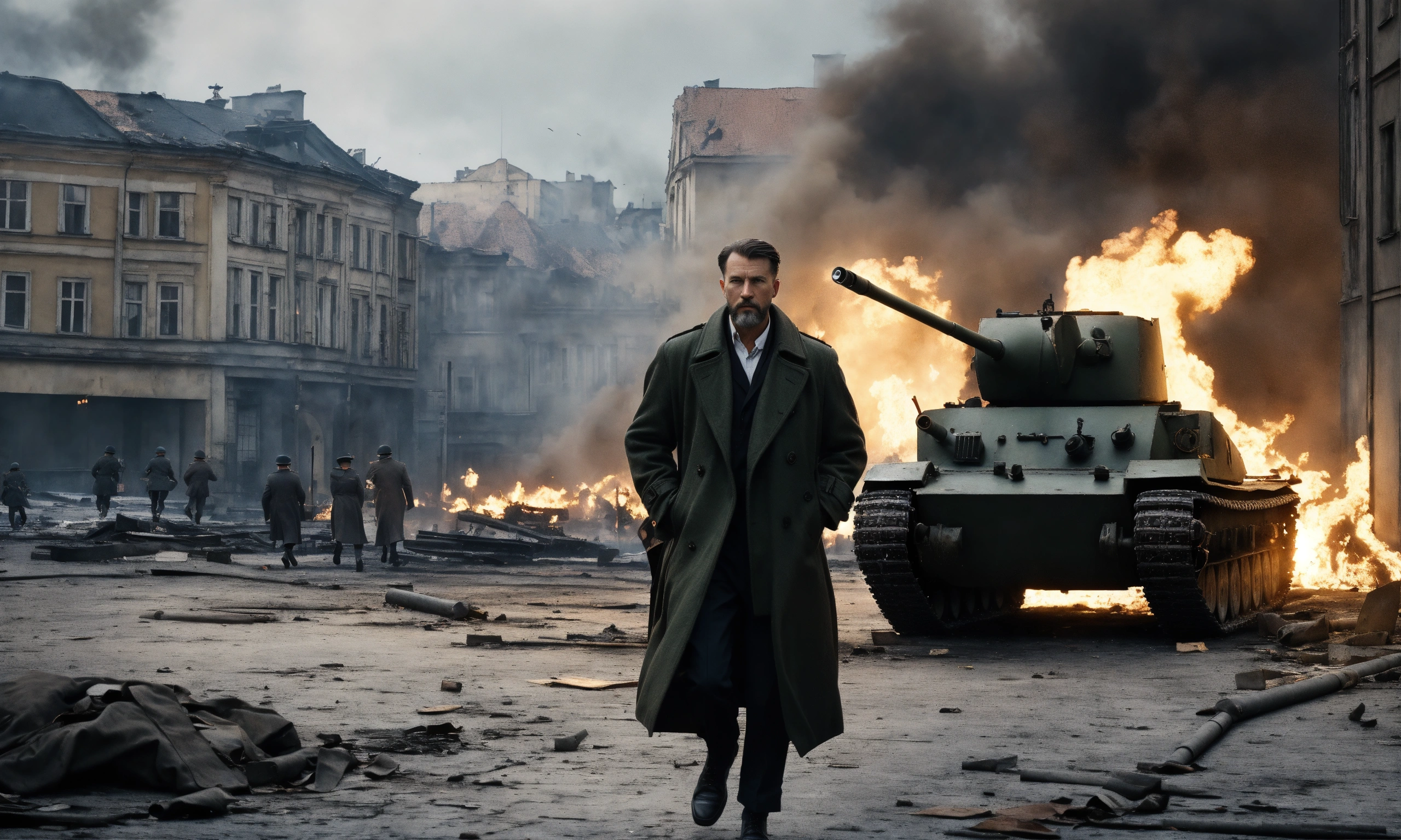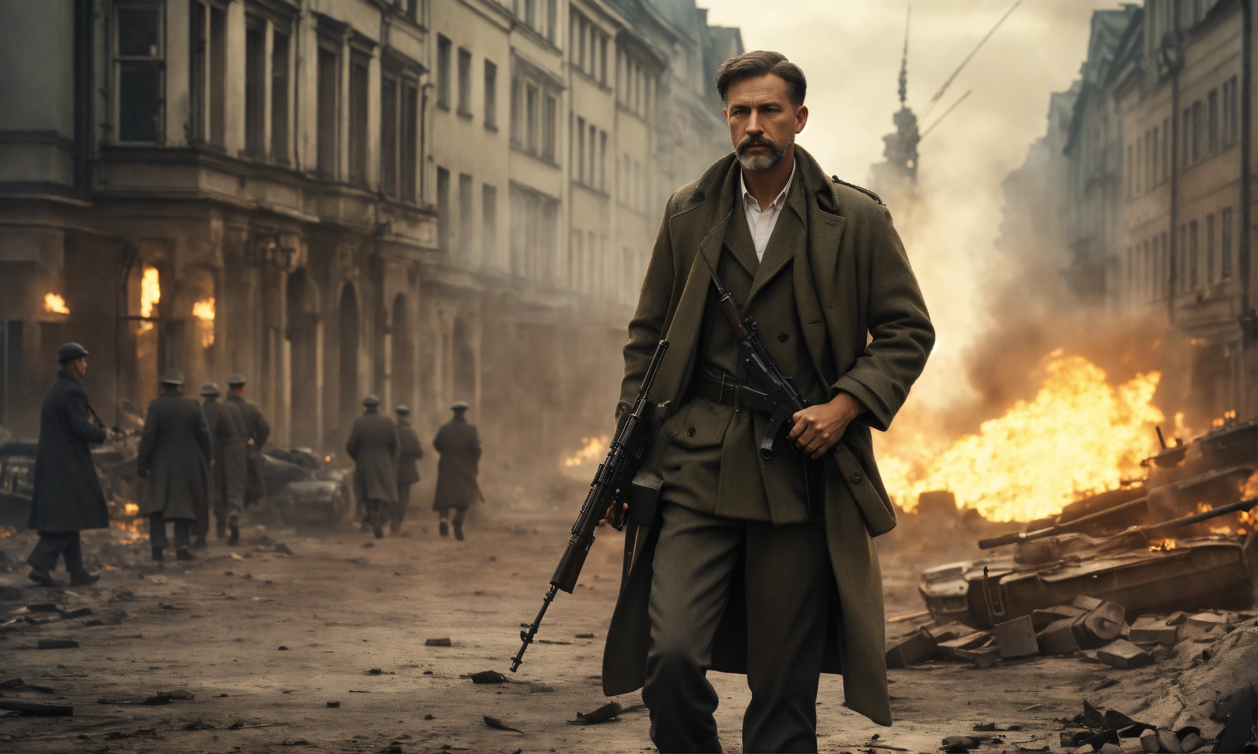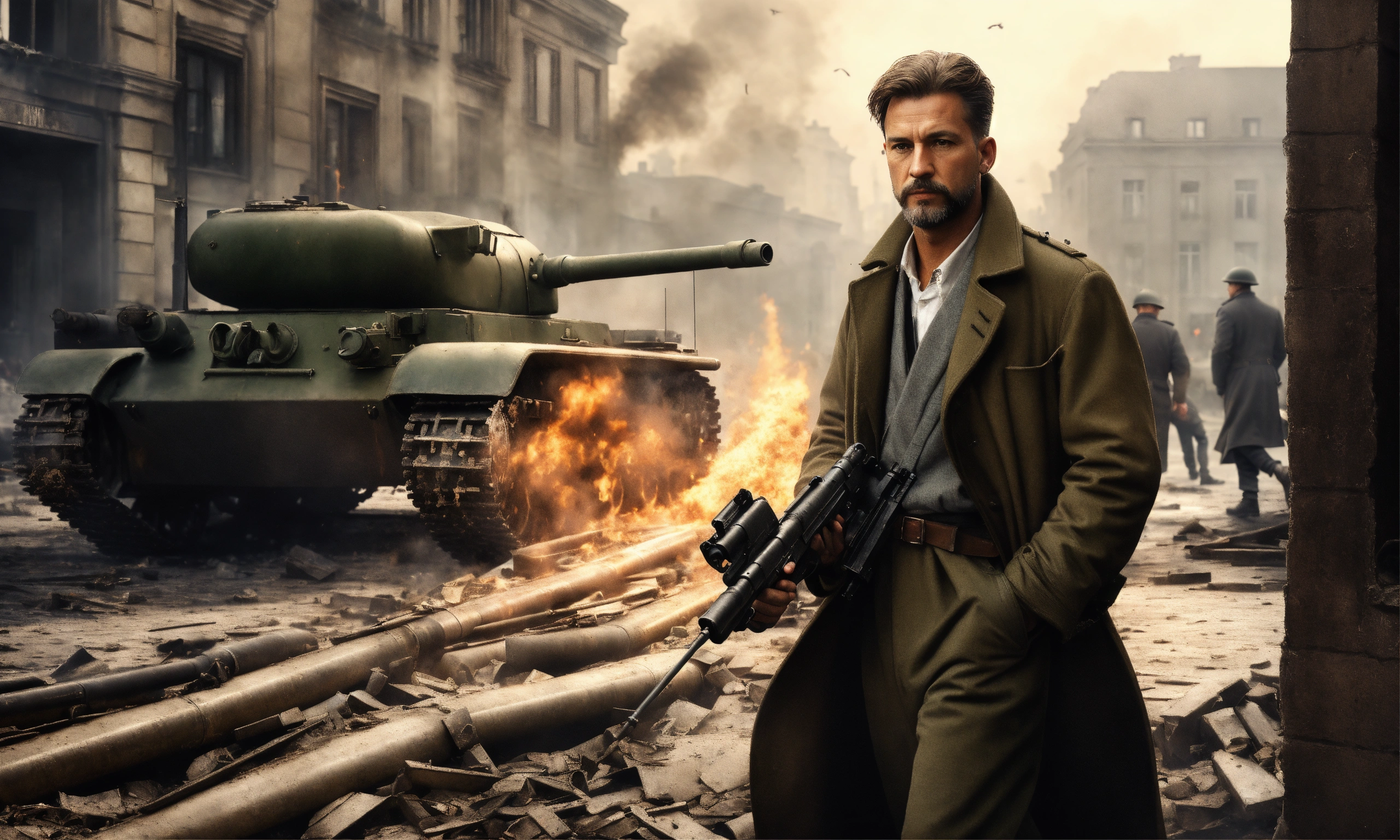 Cinematic wallpaper of a 1940s german man with an overcoat coat with a white shirt and cargo pants holding a machine gun, 45 years old with a short hair and a beard, realistic body proportions, in ruined warsaw poland in 1944 during the uprising with resistance fighters running in the background and a tank, cinematic, ultra detailed, grimdark, realistic, hd