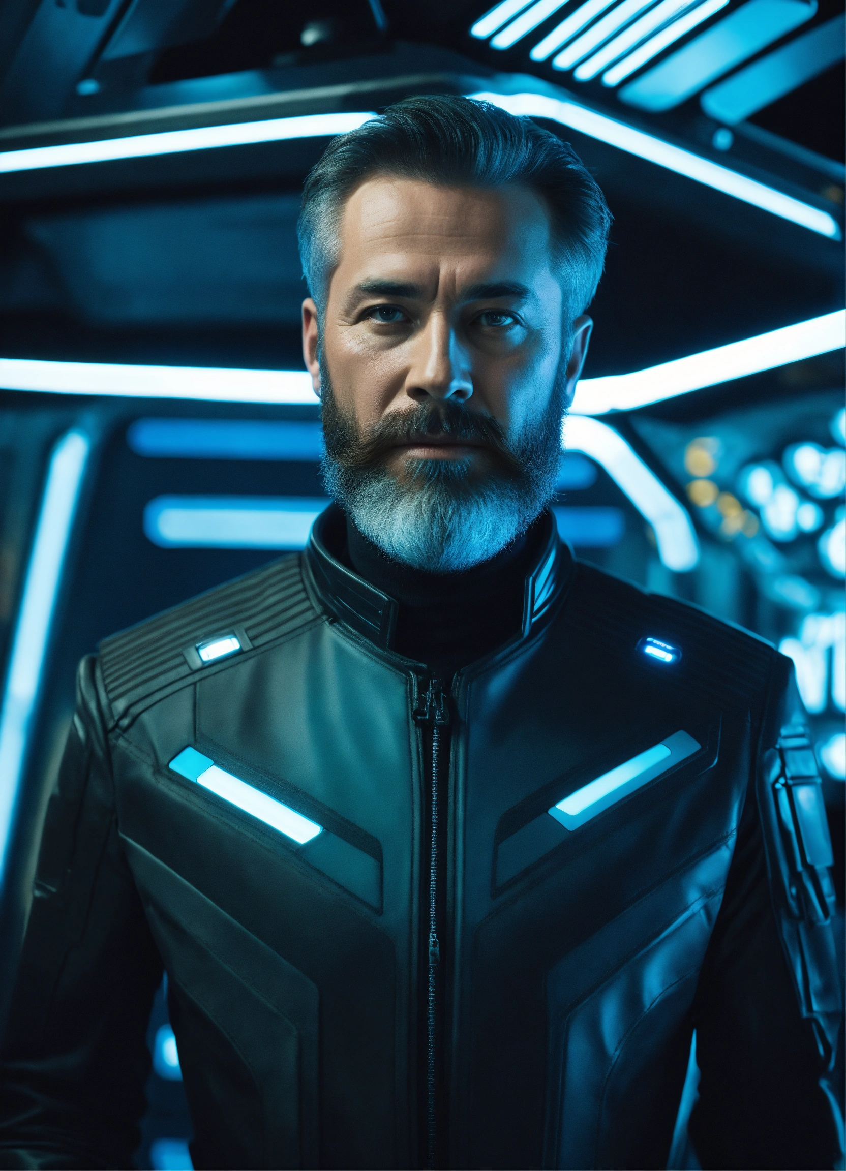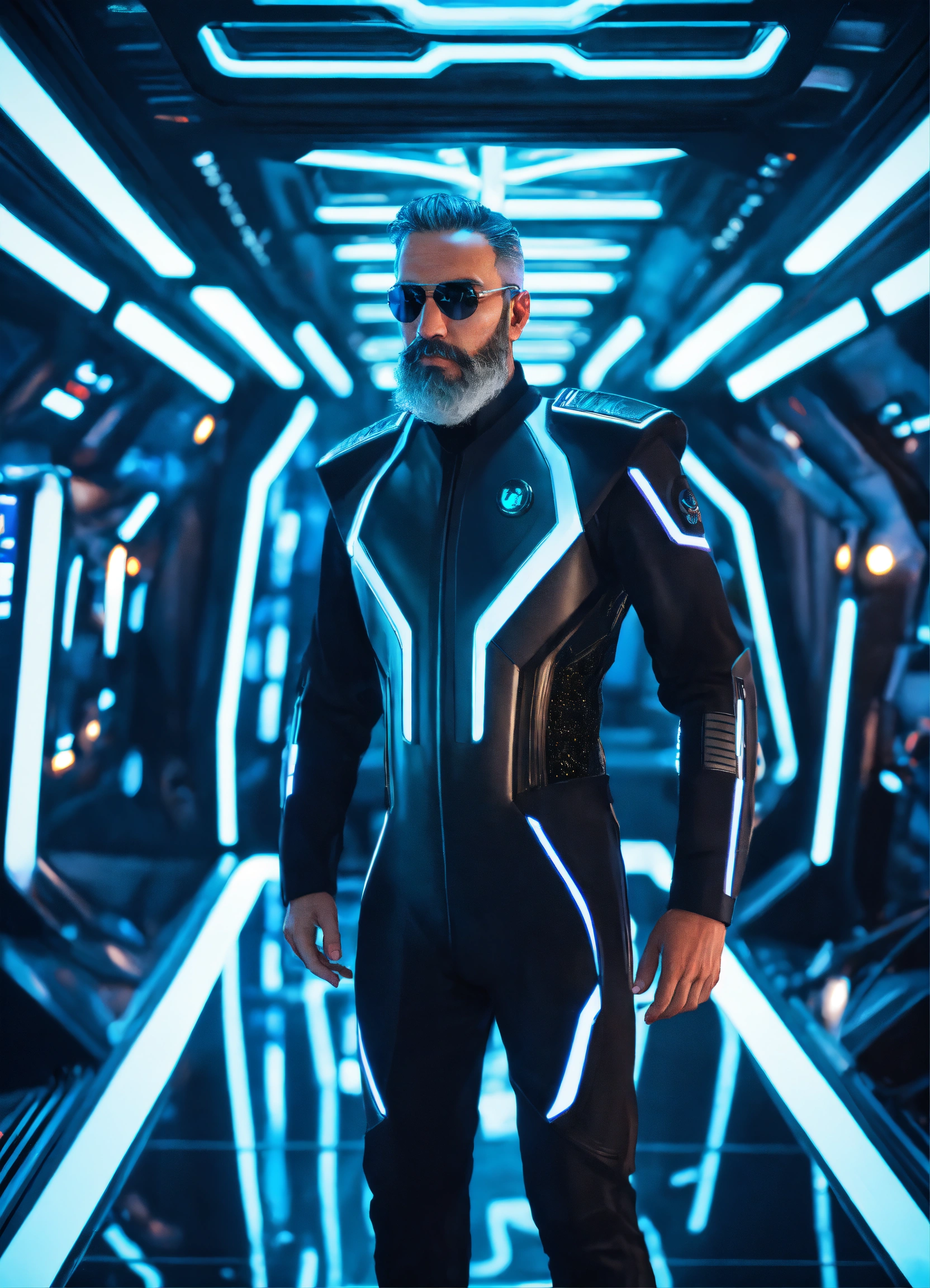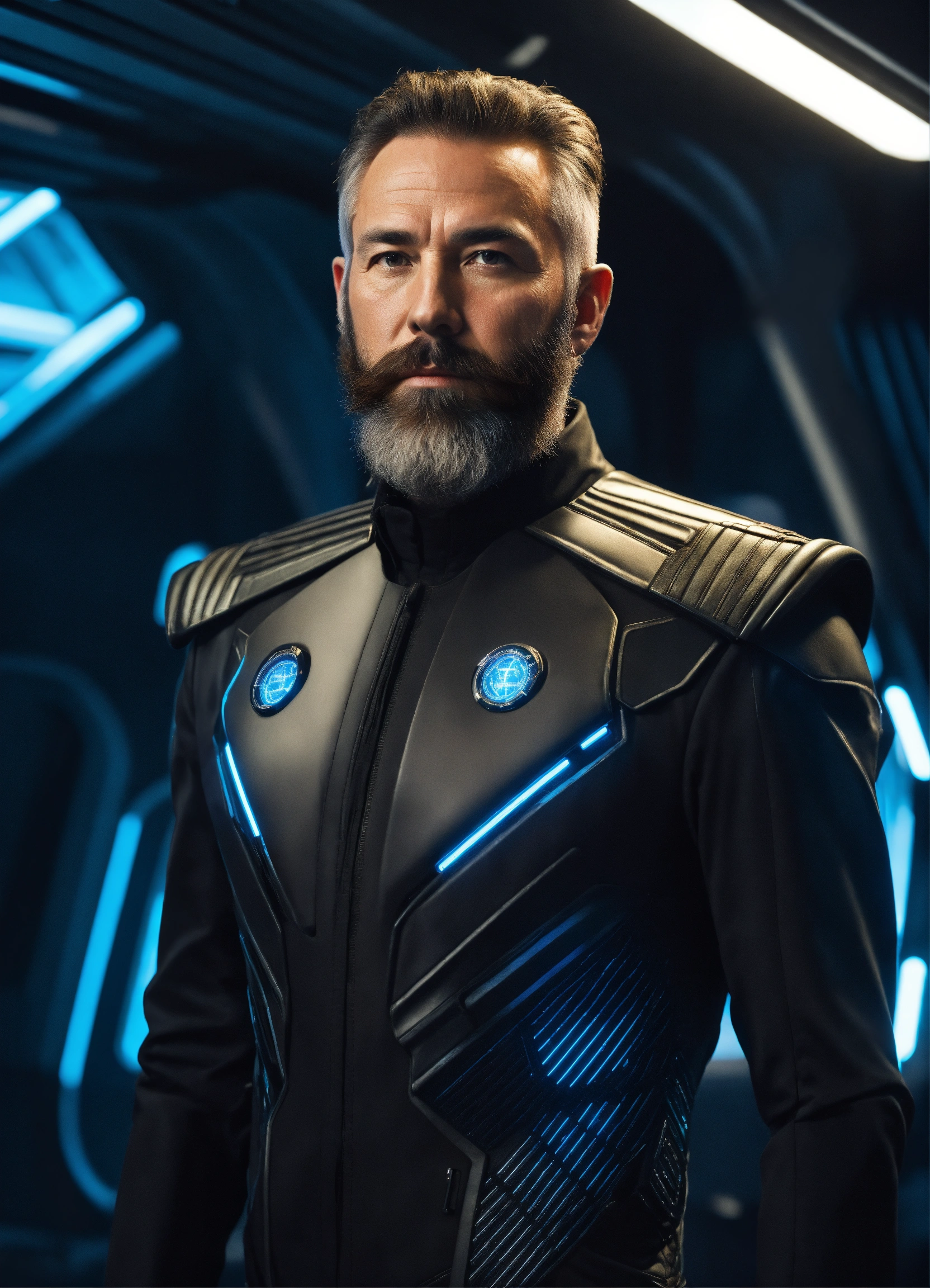 50 year old masculine star commander with trim beard is wearing a sleek futuristic uniform standing in a hi tech alien starship, 8k, tron