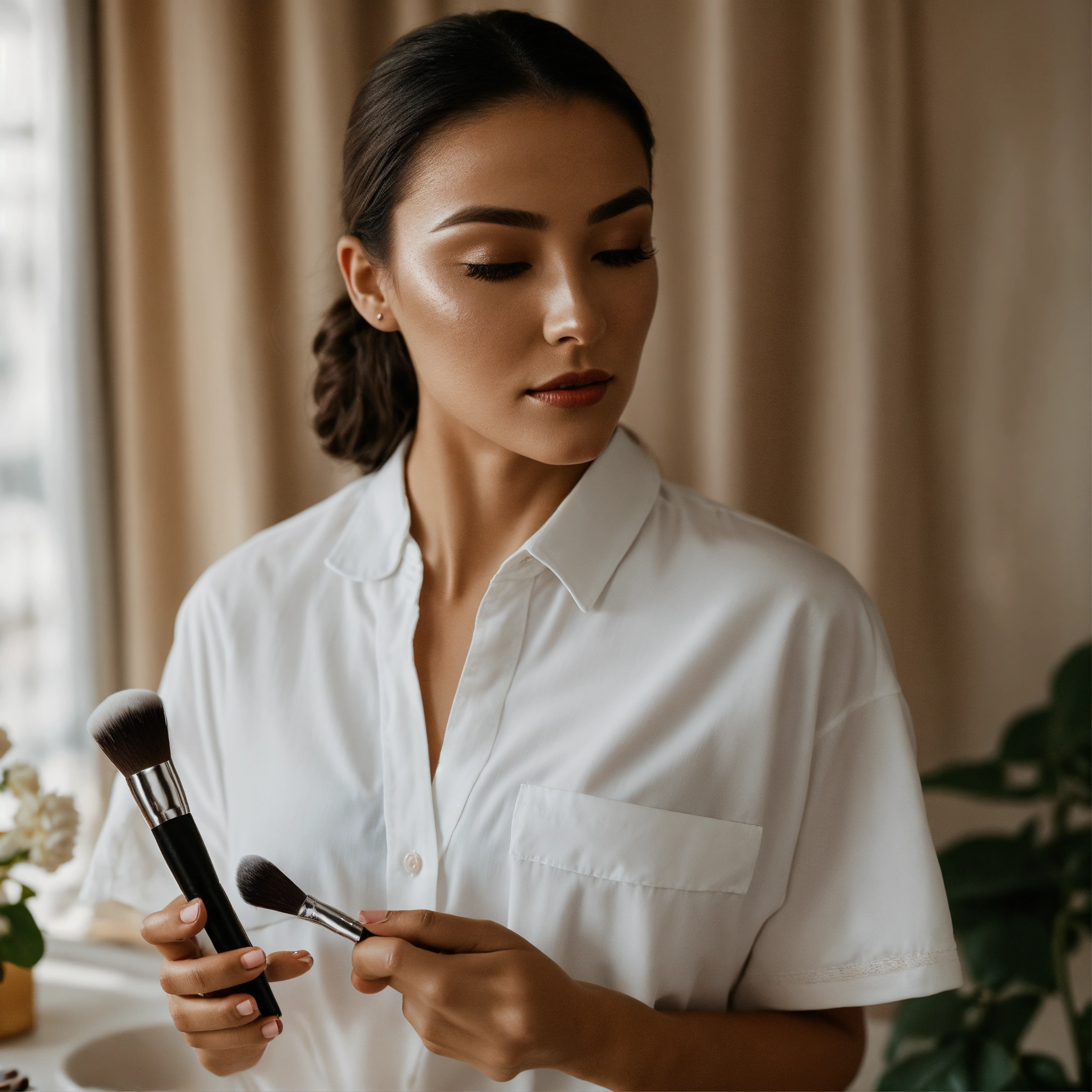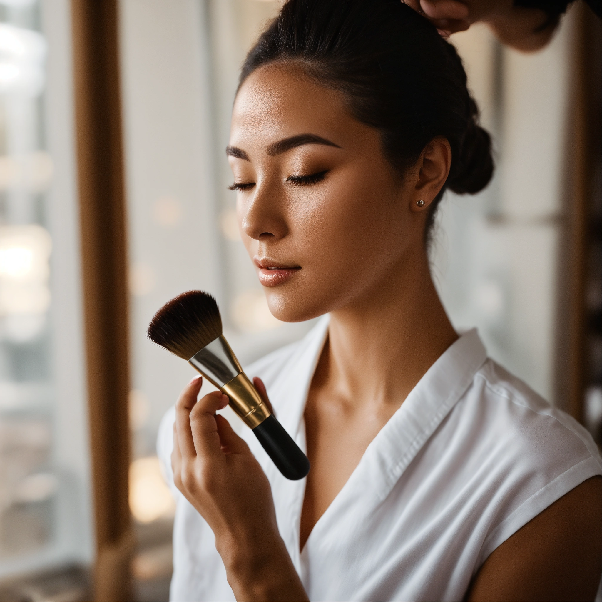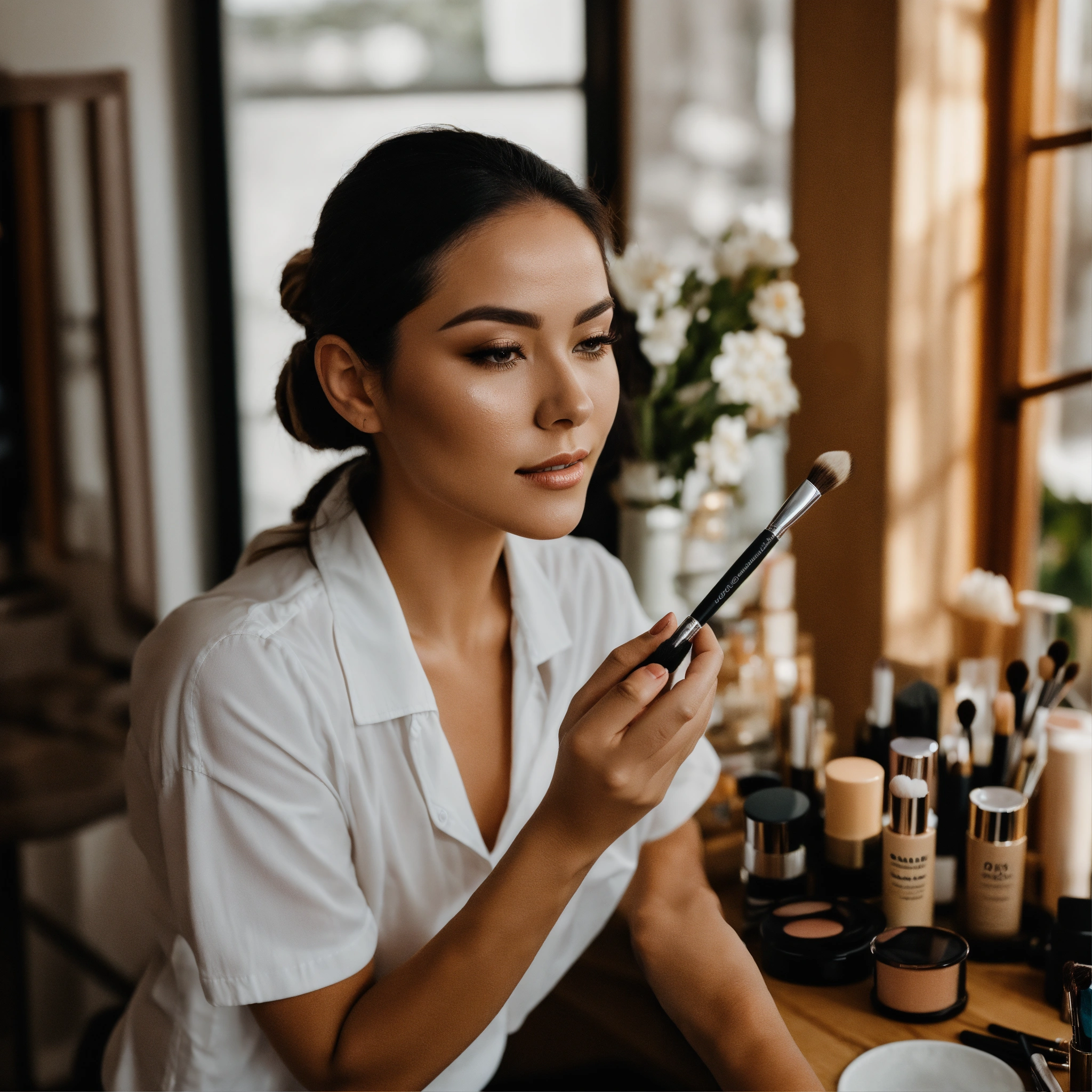 A photo of a woman applying makeup, the woman is wearing a white shirt and has a natural look, she is using a brush to apply foundation to her face
