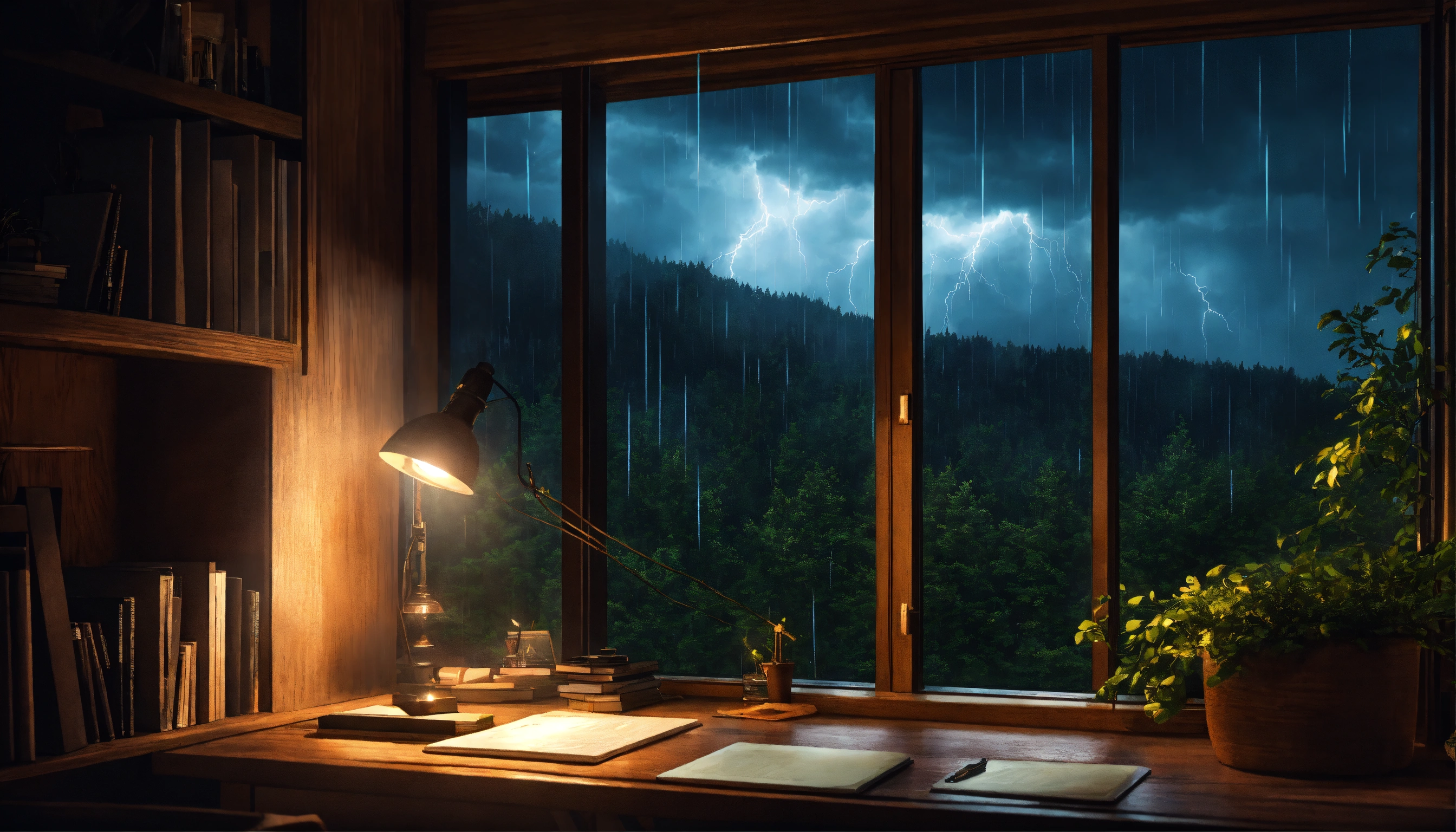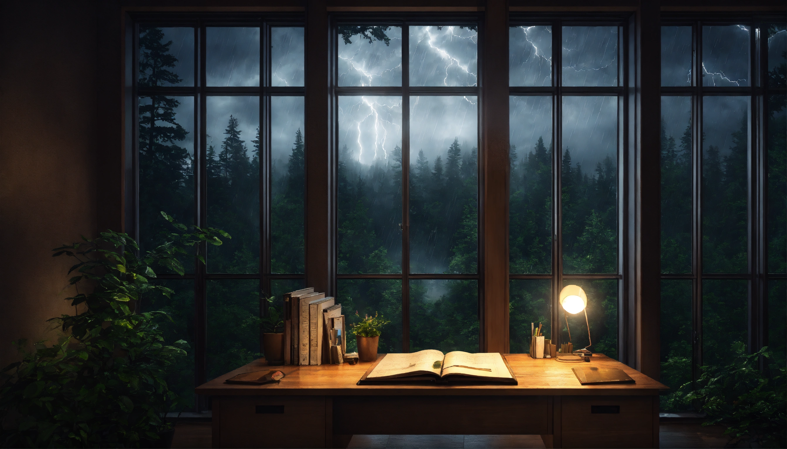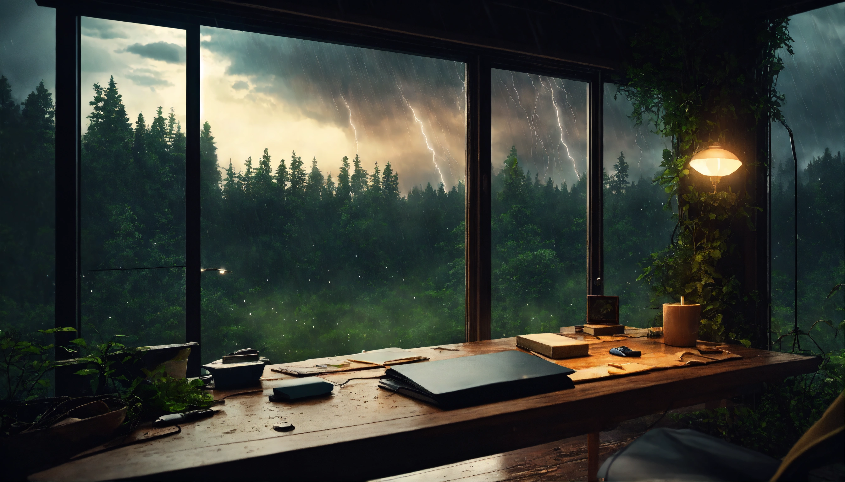 Beautiful cozy desk with floor to ceiling glass windows overlooking an enchanted forest at night, thunderstorm outside with torrential rain, detailed, high resolution, photorealistic, dark, gloomy, moody aesthetic