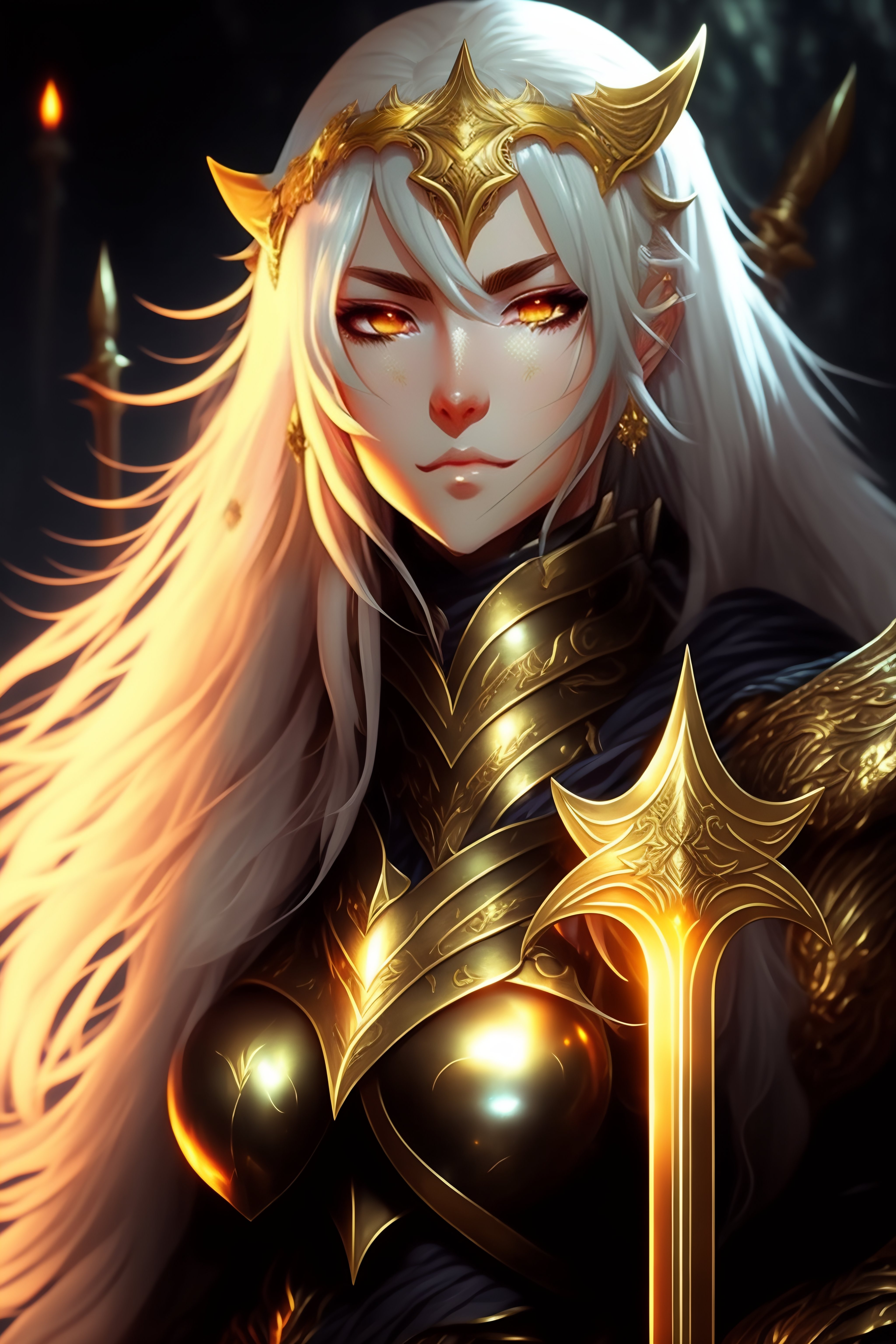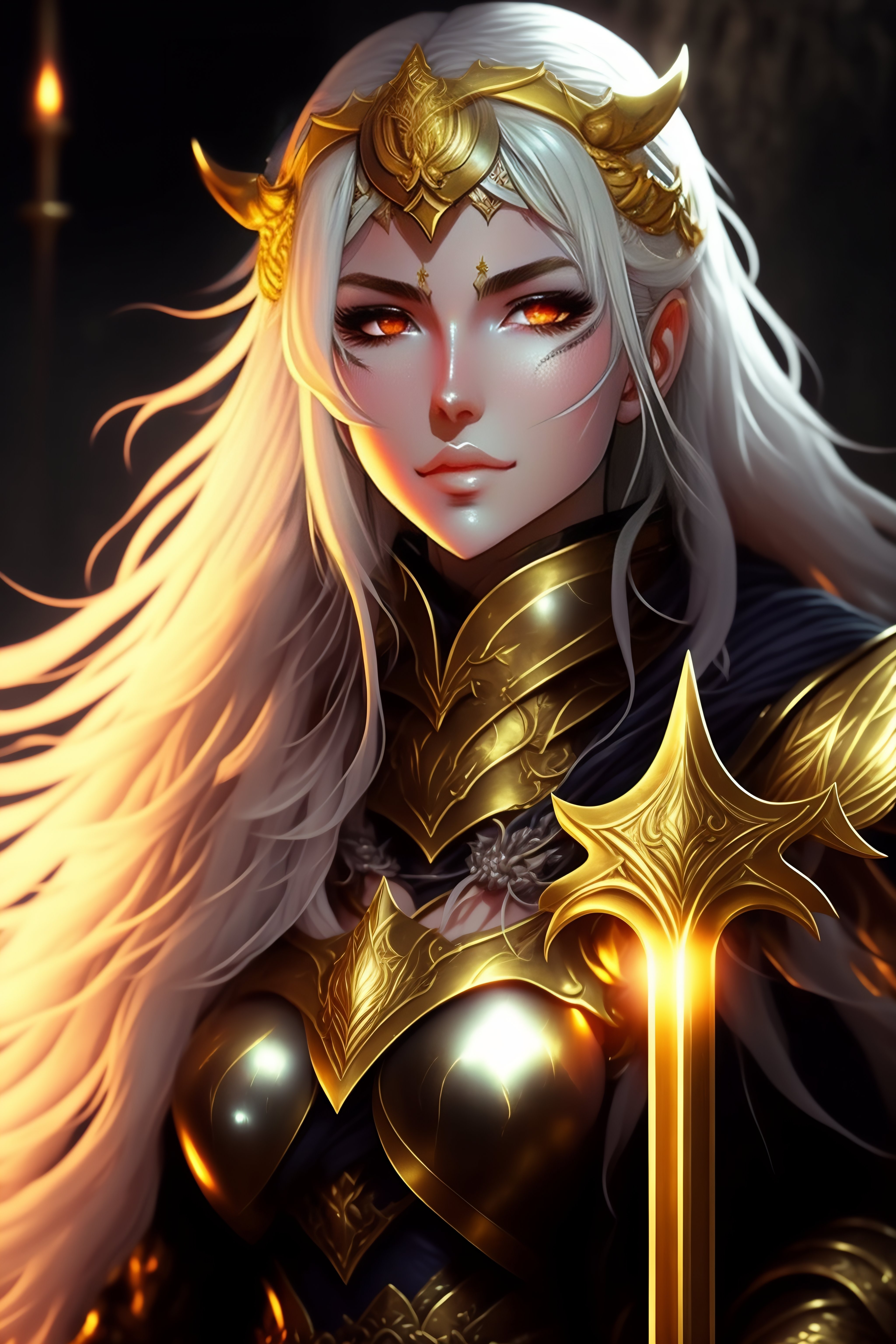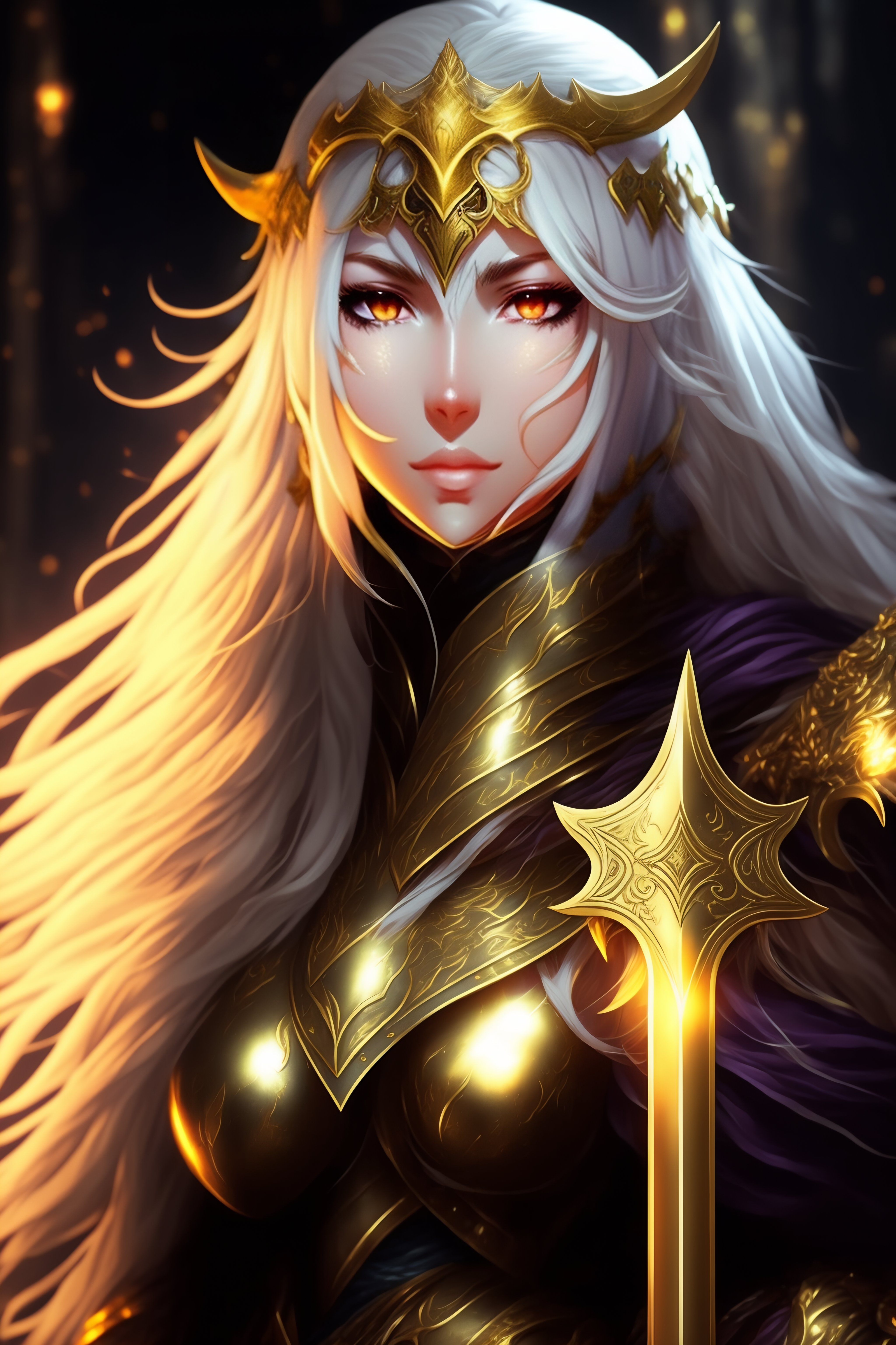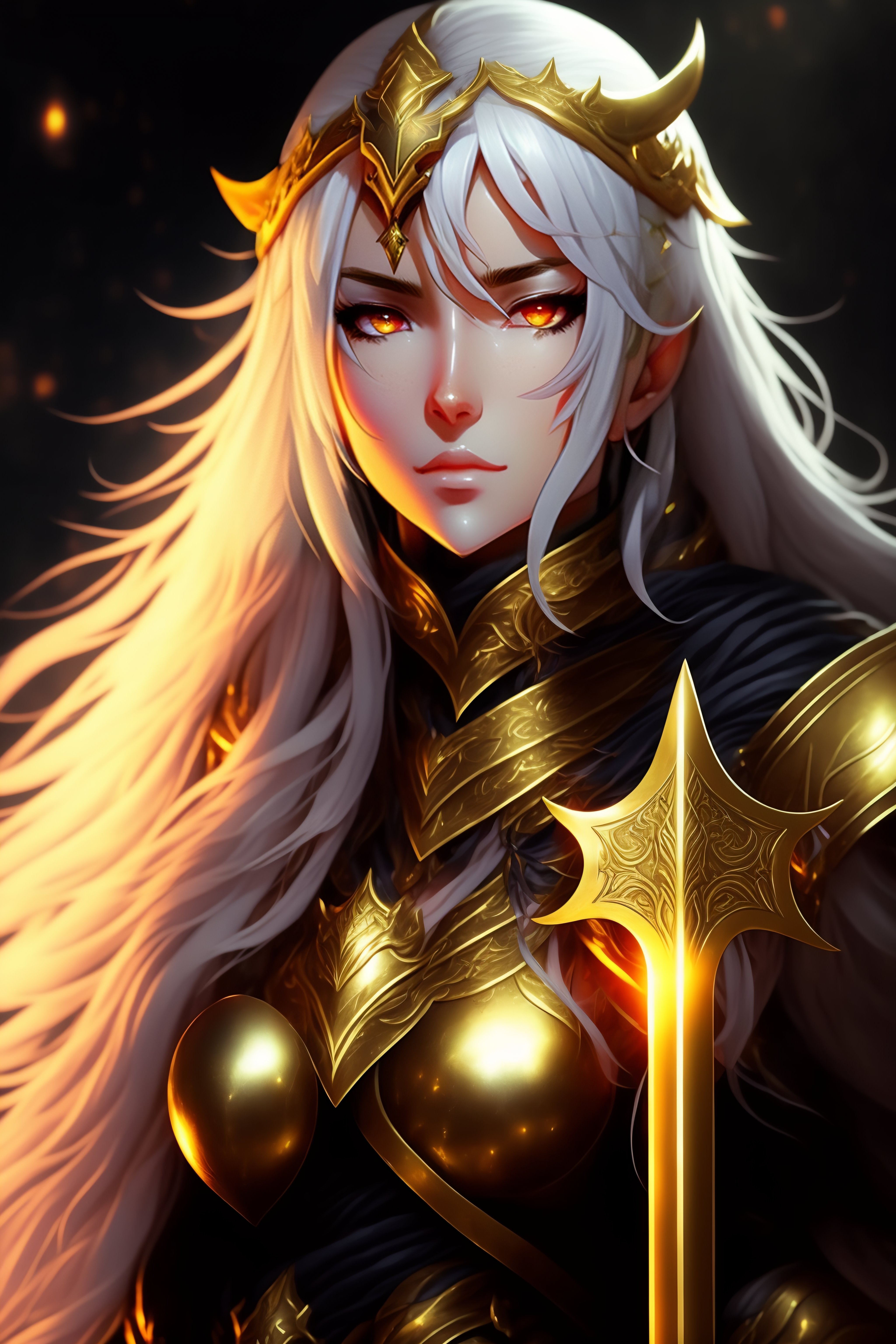 Goblin slayer's sword maiden, sister of beauty, golden glowing eyes, holy, holding a holy sword with hand, beauty