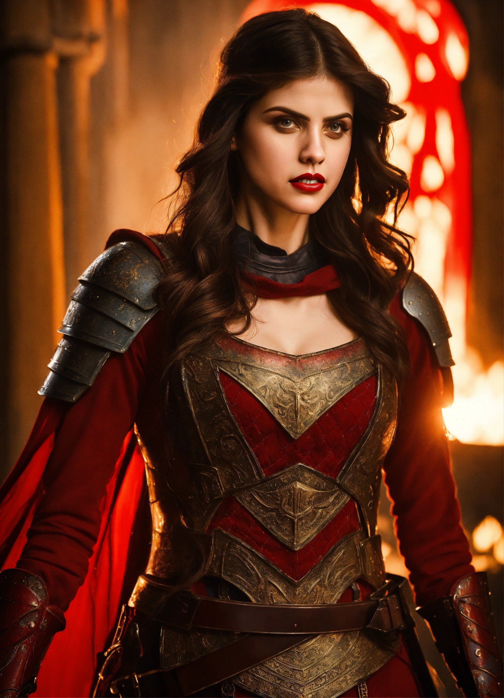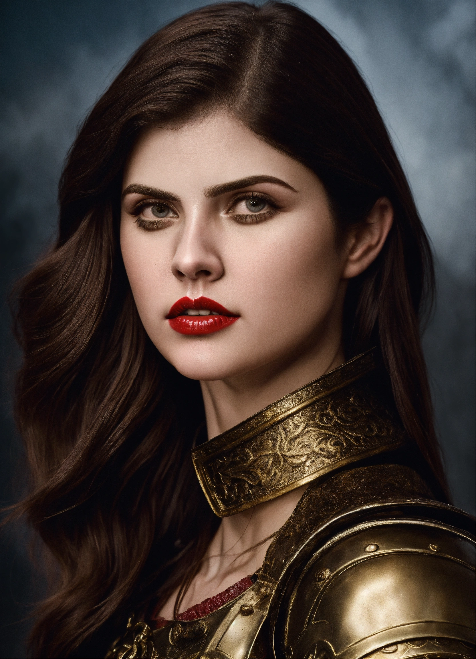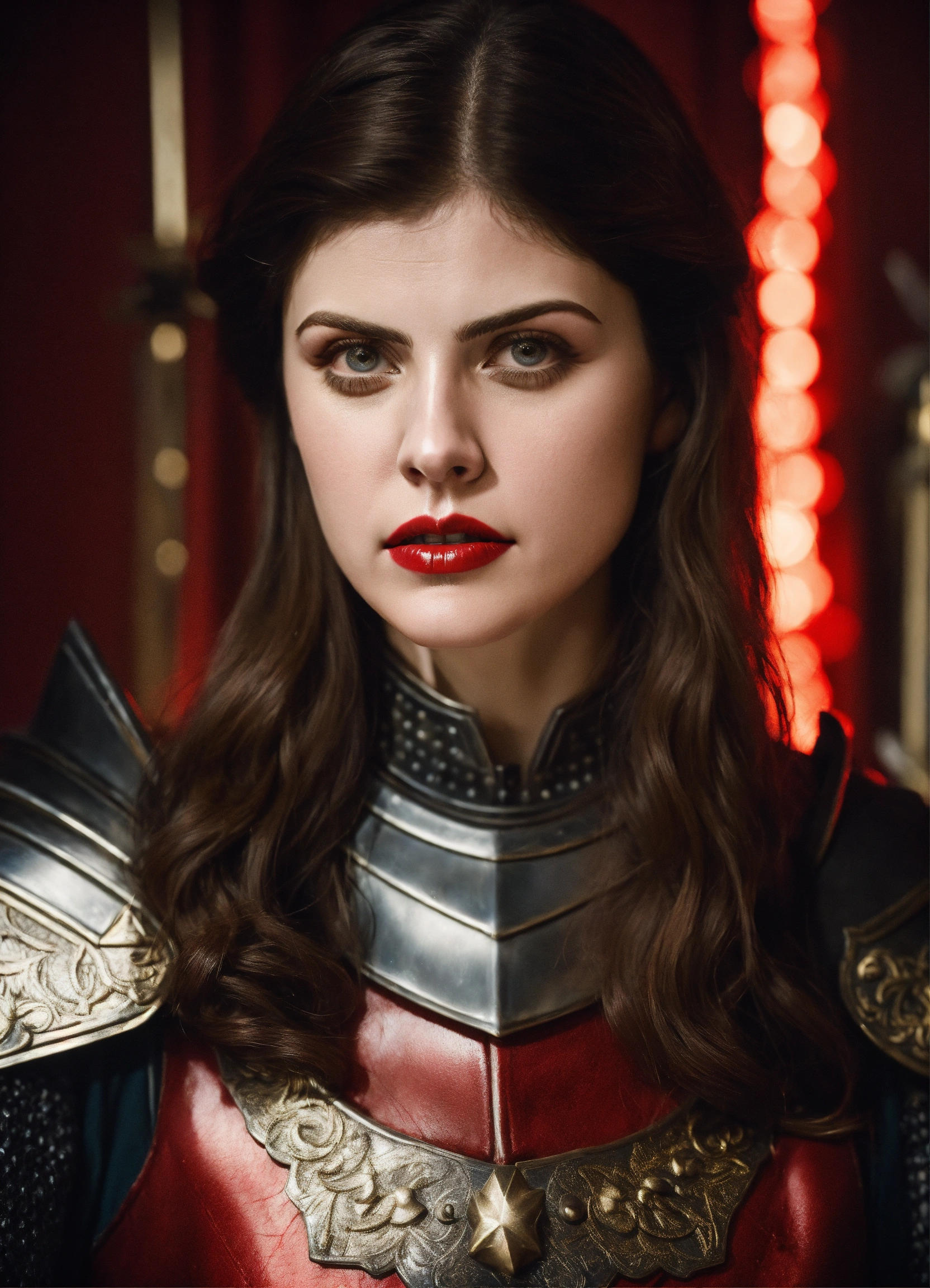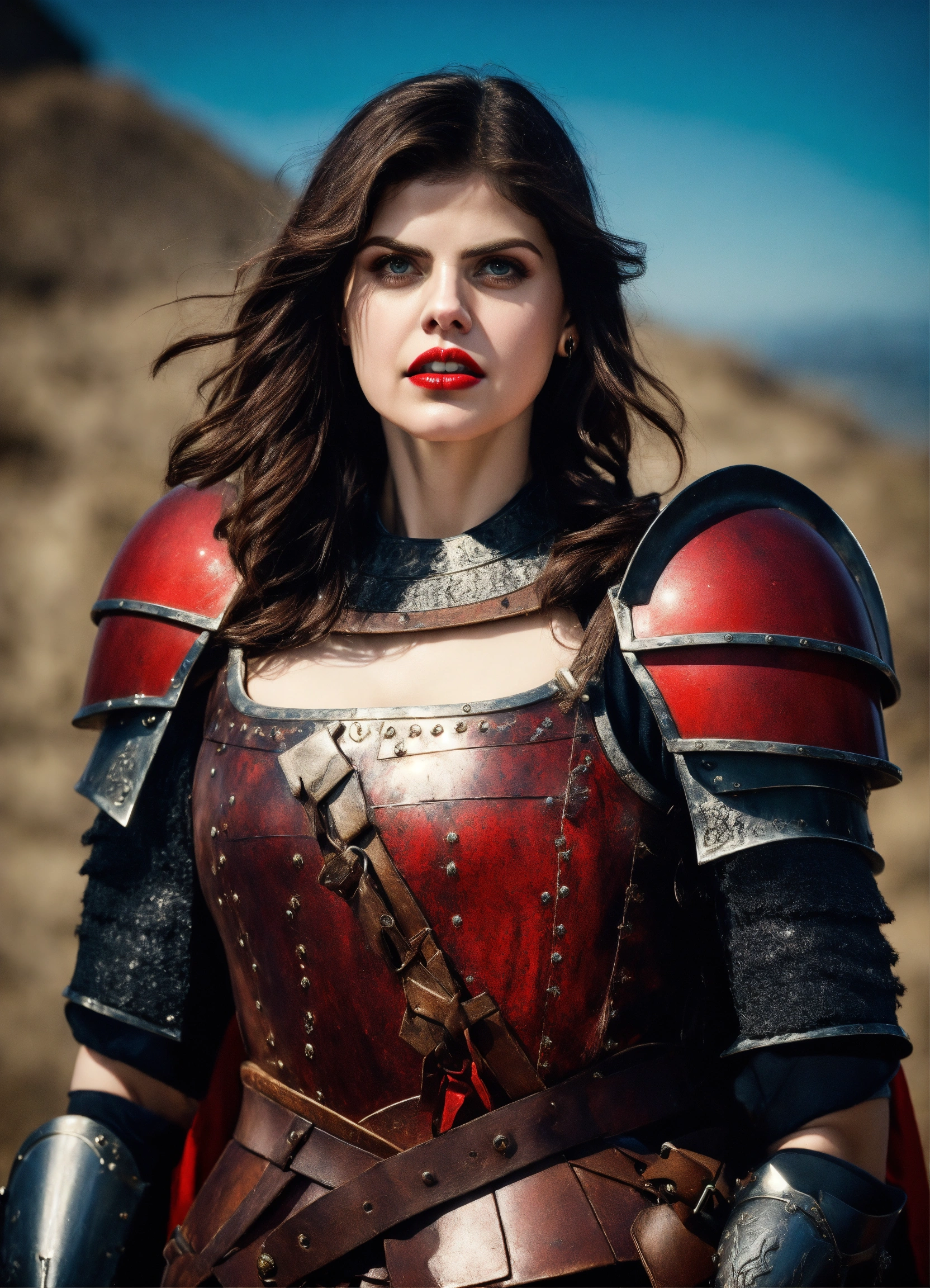 Photo quality portrait of alexandra daddario as a warrior knight with red lips and serious expression