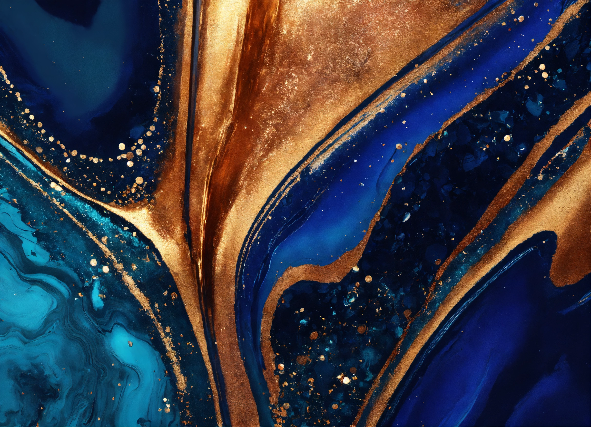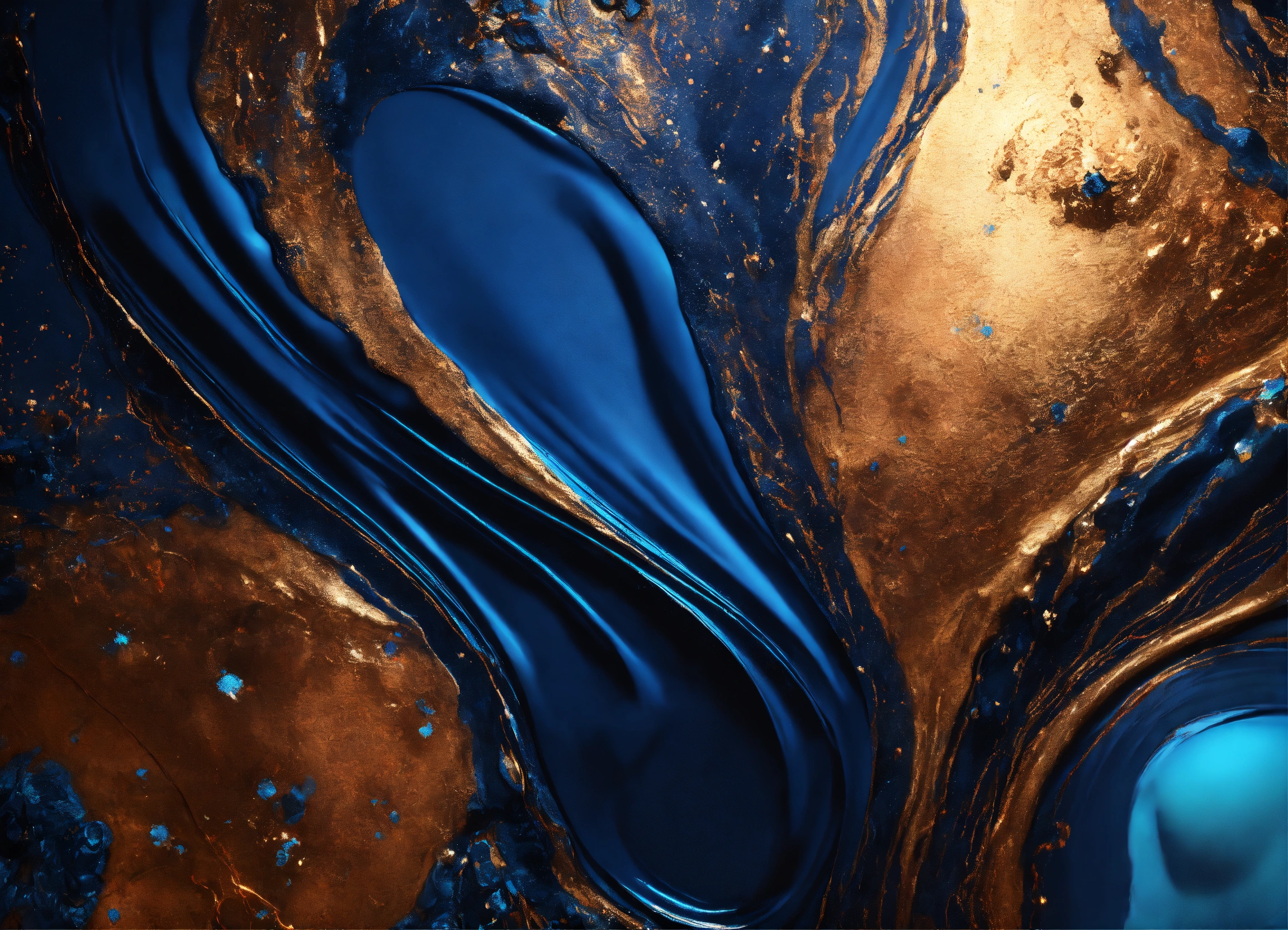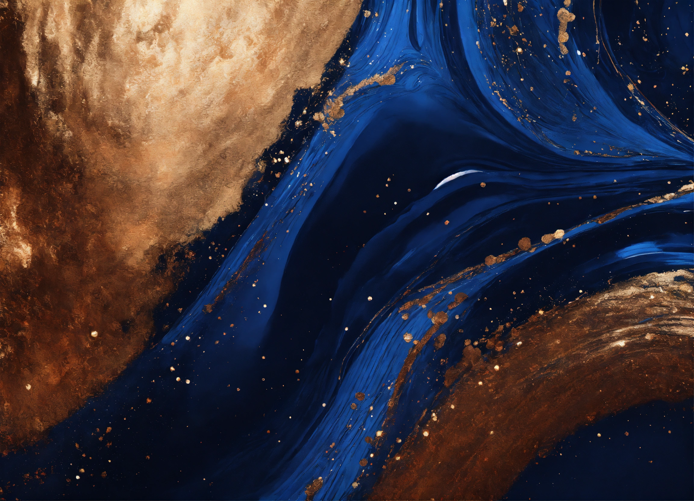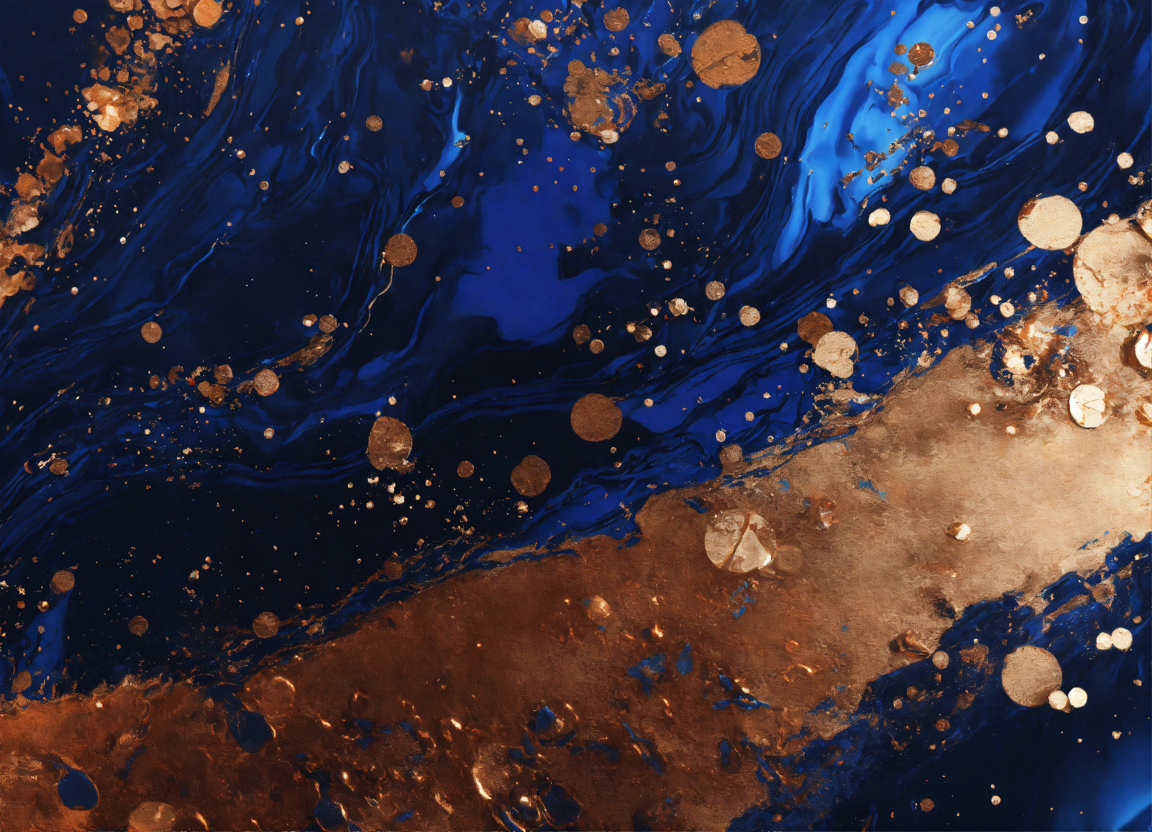 Luxury fusion of dark blue water abstract expressionism experimental art, add glittery copper, high definition image, 8k