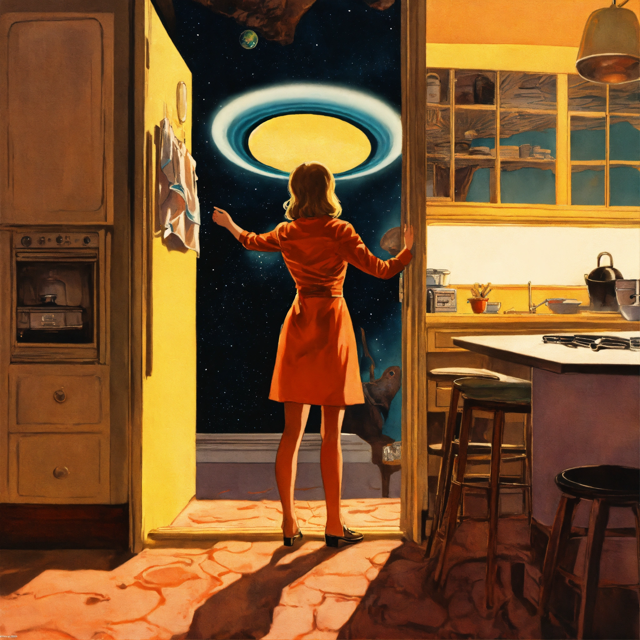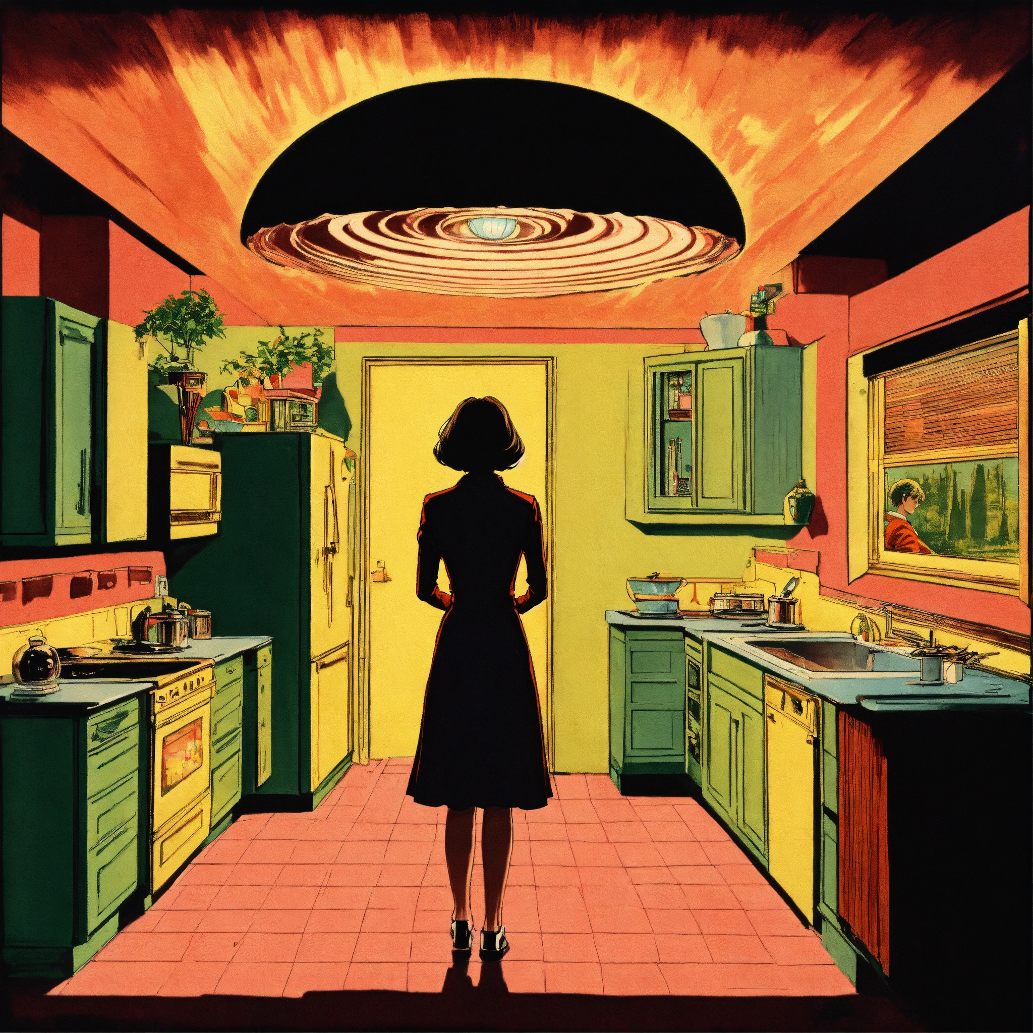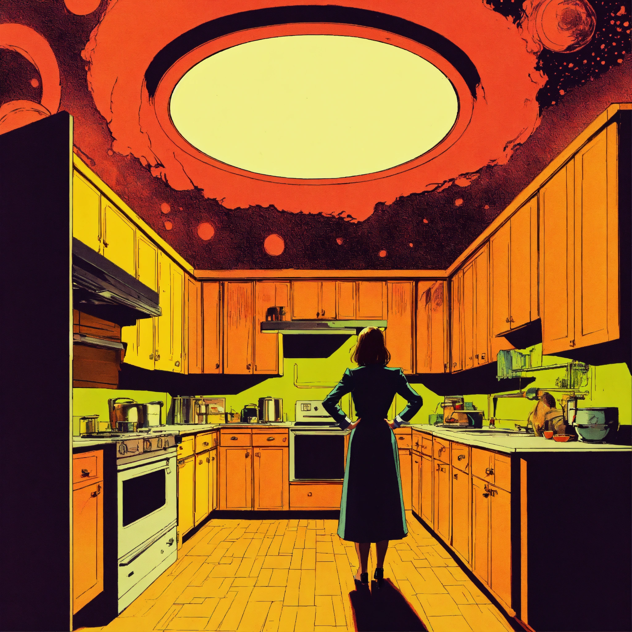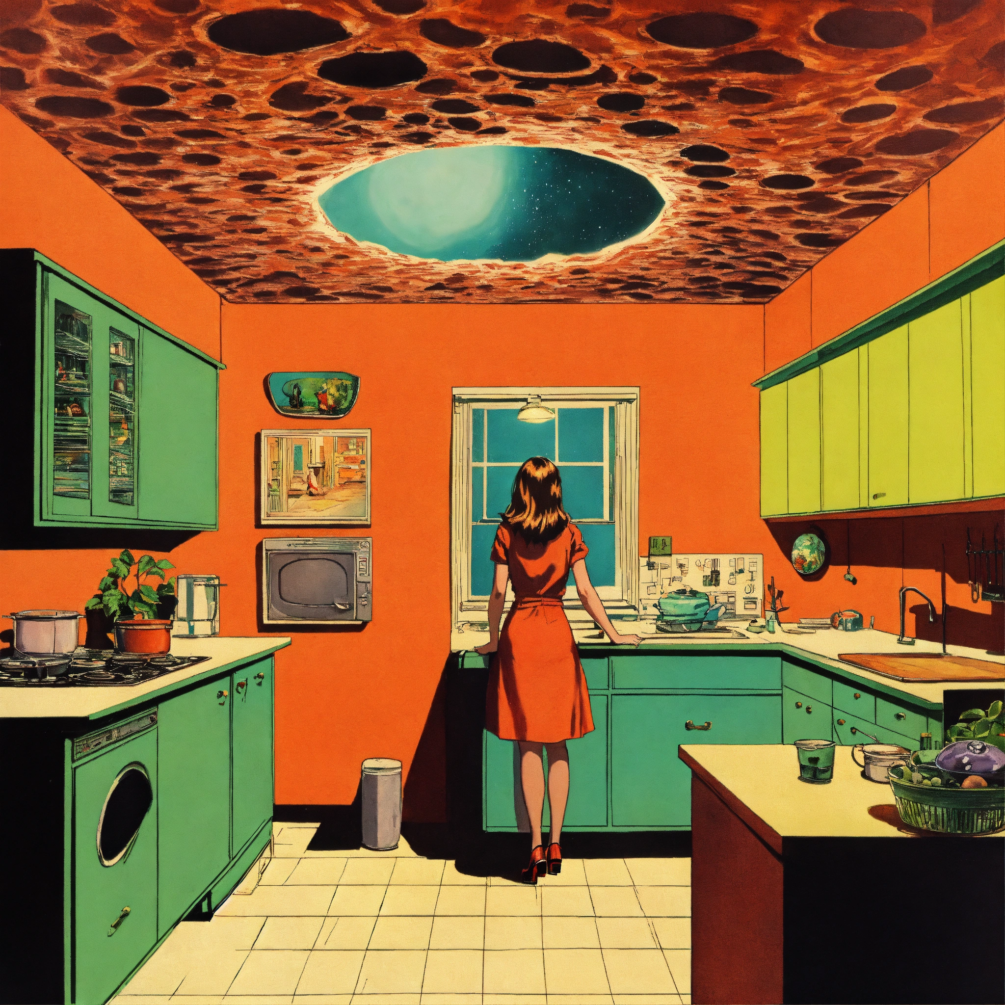 A woman standing in her kitchen as a large hole appears in the ceiling where a giant alien comes in, pulp illustration, retrofuturistic, psychedelic