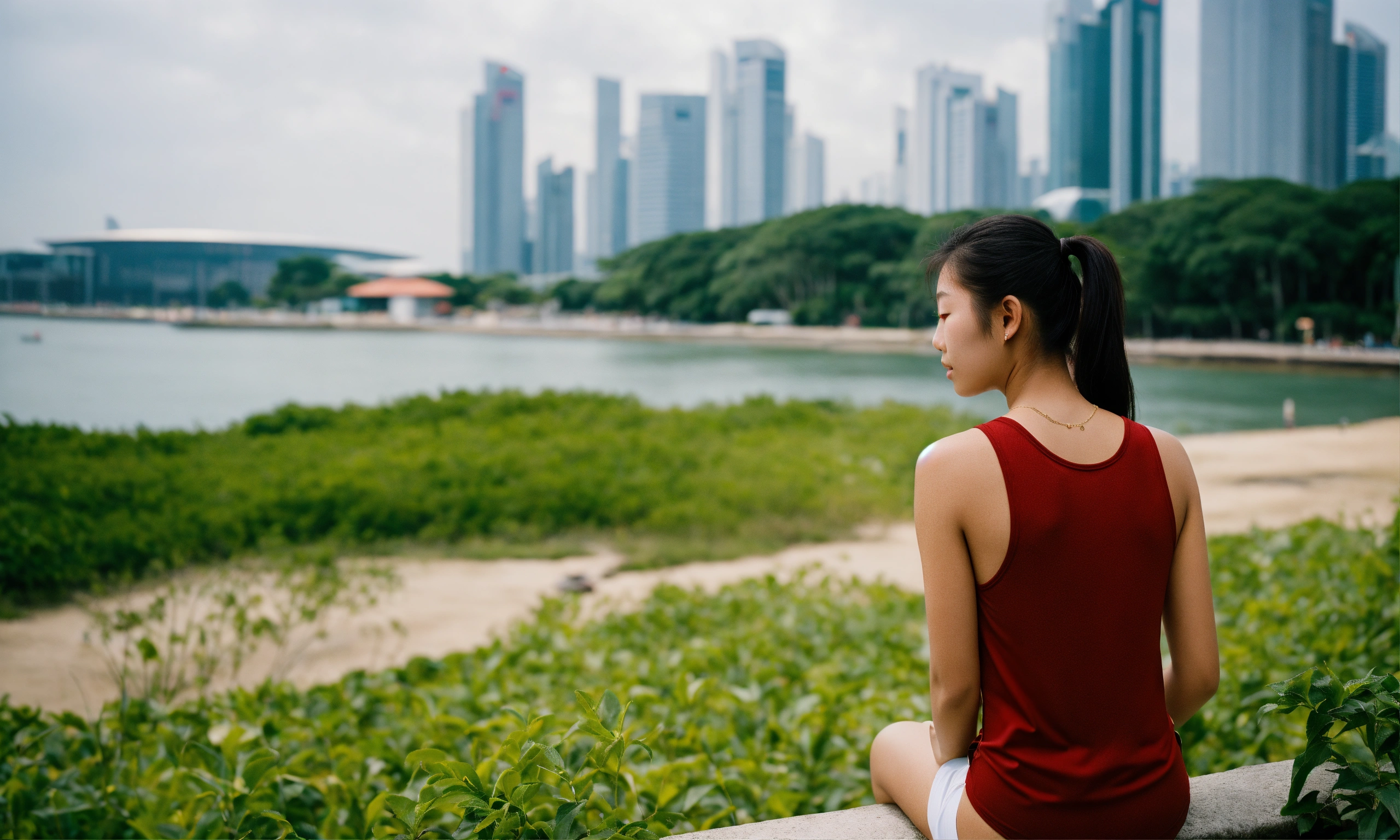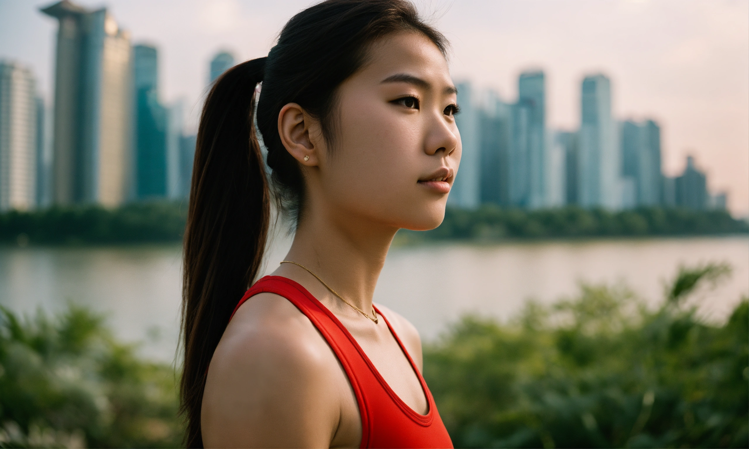 Sunny day, mid-day lighting, close-up side shot, slightly tanned face, athletic 18-year-old asian girl, ponytail singapore's east coast park, talking, calm and content, looking towards towards city scape beyond the edge of the water, wearing a plain red singlet, captured using leica summicron 35mm f2.0 lens, intricate details of expression, shot with kodak portra 400 film, cinematic richness.