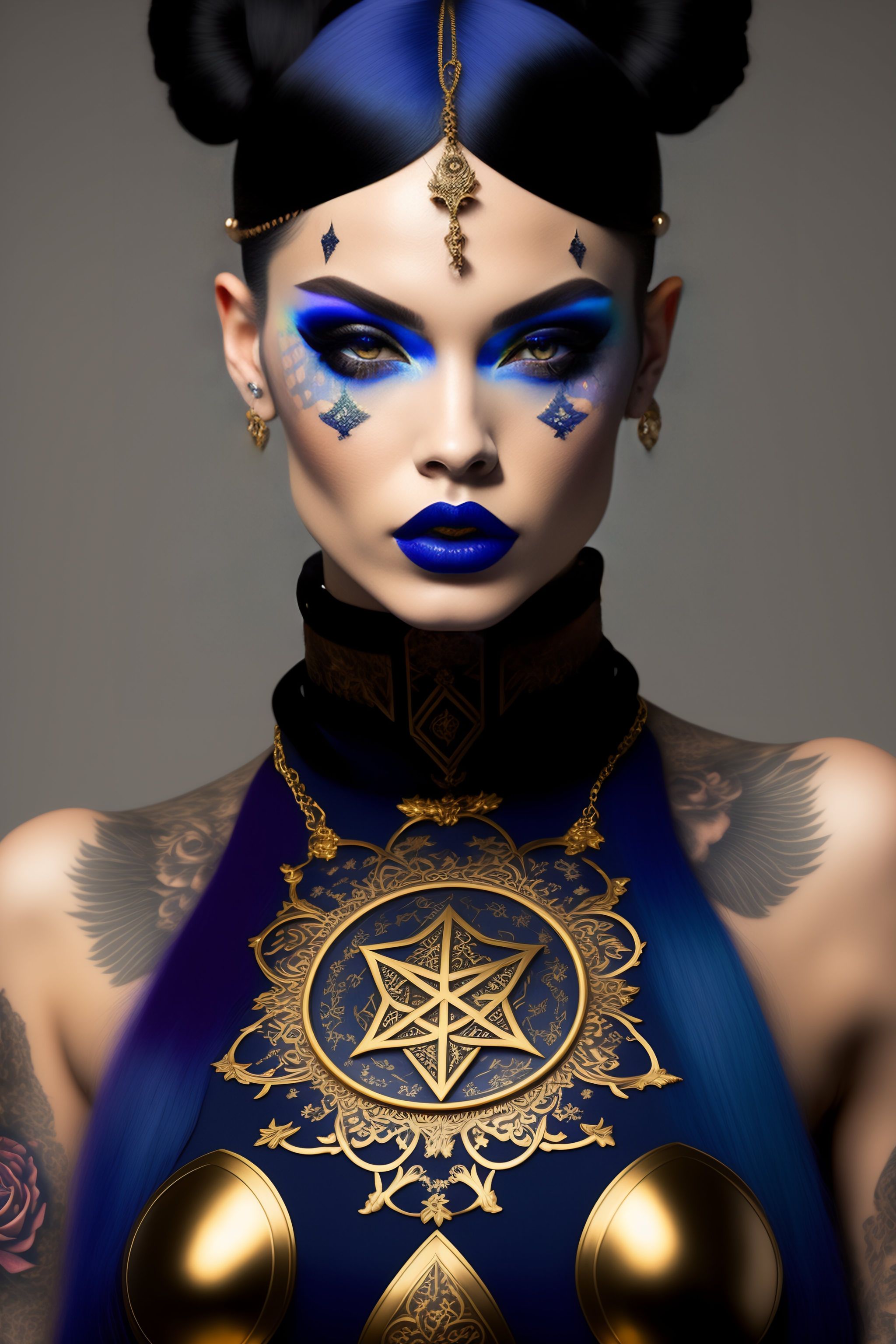 Cute goth girl, heavily tattooed with interlocked black pentagrams, blue lipstick, gold eyeshadow, septum ring. very thin glass tubes, beautiful body, detailed, intricate complexity, by moreau and ryden, sorayama. surrealism.