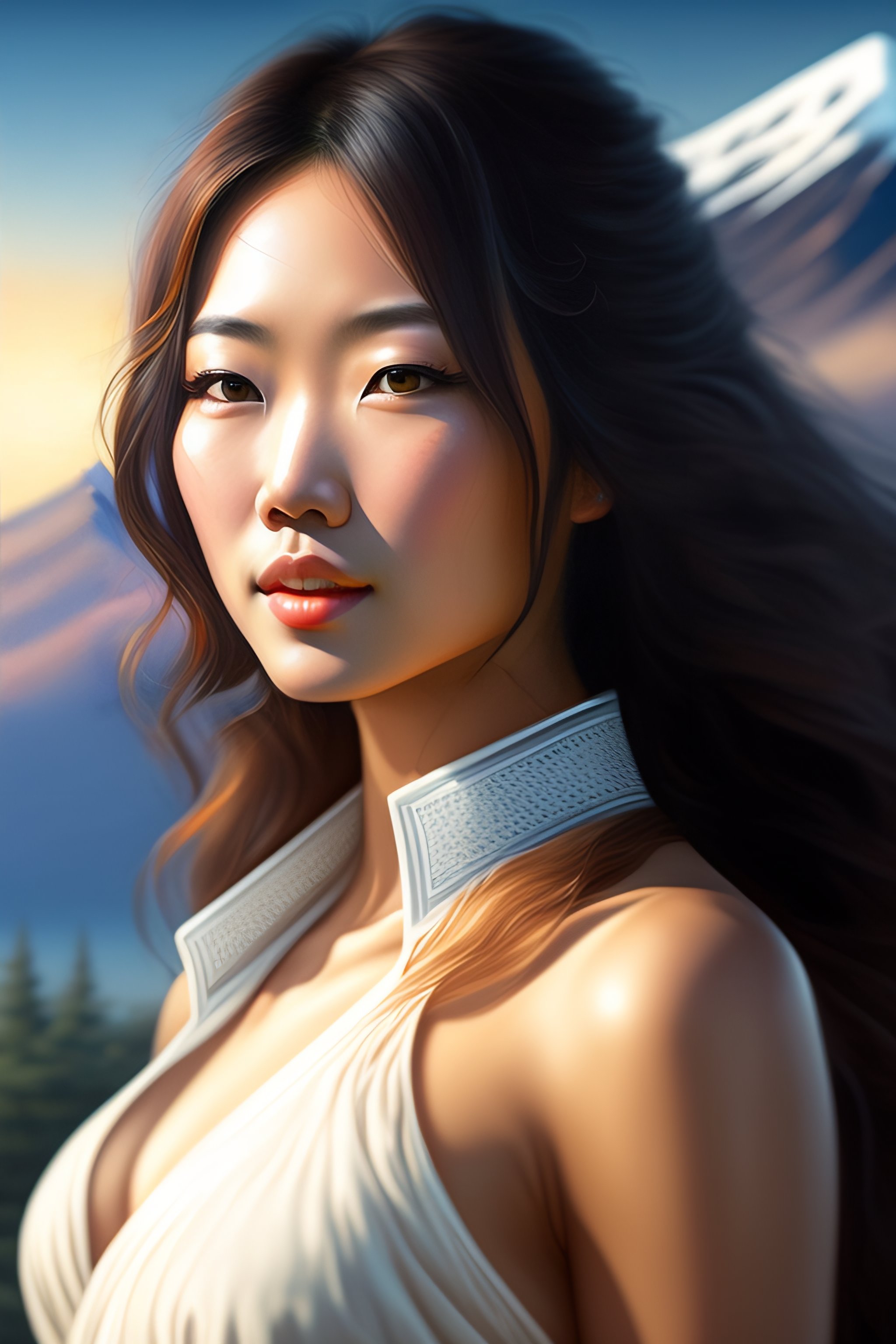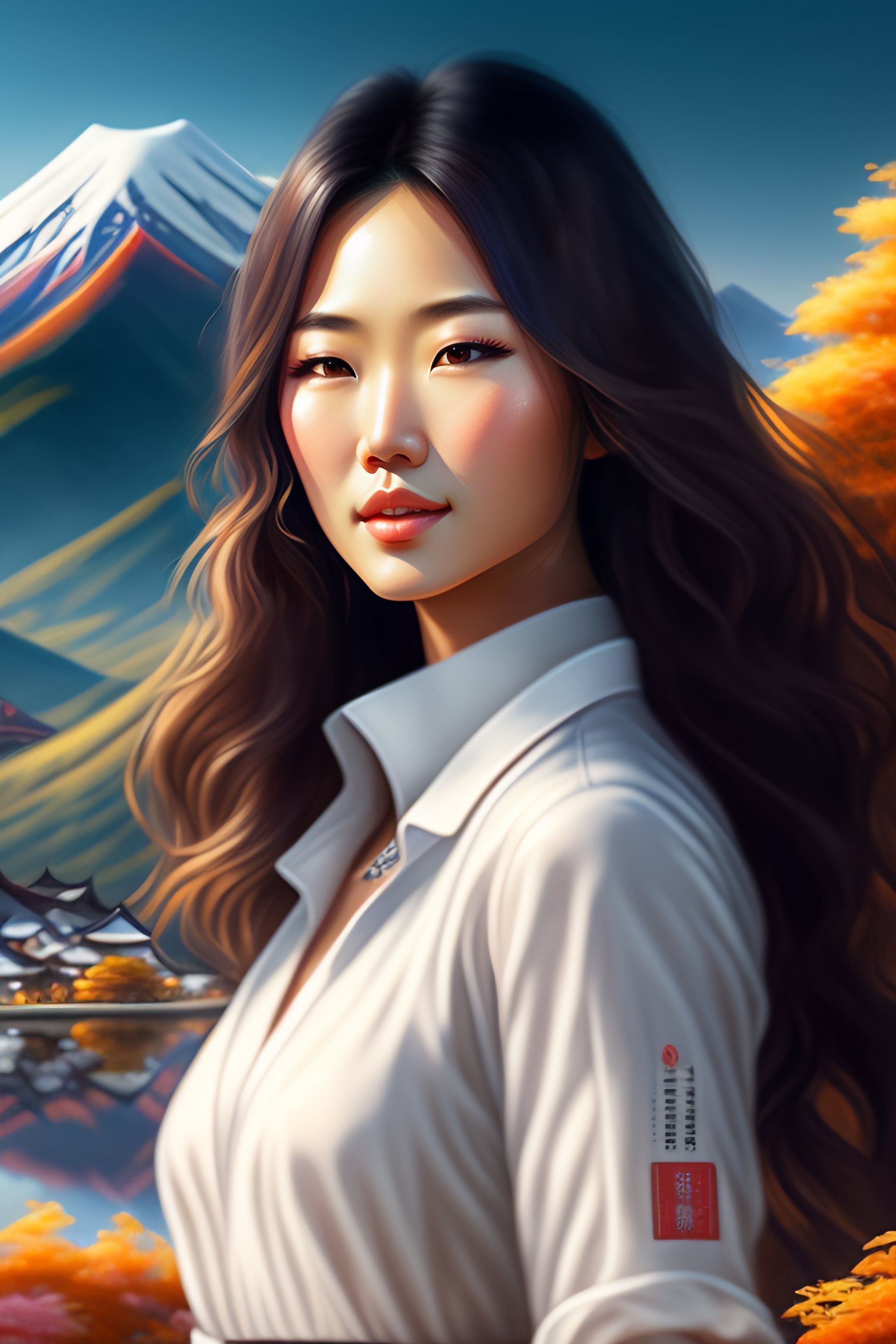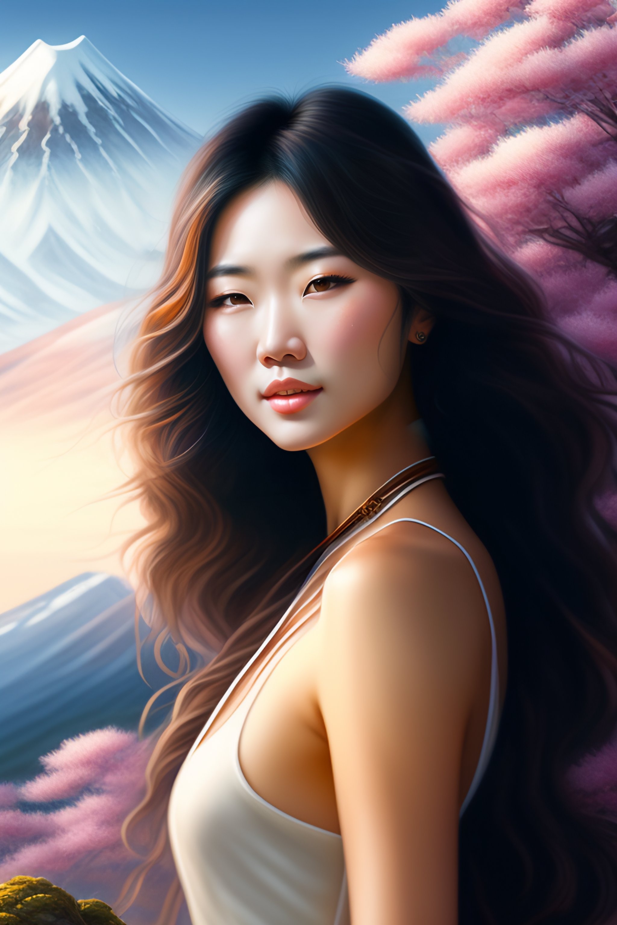 Photo of beautiful japanese female with messy flowing hair in the style of stefan kostic, realistic, sharp focus, 8 k high definition, insanely detailed, intricate, elegant, art by stanley lau and artgerm, mount fuji background