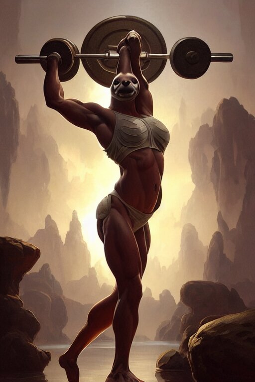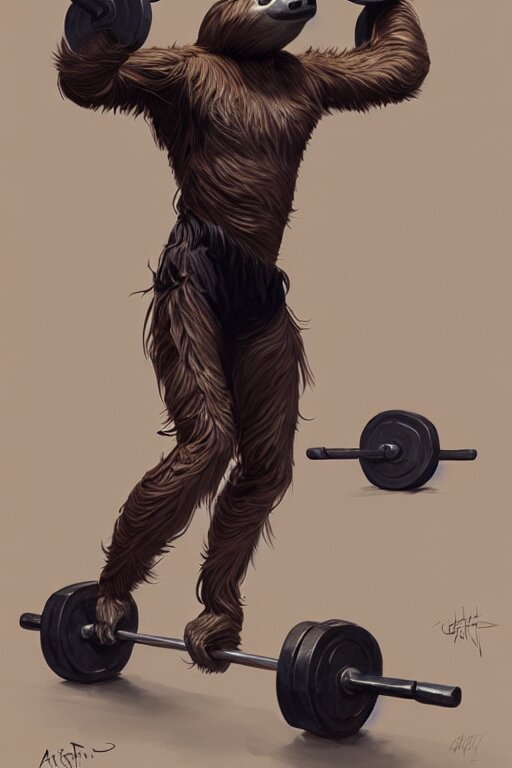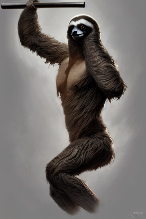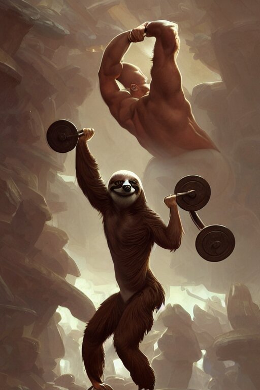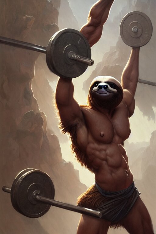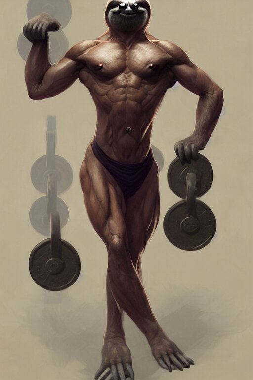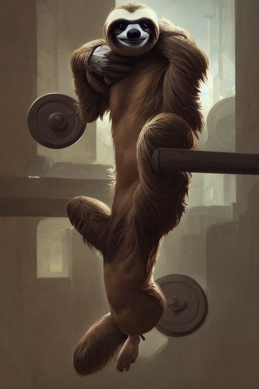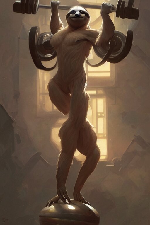 Anthro sloth lifting weights, dim dingy gym, dynamic pose, fantasy, intricate, elegant, highly detailed, digital painting, artstation, concept art, matte, sharp focus, illustration, art by artgerm and greg rutkowski and alphonse mucha