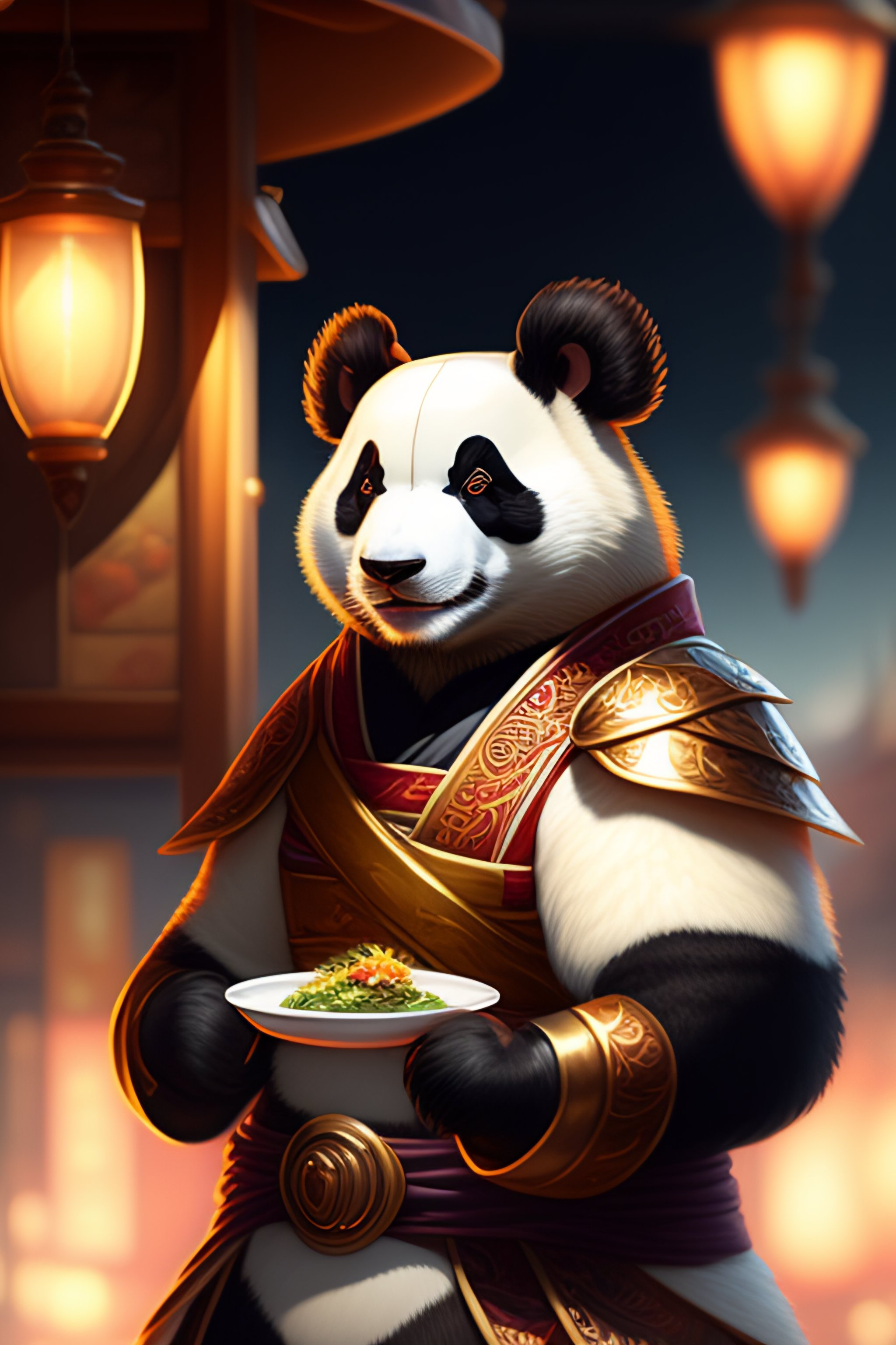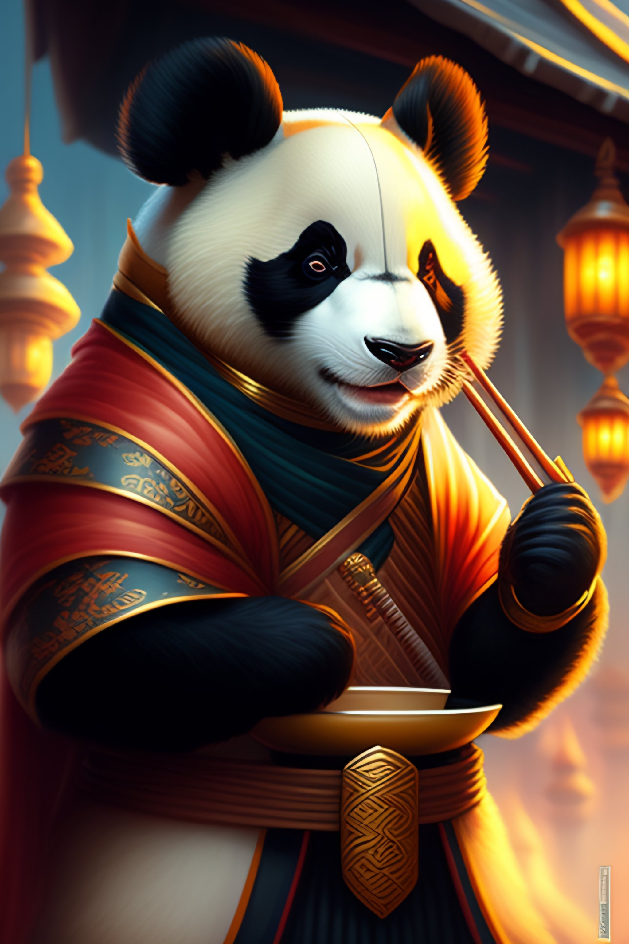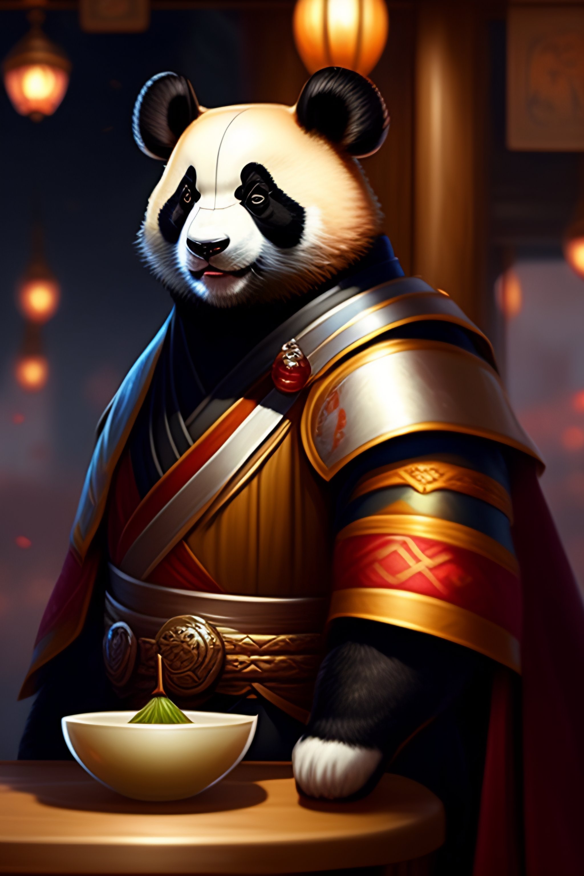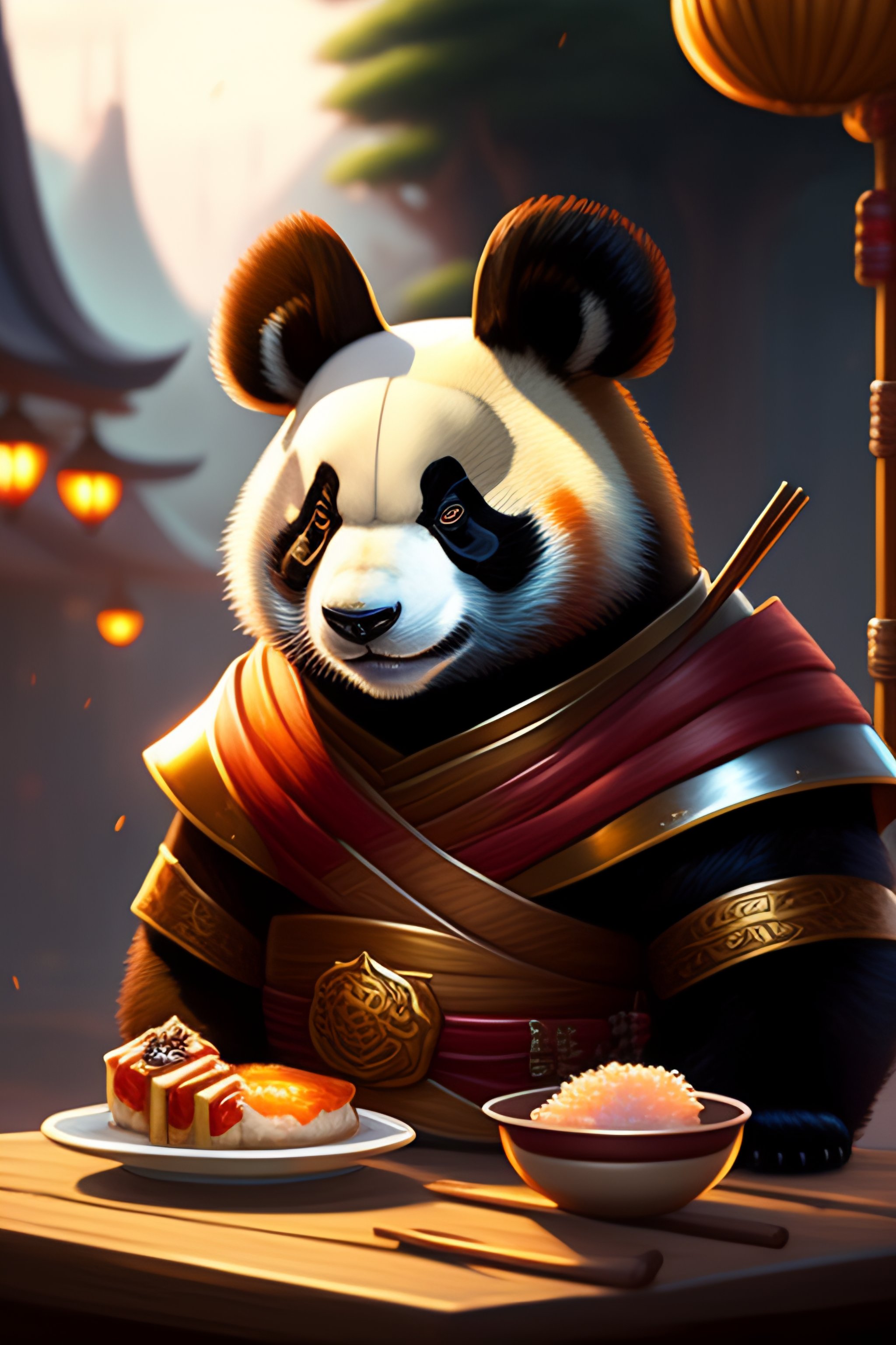 A portrait an anthropomorphic panda samurai eating sushi, samurai mouse sidekick, restaurant in background, cute and adorable, dnd character art portrait, well rendered matte fantasy painting, deviantart artstation, by jason felix by steve argyle by tyler jacobson by peter mohrbacher, cinematic lighting