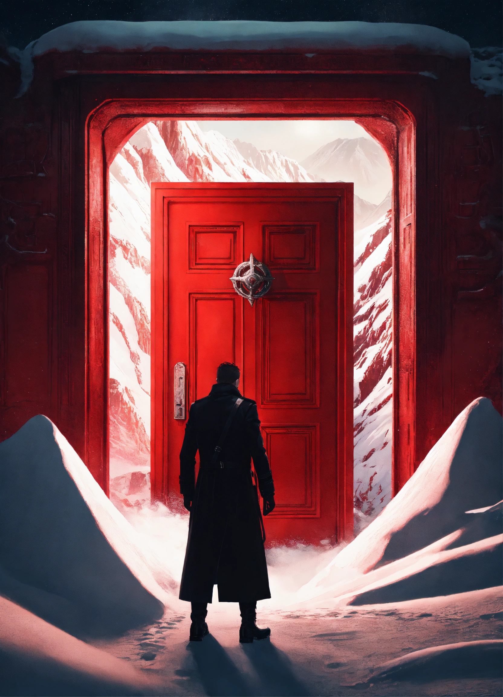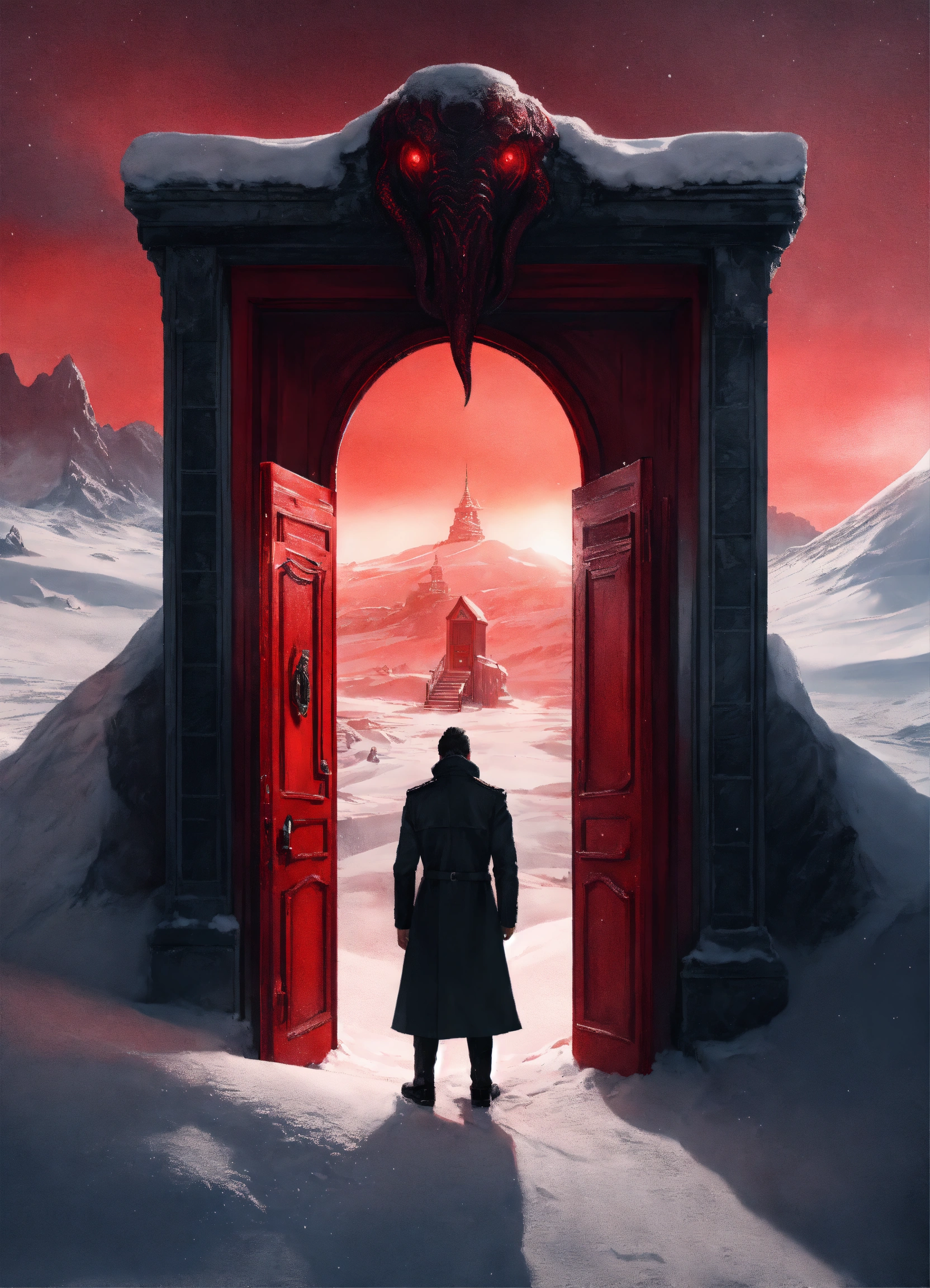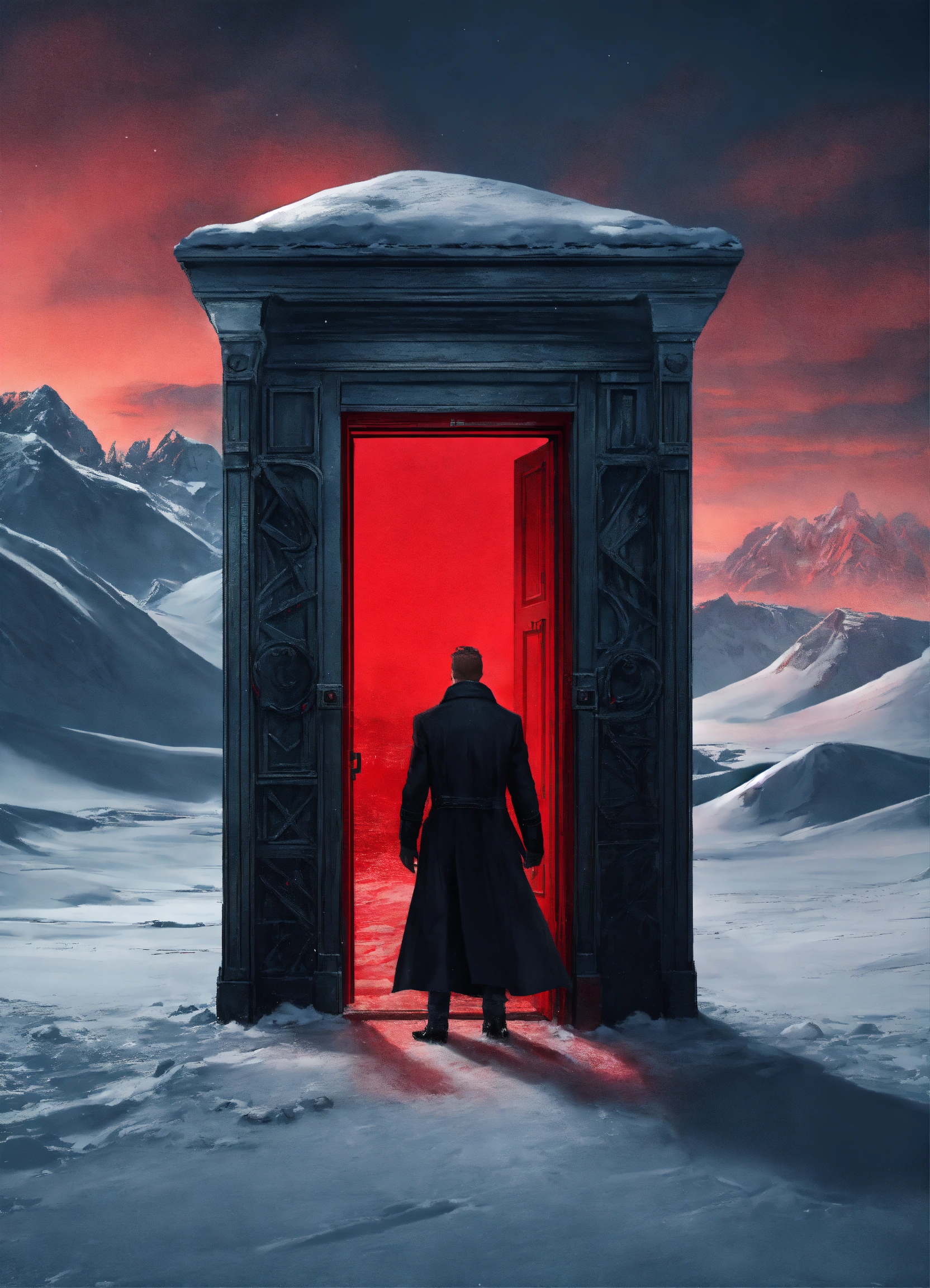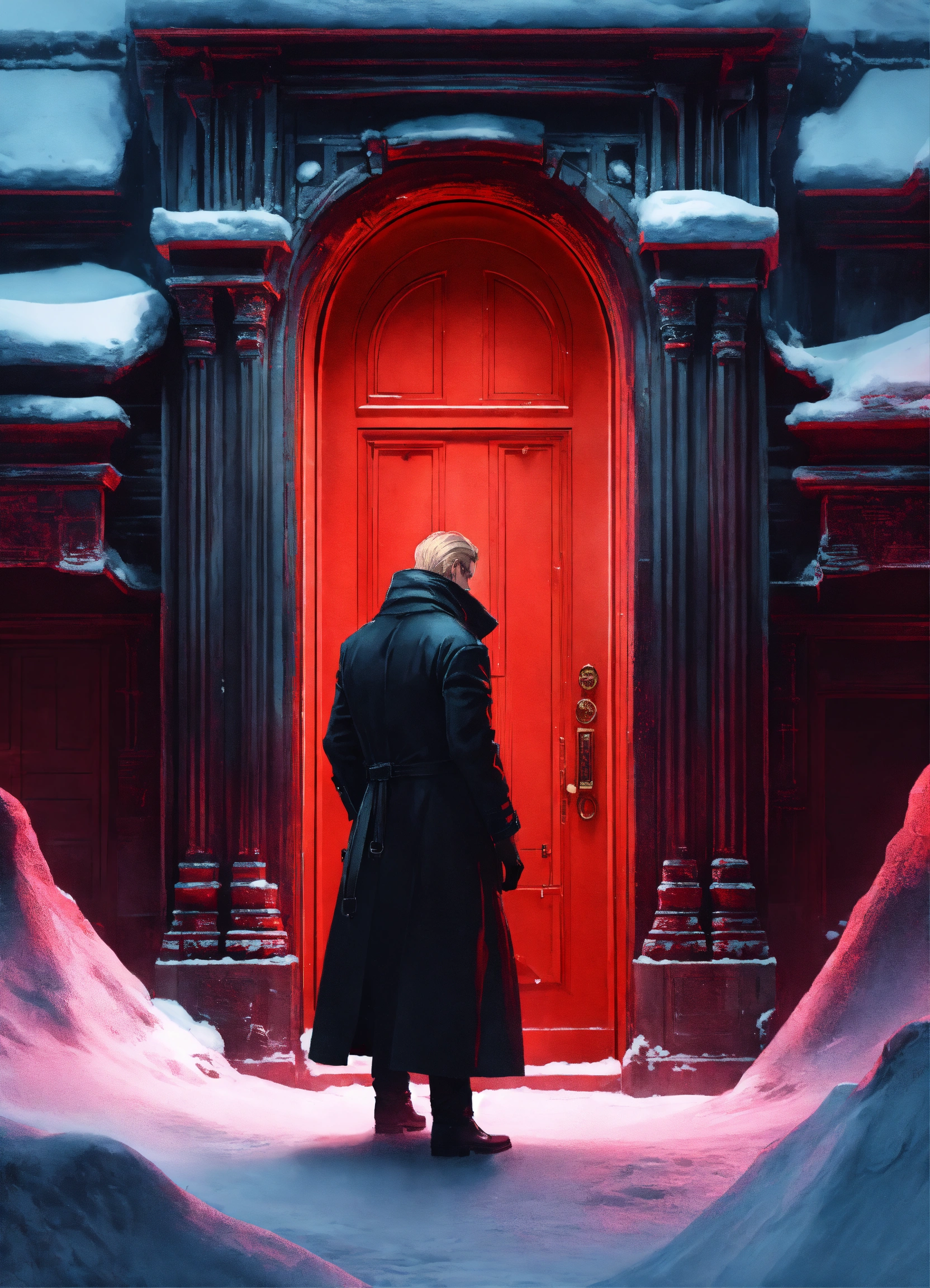 Red door in the center of snow desert with cthulhu universe doorway, platinum-haired man in black trenchcoat, frostpunk, retrowave, average plan, wallpaper