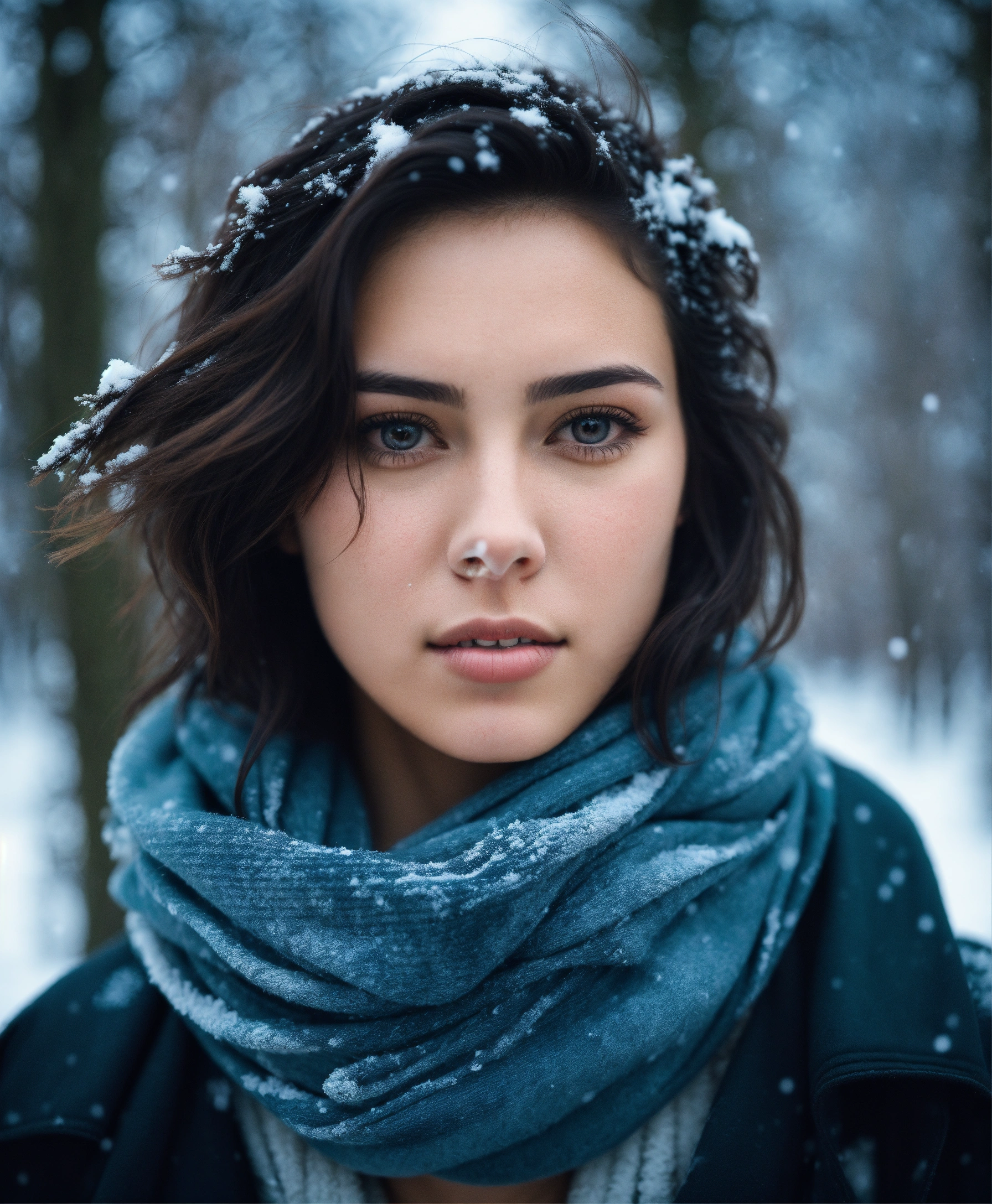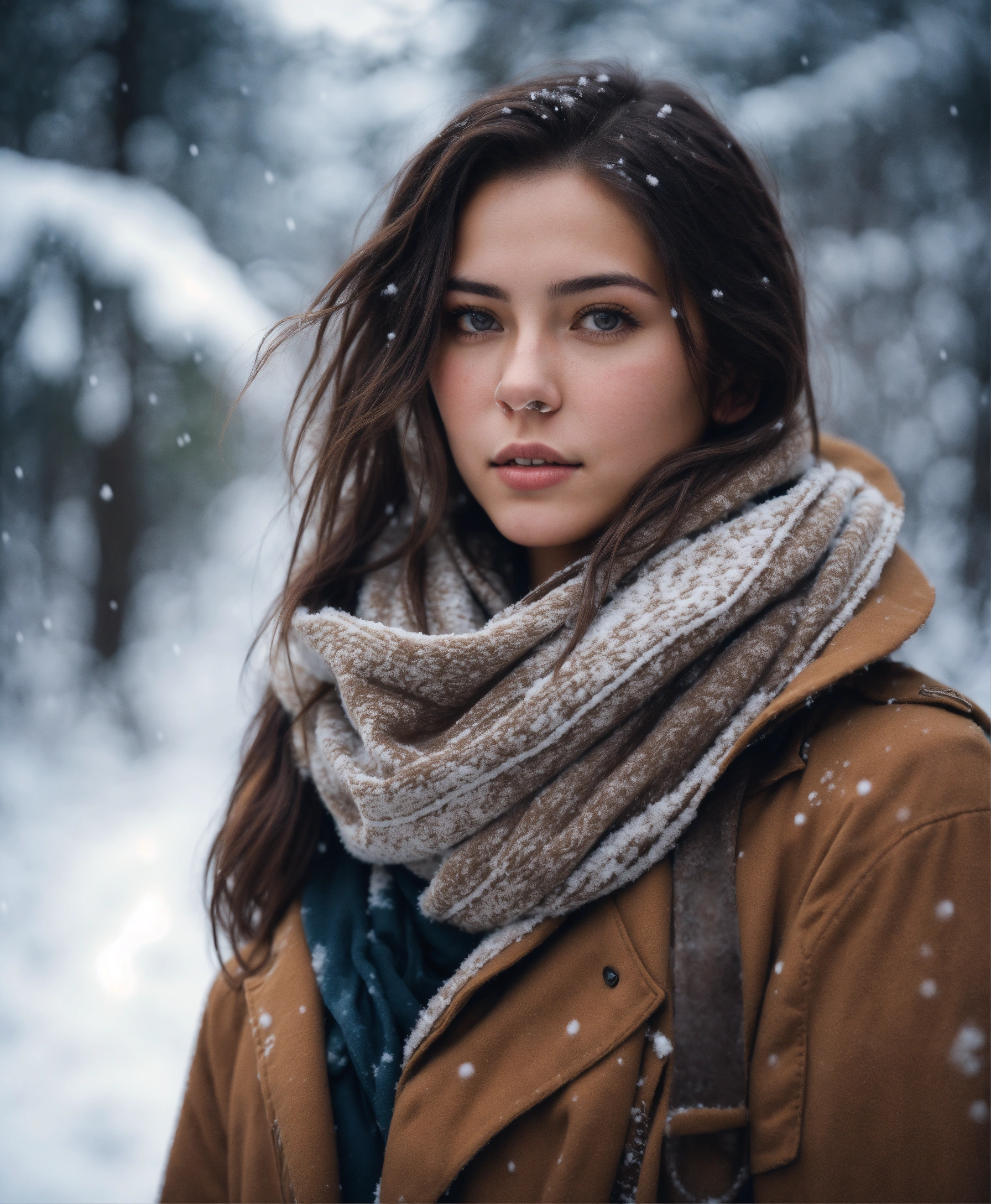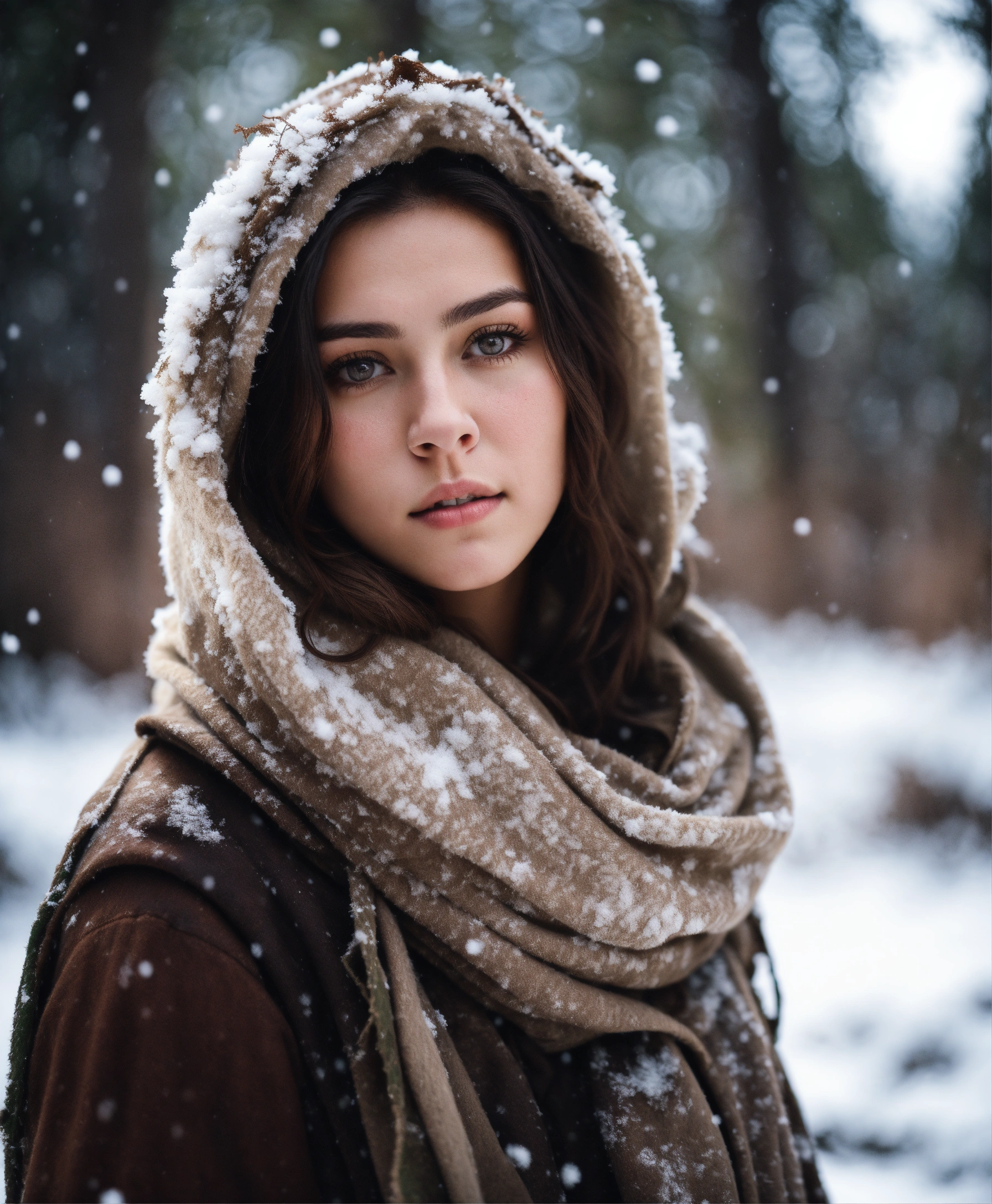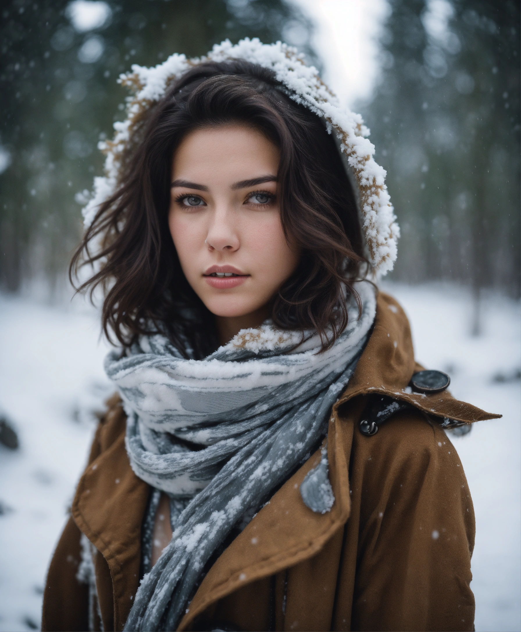 An ultra detailed photo of a 22 years old brunette girl, with mid-short loose hair, brown eyes, natural beauty, calm expression, strong body, wearing a scarf and snowy post-apocalyptic clothes, a snowed forest in the background. romantic aura. no jewelry, no makeup.