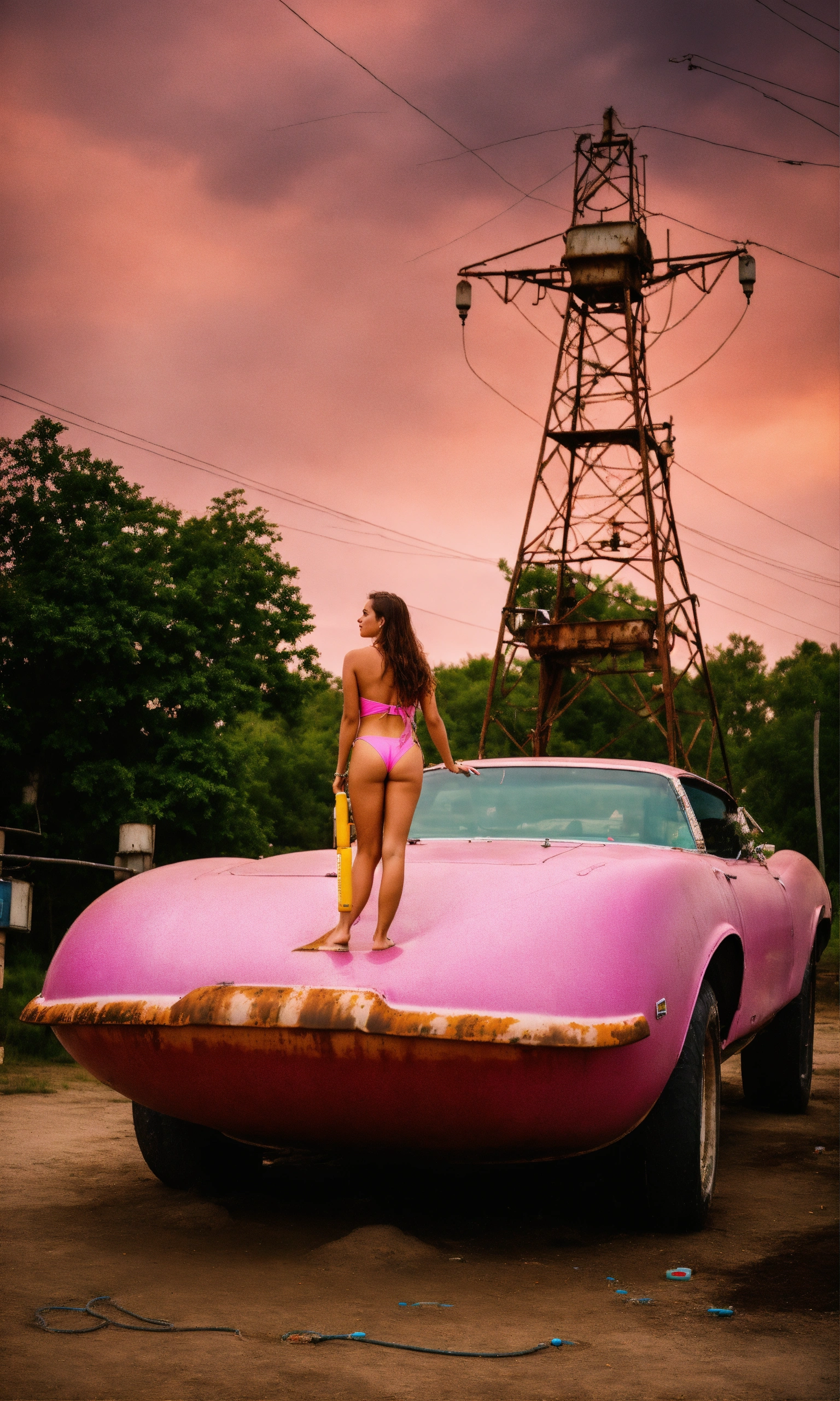 25 years old lady wearing pink swimming suit standing on top a giant fuel tank and a rusty fuel pump