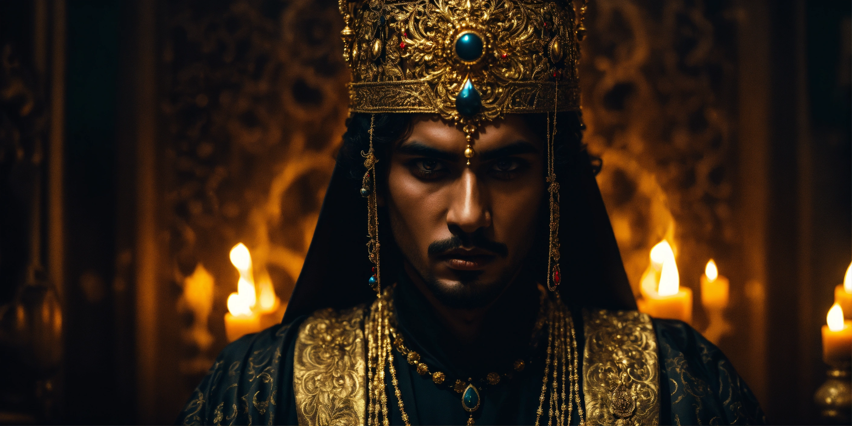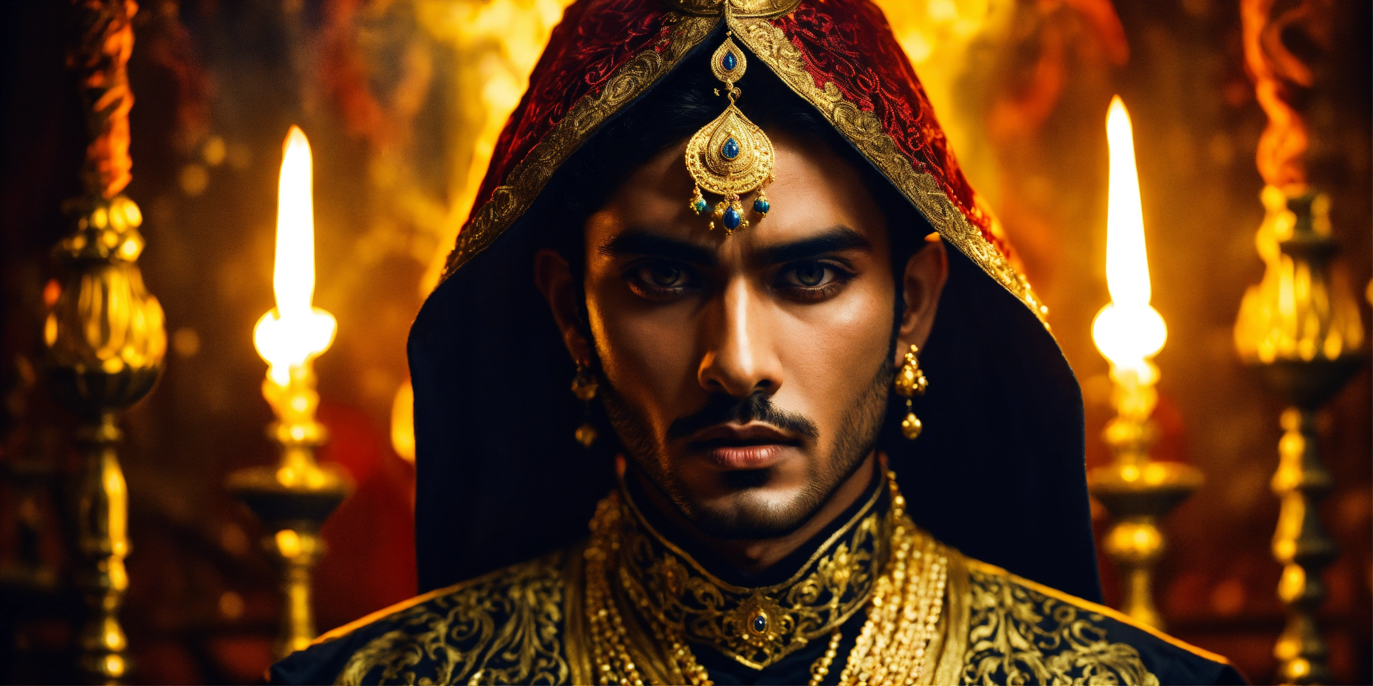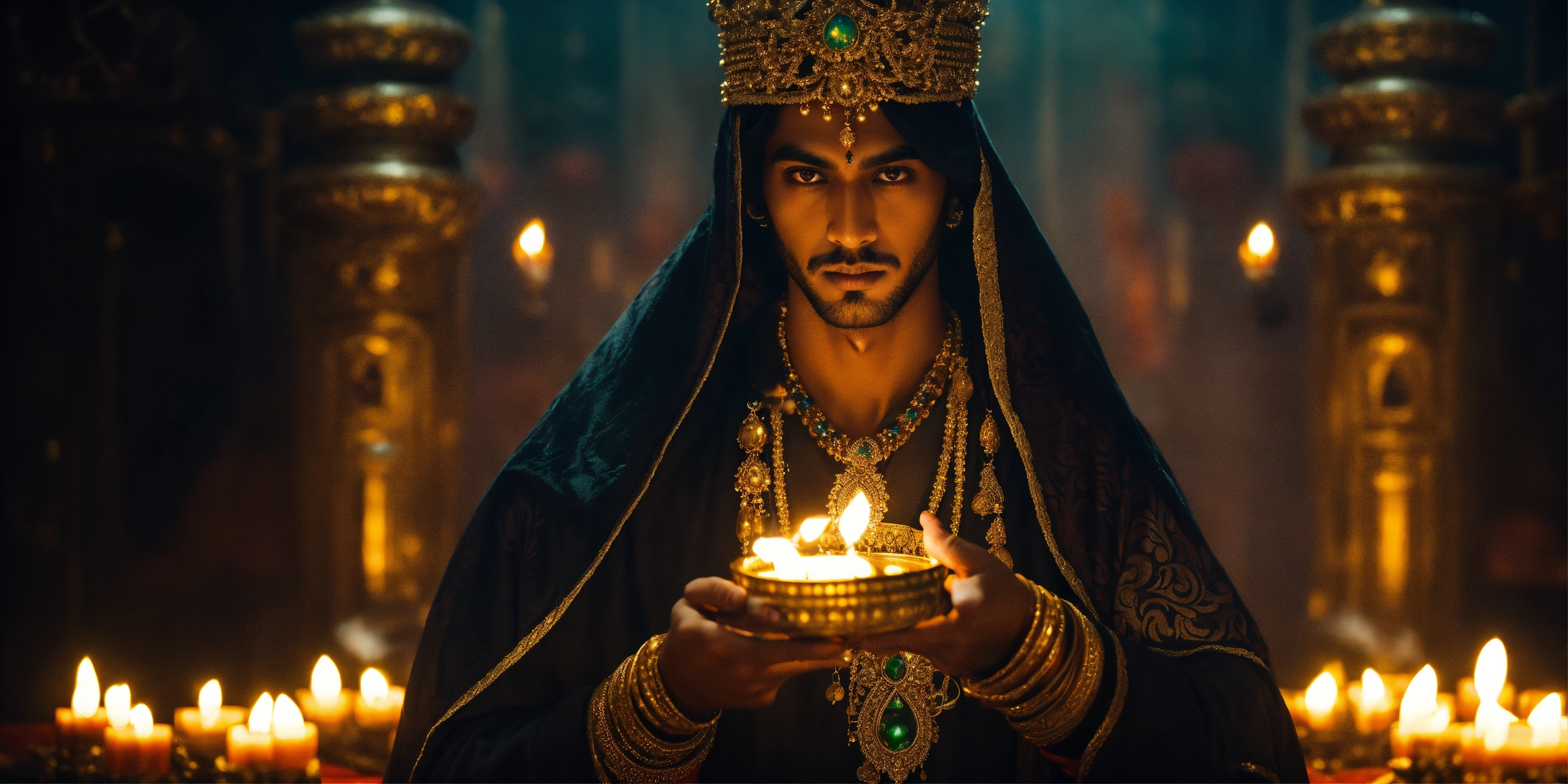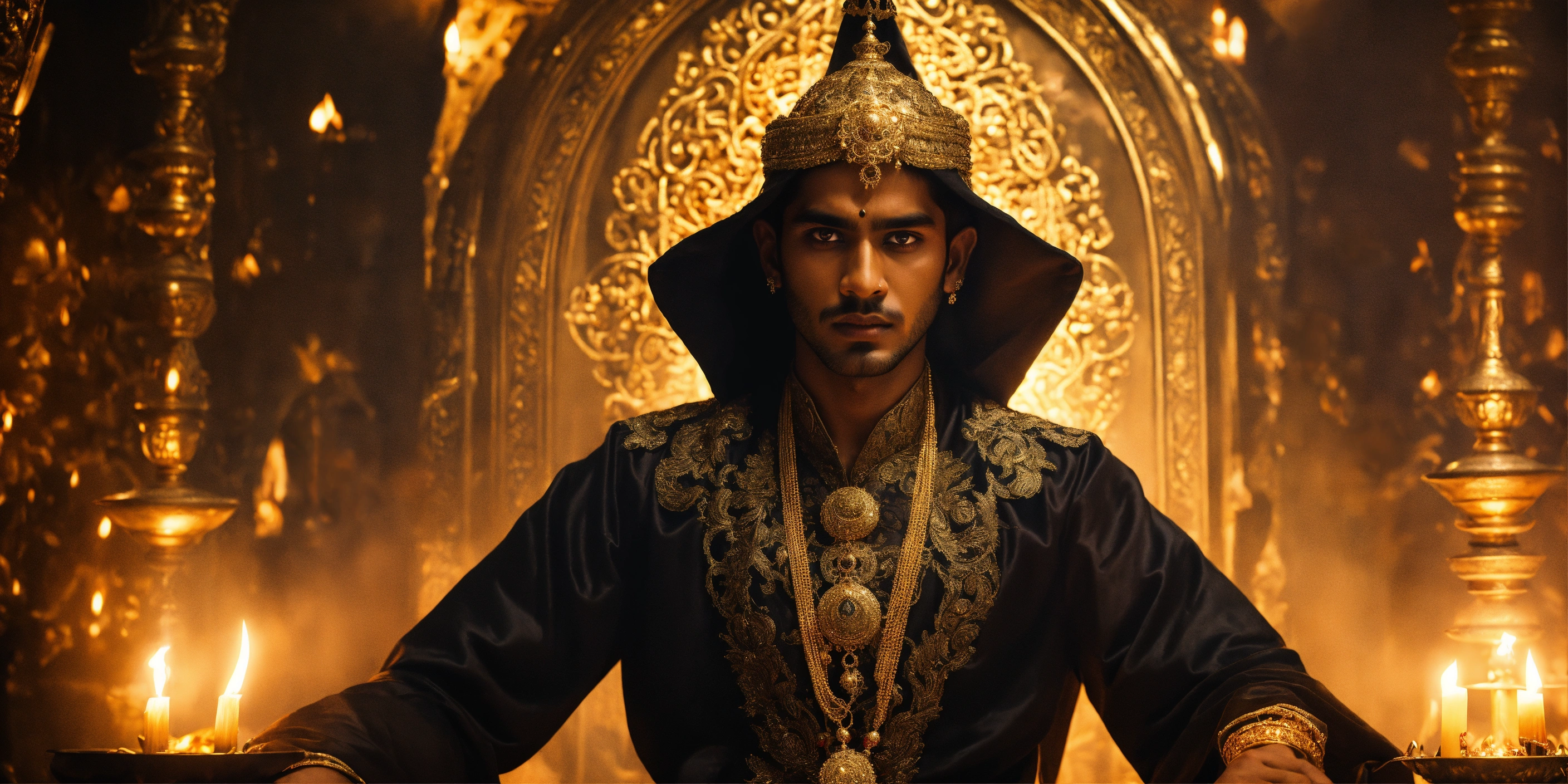 Sinister and dramatic picture of a young handsome south asian diabolical sorcerer with glowing eyes wearing dark elaborate robes and ornate gold jewellery hypnotising the viewer in a dimly-lit incense filled secret chamber