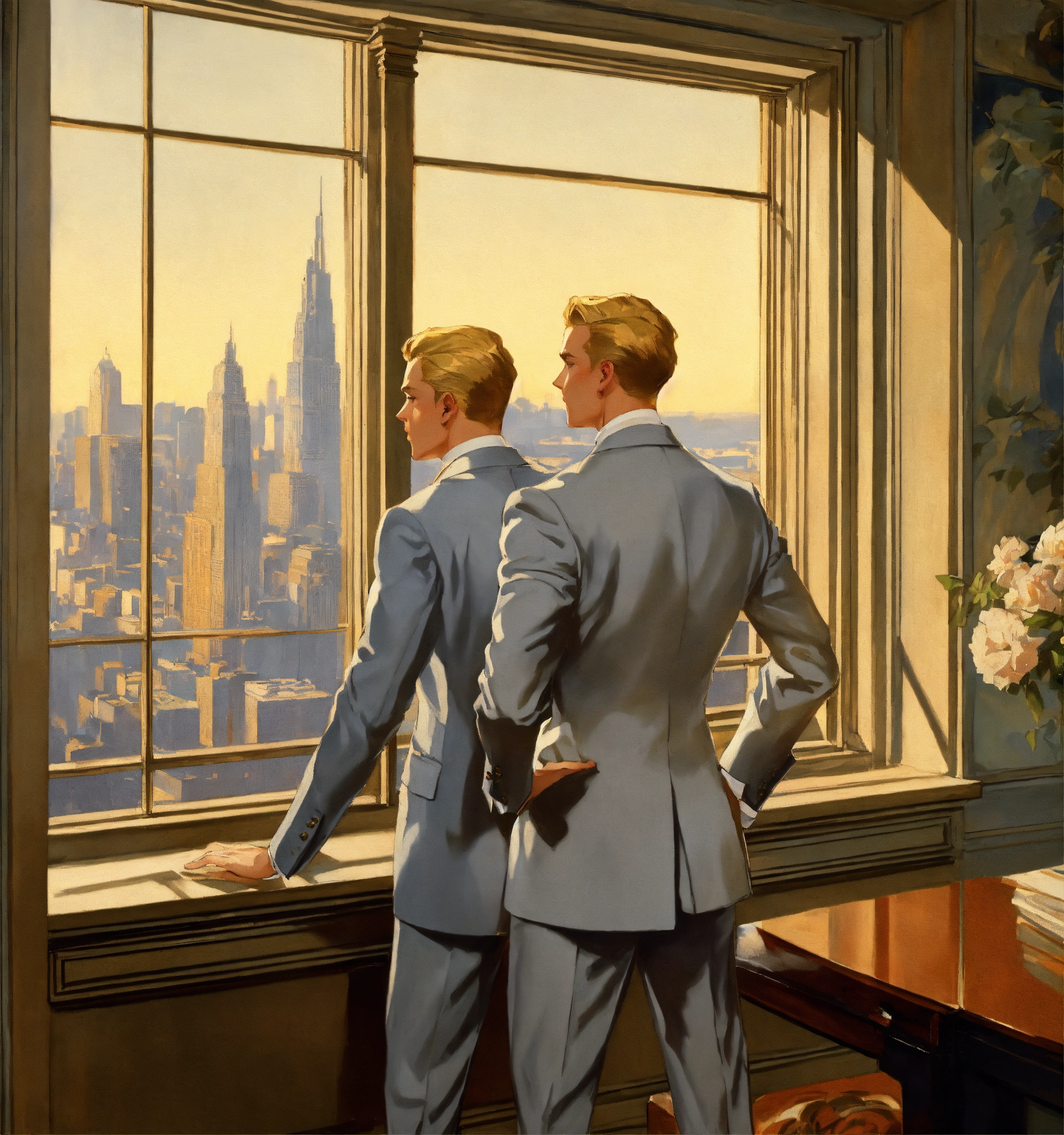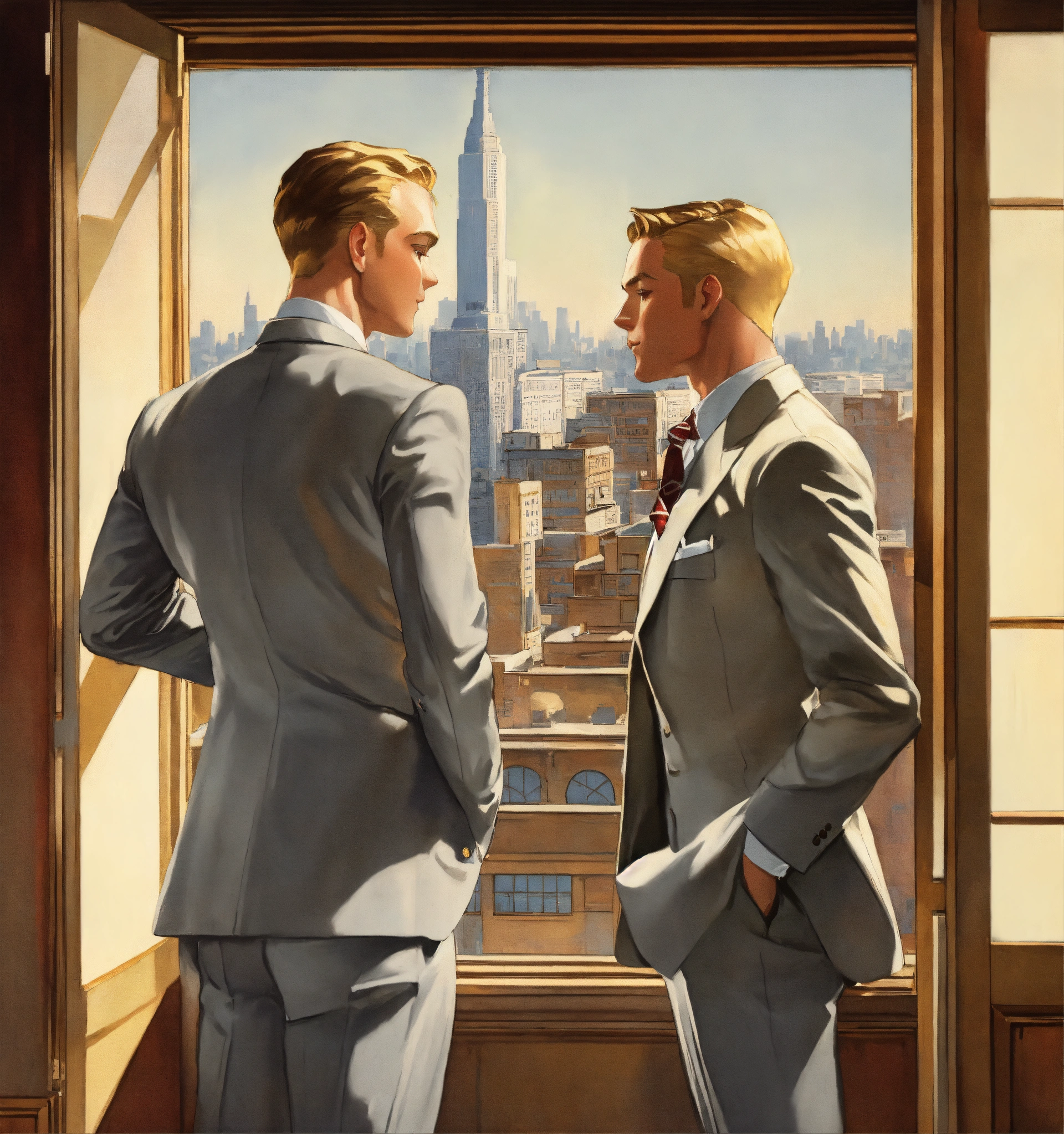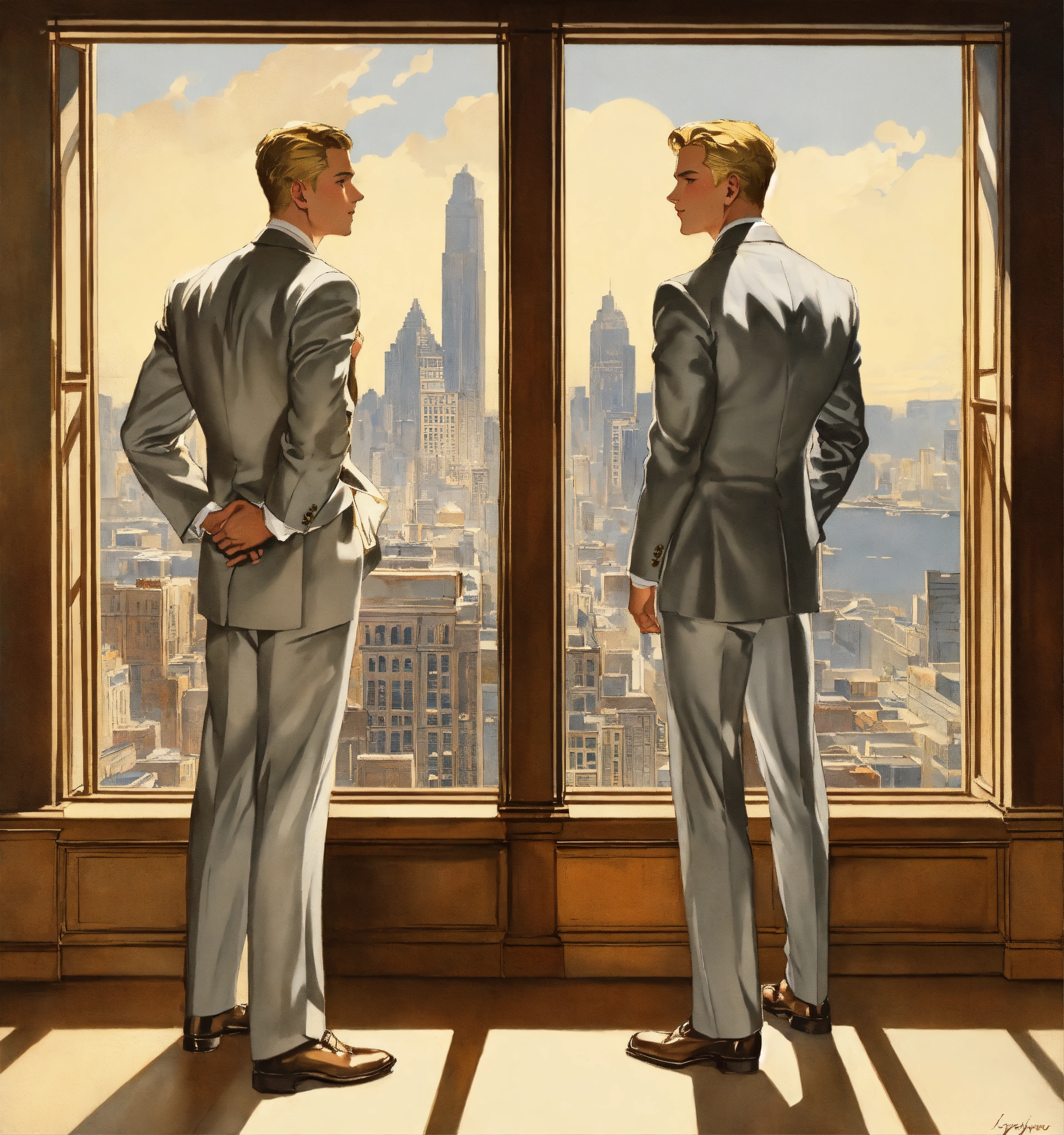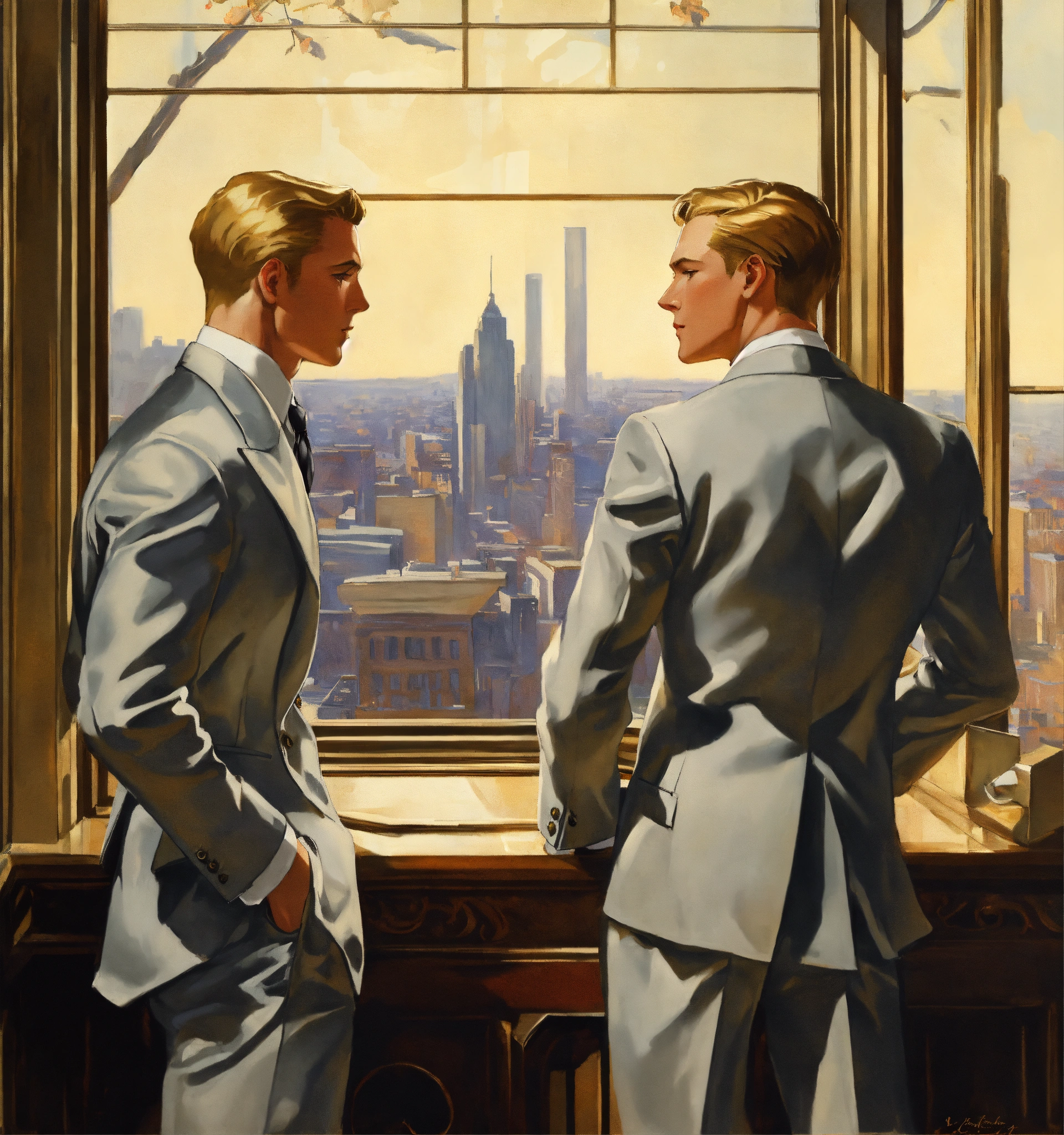 Two blonde male businessmen, light grey vested suit, bending throughout a window toward the city, from behind, leyendecker style