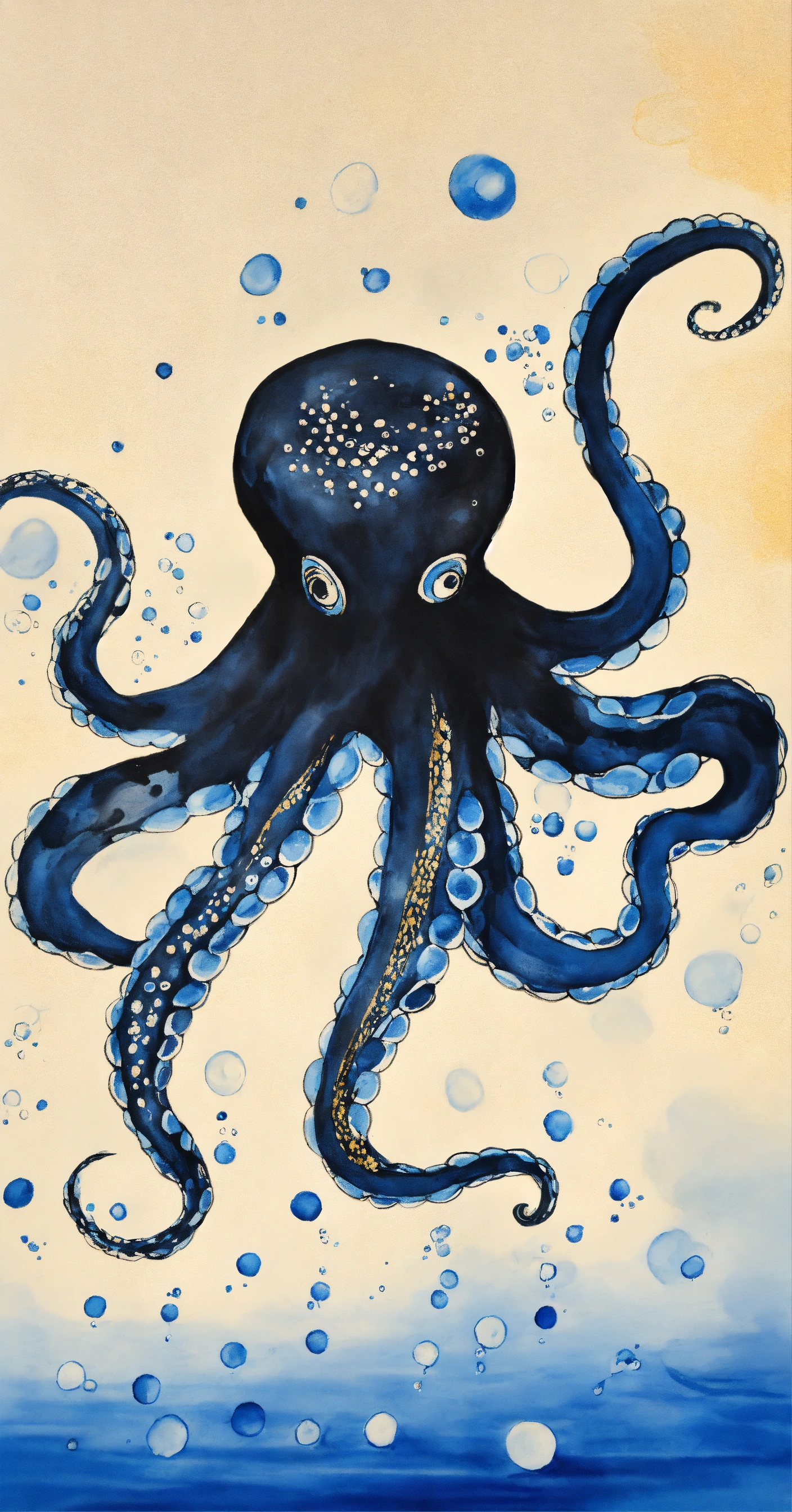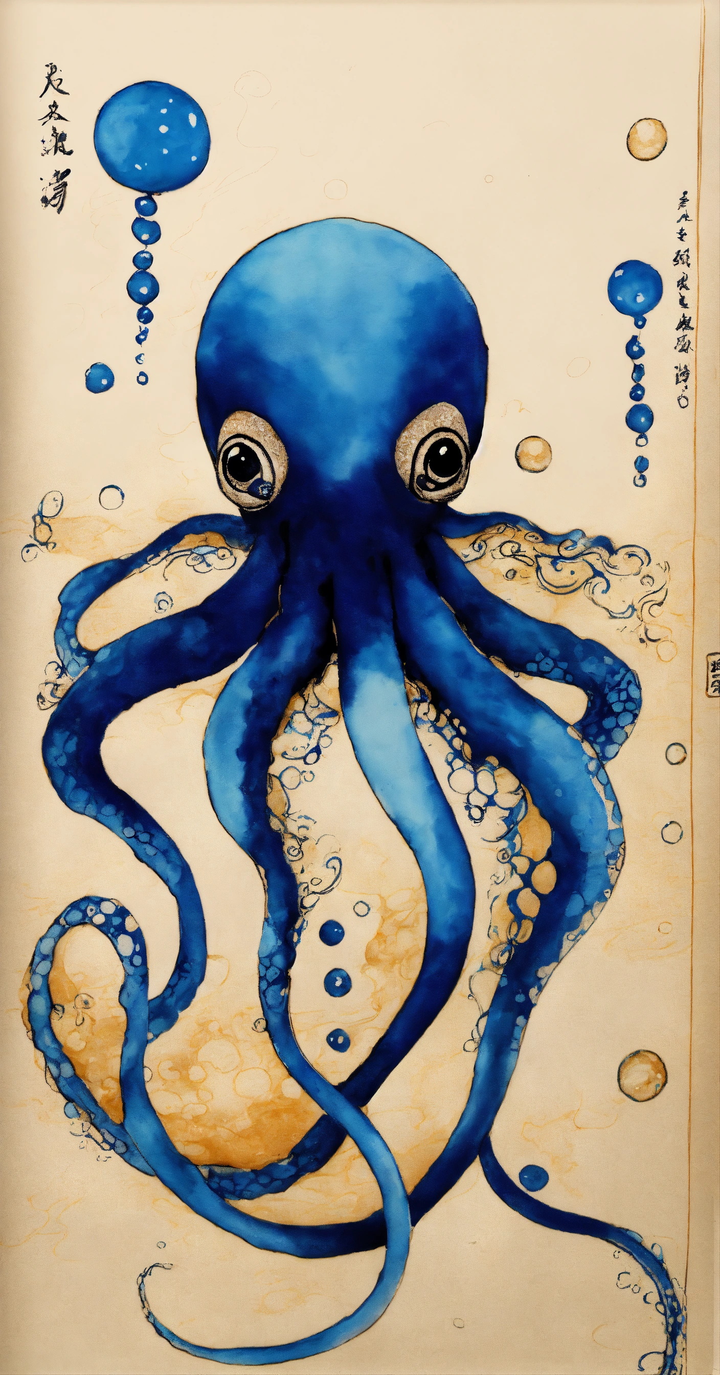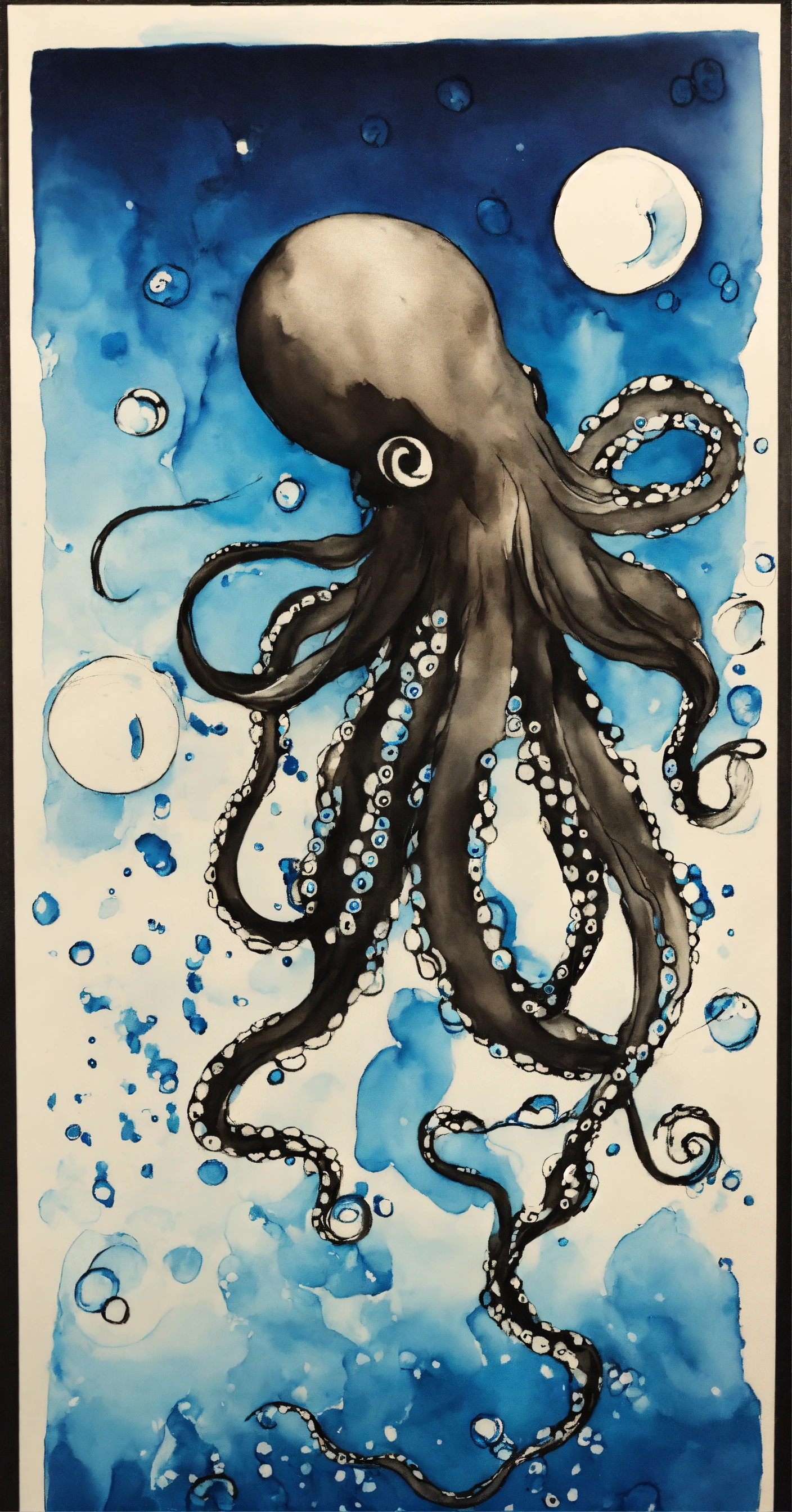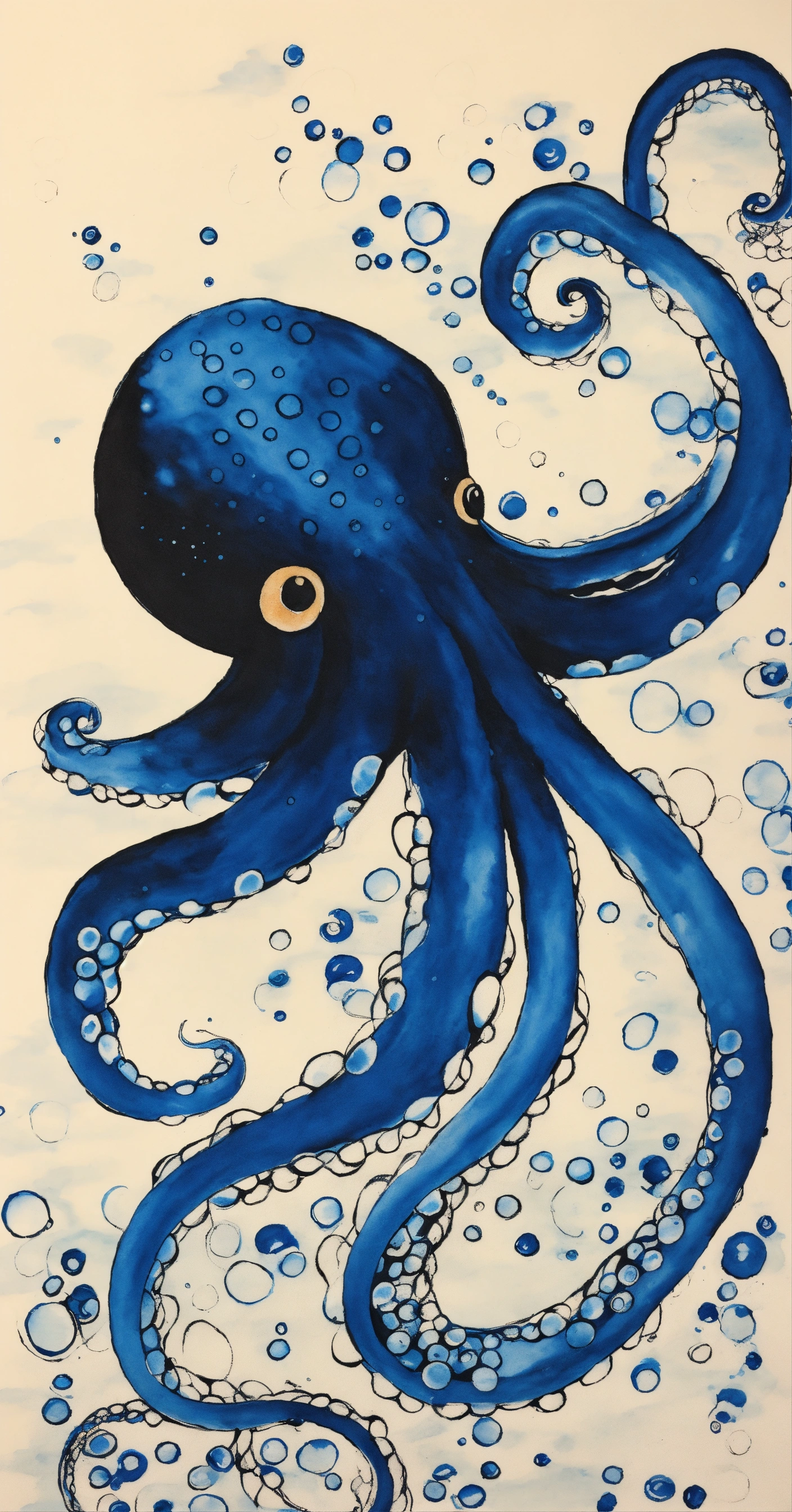 Shuǐmò huà, 水墨画, black and blue ink, a octupus in japanese style, dancing fishes, side view, water bubbles, ink art by mschiffer, whimsical, rough sketch