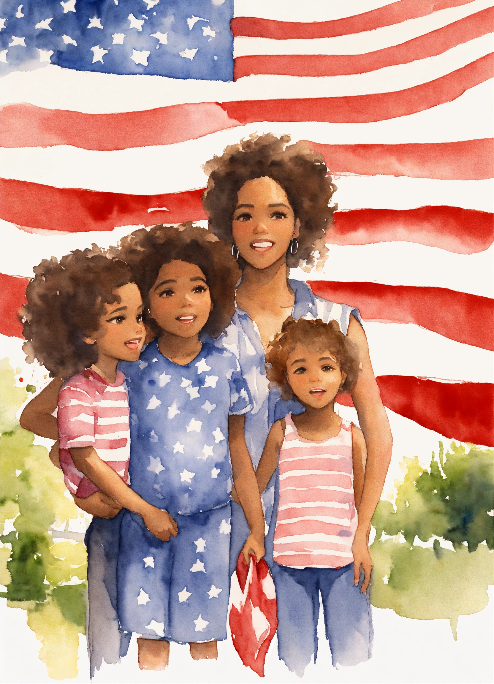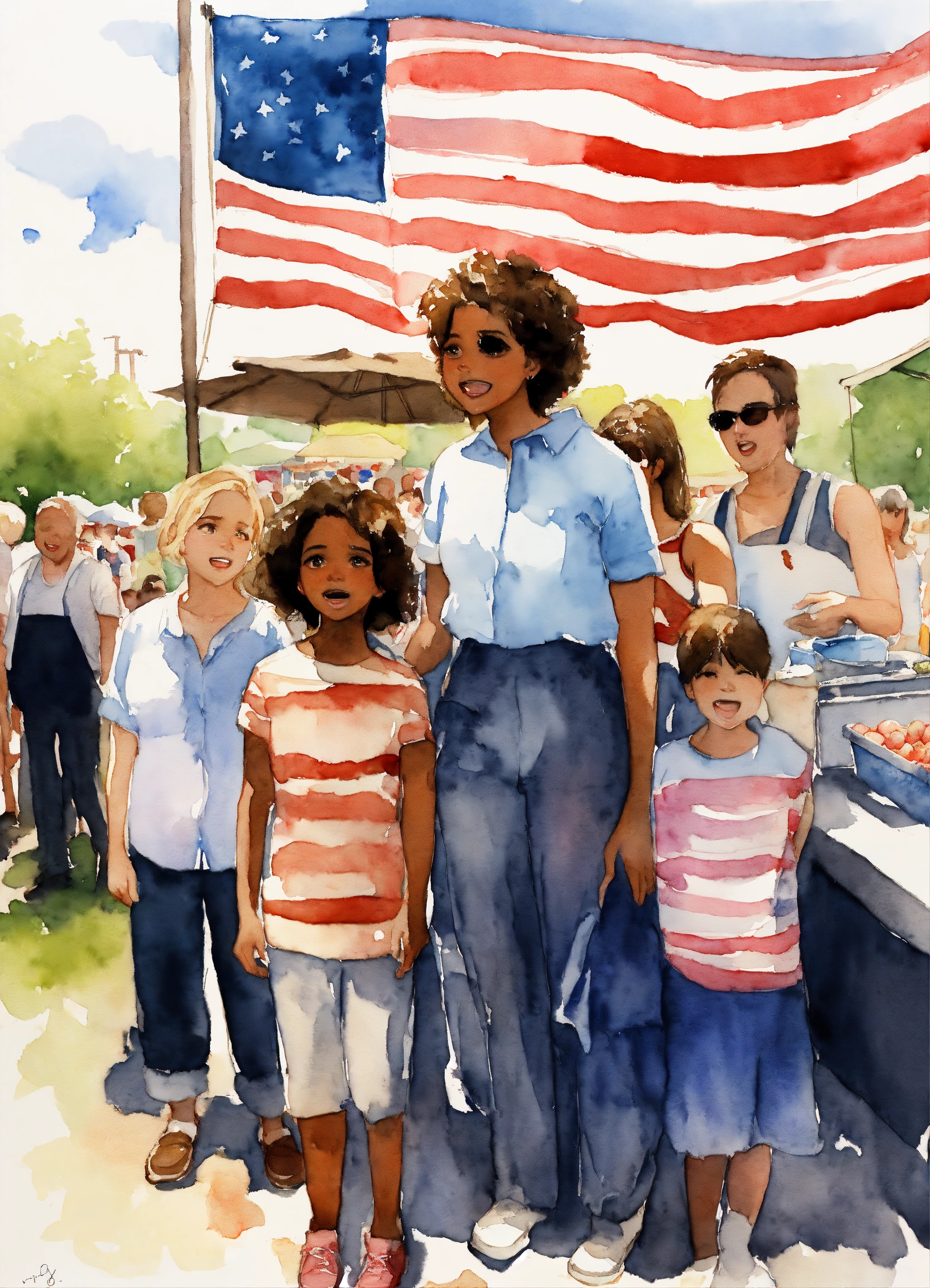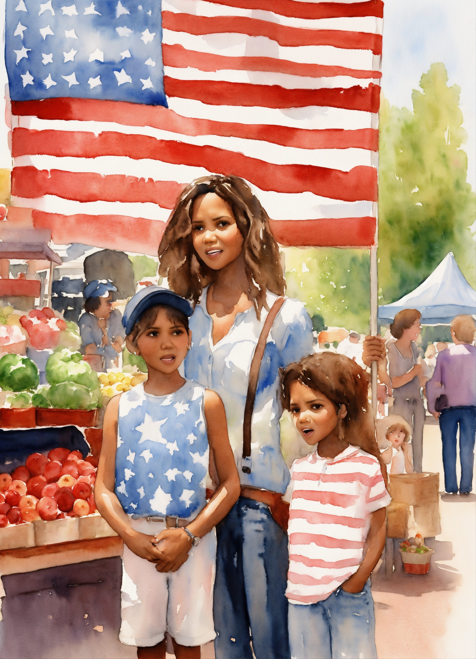 Watercolor pixar painting of 8 year old halle berry and her family singing the national anthem at the farmer's market with the american flag in the background, watercolor pixar style cartoon