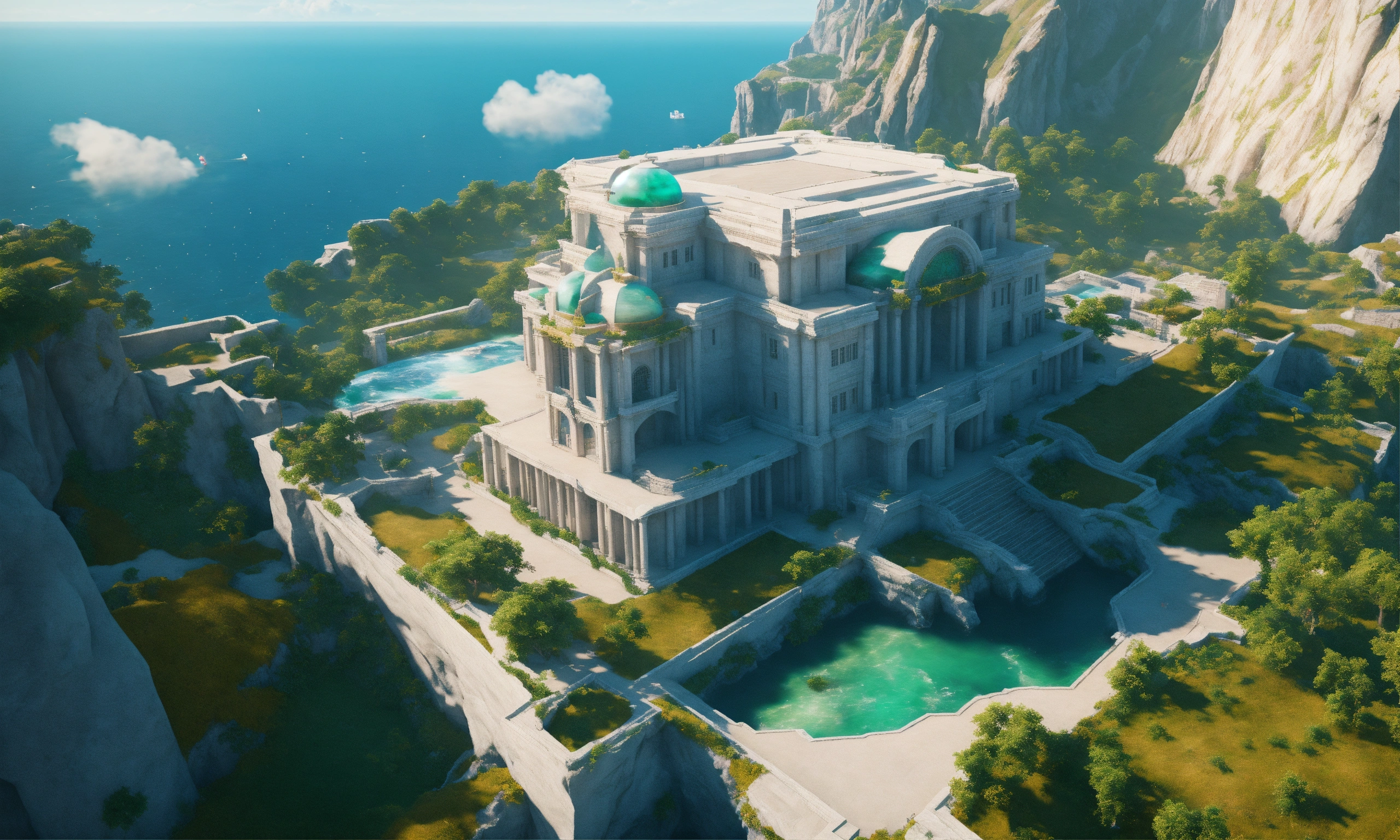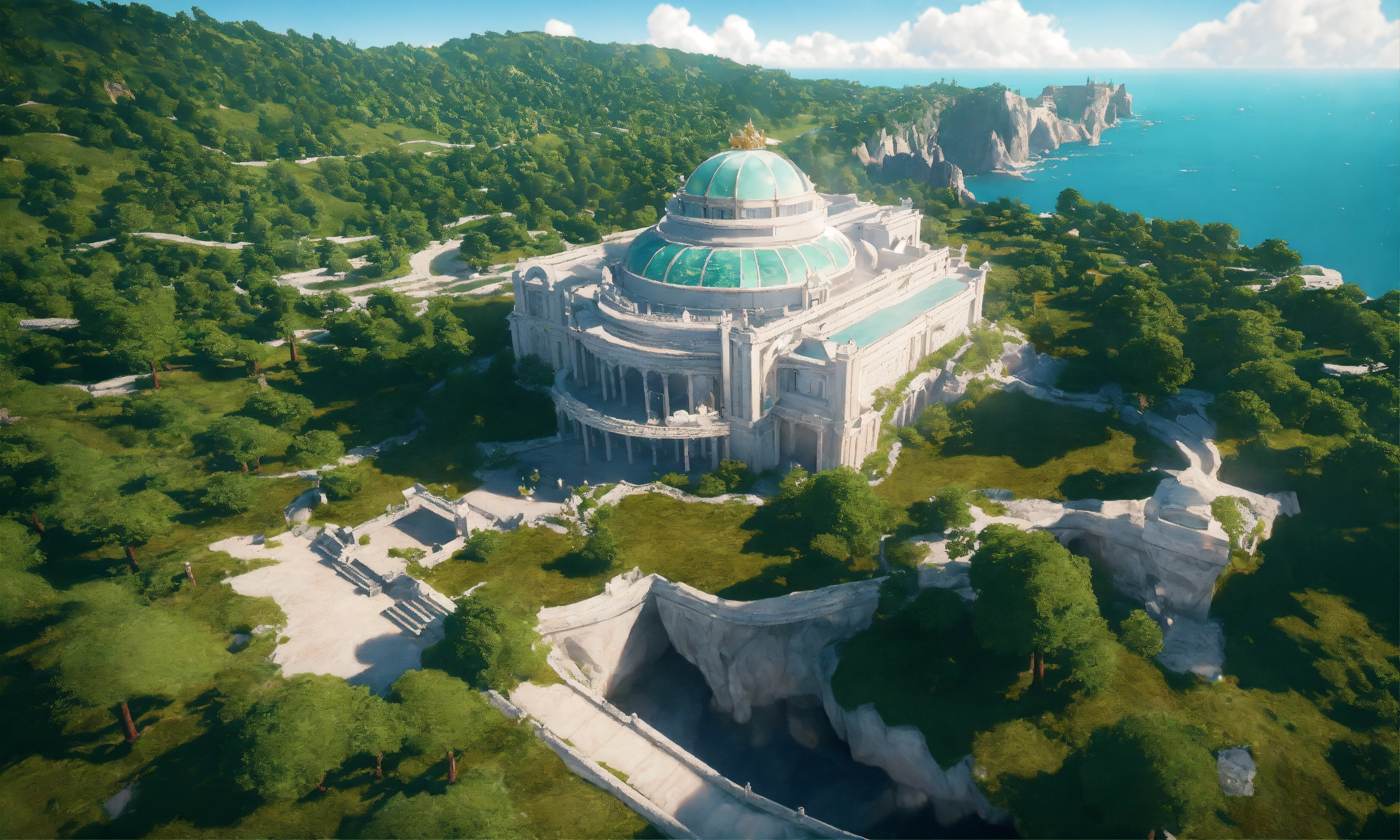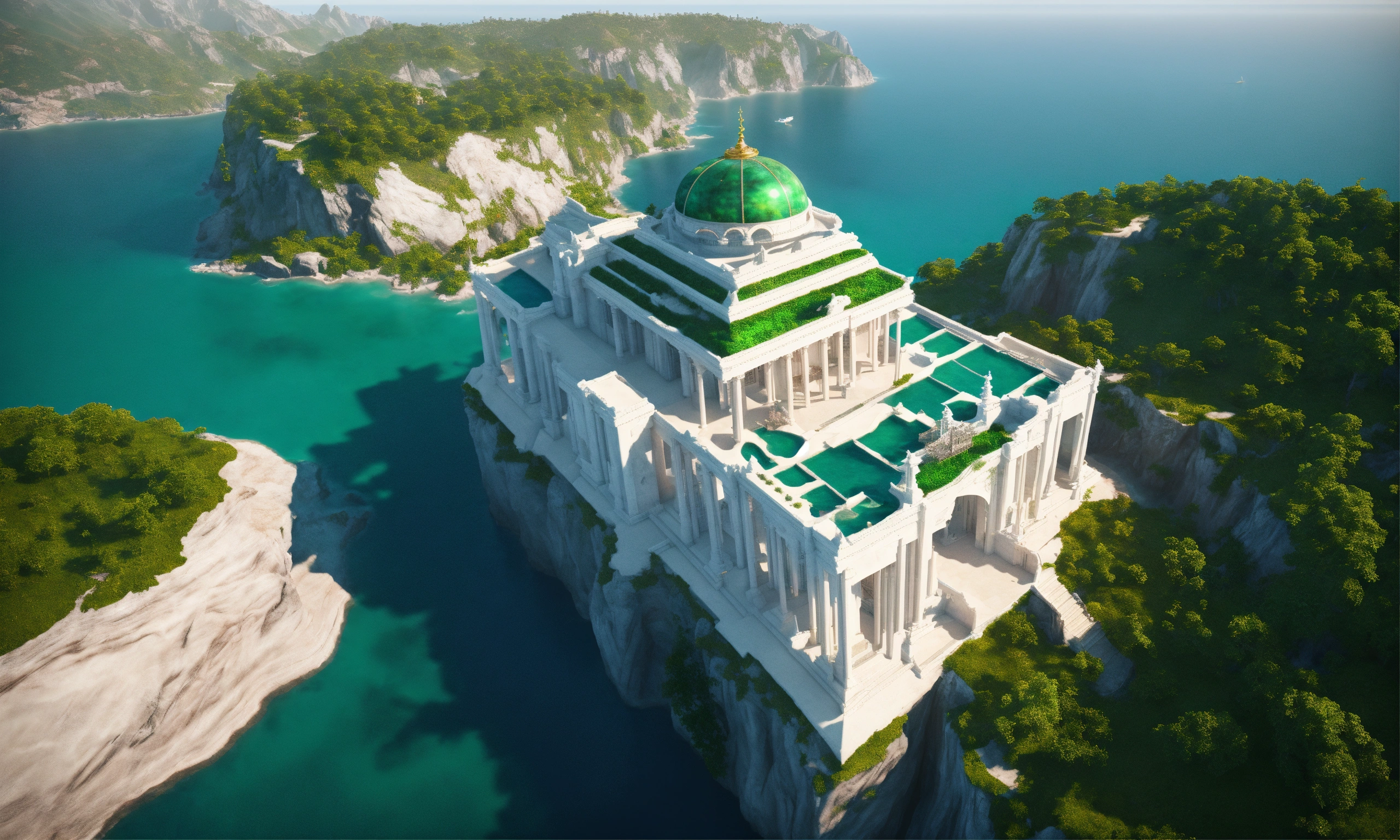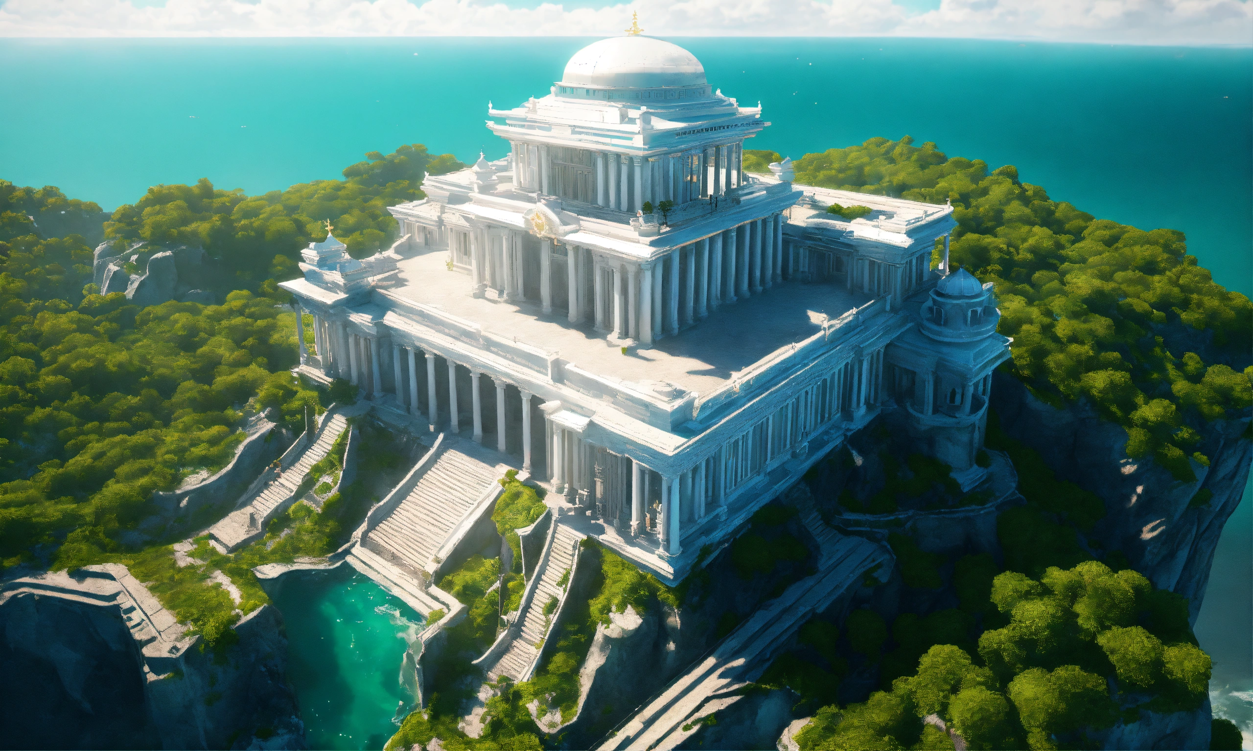Overhead view of a white marble and jade sci fi royal palace on a cliff overlooking a the ocean in summer, russian architecture, 8k, unreal engine