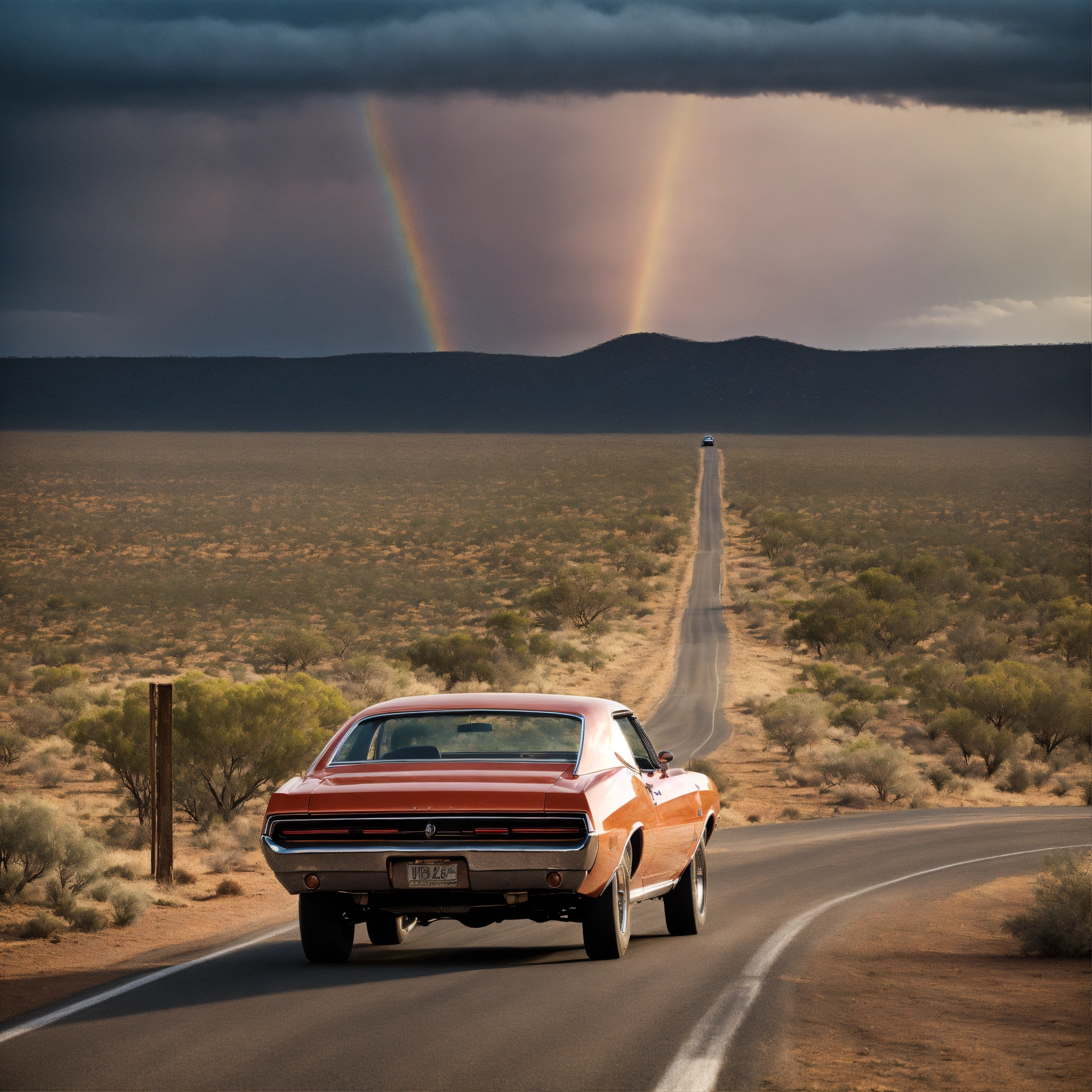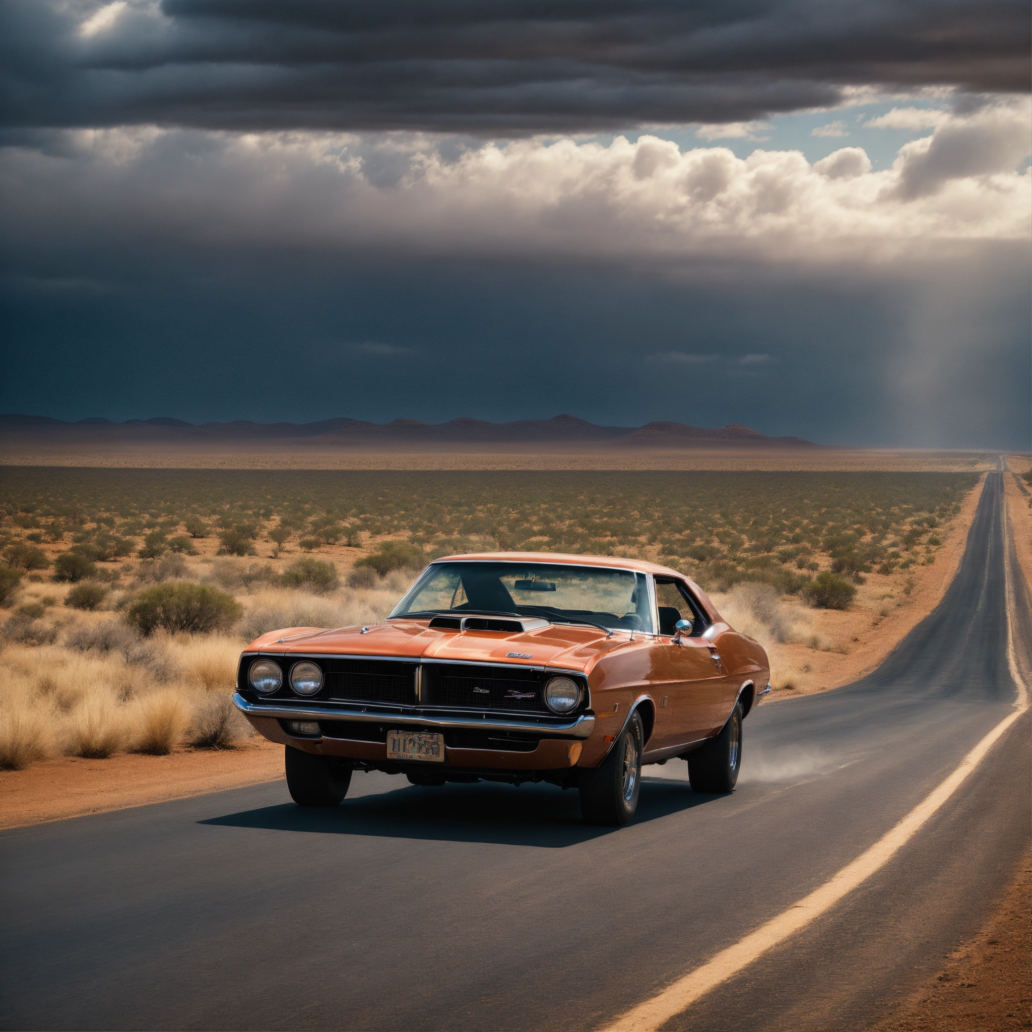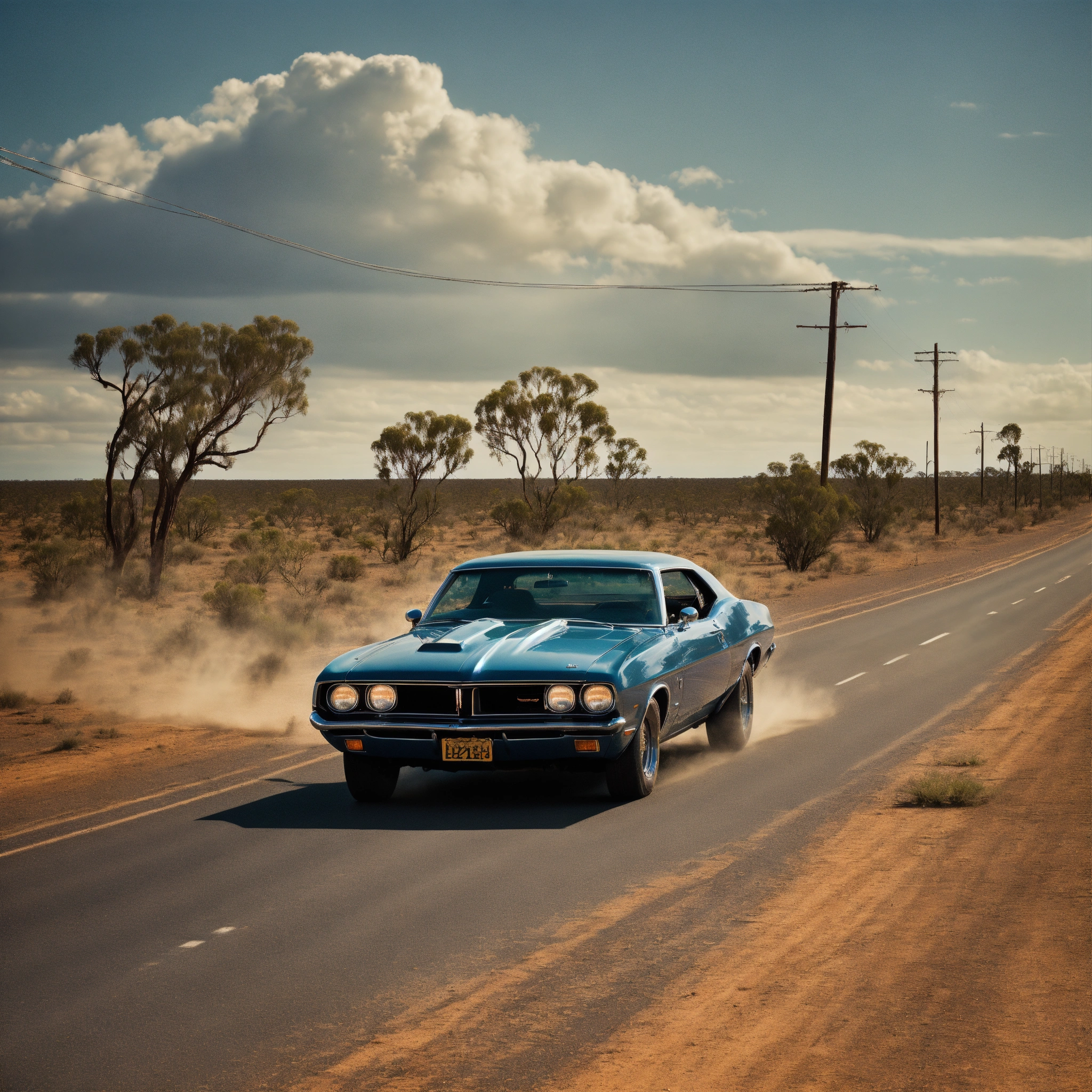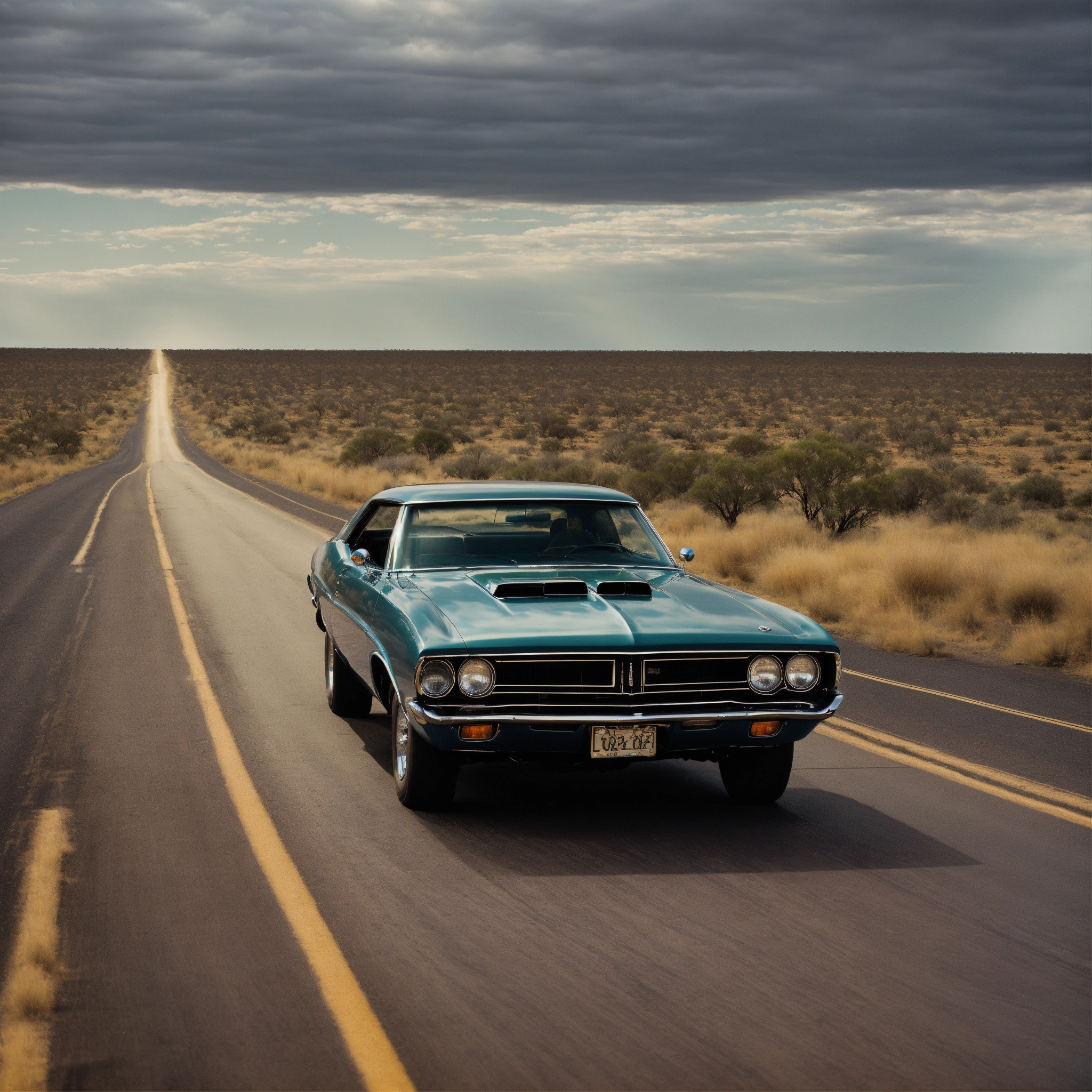 A photograph of a classic muscle car driving on a wide road in the outback, gregory crewdson style wide format