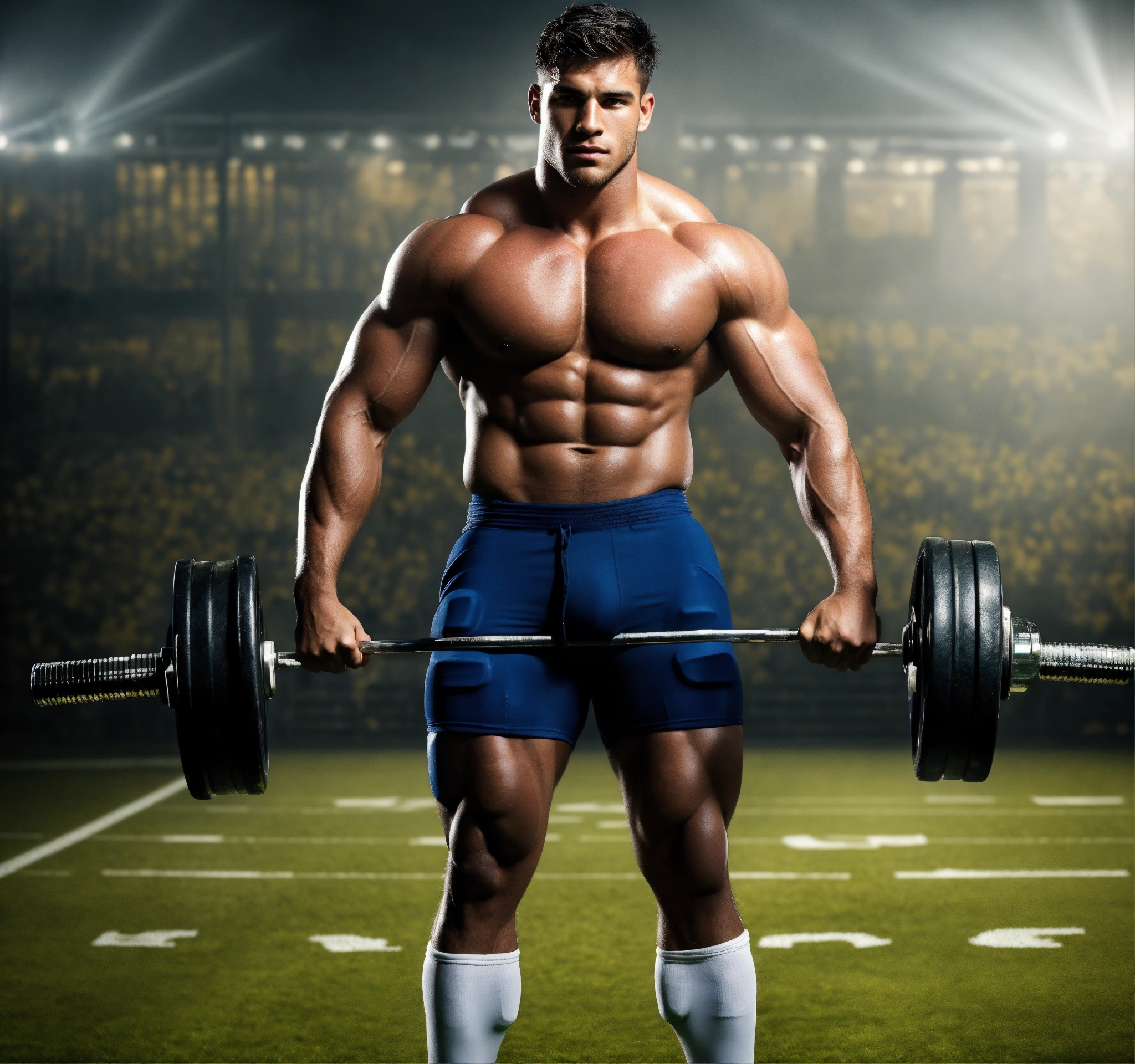 Generate an image of a handsome, masculine american football player with a heavyweight physique. he should be sweaty and muscular, with his shirt off and his muscles glistening in the light. he should be standing in a gym, with weights in his hands and a determined look on his face. he should be victorious and proud of his accomplishment, but also relaxed and at peace with himself.