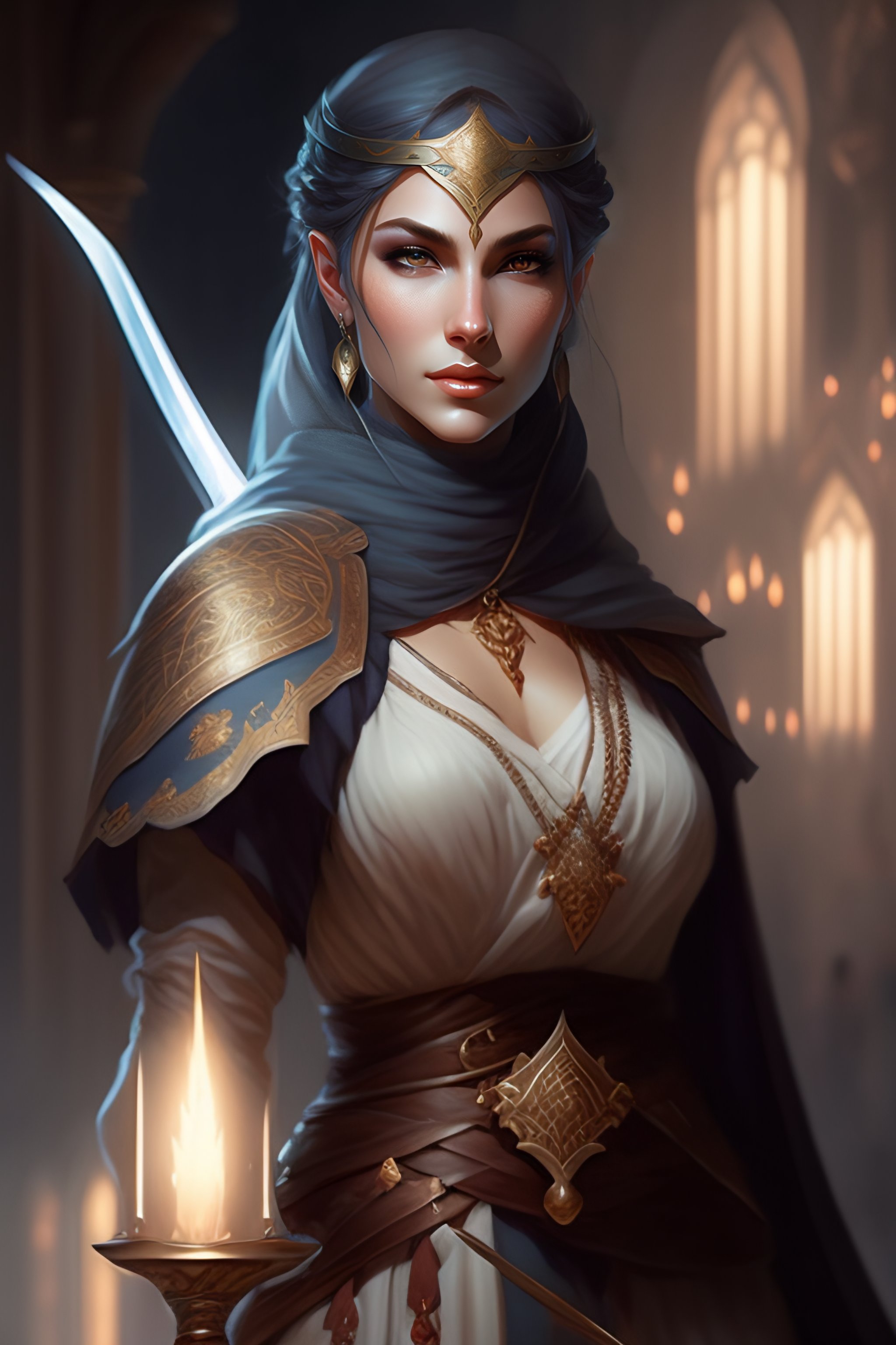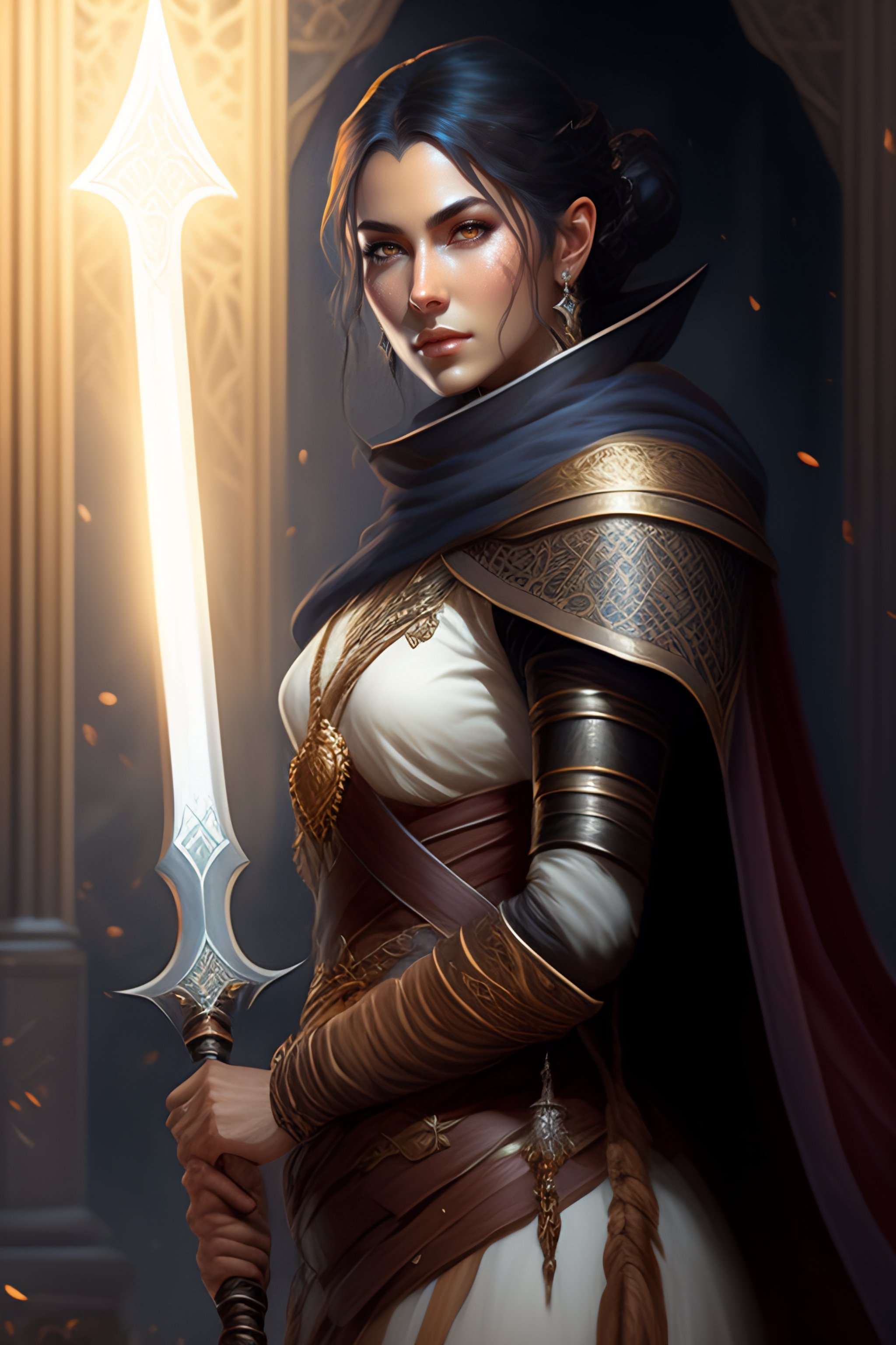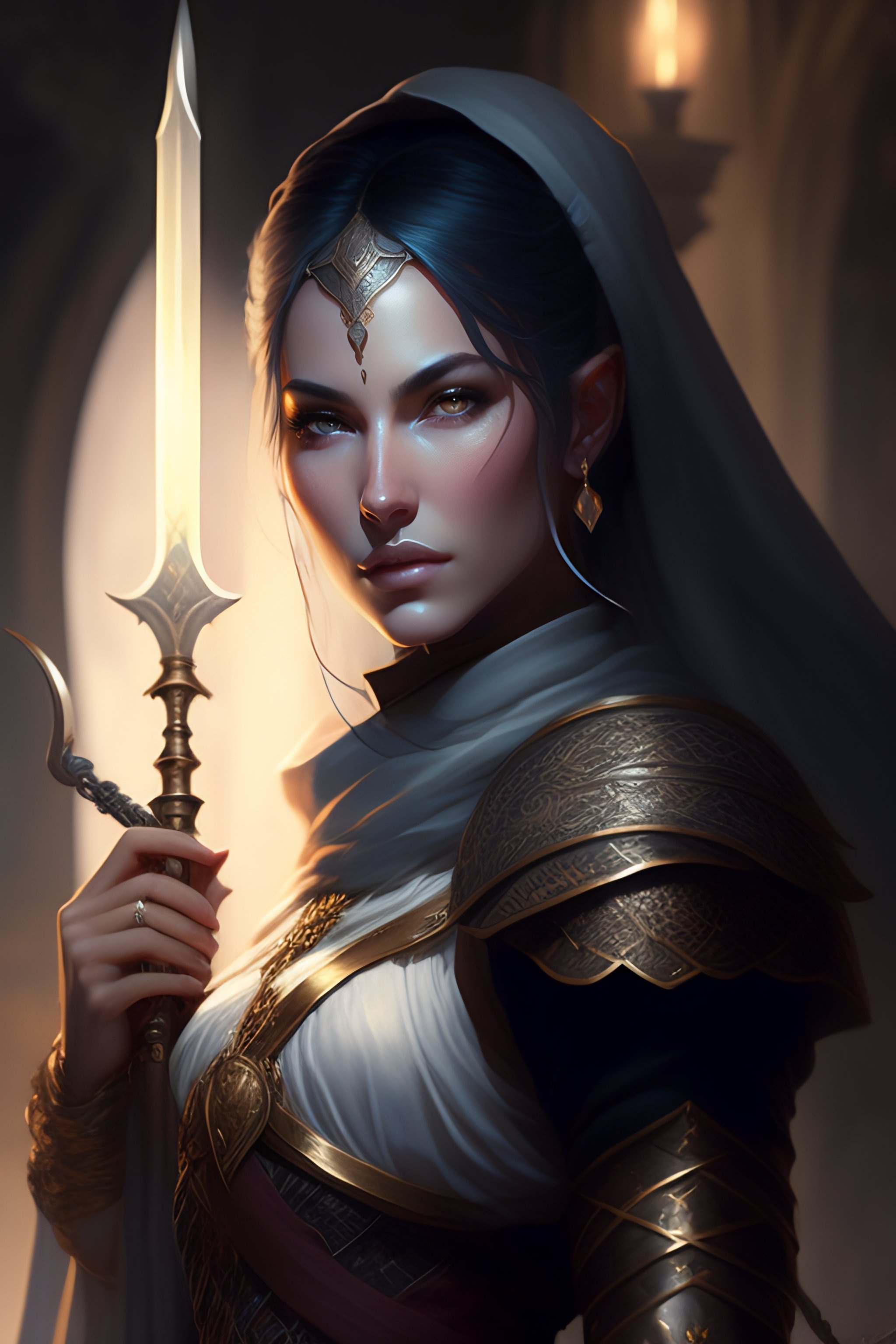 Female cleric in center, dnd, fantasy, gray short hair, holding sword, dark light night, intricate, elegant, sharp focus, illustration, highly detailed, dark lighting, full body, digital painting, concept art, matte, art by wlop and artgerm and greg rutkowski and alphonse mucha, masterpiece