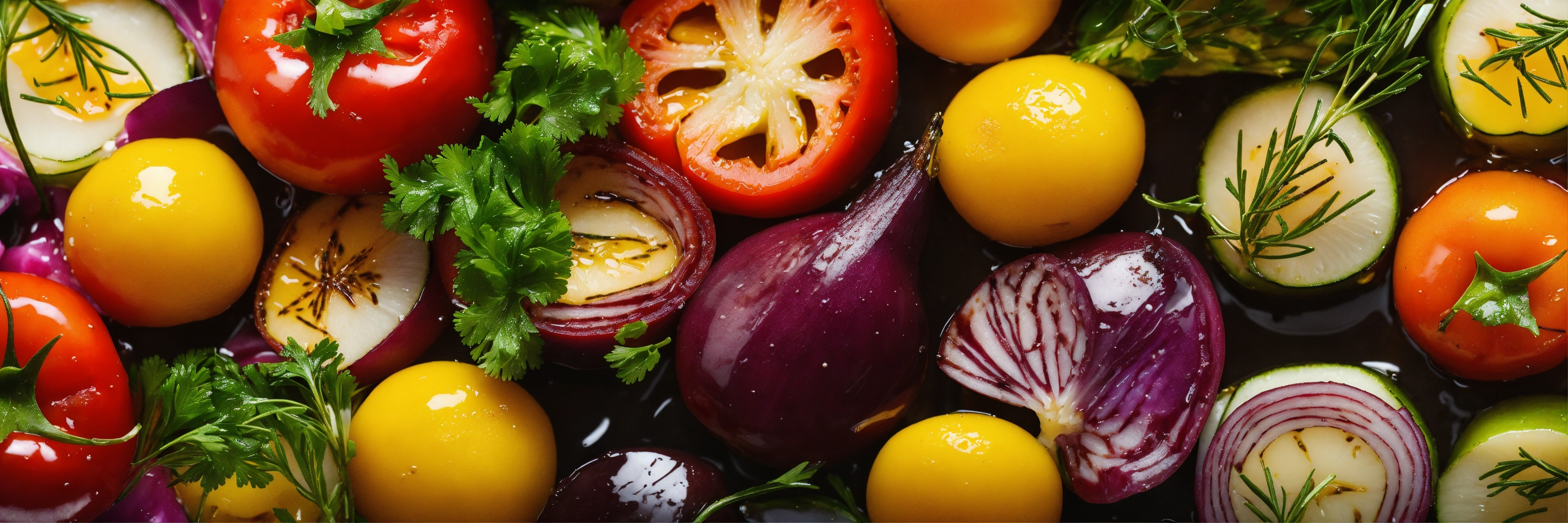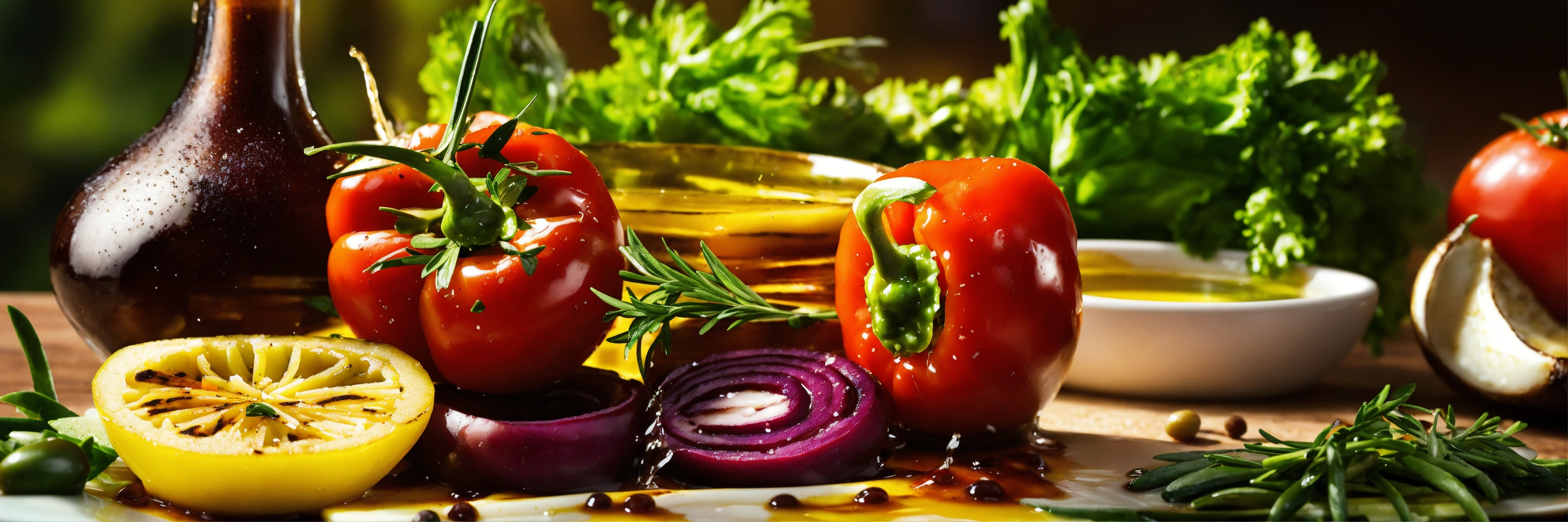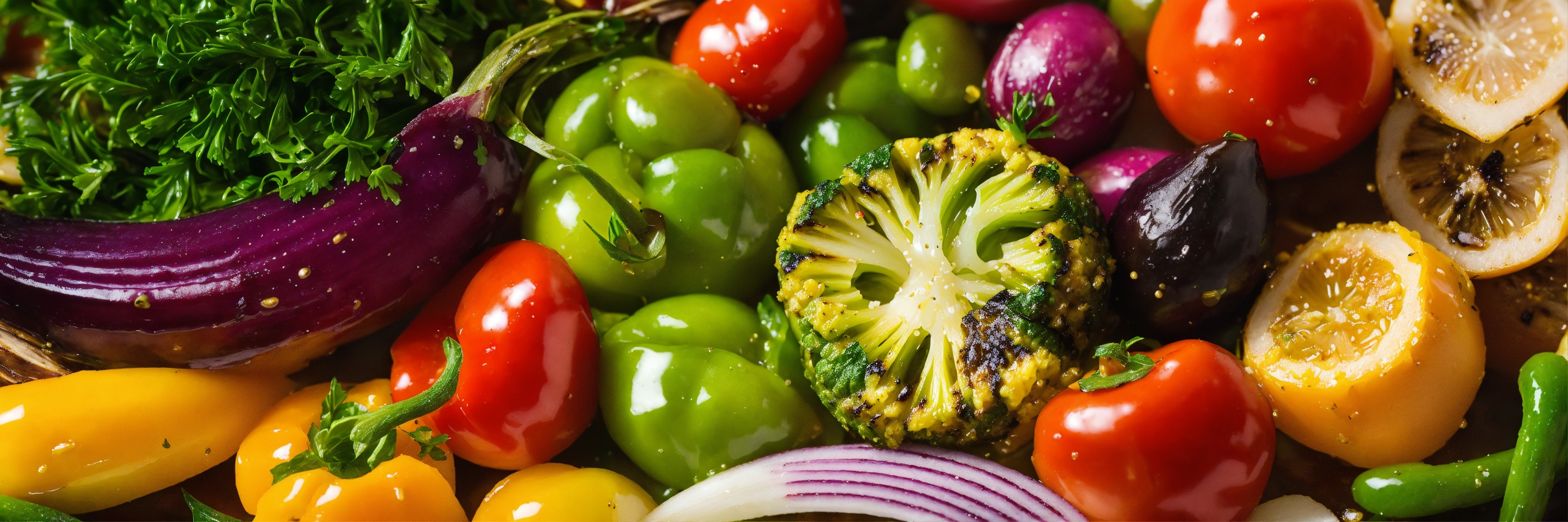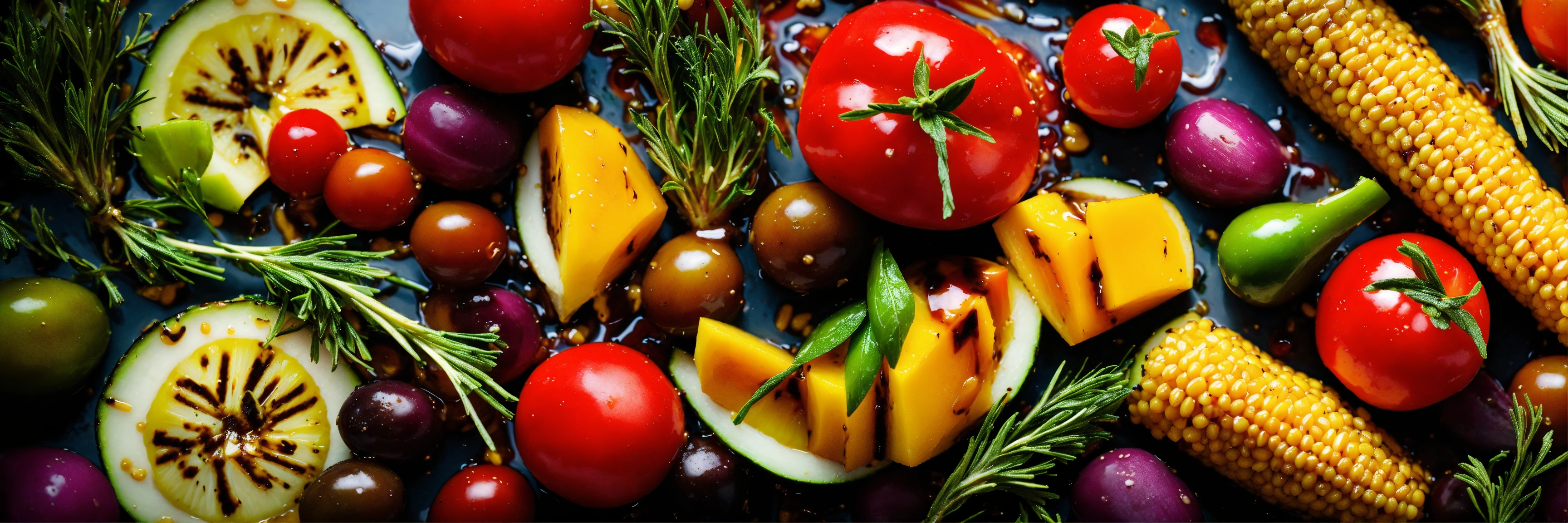 Assorted grilled vegetables with spectacular splashes of olive oil and vinegar. creative dynamic composition varies the angle. macro food photography, taken by an expensive, very high-tech camera. eye-catching, enticing and captivating. photo product, ideal for poster promotion. 8k, hd quality, ultra realistic, hyper detailed. original idea taken from a different angle.