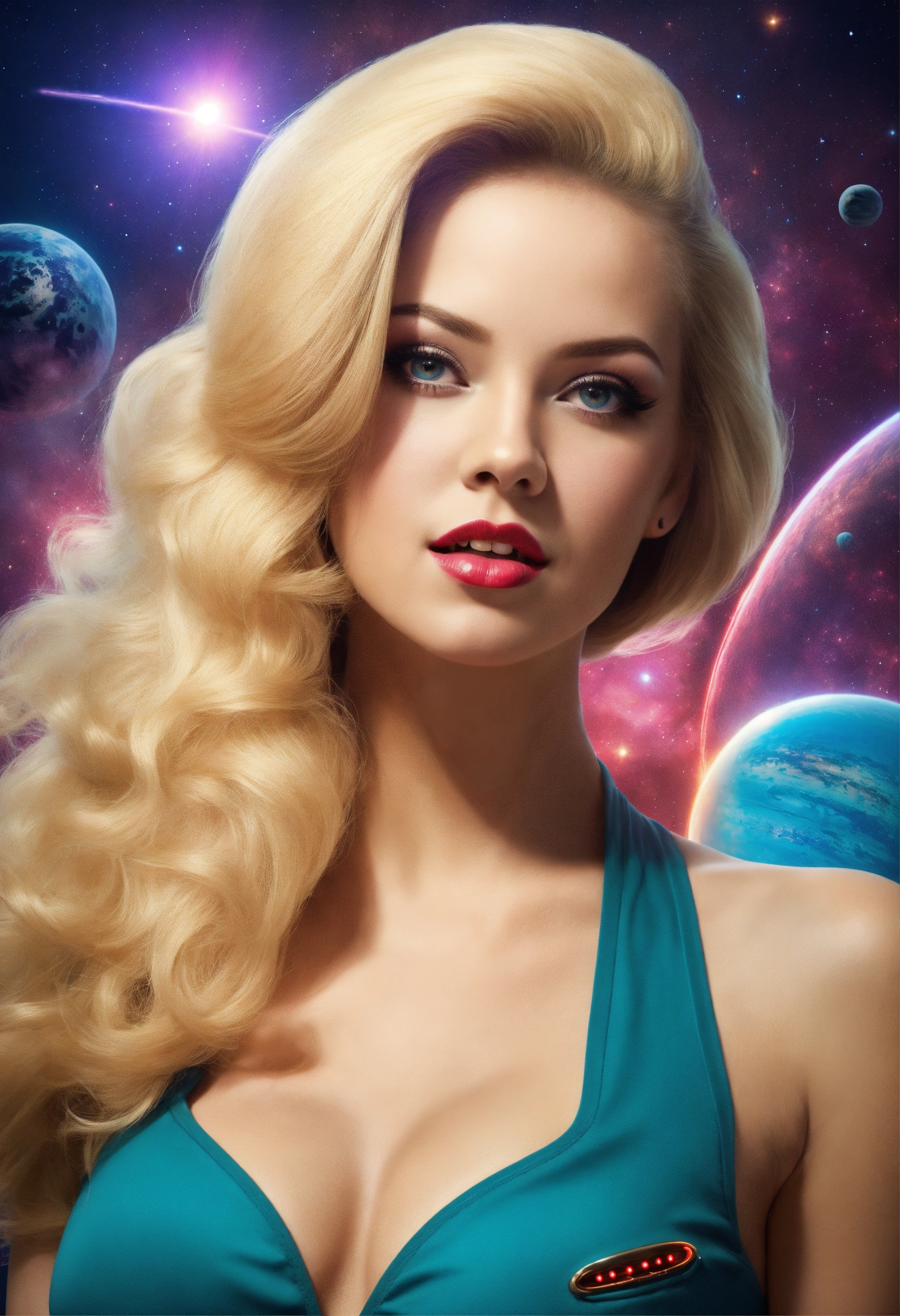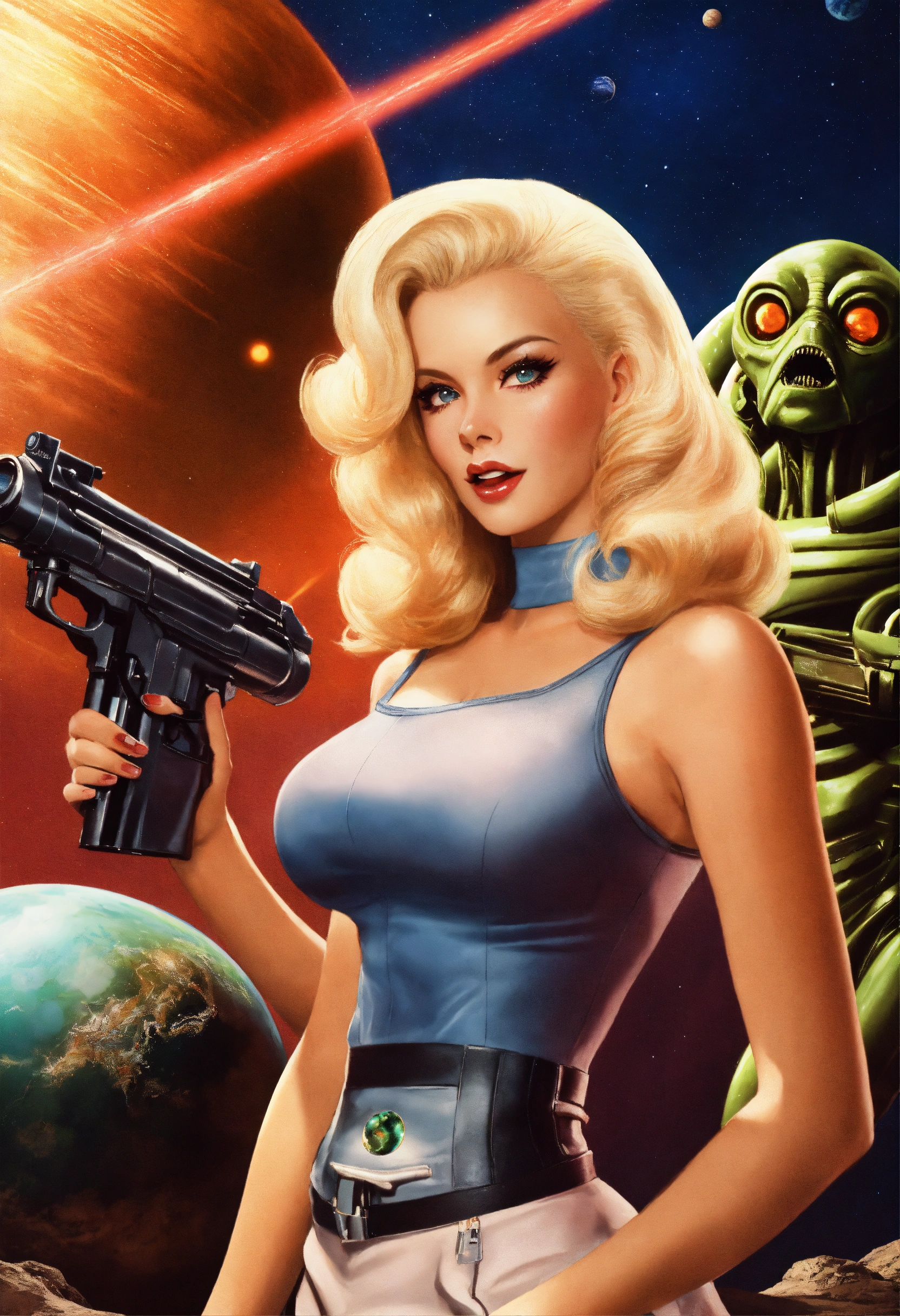 Photo, sci-fi, blonde, long hair, real, flirtatious, winking, bombshell, bimbo, aliens, planets, outer space, ray gun, laser gun, skin tight, scary creatures in background, pinup, professional photo, glamour photo, straight hair, pretty, cute, bubbly