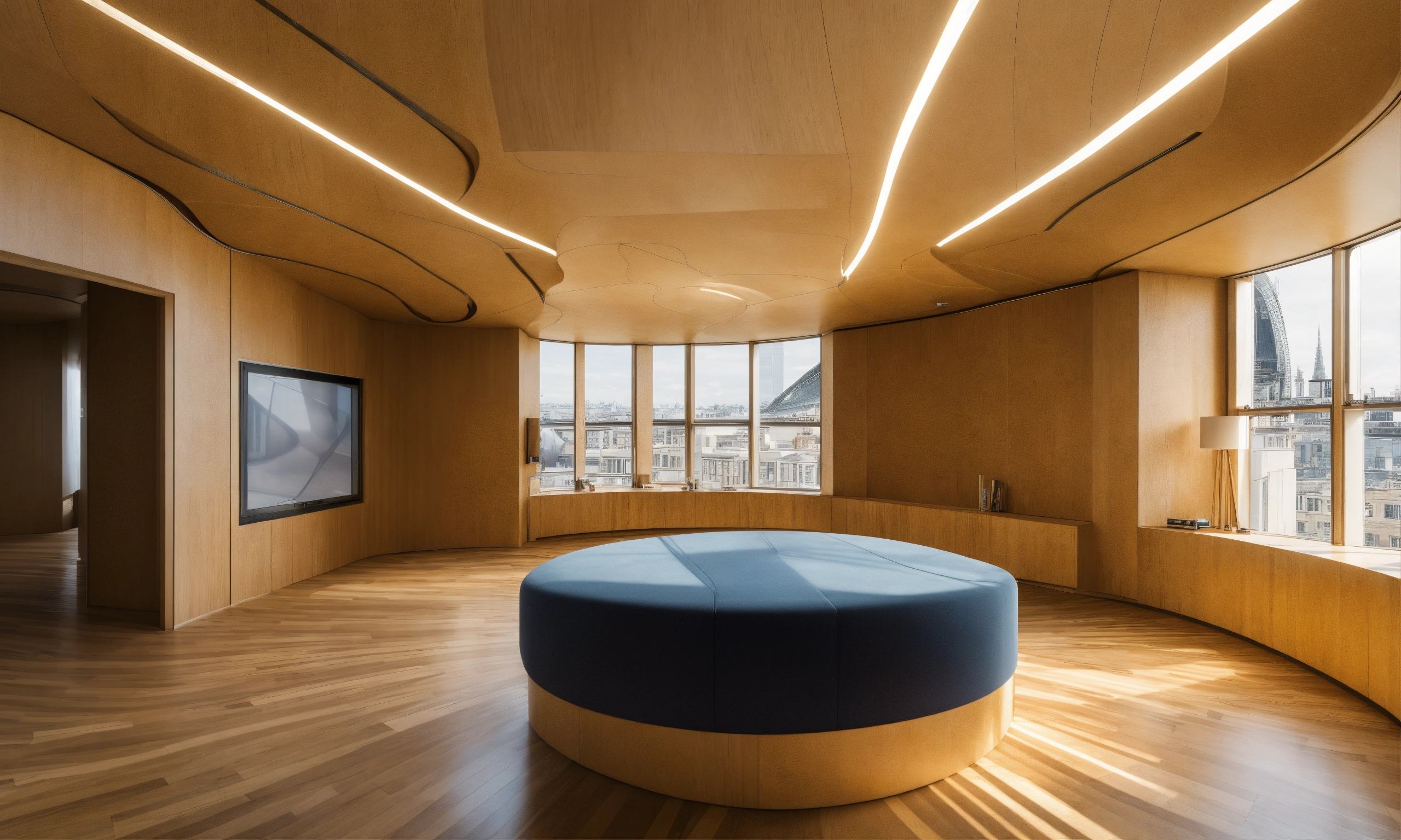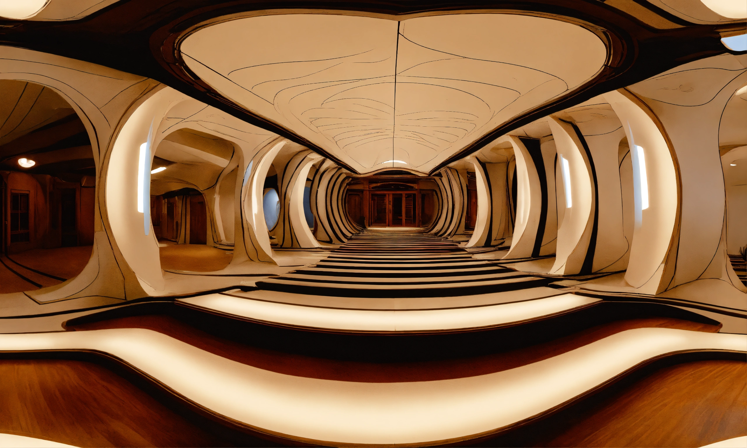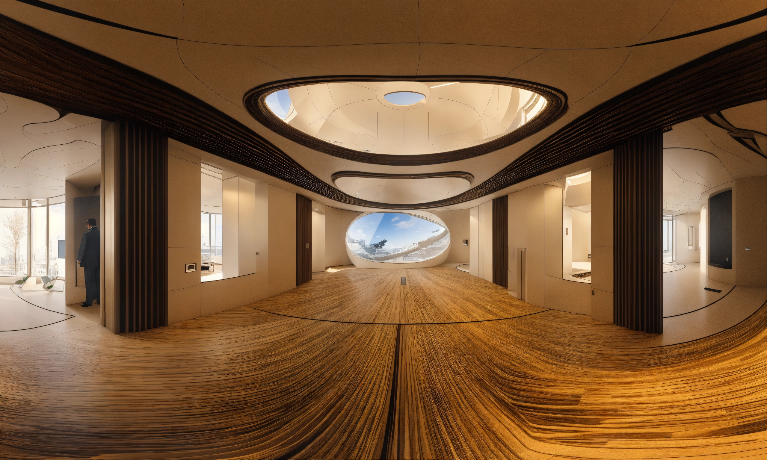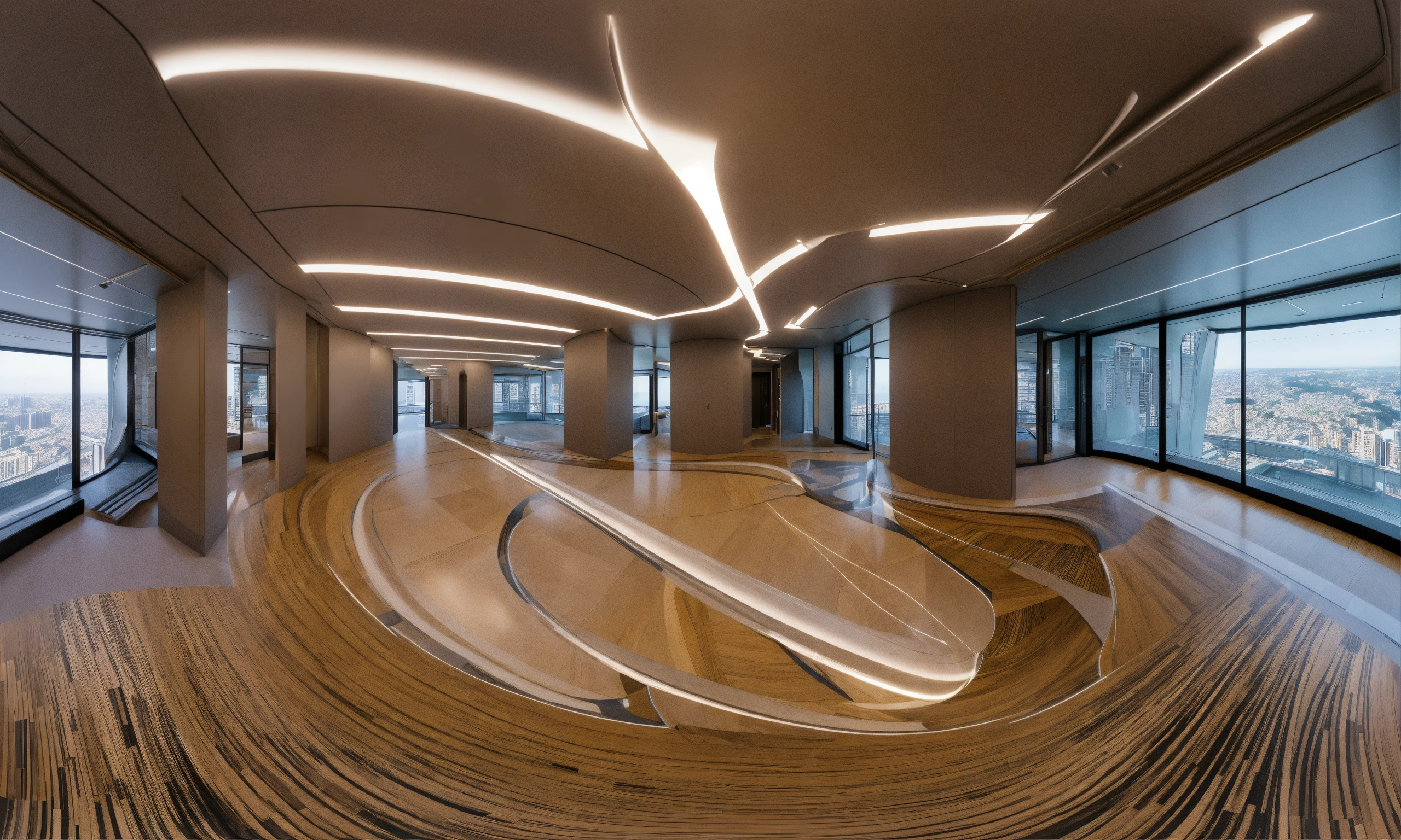 Seamless equirectangular projection of a 360 view inside a building made by zaha hadid