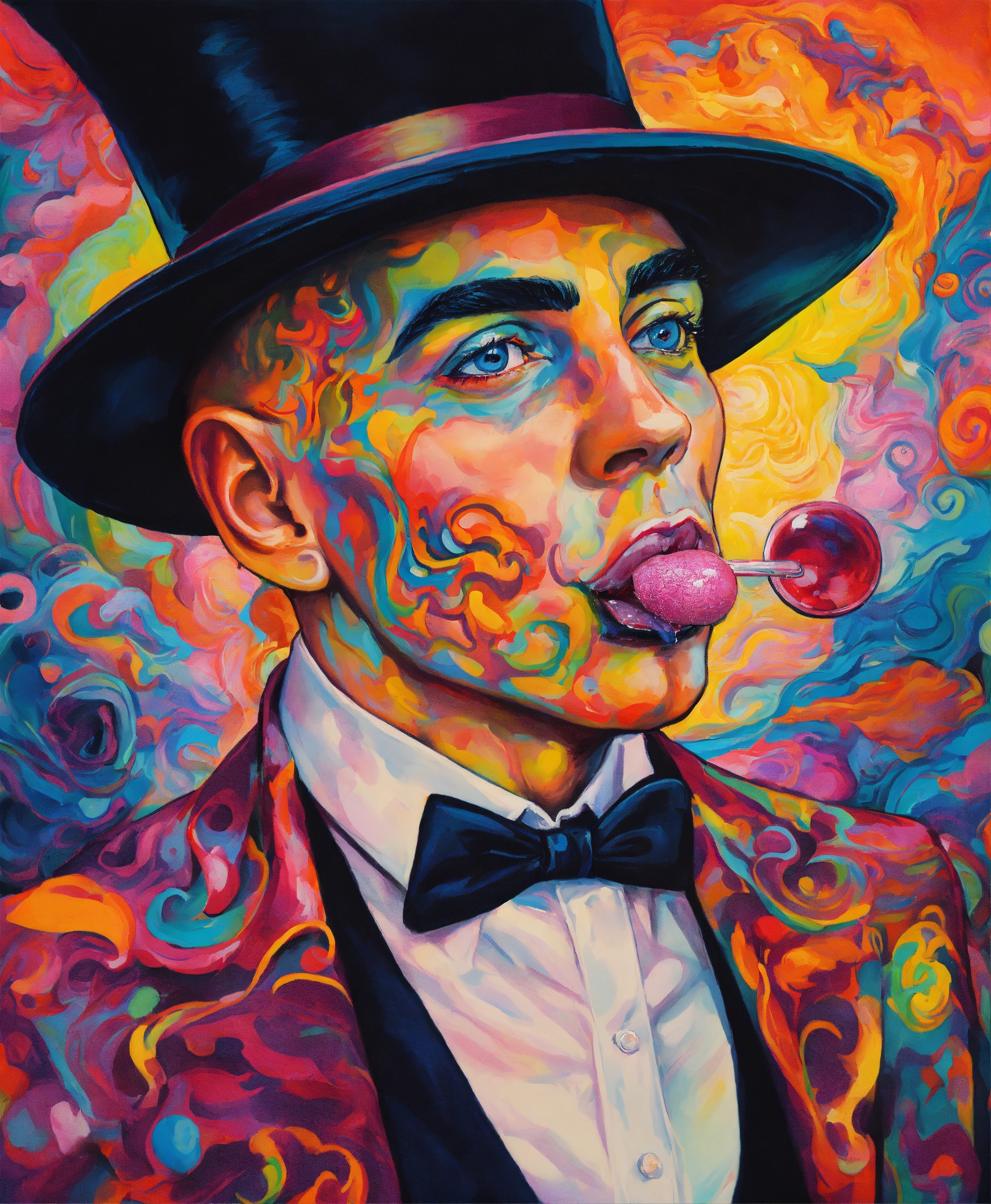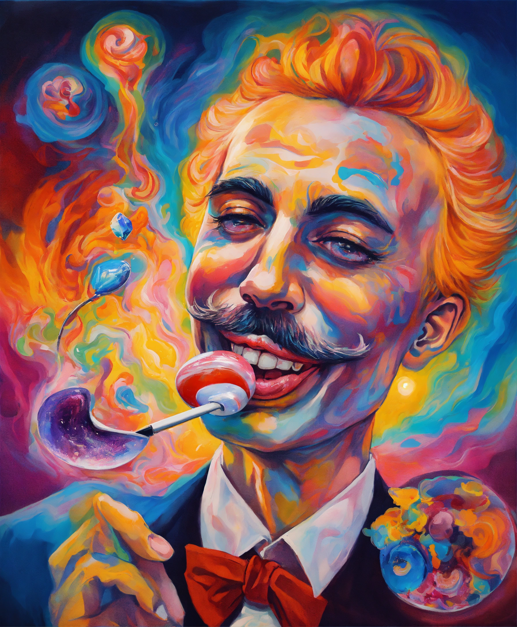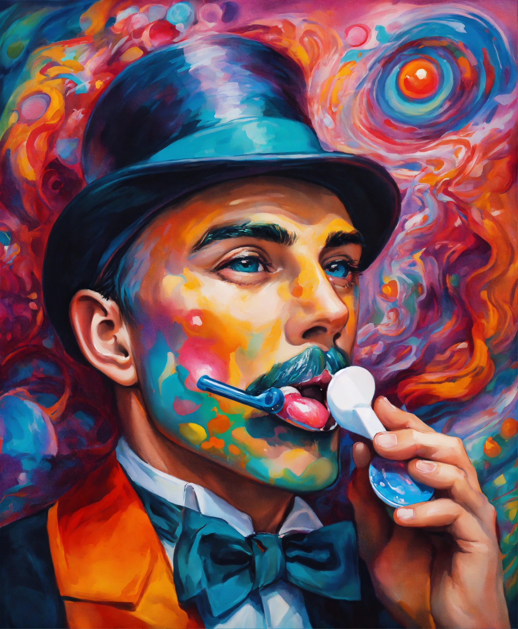 A colorful vibrant closeup portrait of a magician licking a tab of lsd acid on his tongue and dreaming psychedelic hallucinations, by piccasso