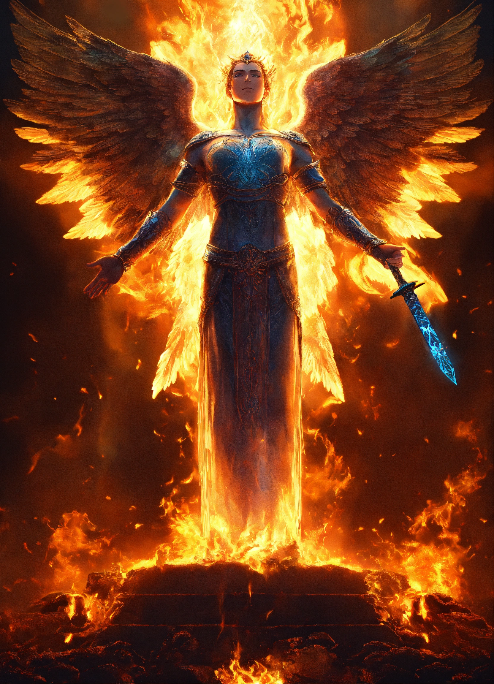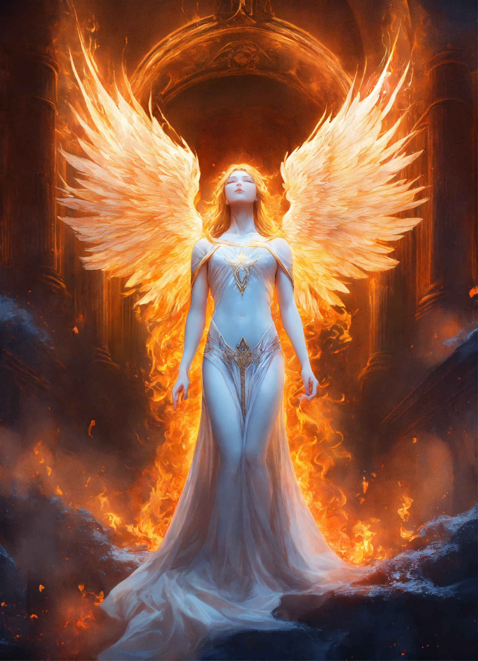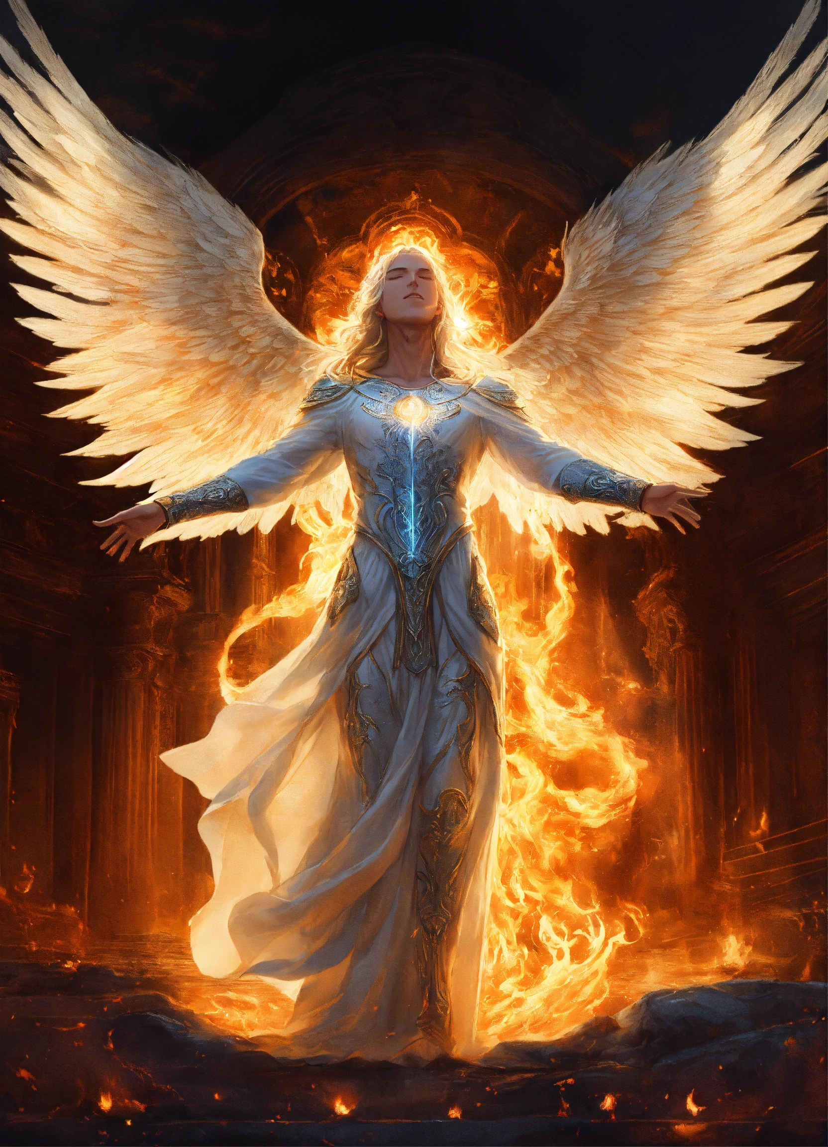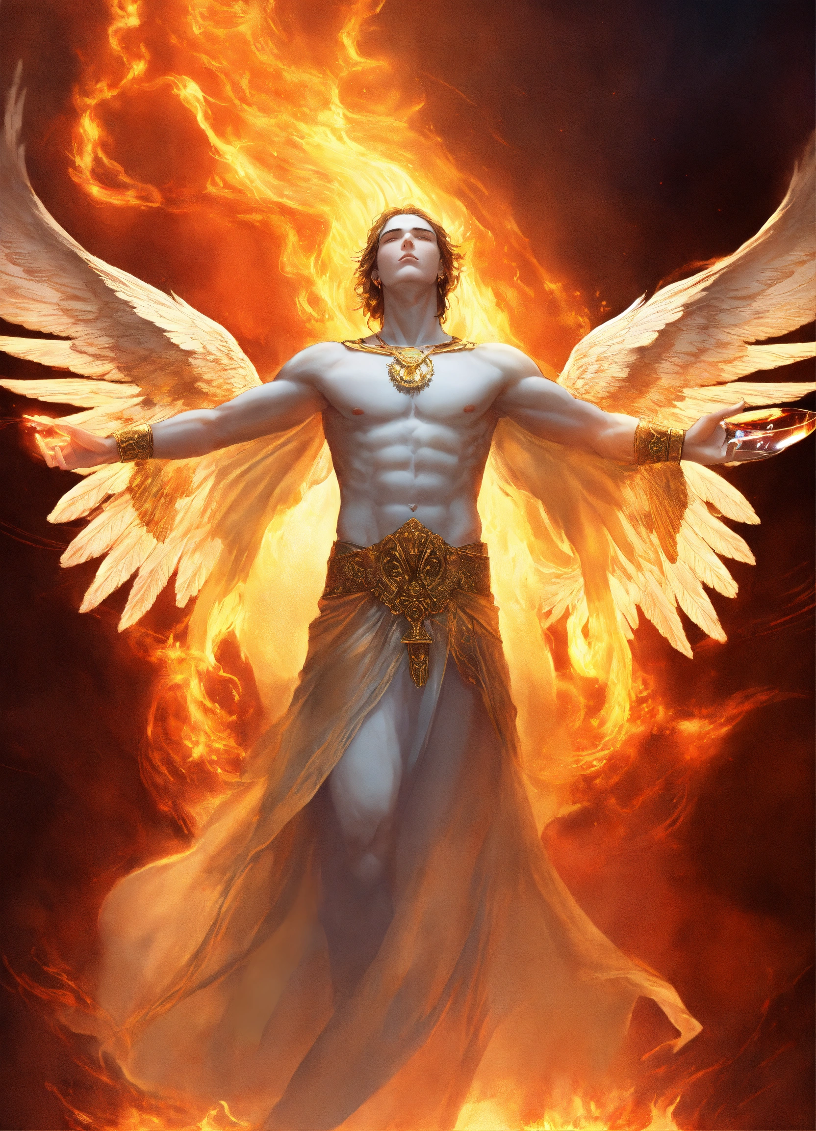 Captivating design, spirit man ascend from body, the spirit being's arms are spread out, white body, beaming light on her body, at the end the left arm, there are flames of fire. above the fire, there is an outline of an angel with wings and a sword in its hand, very detailed in his right hand he holds a glass with multivitamin juice and is about to sip