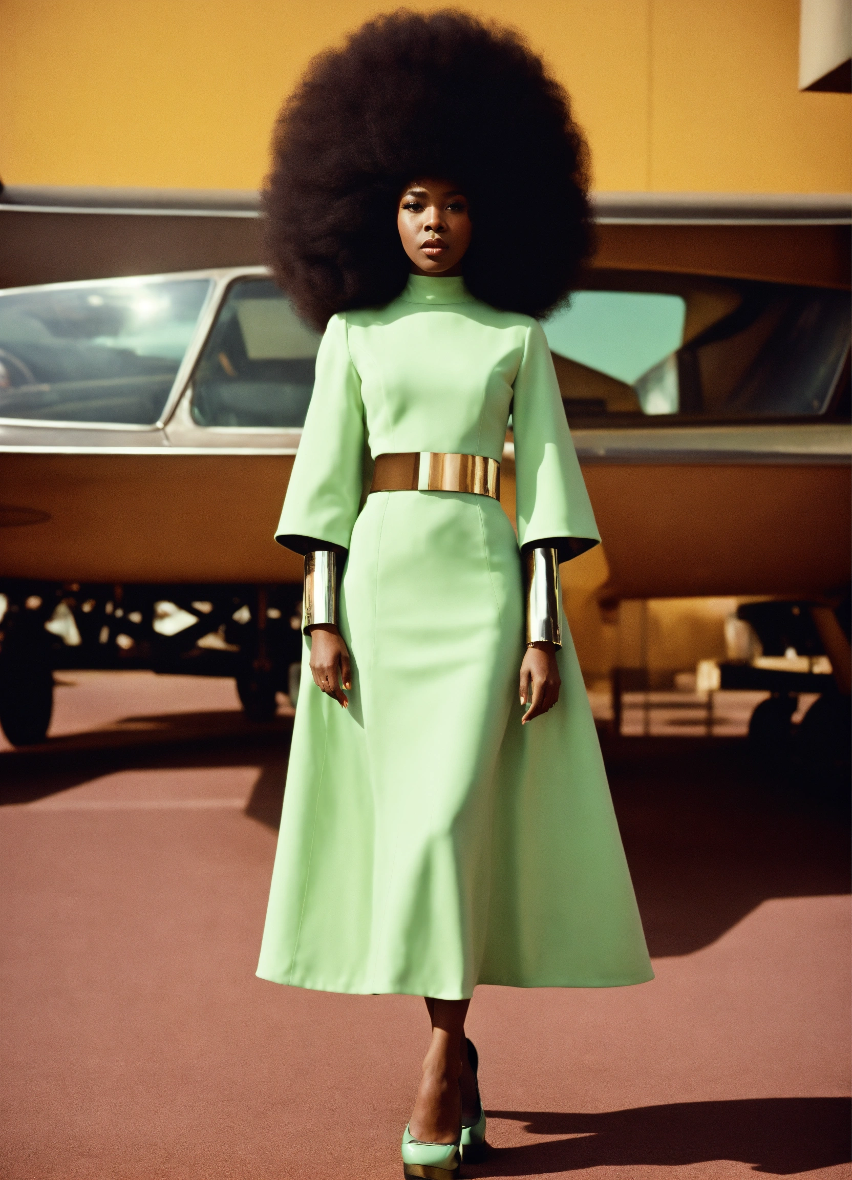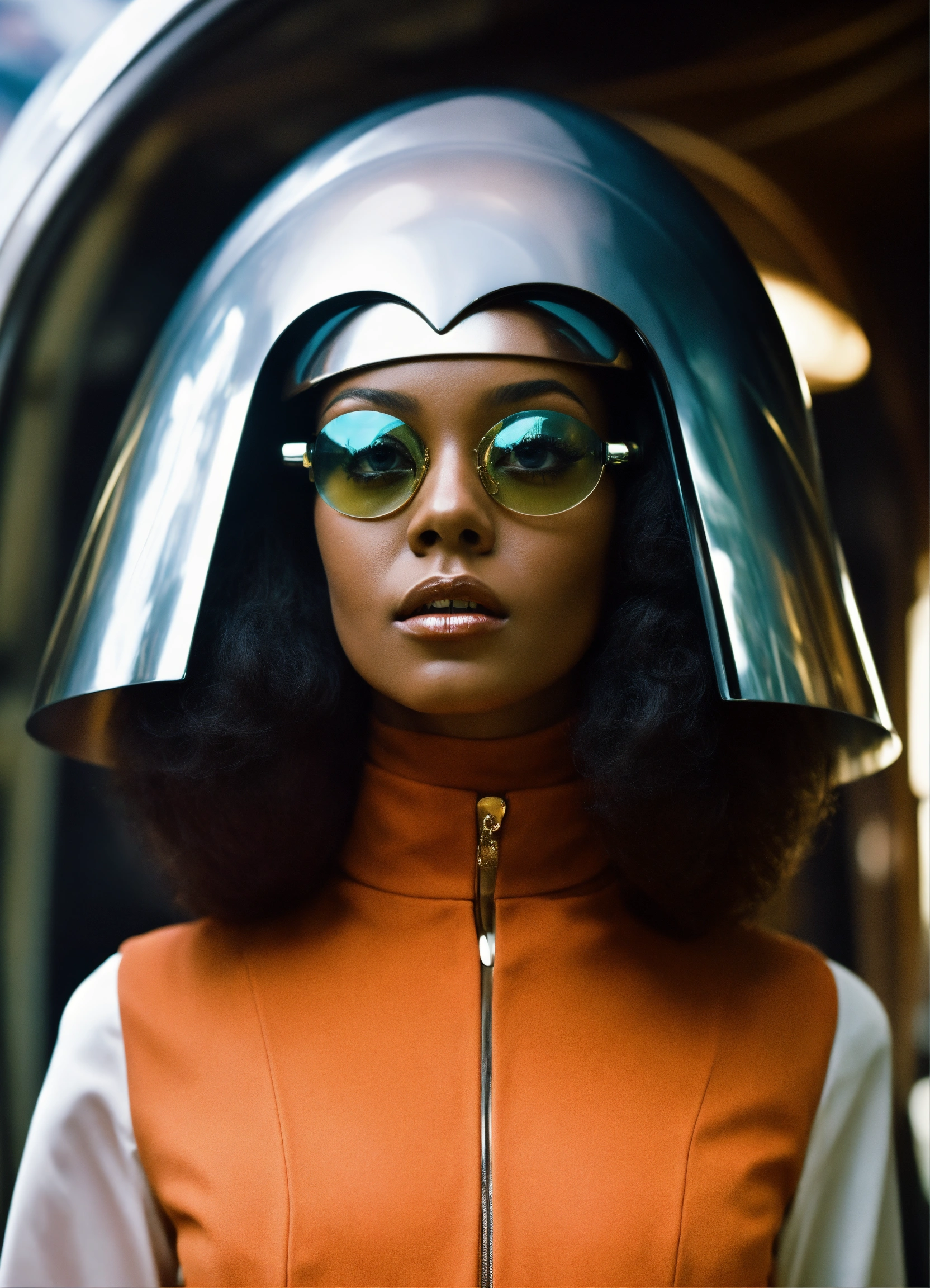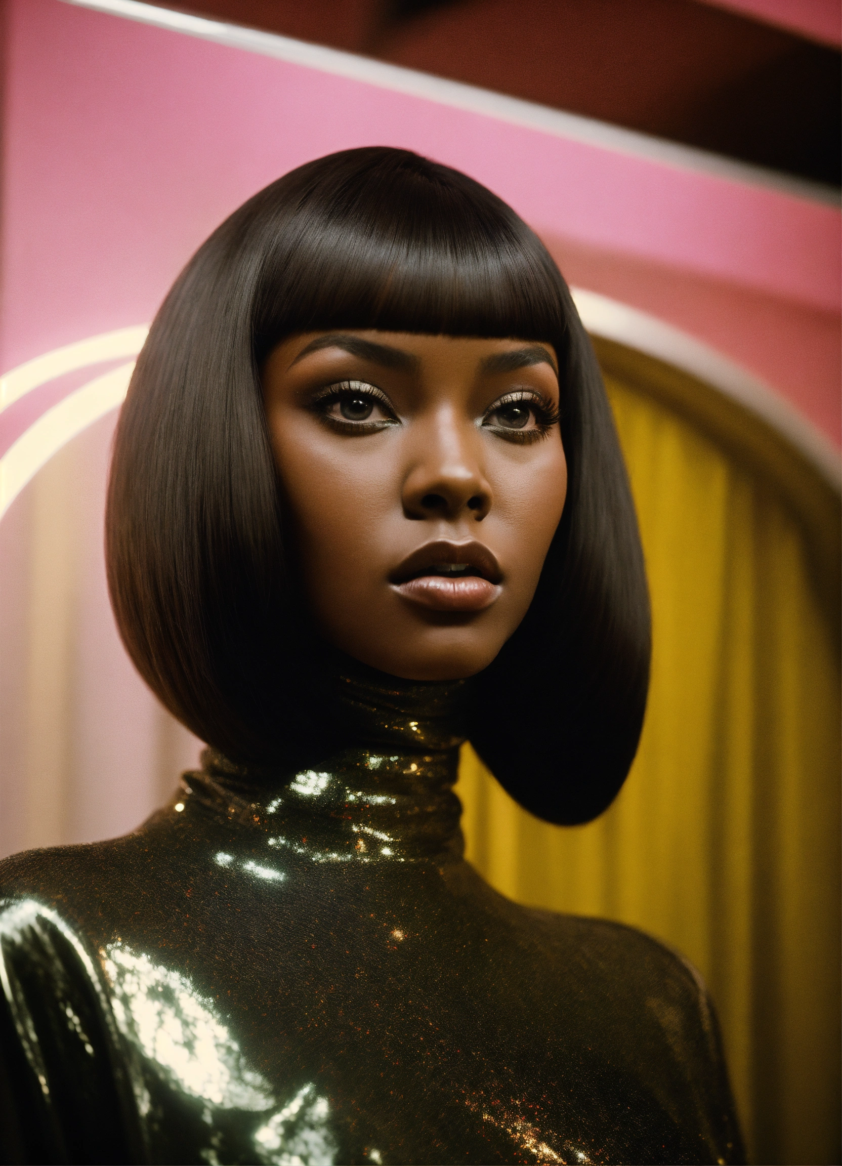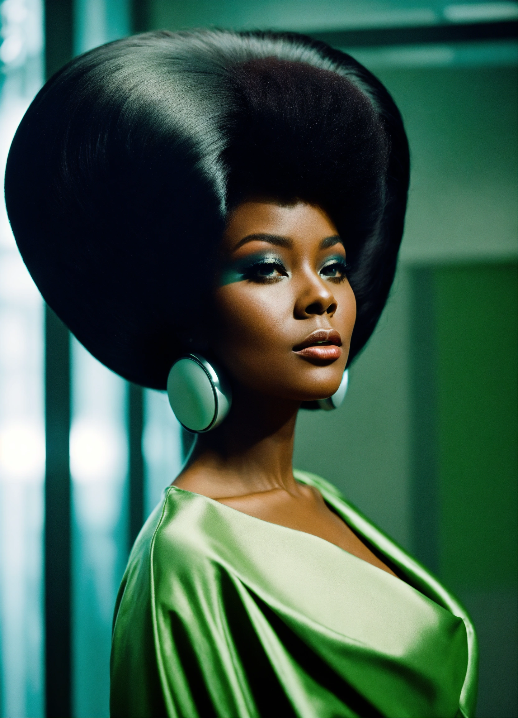 Scene retro future movie from the 1960s sci fi film, black woman, futuristic 60’s mod fashion avant-garde couture photography, sleek oversized flowing hair, minimalism