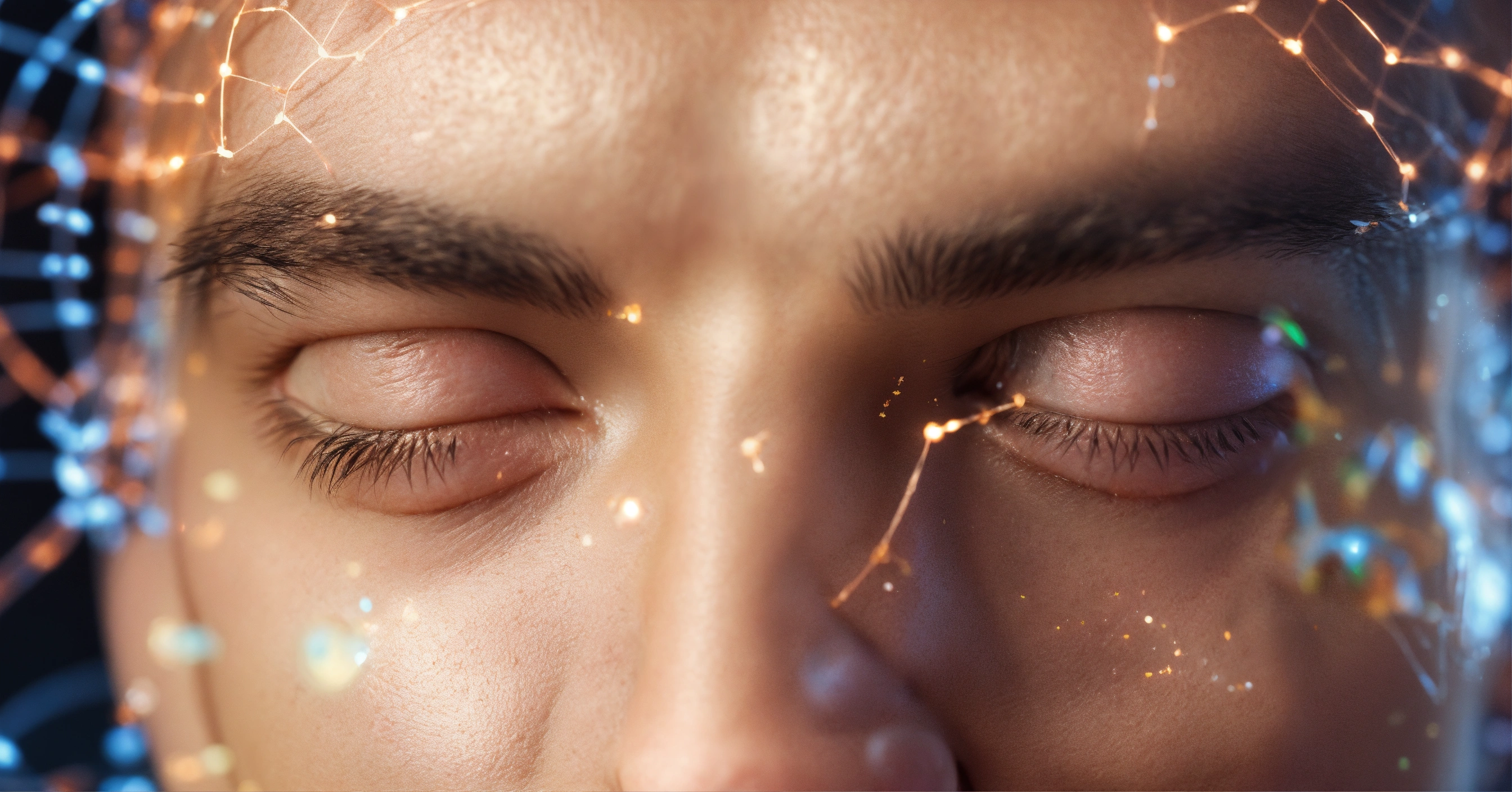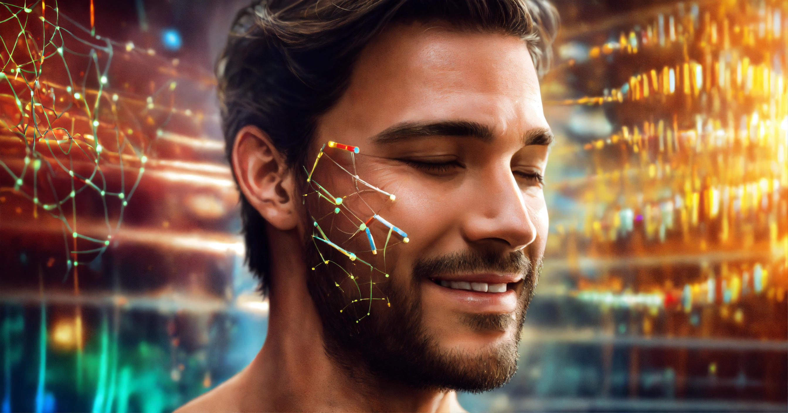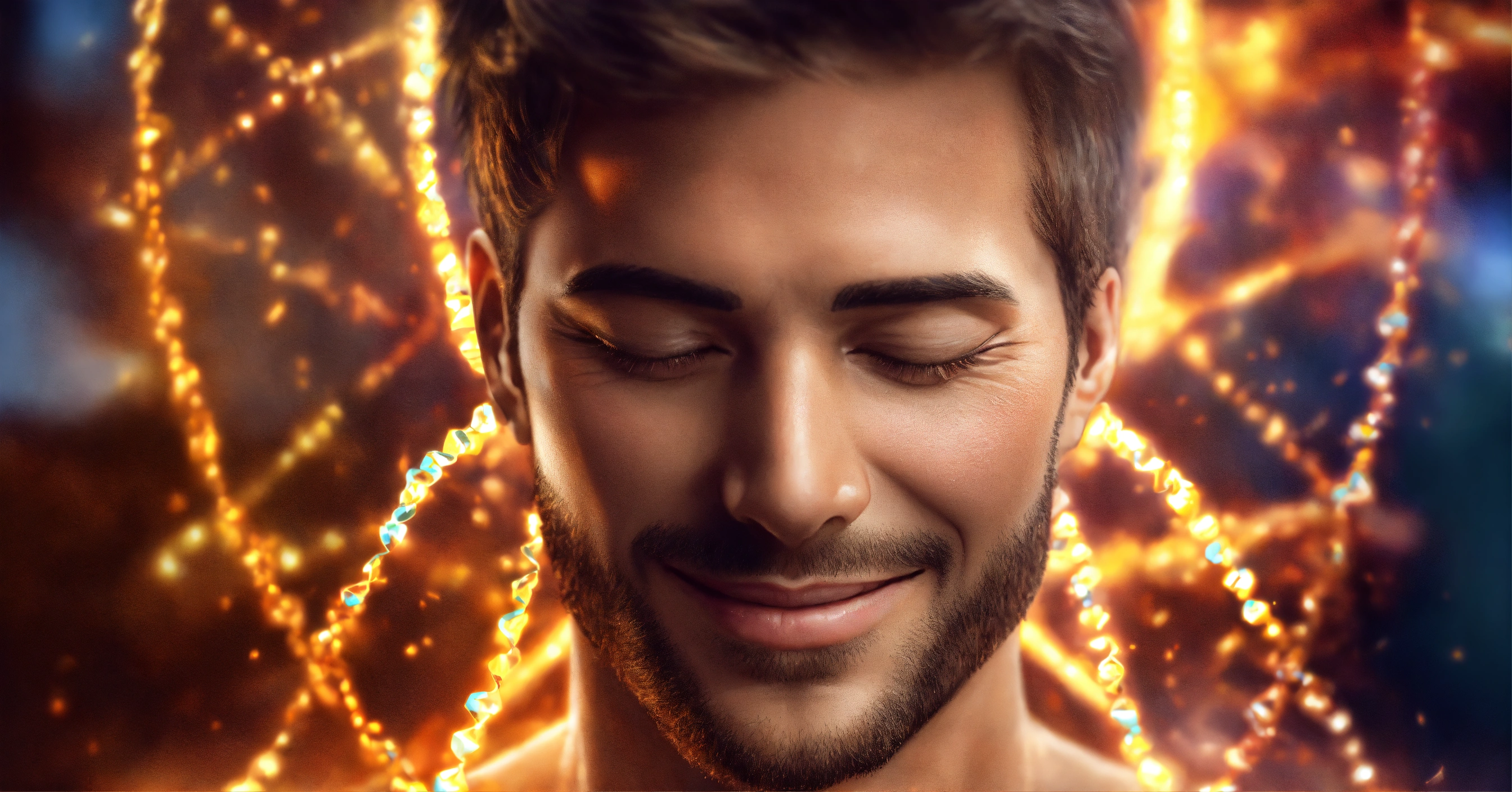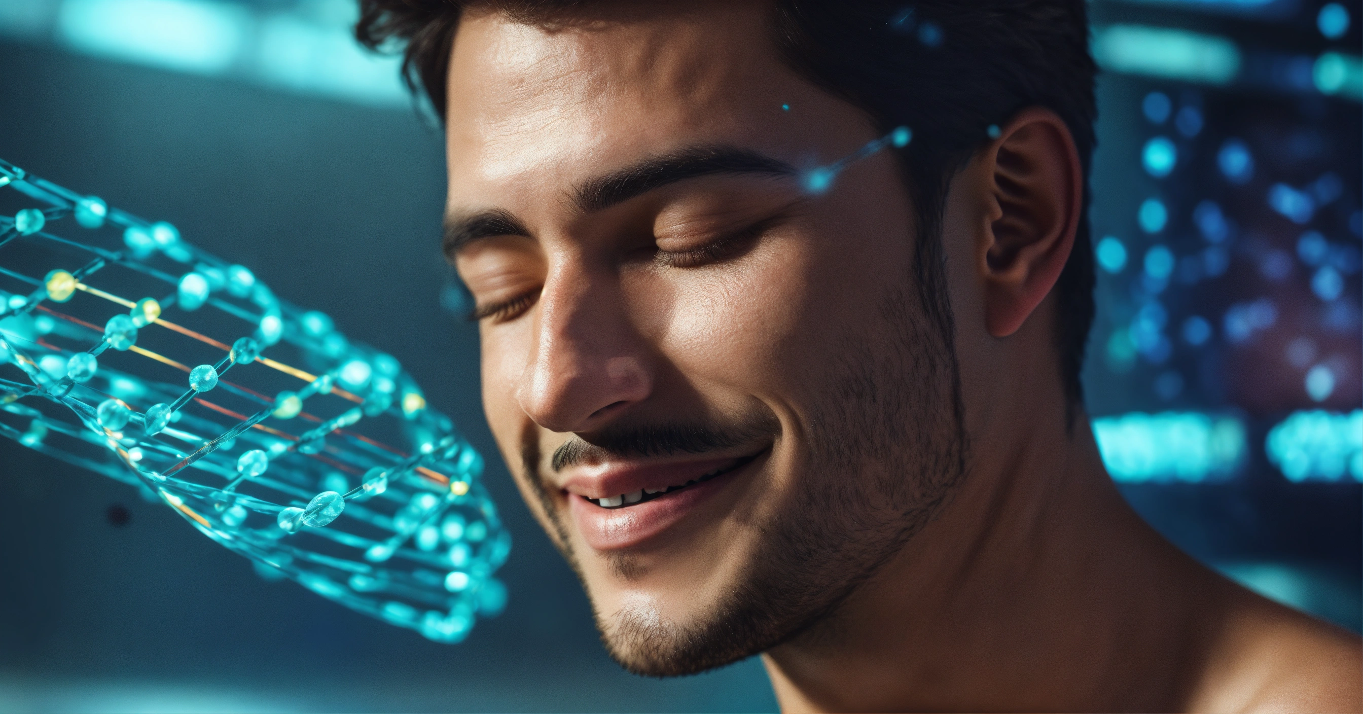 Frequency healing, dna strand fusing together after being broken, handsome mans face eyes closed and smiling, 4k resolution, photo realistic