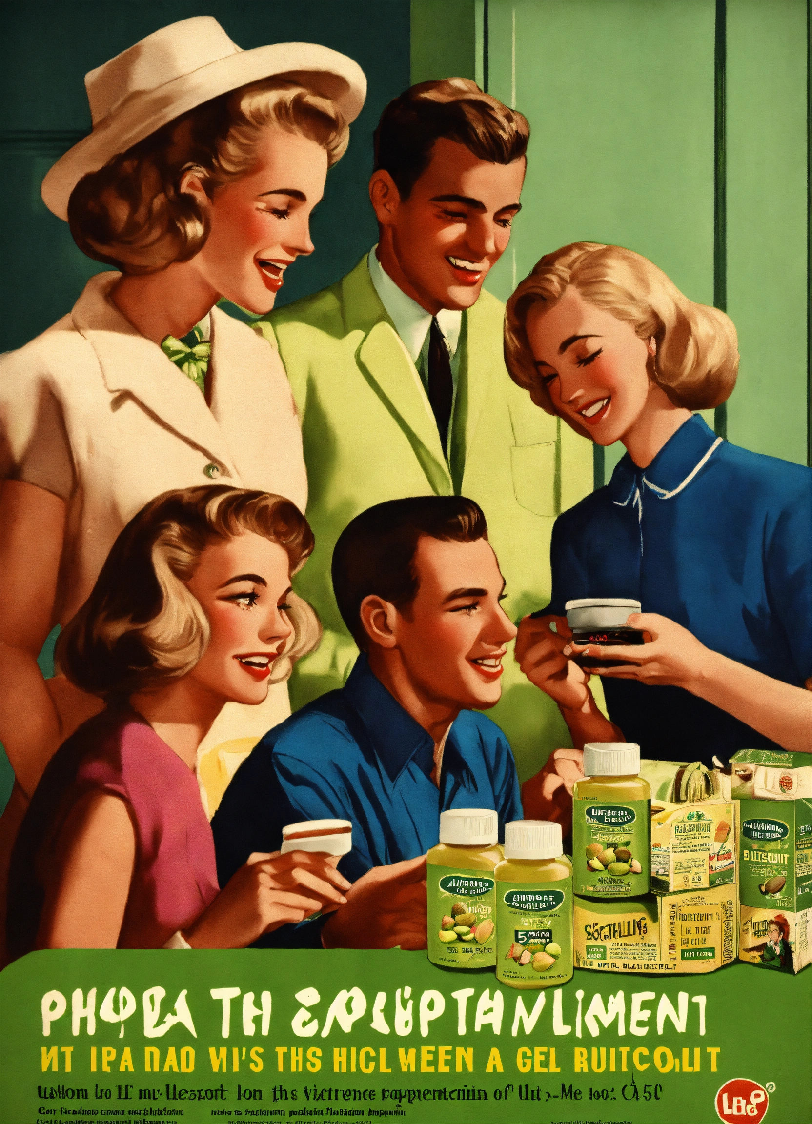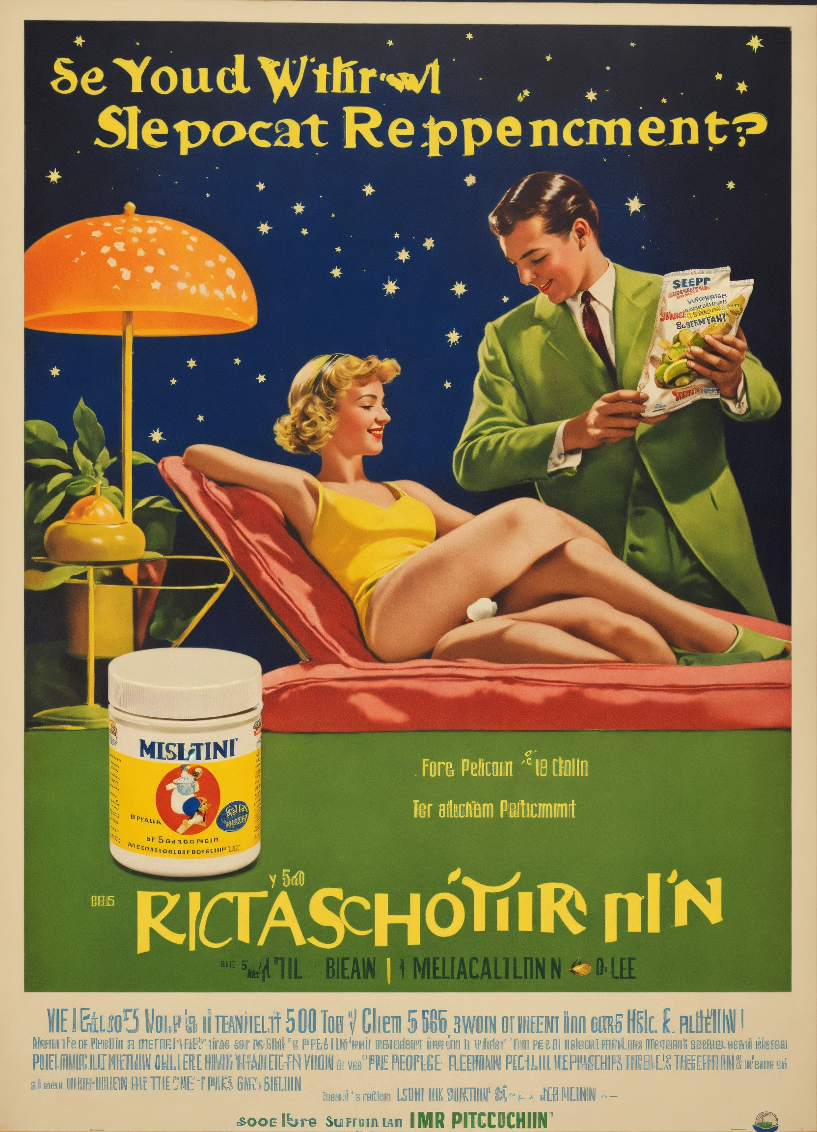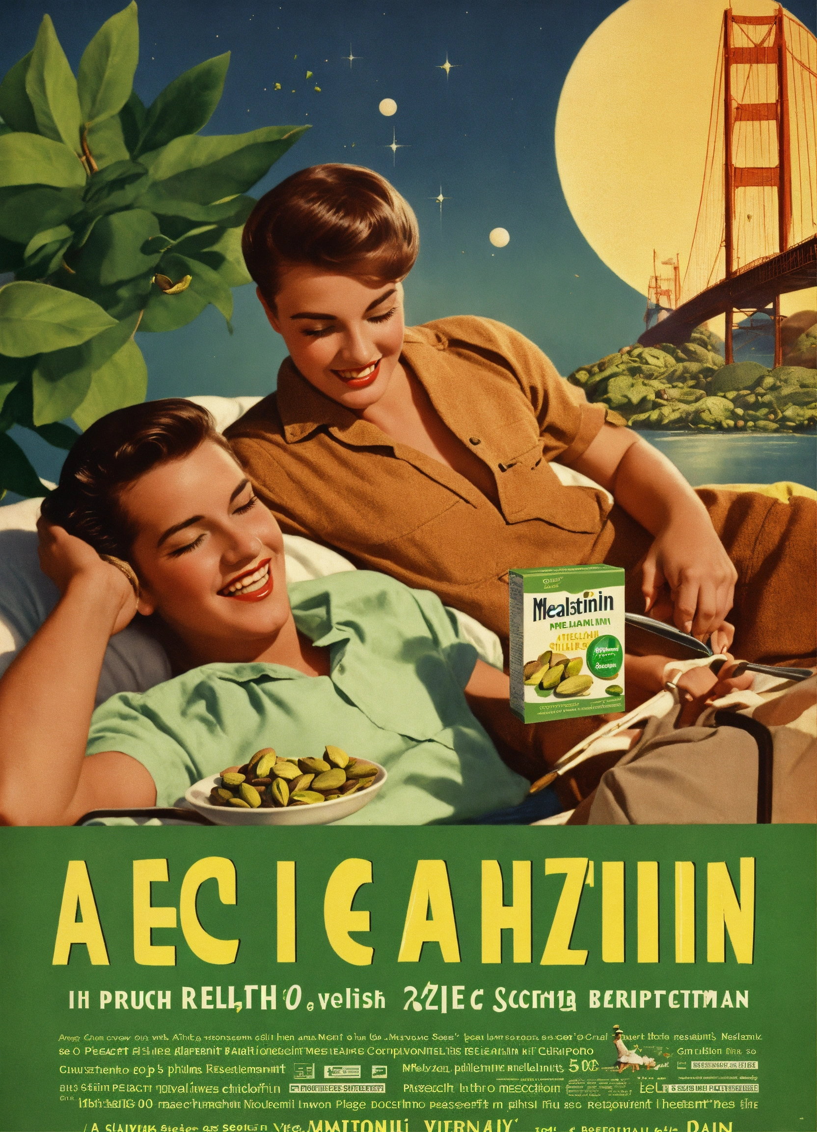 A vintage-inspired poster showcasing people from the '50s or '60s enjoying the benefits of the pistachio sleep supplement as a melatonin replacement