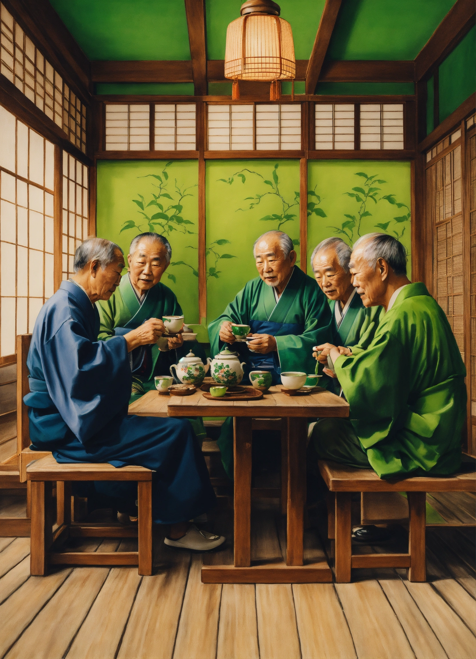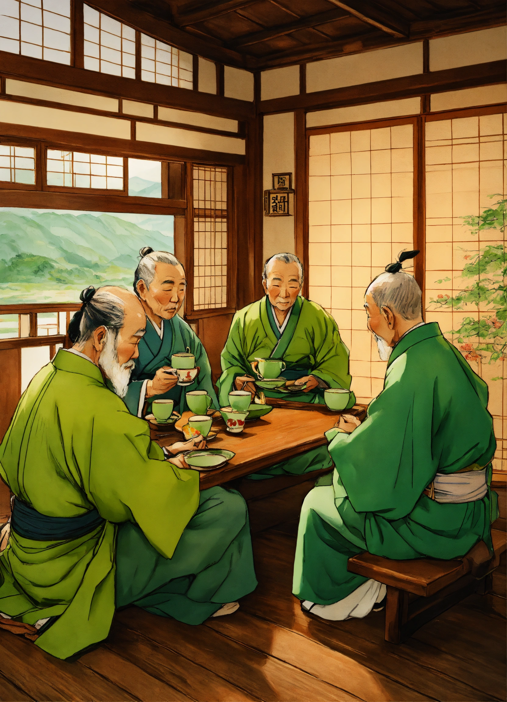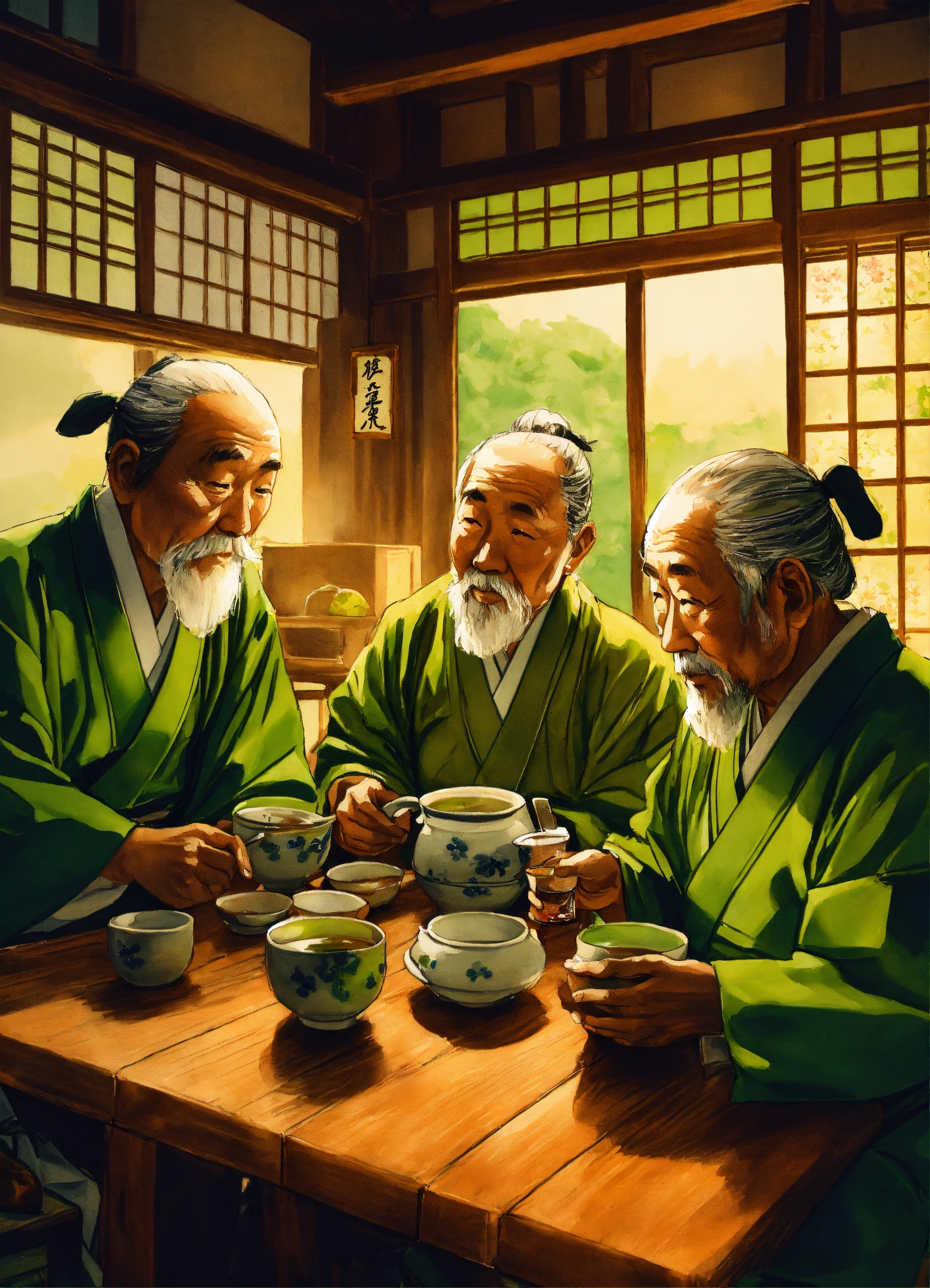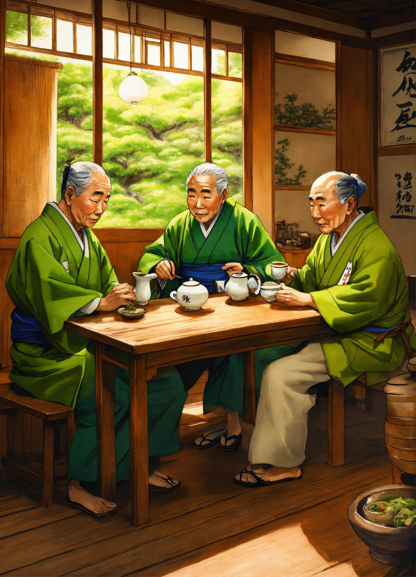 A hand drawn painting of a few old japanese guys sitting on a table and drinking the traditional green tea. highly detailed crisp photo in 4k, wide-angle, sharp, vibrant, vivid.