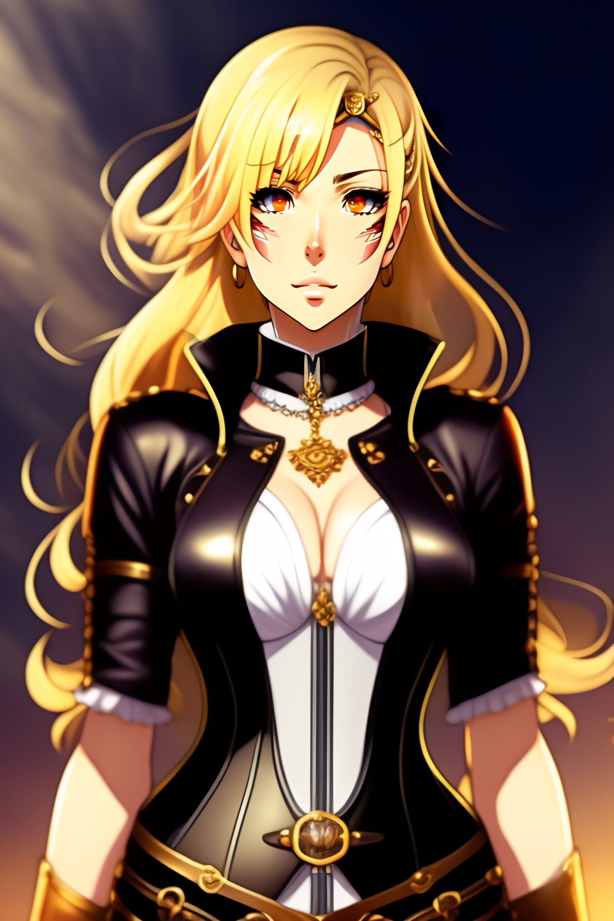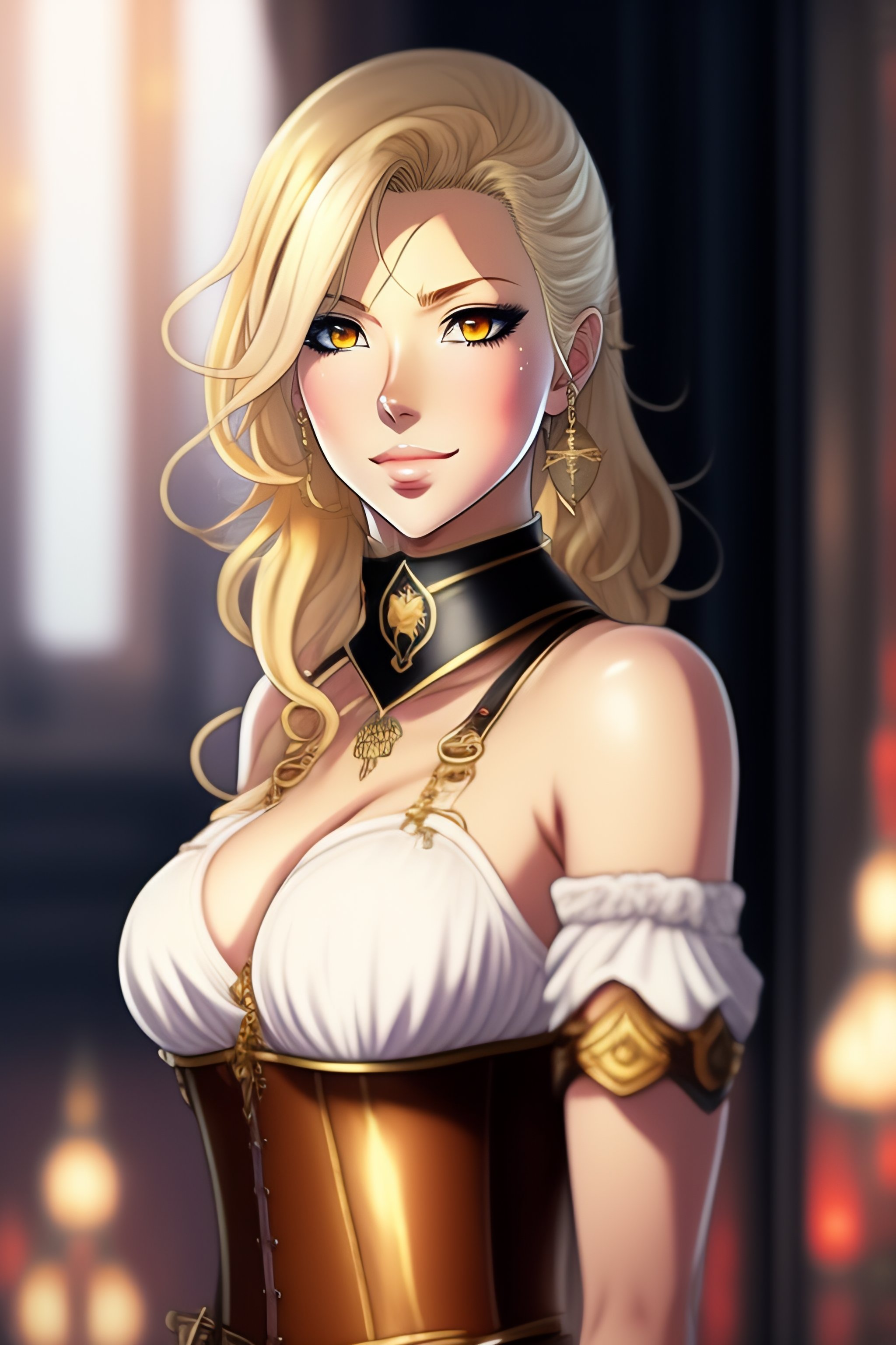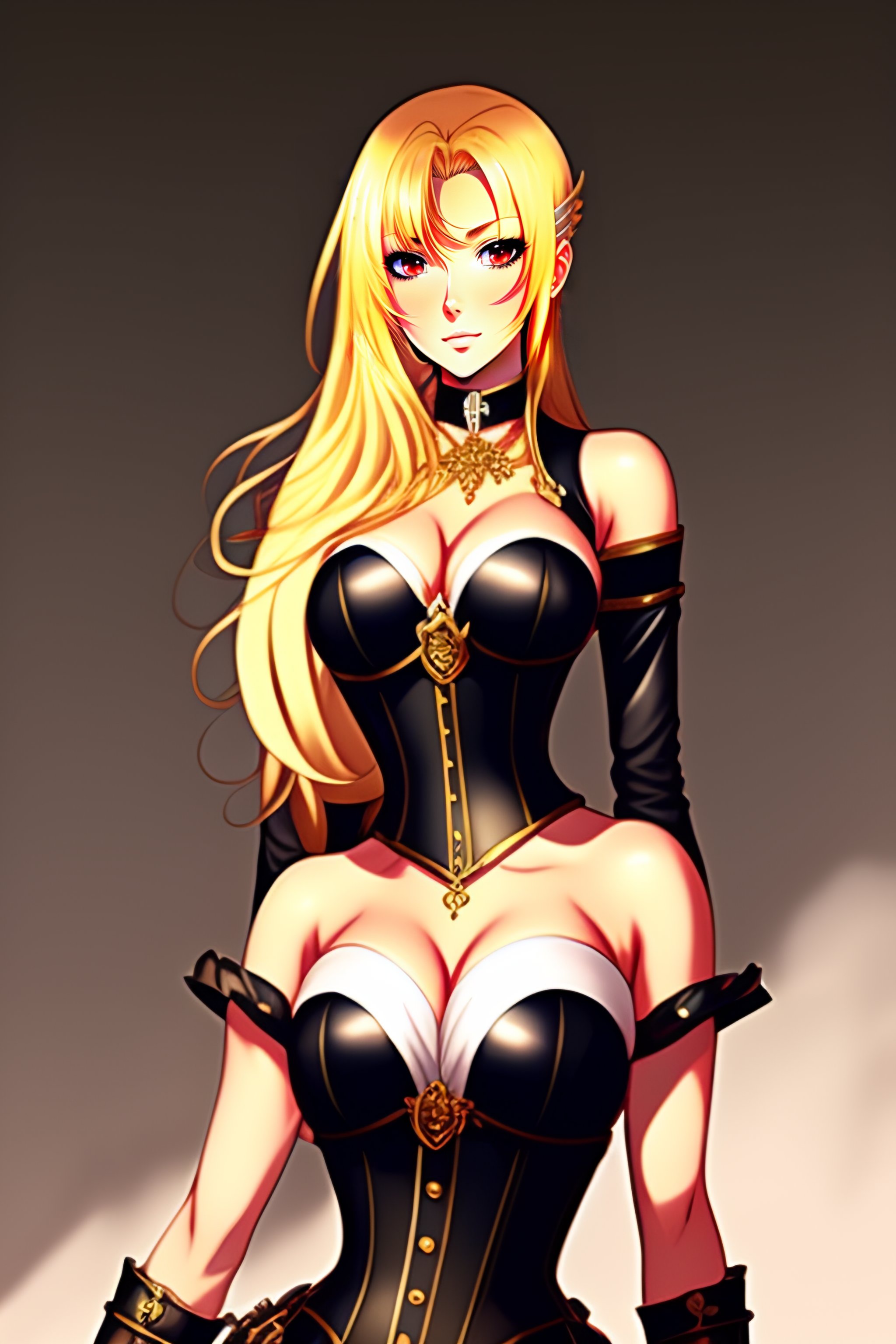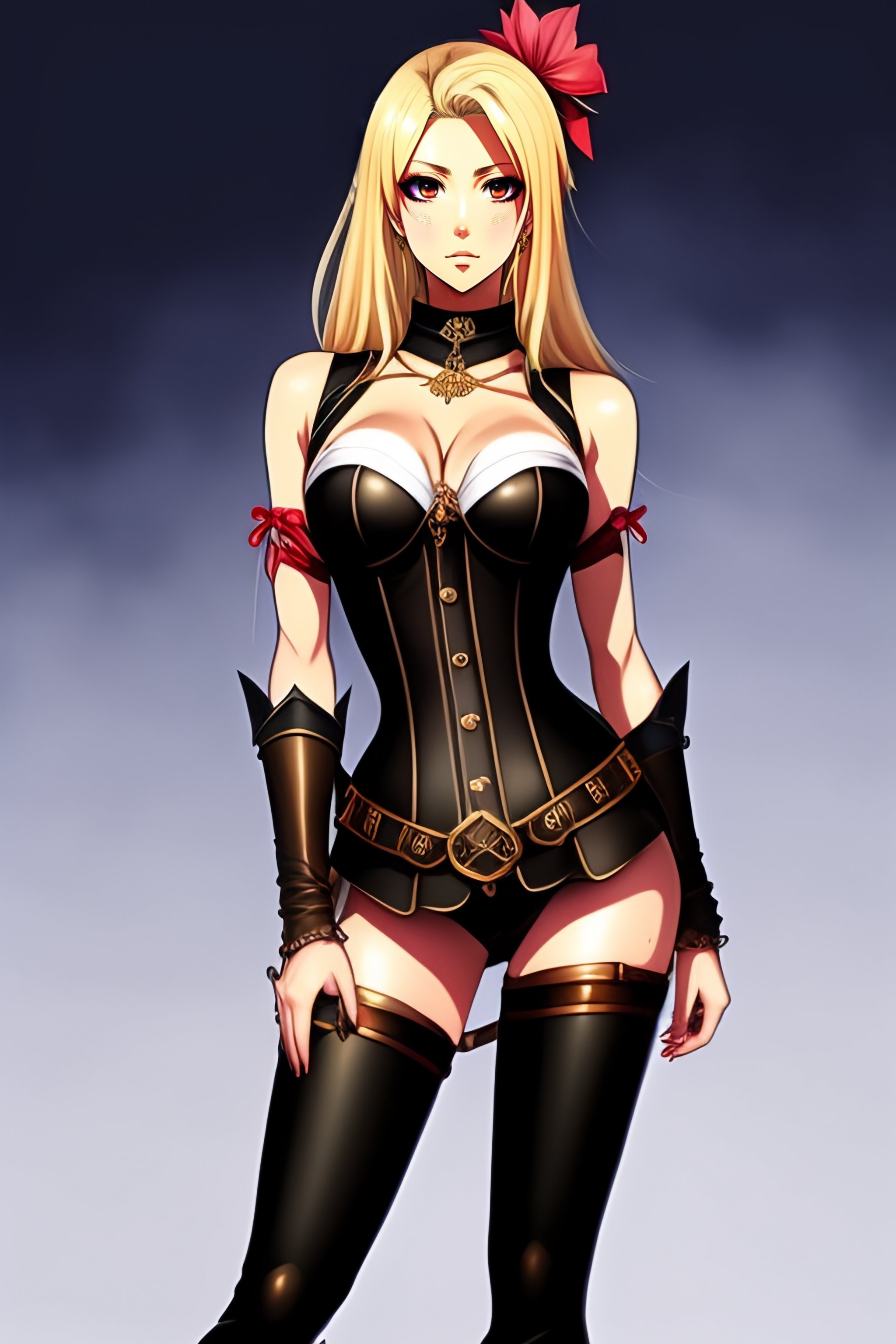 Anime drawing of a woman, full body, straight hair, short hair length, leather corset, tall leather boots, blonde hair, very tall, sly grin