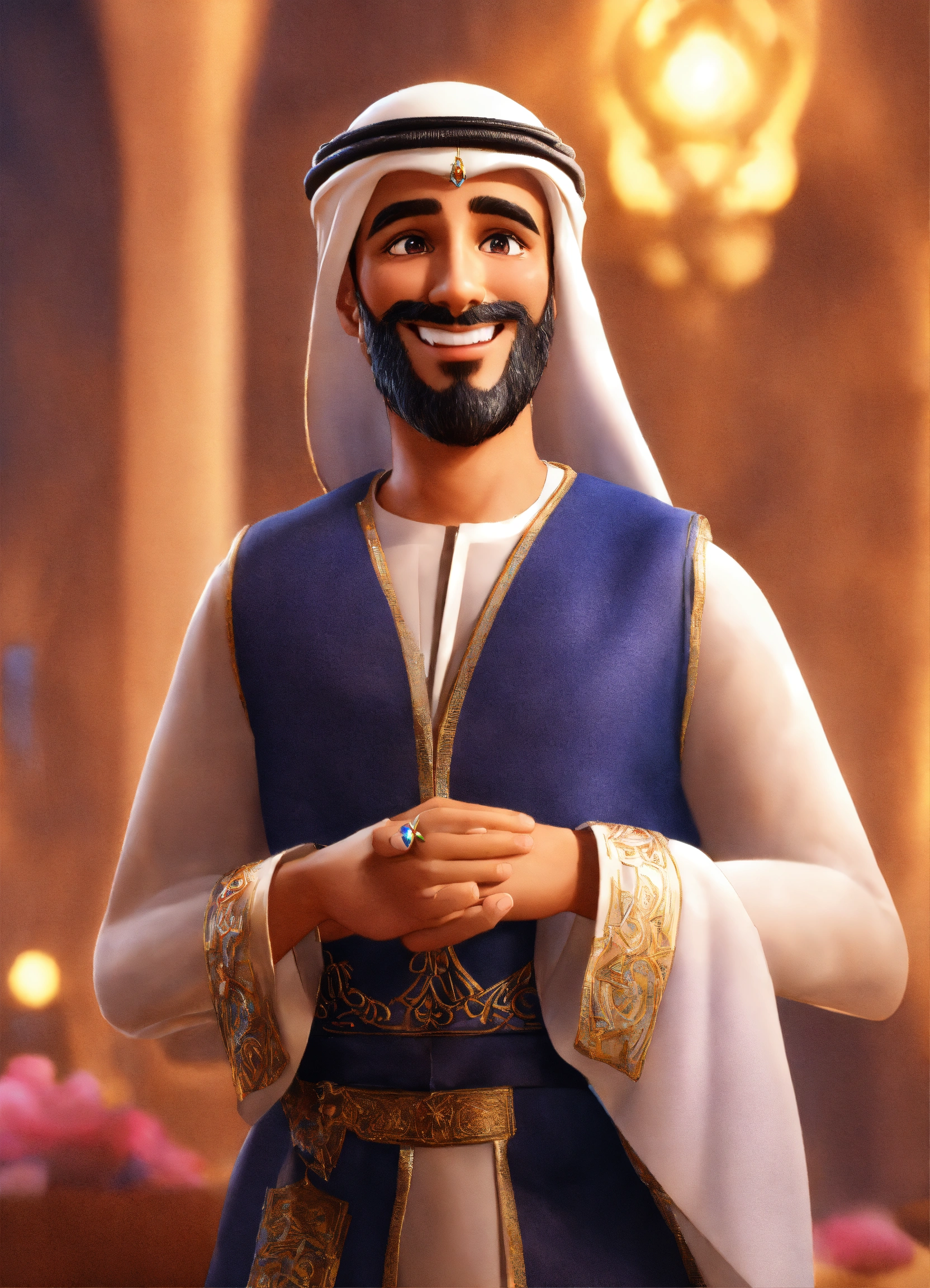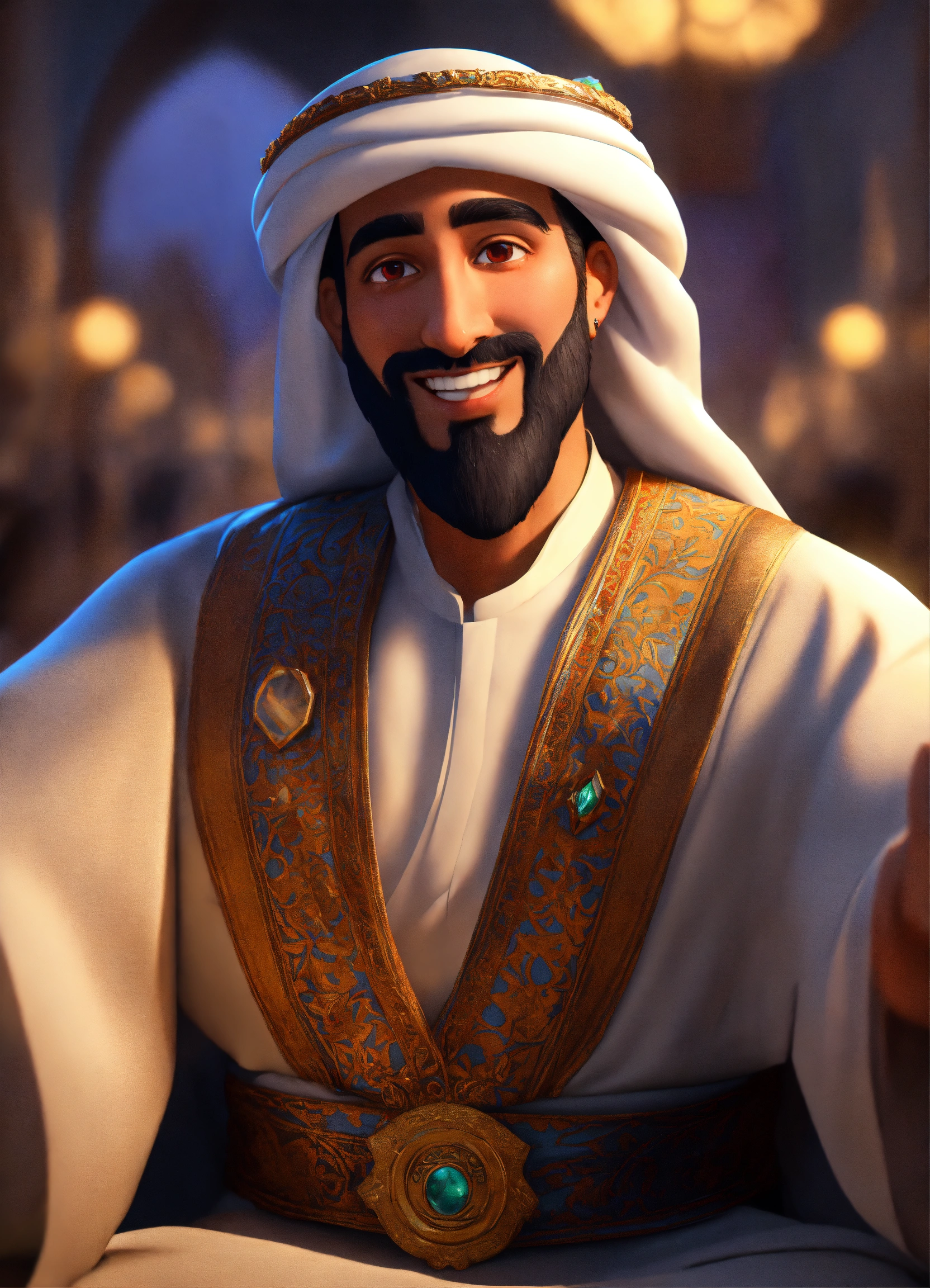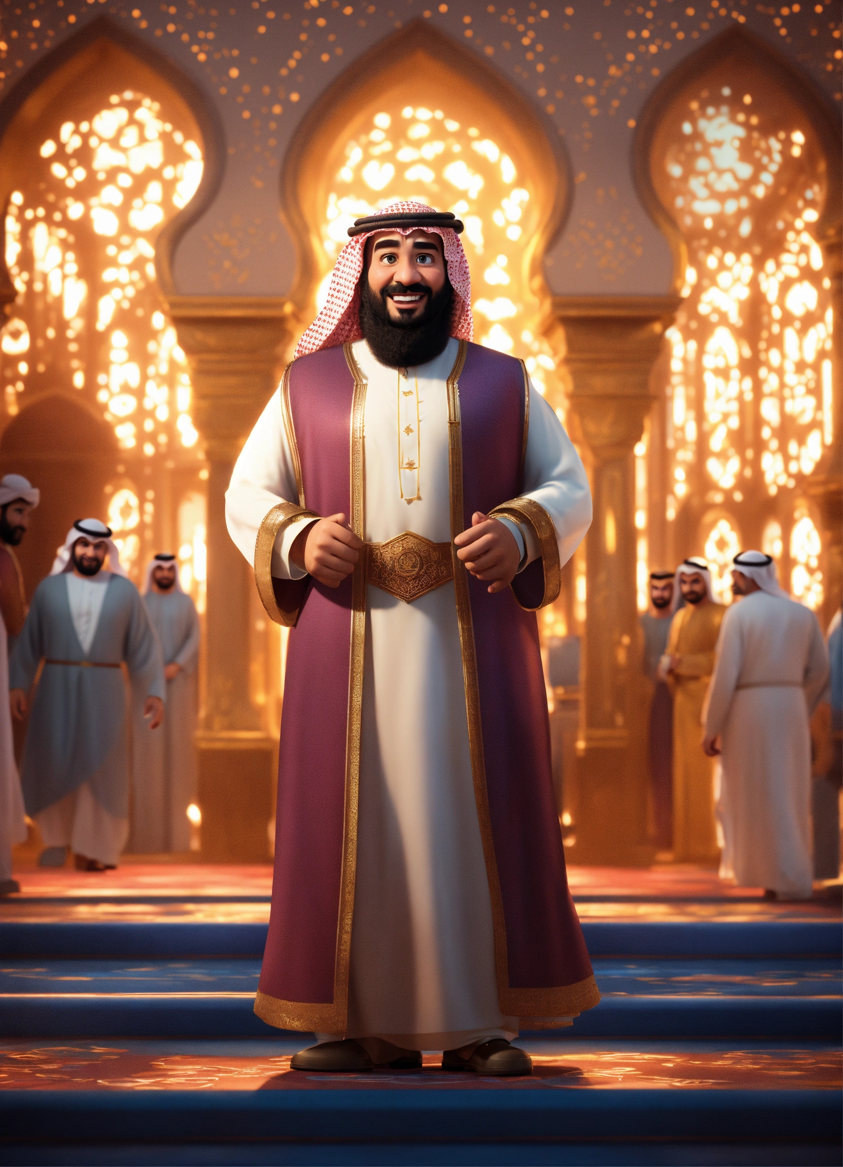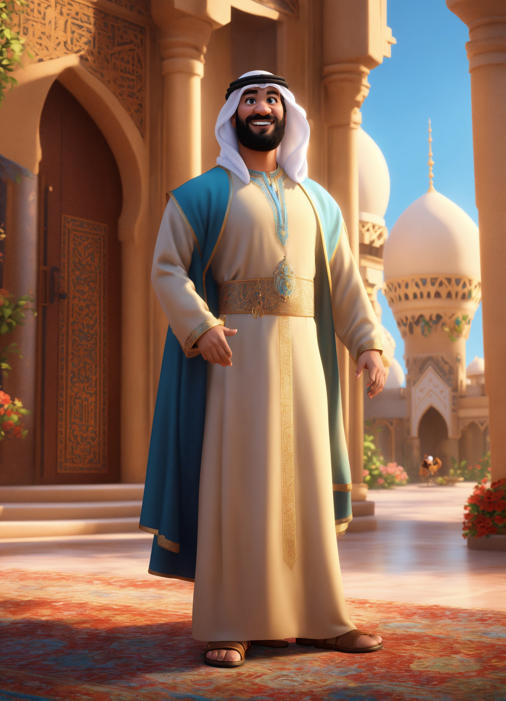 Create a 3d rendering of a wealthy arab sheikh from dubai, inspired by the disney animation style. the fingers are raised - he shows class - he is triumphant - he is delighted - he is joyful (pixar art style)++ highly detailed digital painting, art stations, concept art, soft focus, hard focus, illustrations. cinematic, visual effects, hdr, unreal engine 5, ray tracing, soft light, 8k, high detail, sparkling backlighting, luxury gem, game art, 3d, cartoon, colorful, magical, mysterious