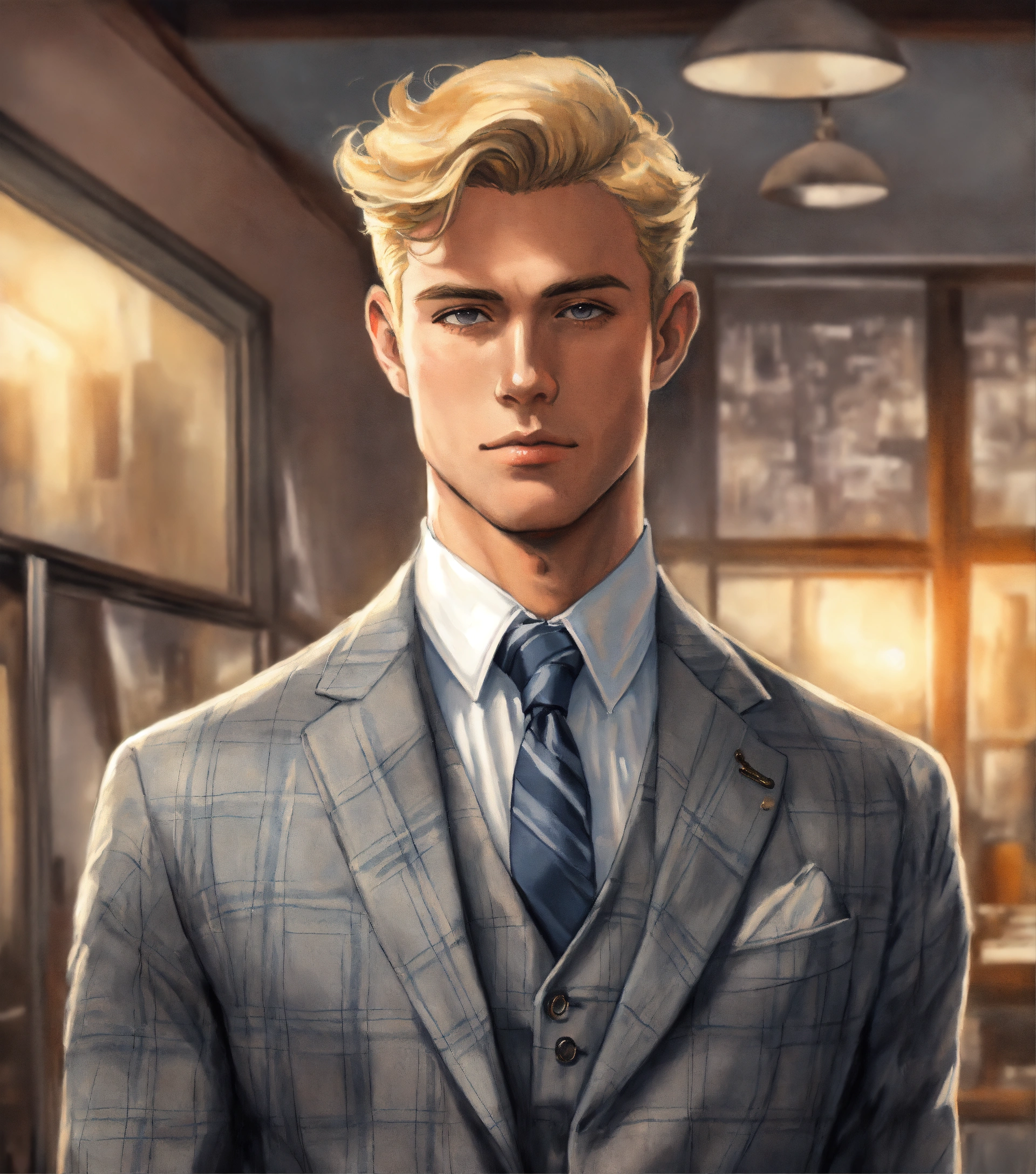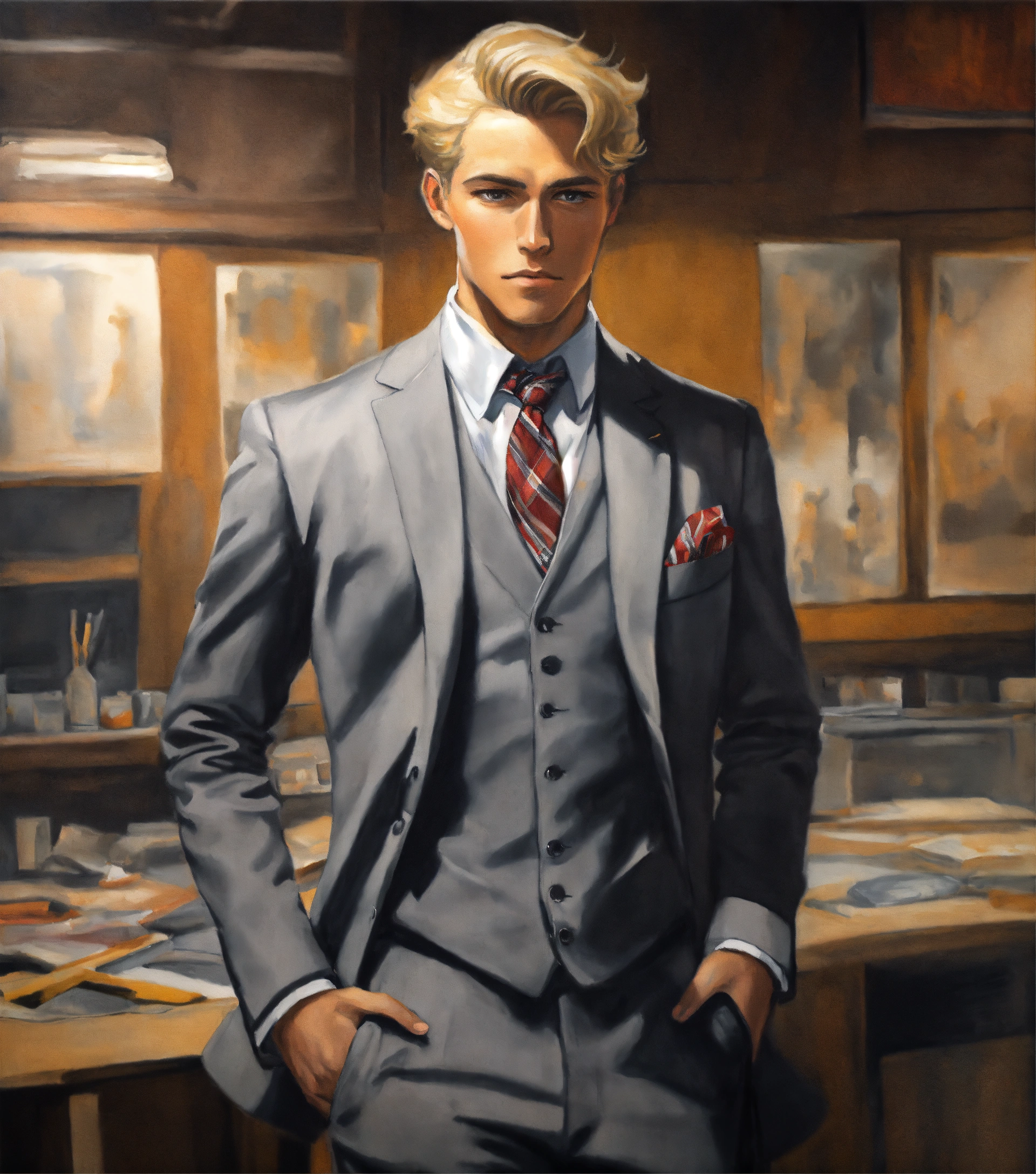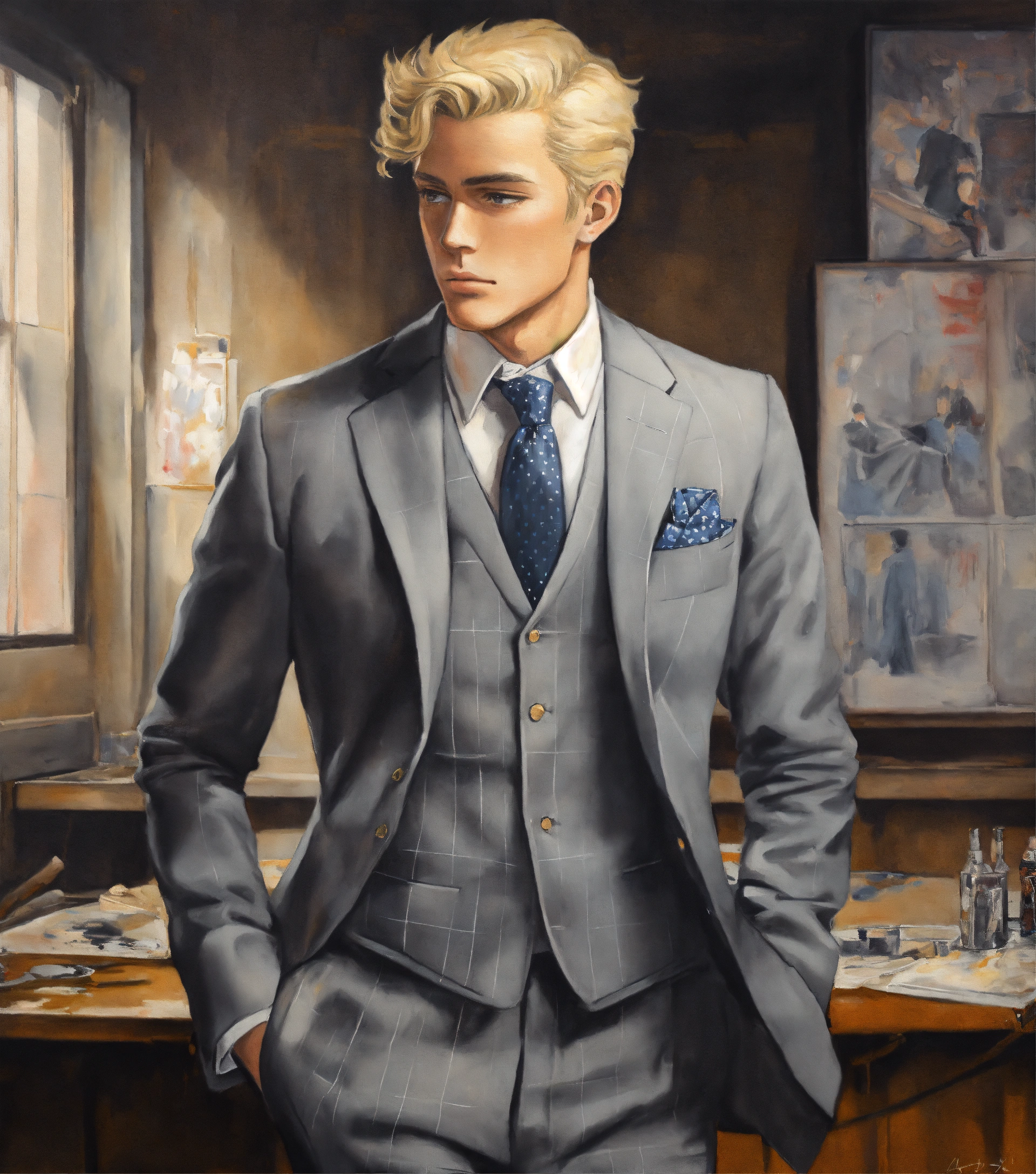 Painting of a blonde gentleman in flannel grey vested suit, club tie, with hands on hips, in a studio, manga style