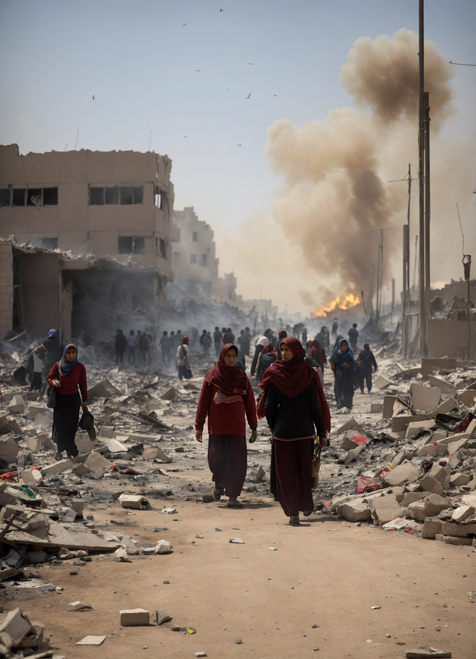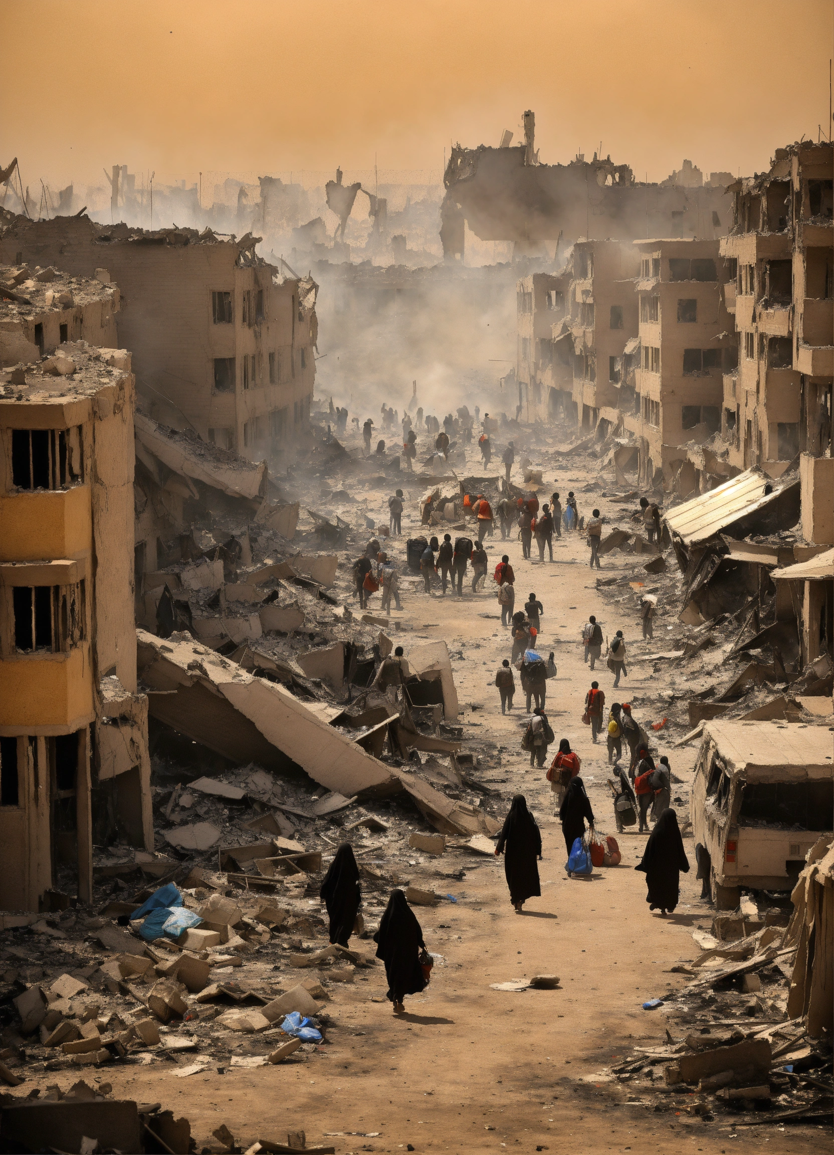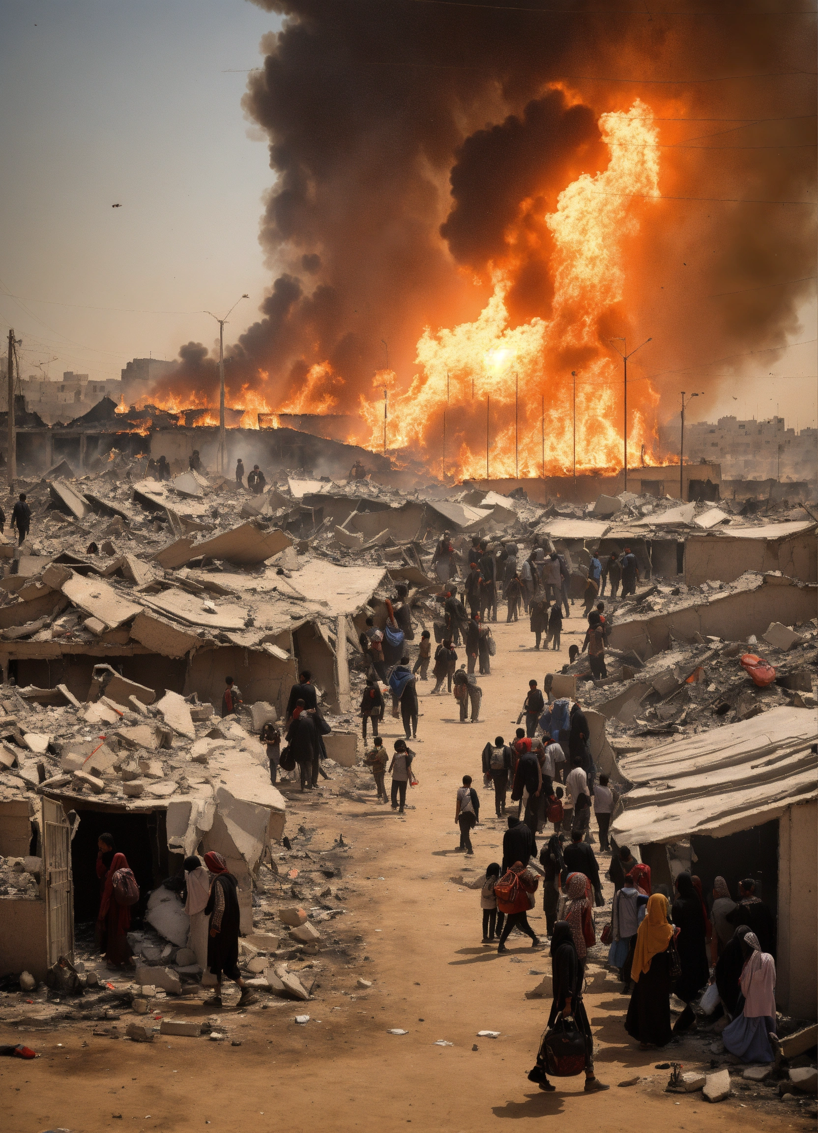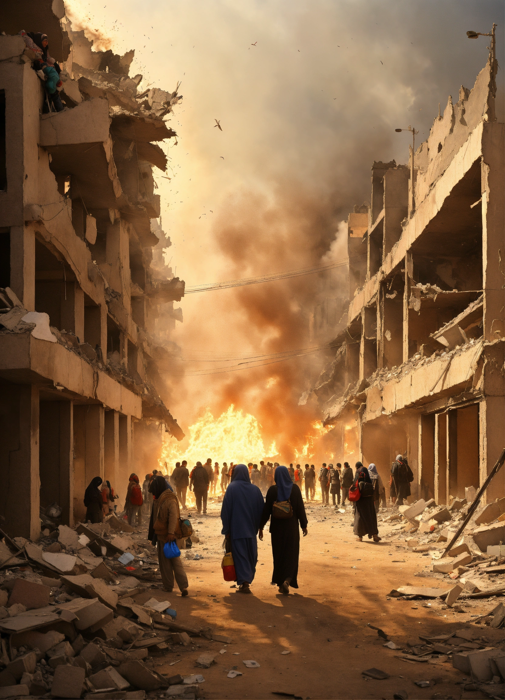 "a design shows palestinian refugees surrounded by demolished and burned buildings, standing in a long line consisting of various age groups elderly, young, children, women, and men. they carry their bags and wait at the egypt border crossing, hoping for permission to enter egypt due to the ongoing israeli airstrikes on their homes in the gaza strip. behind the refugees, scenes of fires, destruction, and their collapsed houses from the bombings are evident. prominently displayed are large open bags filled with dollars, euros, and significant amounts of money. the bags on the outside bear the european union logo, suggesting they might be the means for their entry."