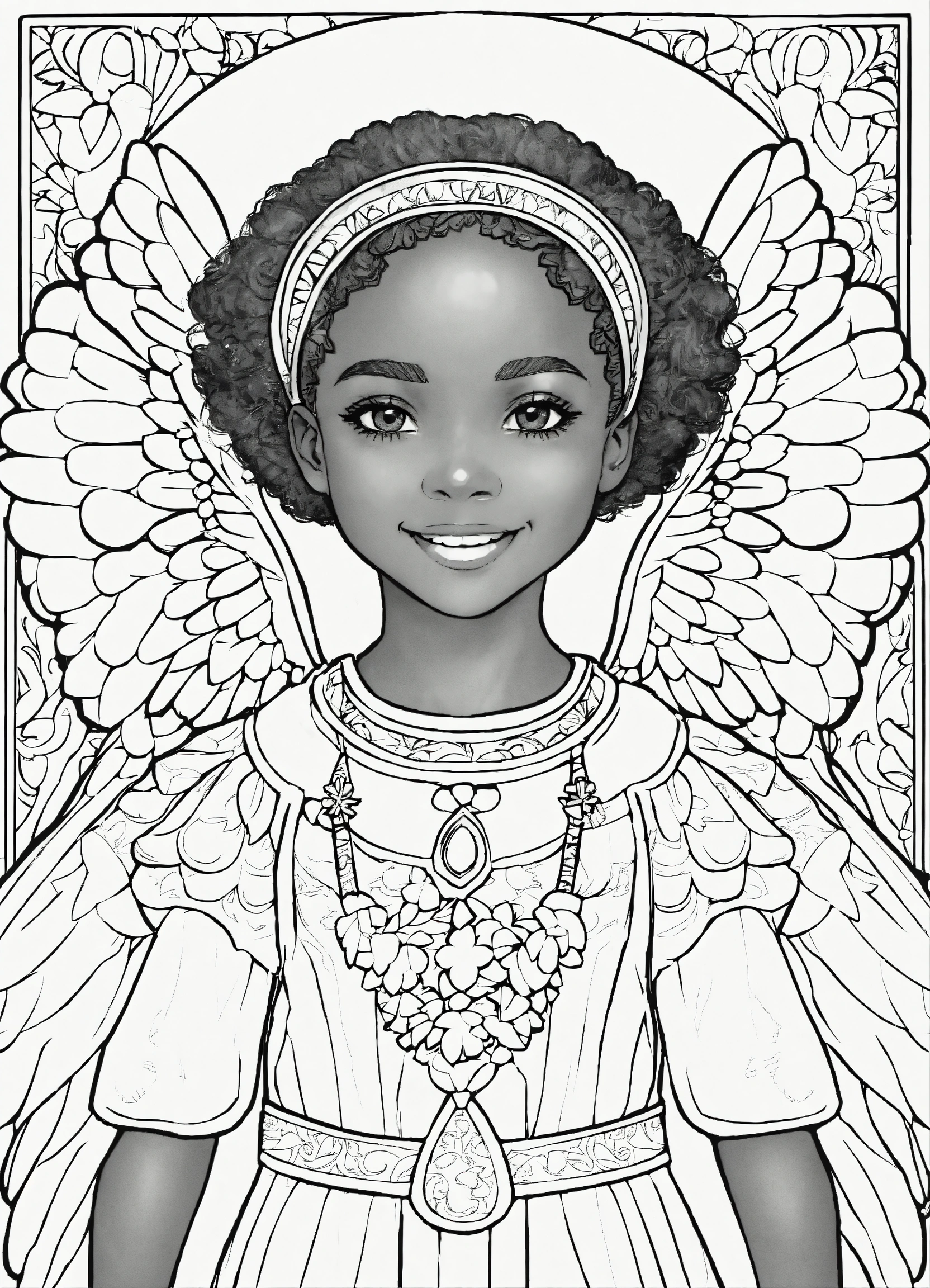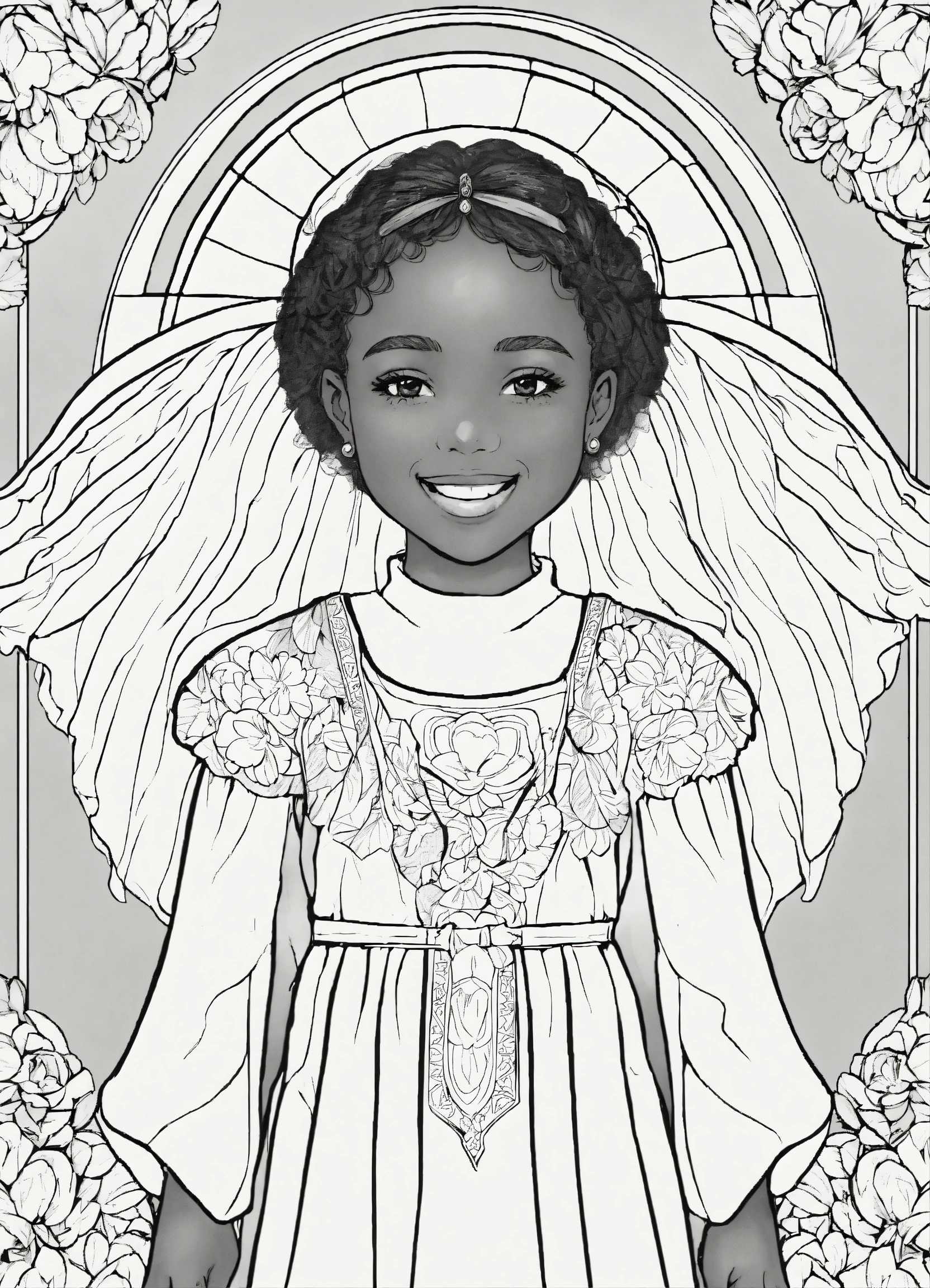 Black and white coloring pages of young african american girl dressed in angelic attire with a smile and veil