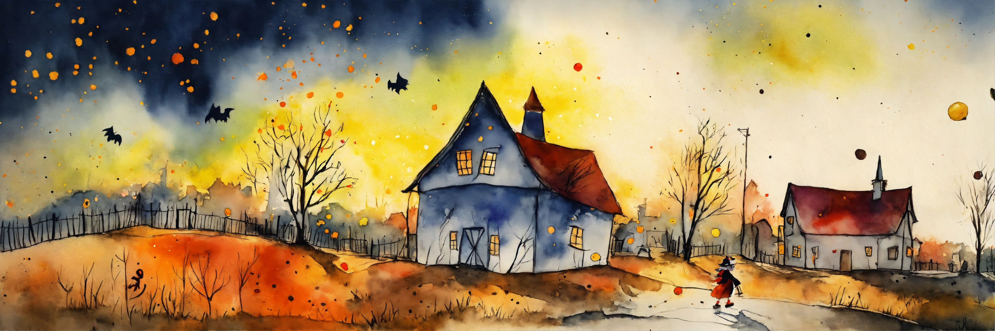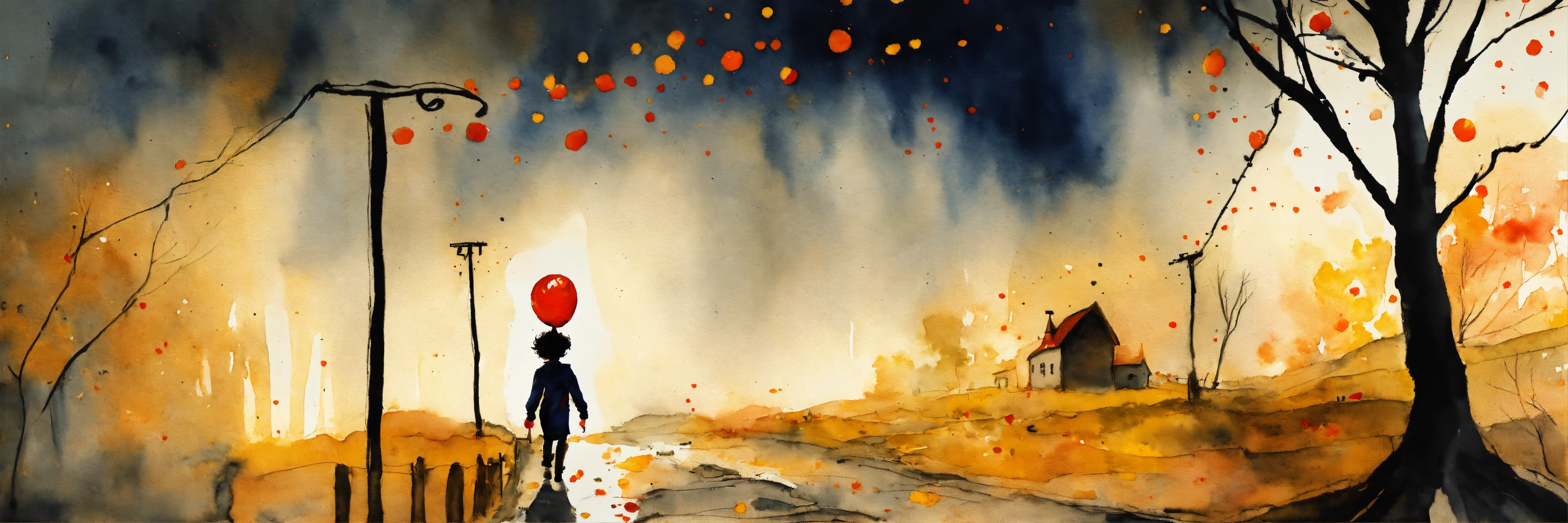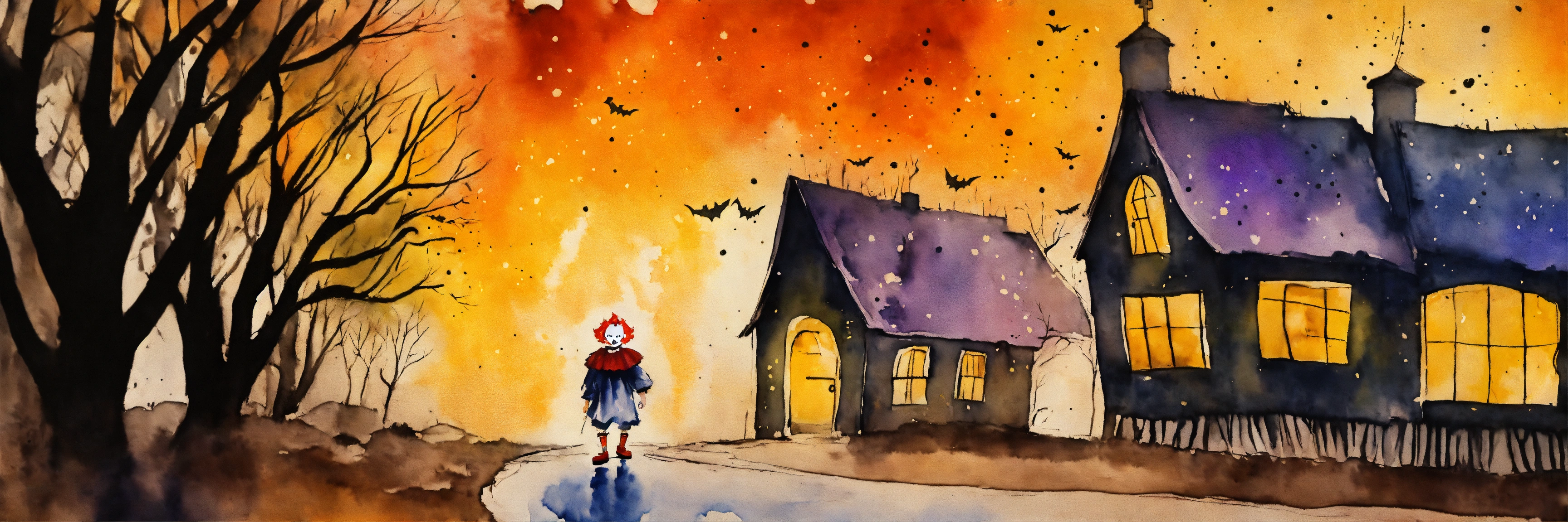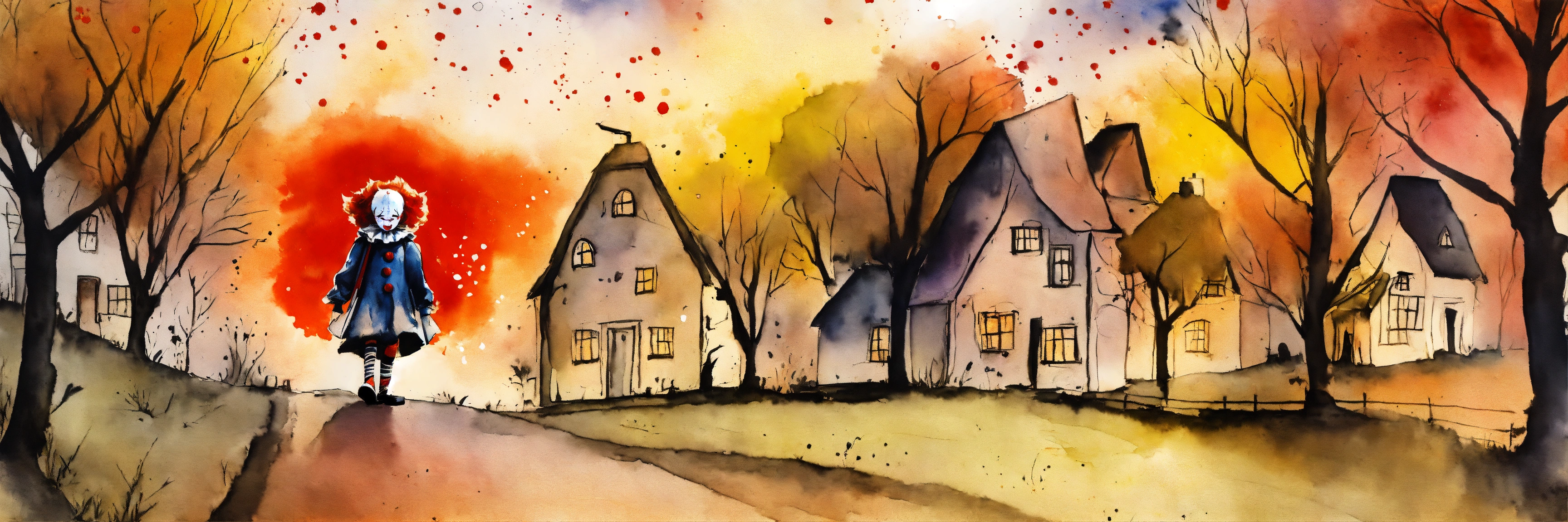 Pennywise walks through the village on halloween in the style of "long lost tume, by marc chagall and tim burton, watercolour, ink splash art, minimalist, emotional, dynamic, golden speckles, "