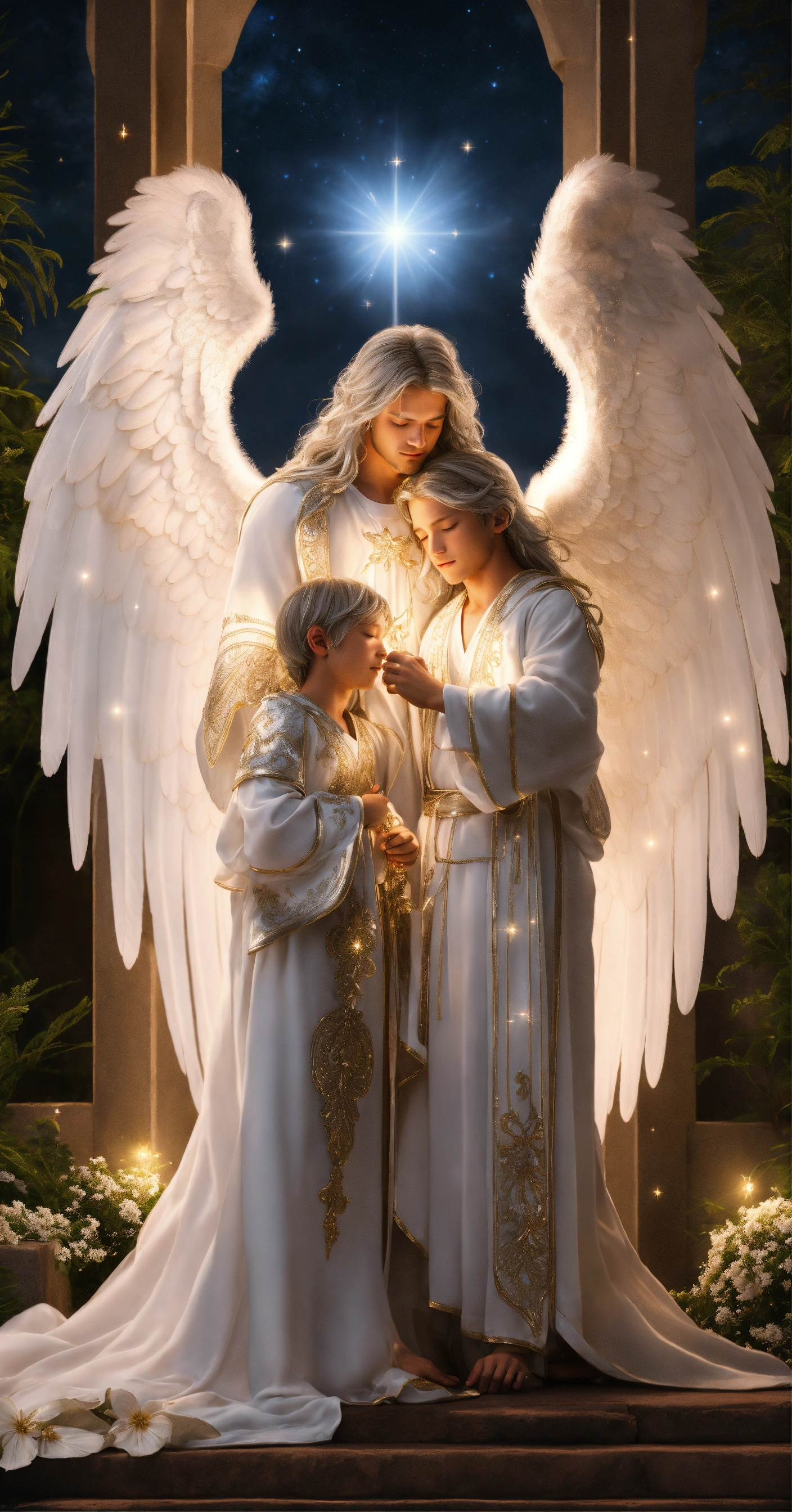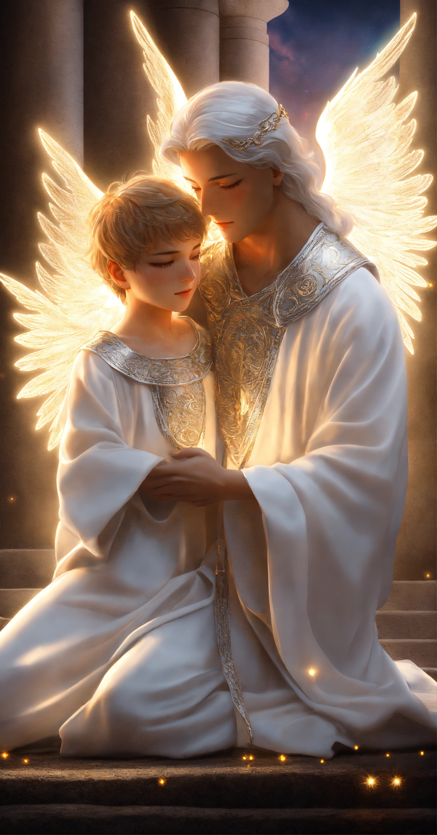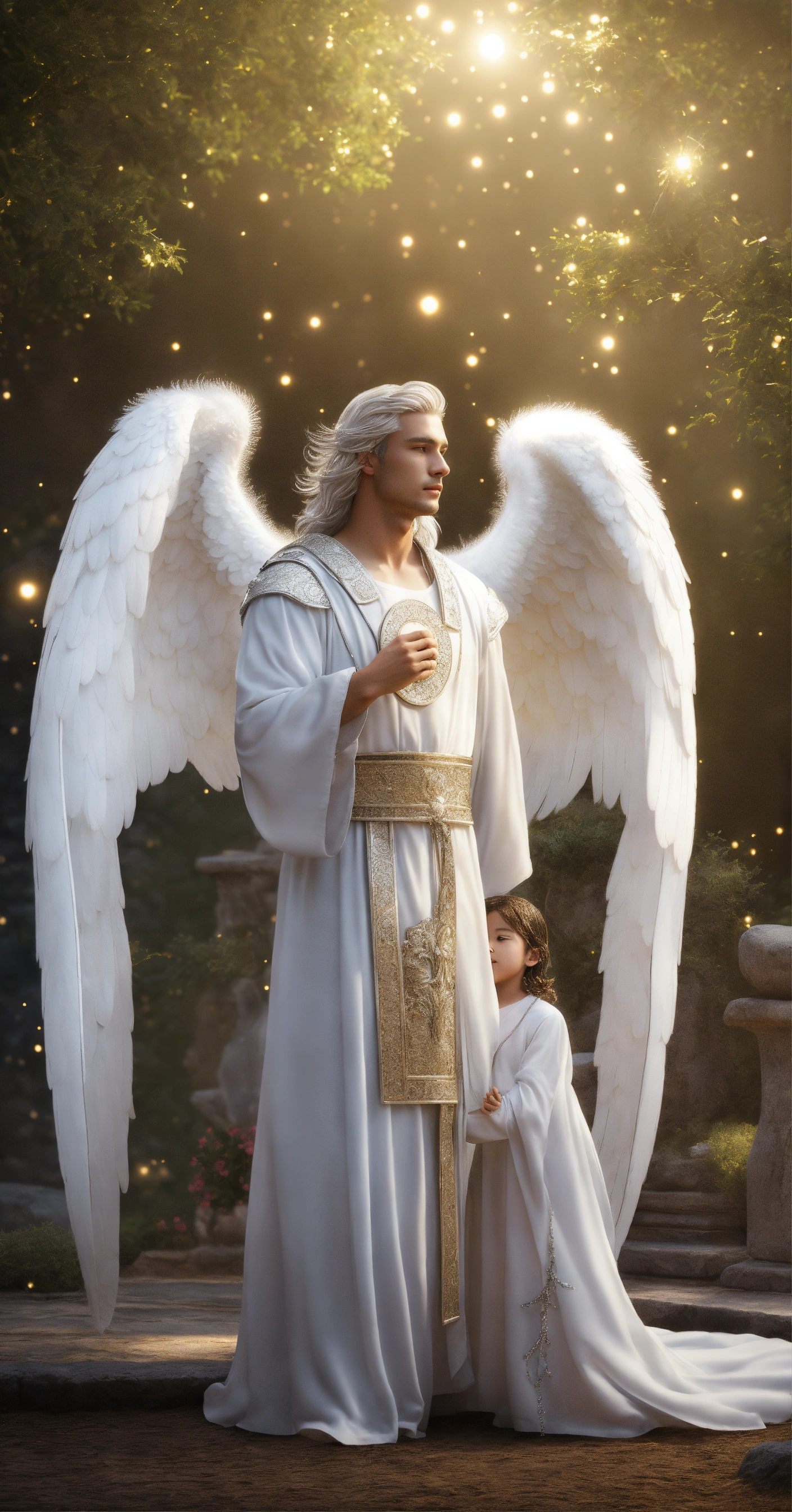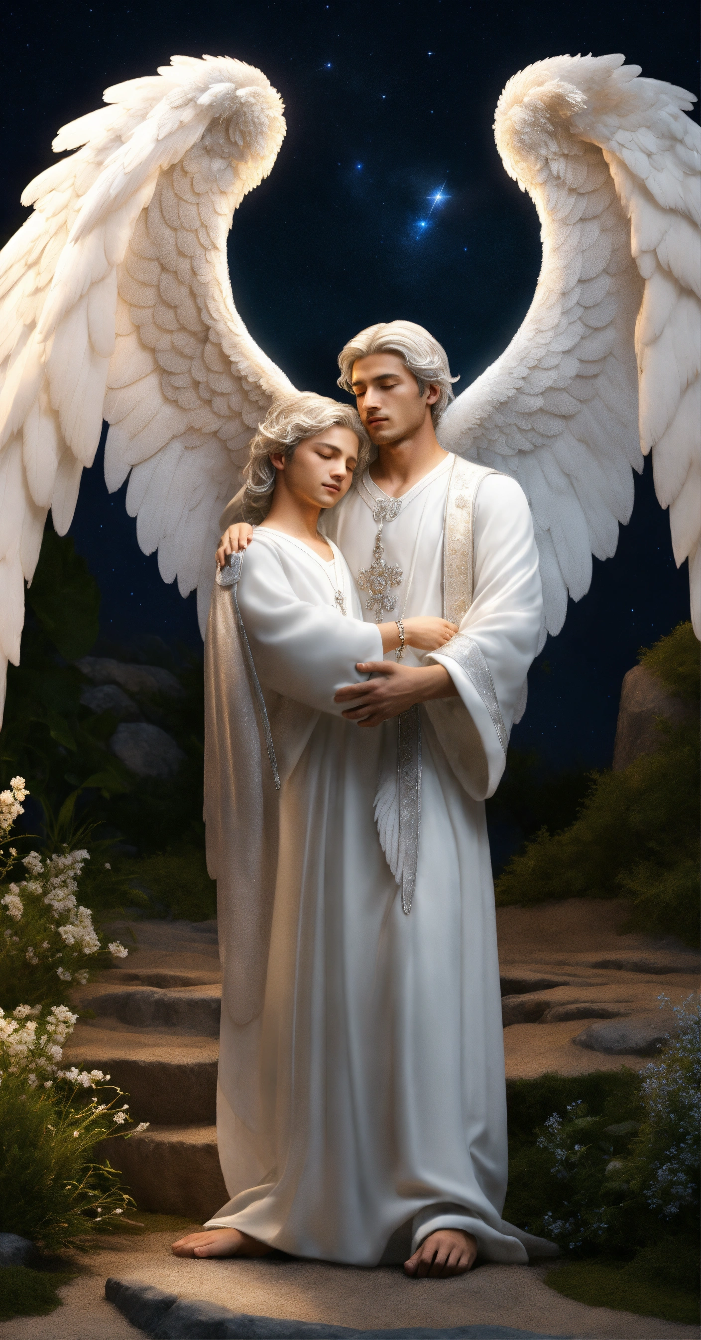 2 male guardian angels with detailed and luminous white angel wings. 1 male angel of 30 years hugging a child angel of 9 years. the 2 male angels have large, uniform luminous white wings. their faces beautiful and detailed. very clear eyes that open with a deep and penetrating look. detailed and manly white hair. white tunic-type dresses with many silver details with luminous sparkles. they are in a beautiful, detailed zen garden with a night sky. hyper-detailed, hyper-realistic illustration. realism. masterpiece. digital art, hd, high quality. high definition, high definition. 8k.