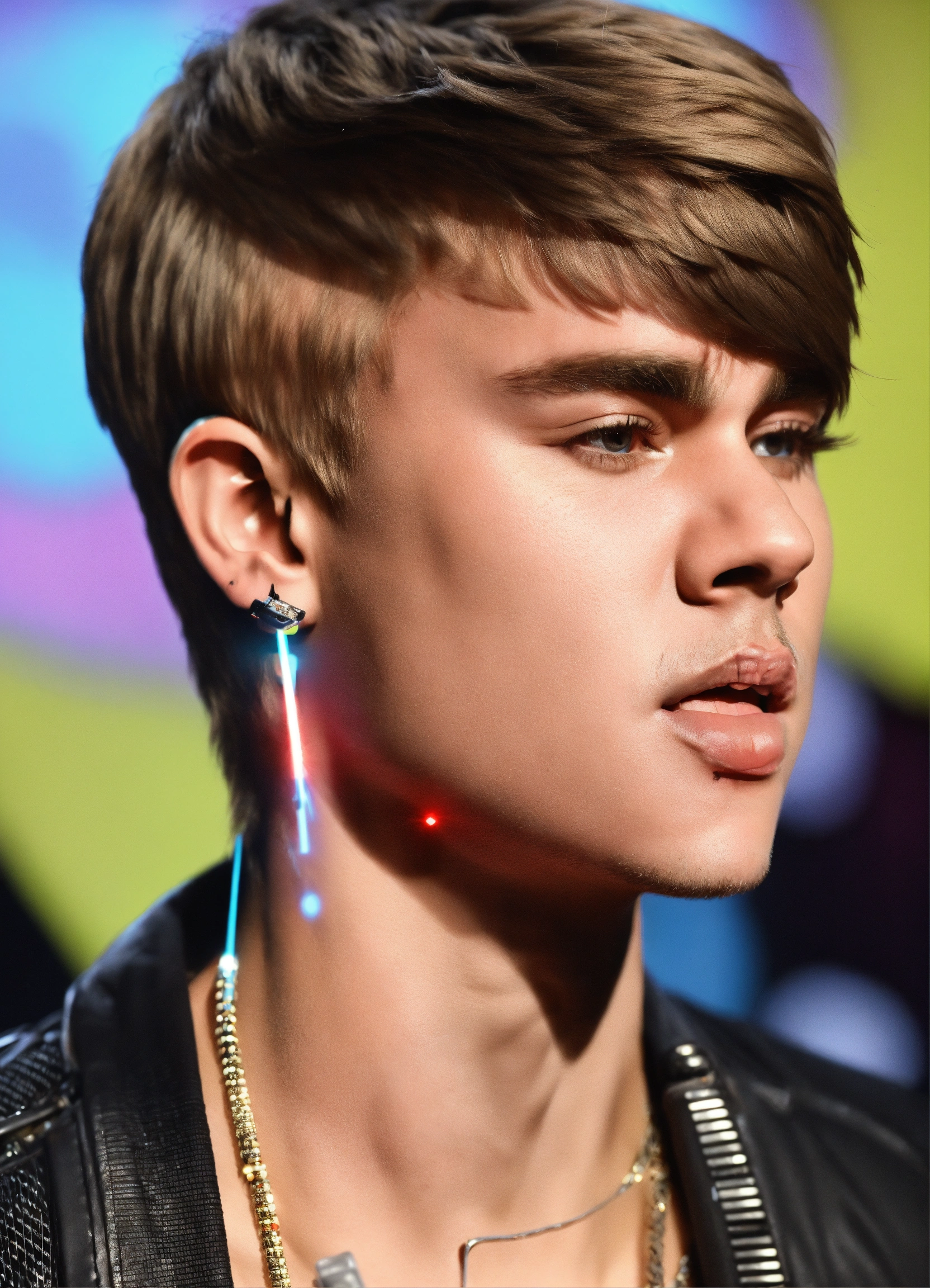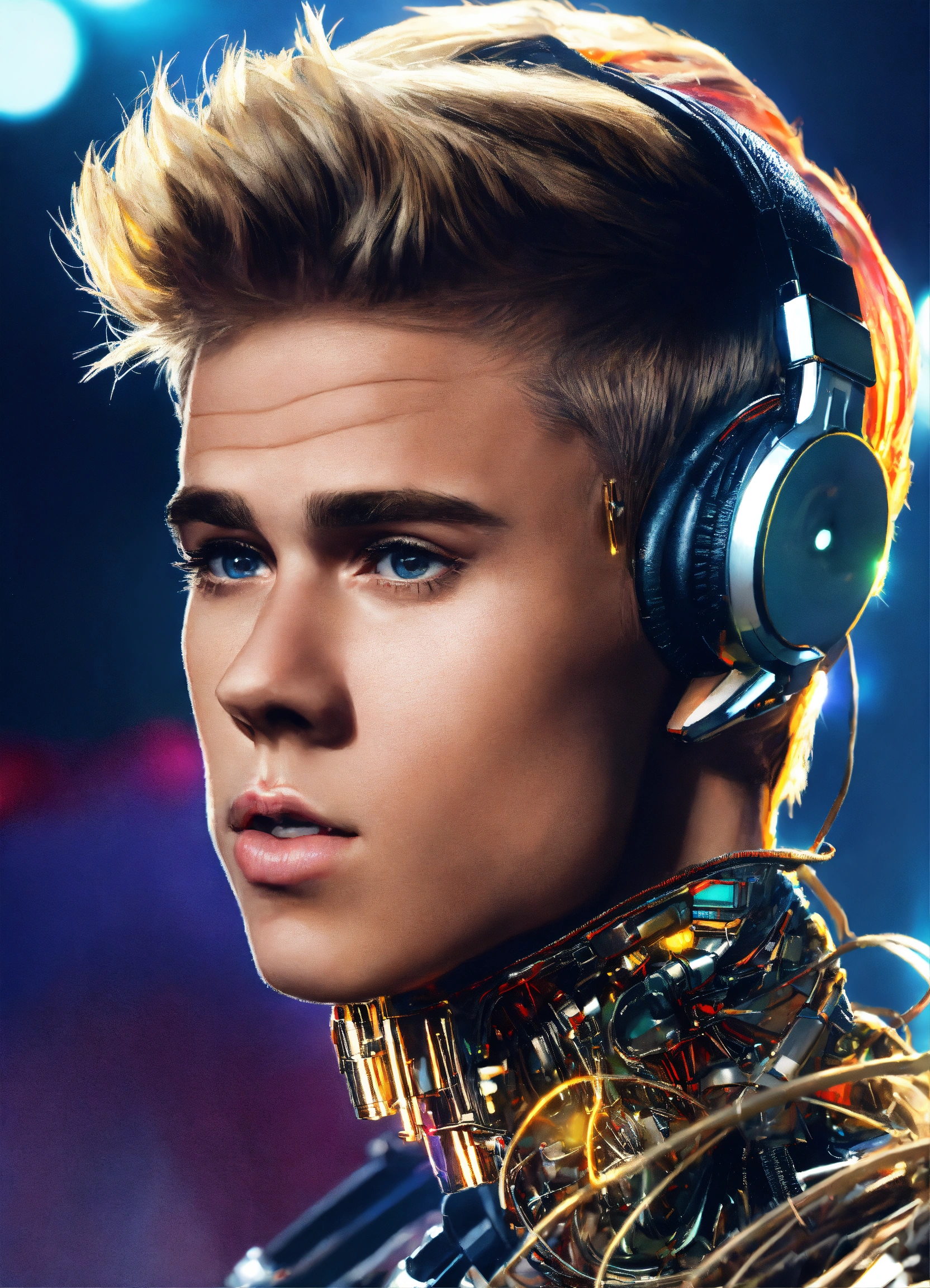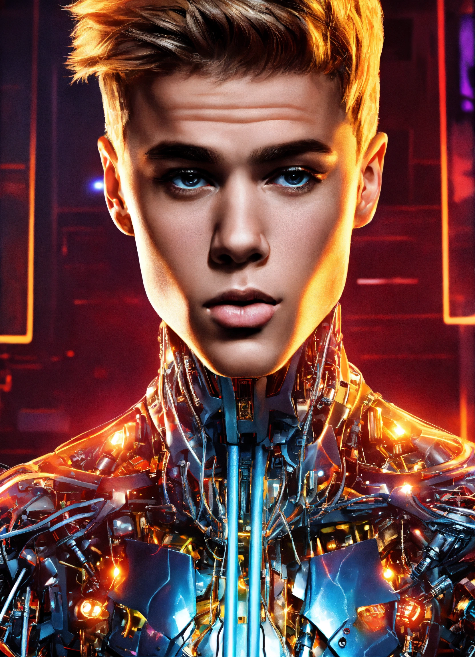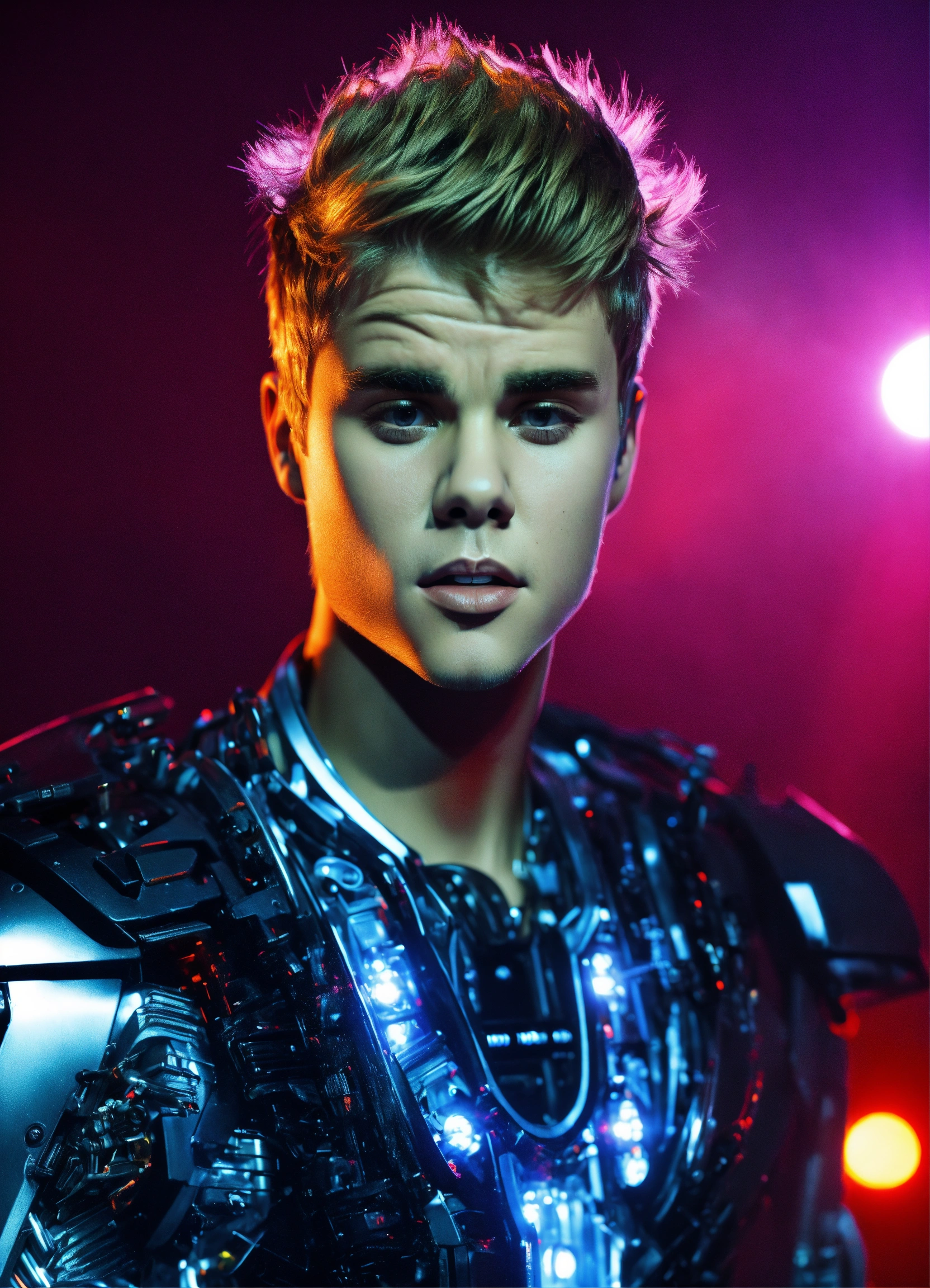 Justin bieber’s cyborg makeover” generate a futuristic image of justin bieber undergoing a transformation into a singing cyborg with laser-powered vocal cords