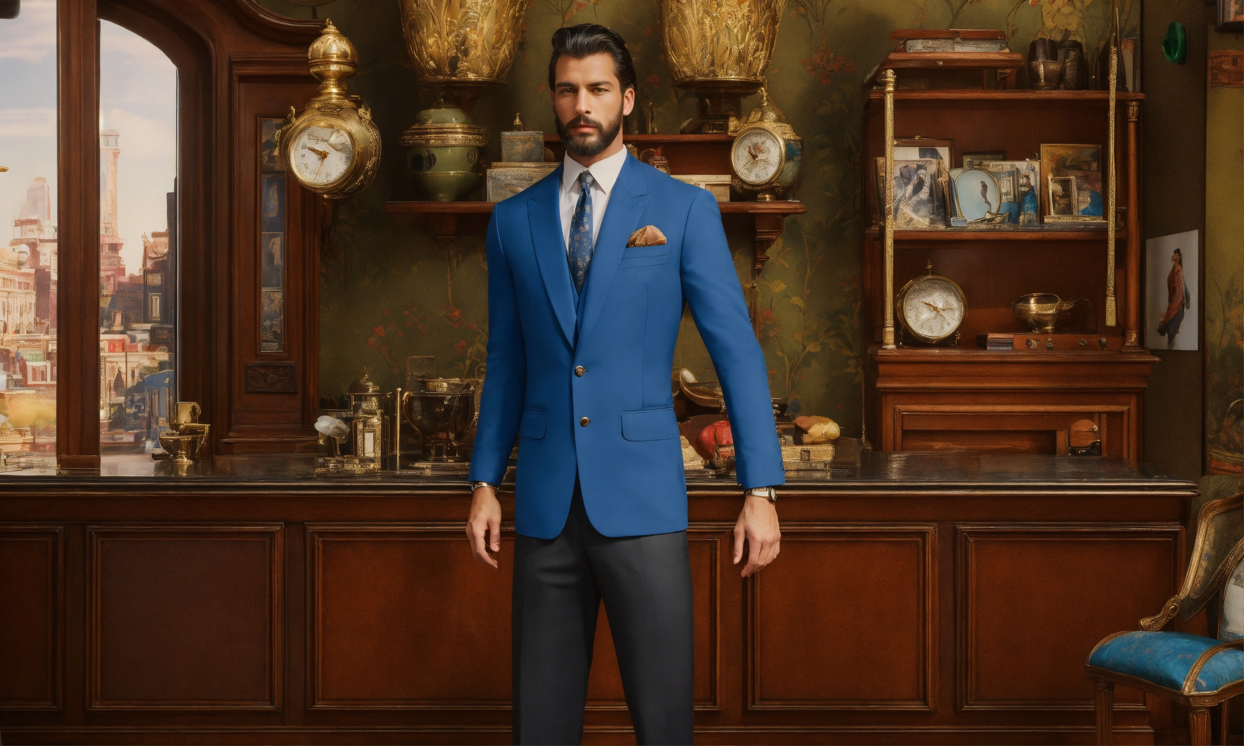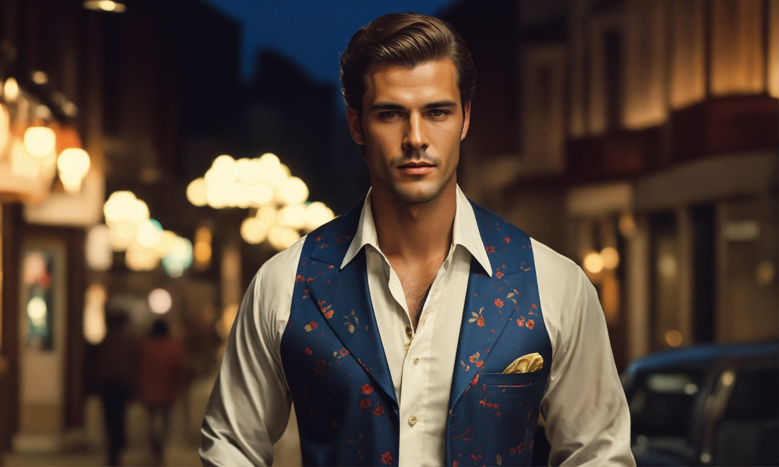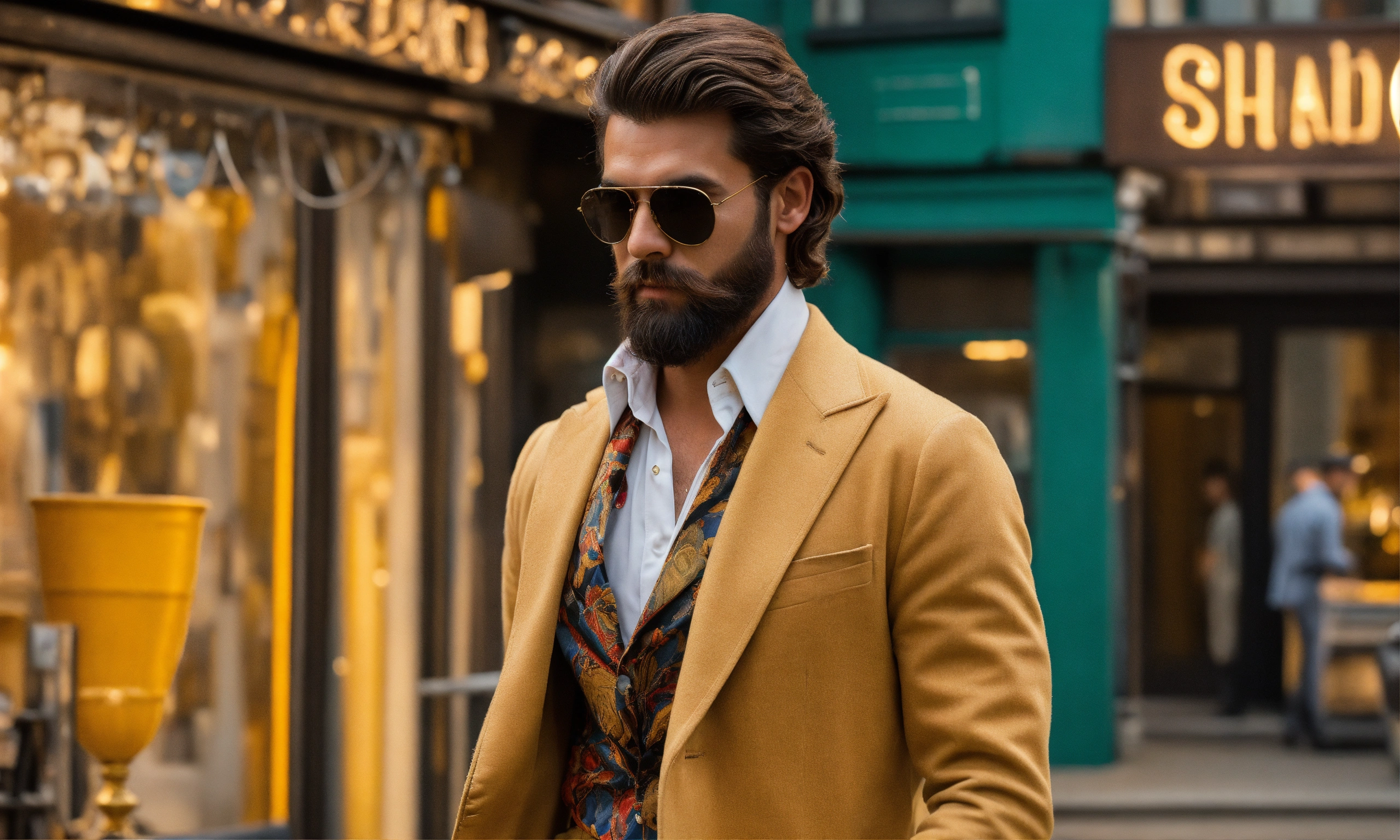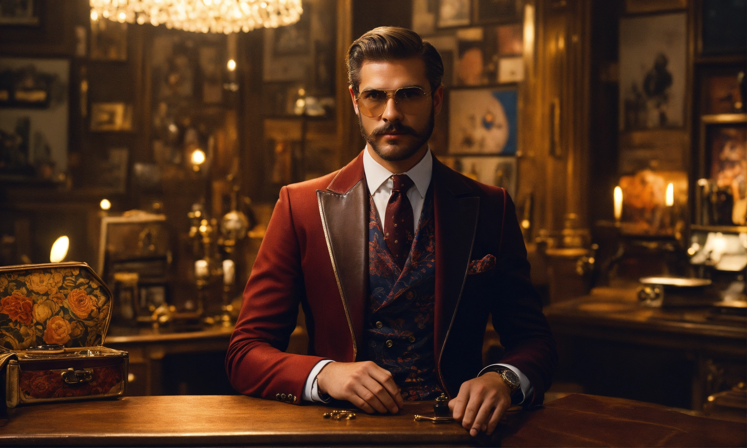 Create a description of a man in the retro usa style from the 1970s to 1990s, depicting him without glasses in his everyday life. imagine him as a stylish gentleman with meticulously groomed hair and a well-kept beard. describe his vintage-inspired wardrobe, featuring well-fitted trousers, fashionable wide-lapel jackets, and eye-catching printed shirts. pay attention to the intricate details, including the use of sleek leather bags and metallic-bracelet watches as accessories. emphasize the richness of the background with a diverse array of elements that resonate with the era, such as antique furniture, classic automobiles, vinyl records, and other paraphernalia from that period, creating an atmosphere of nostalgia and cultural abundance. man have black eyes"