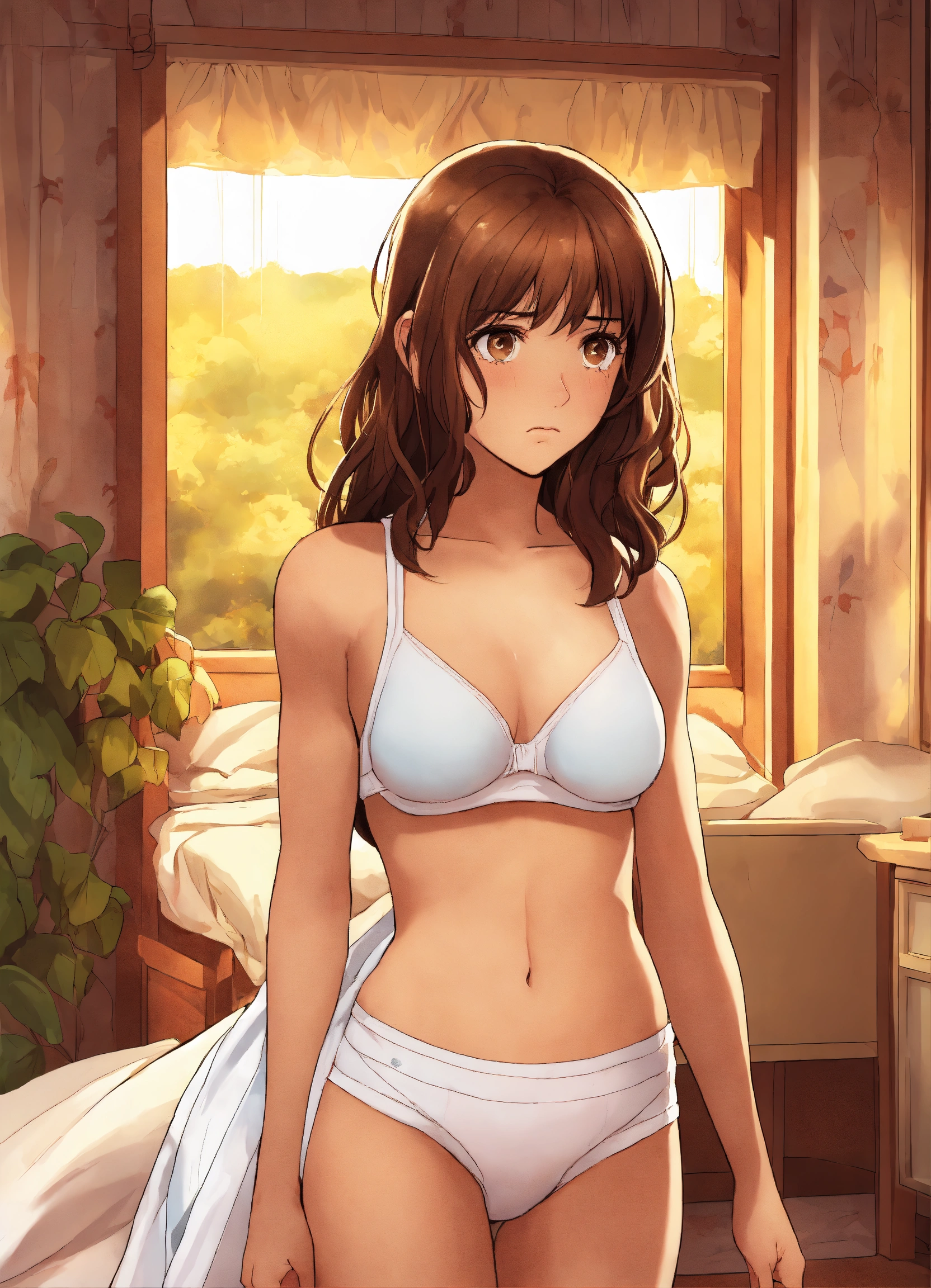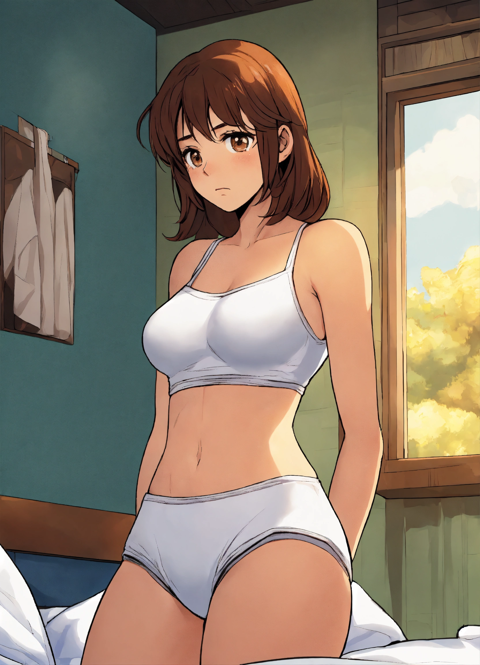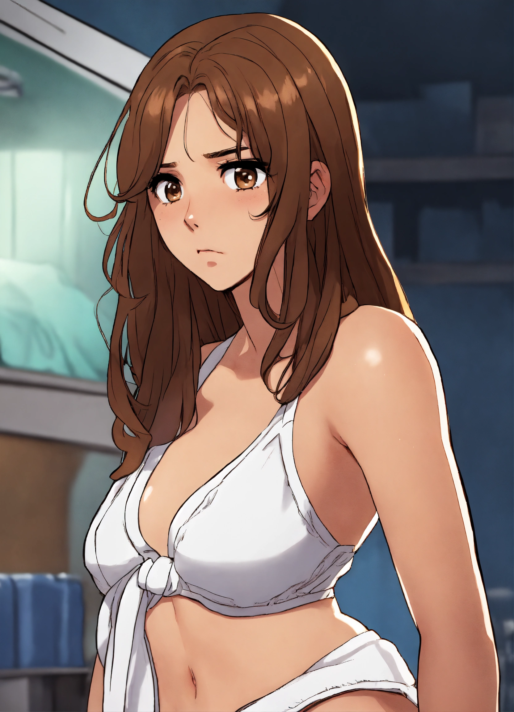Comic character, sad, 19 years old, brown hair, brown eyes, holding a towel in front of her, white padded briefs, standing from behind, full body