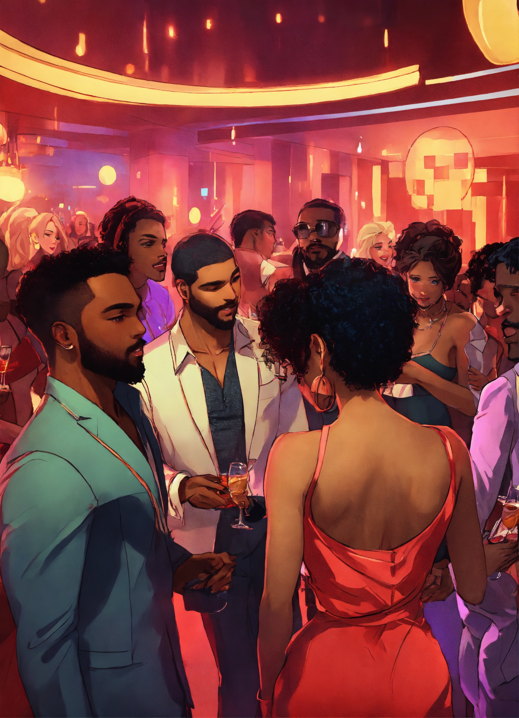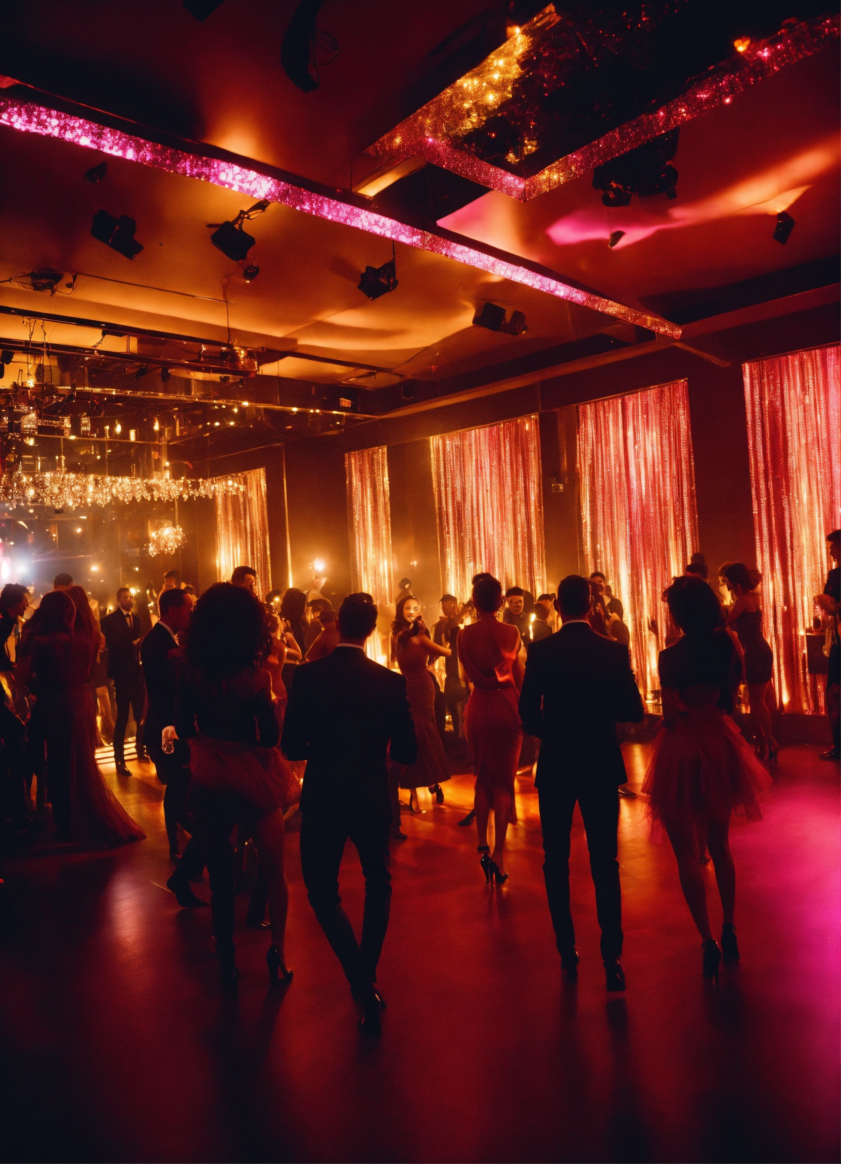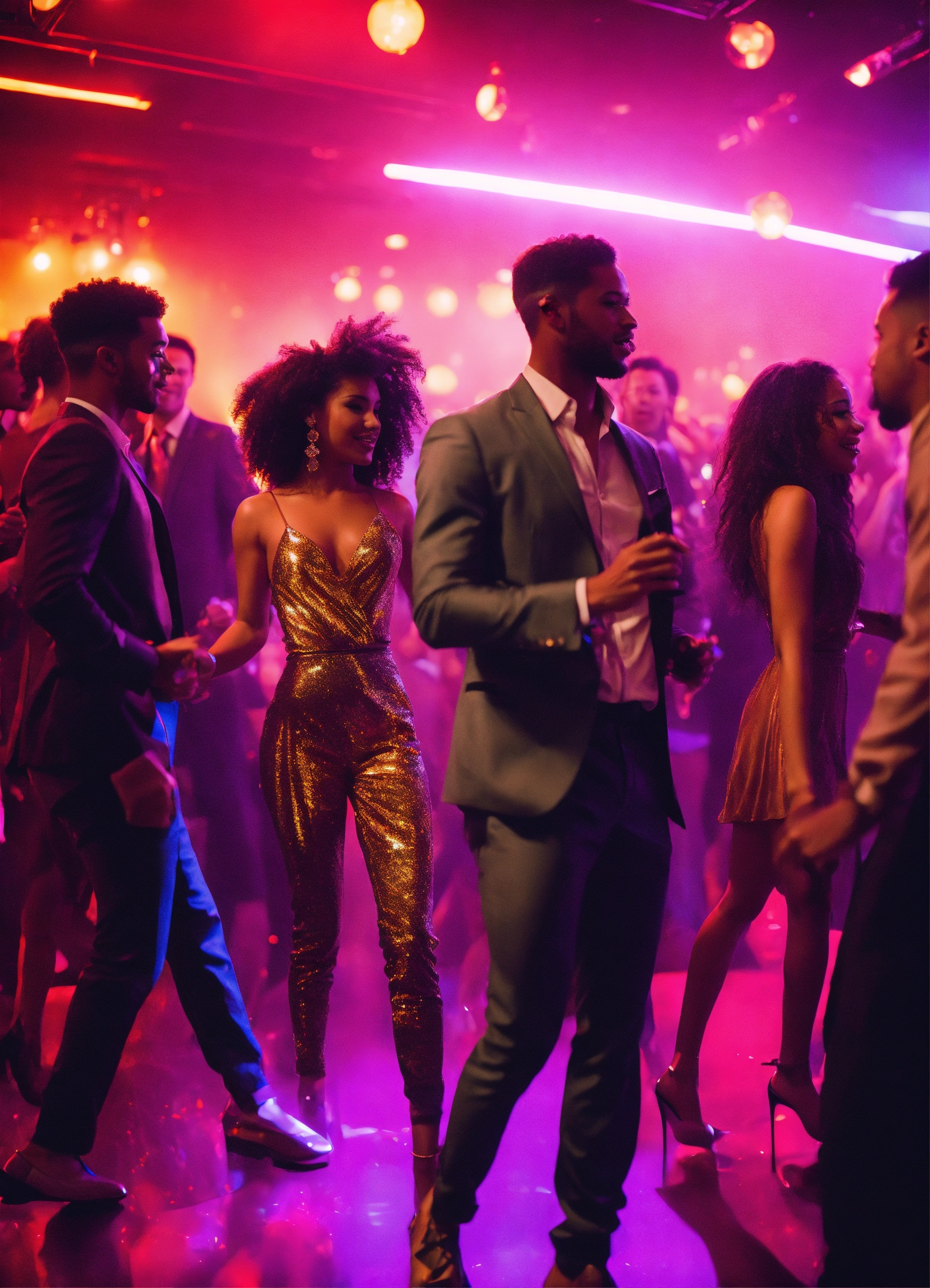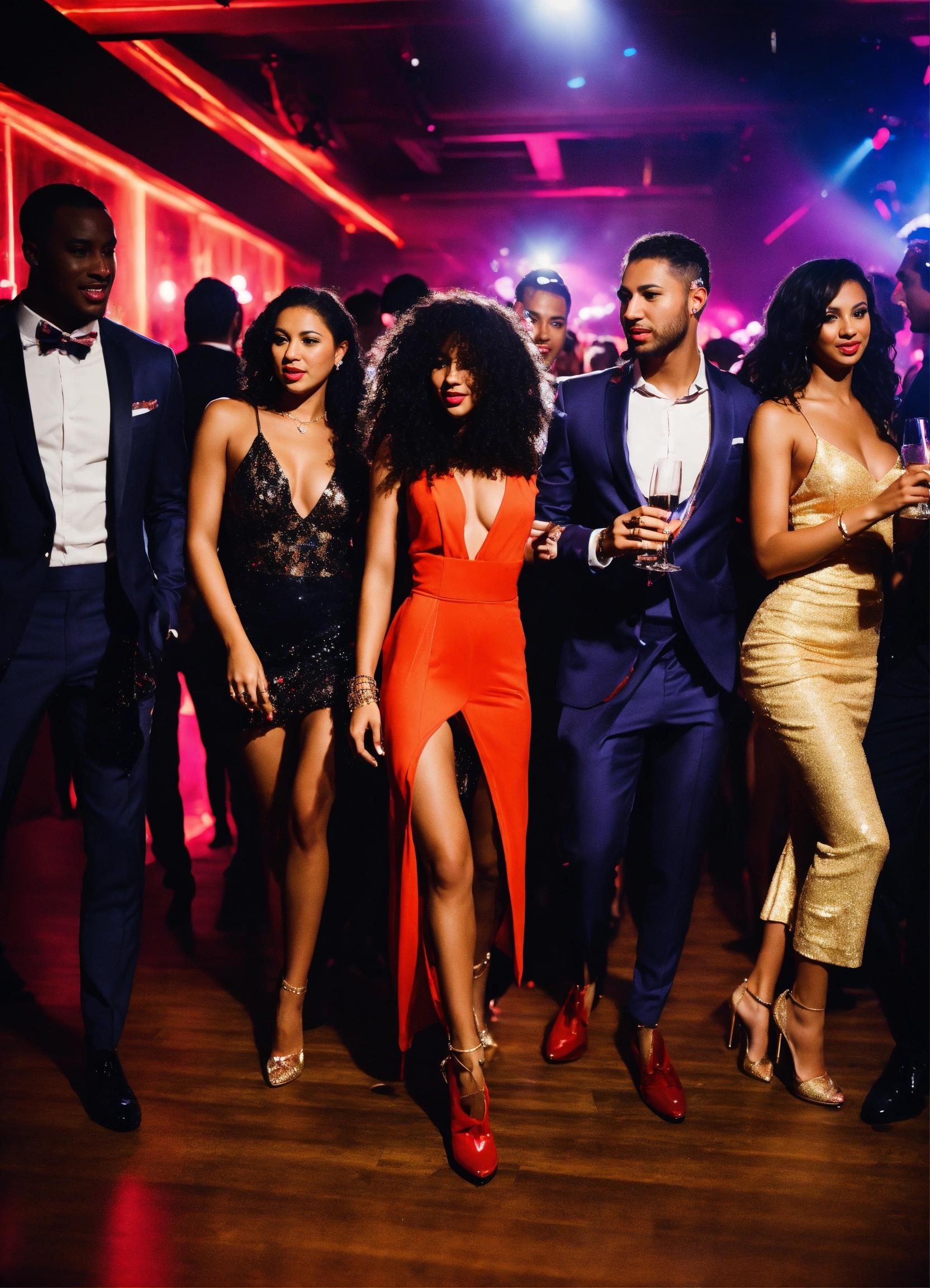 A wide shot of mixed raced people partying upscale attire nightclub dancing party scene