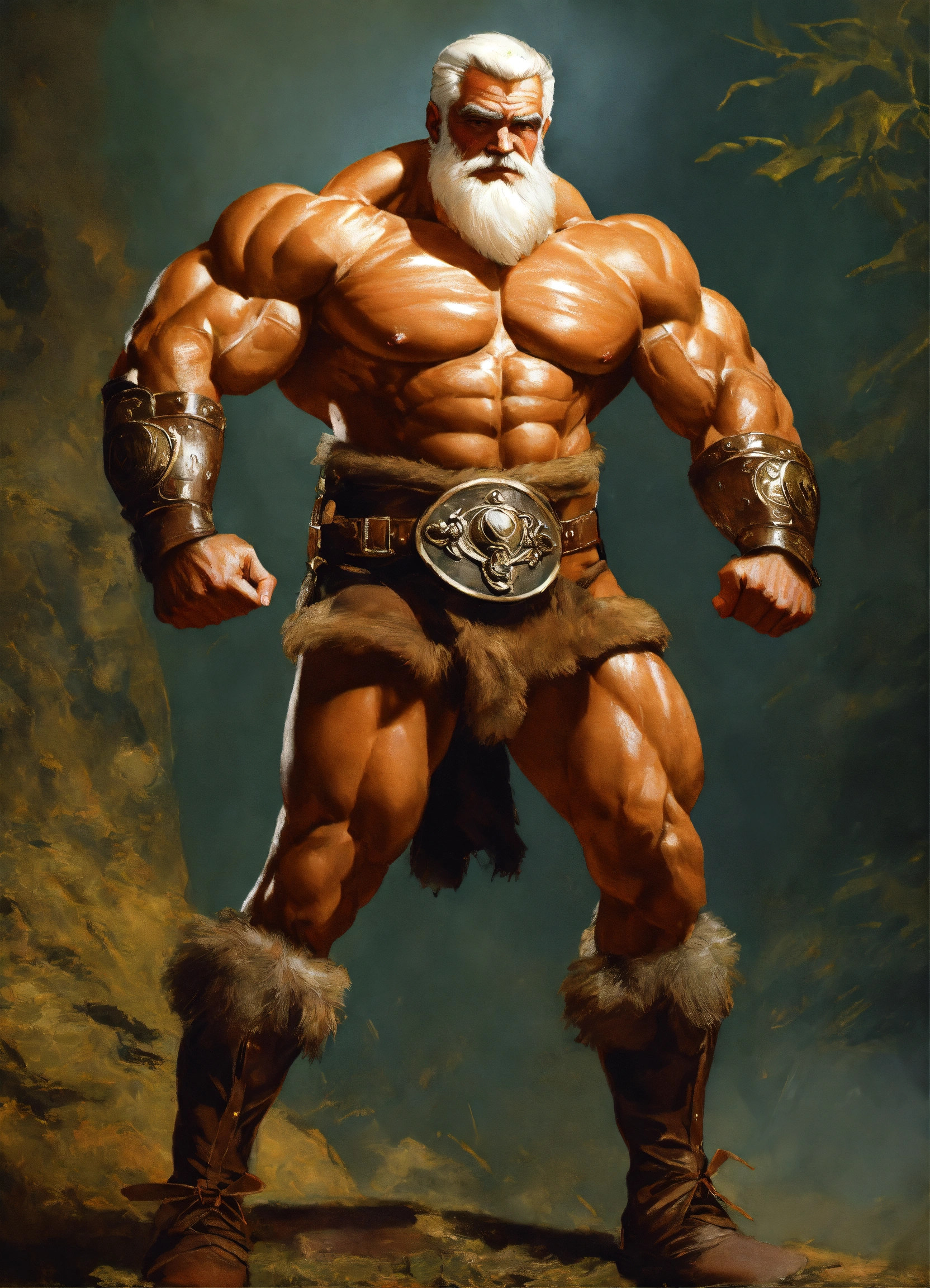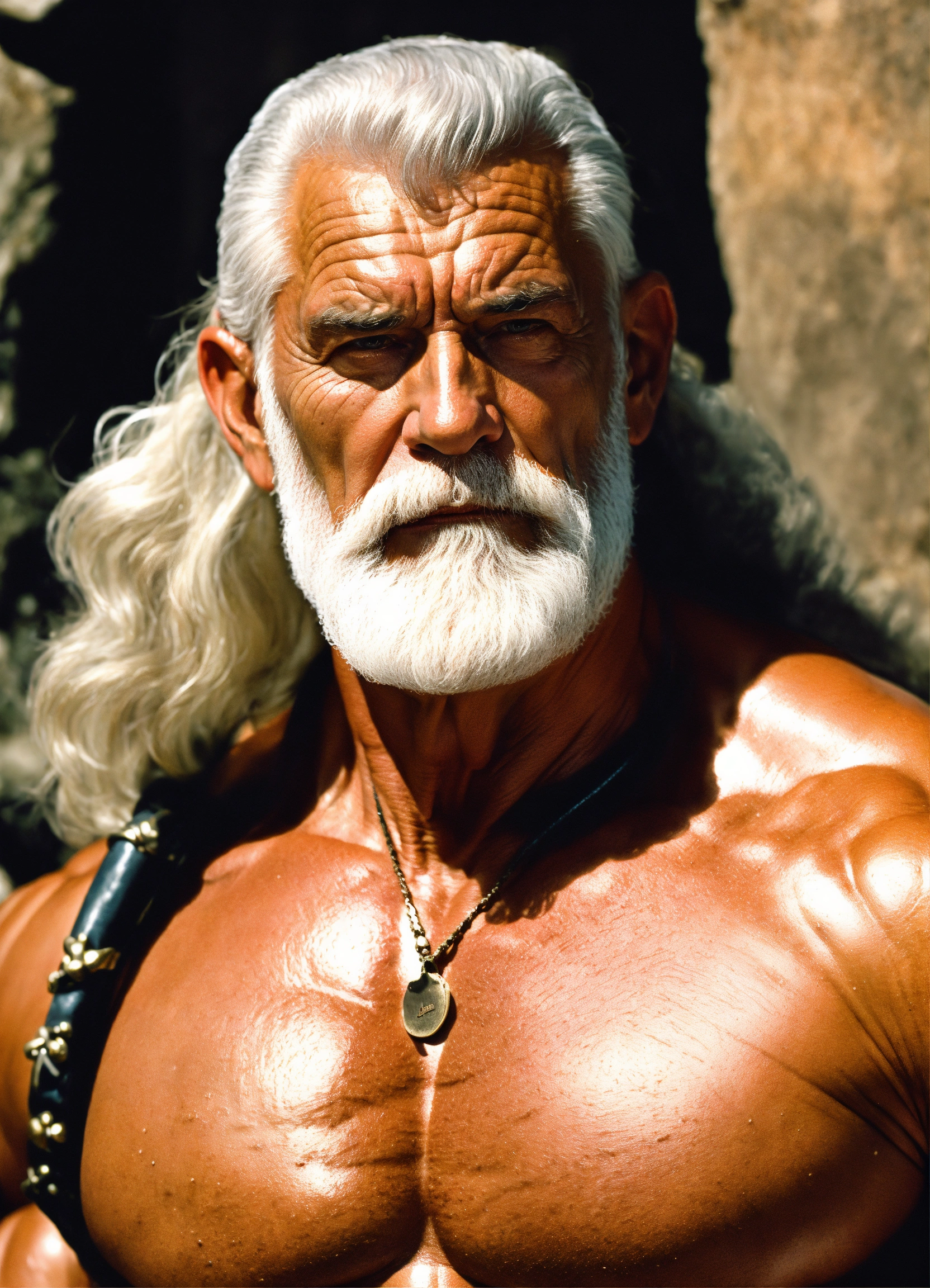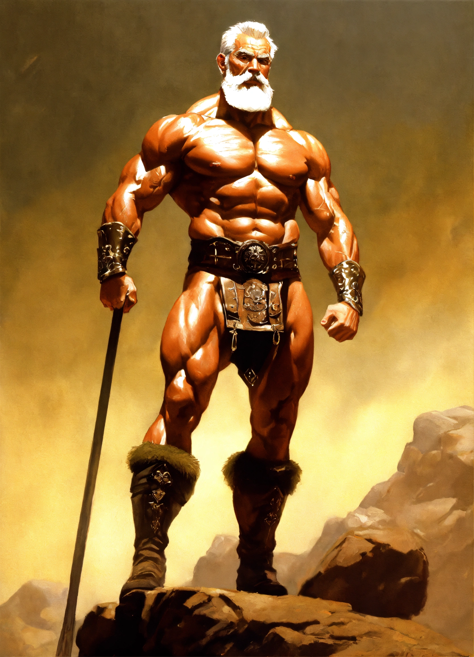 Handsome old man, warlord wearing bronze age clothing, bodybuilder, ultra high quality, ultra high definition, very massive muscle, 16k, photograph photorealistic by frank frazetta, whole body, shiny skin, wrinkled old face, white short hair, white beard, the exact body, the exact muscles