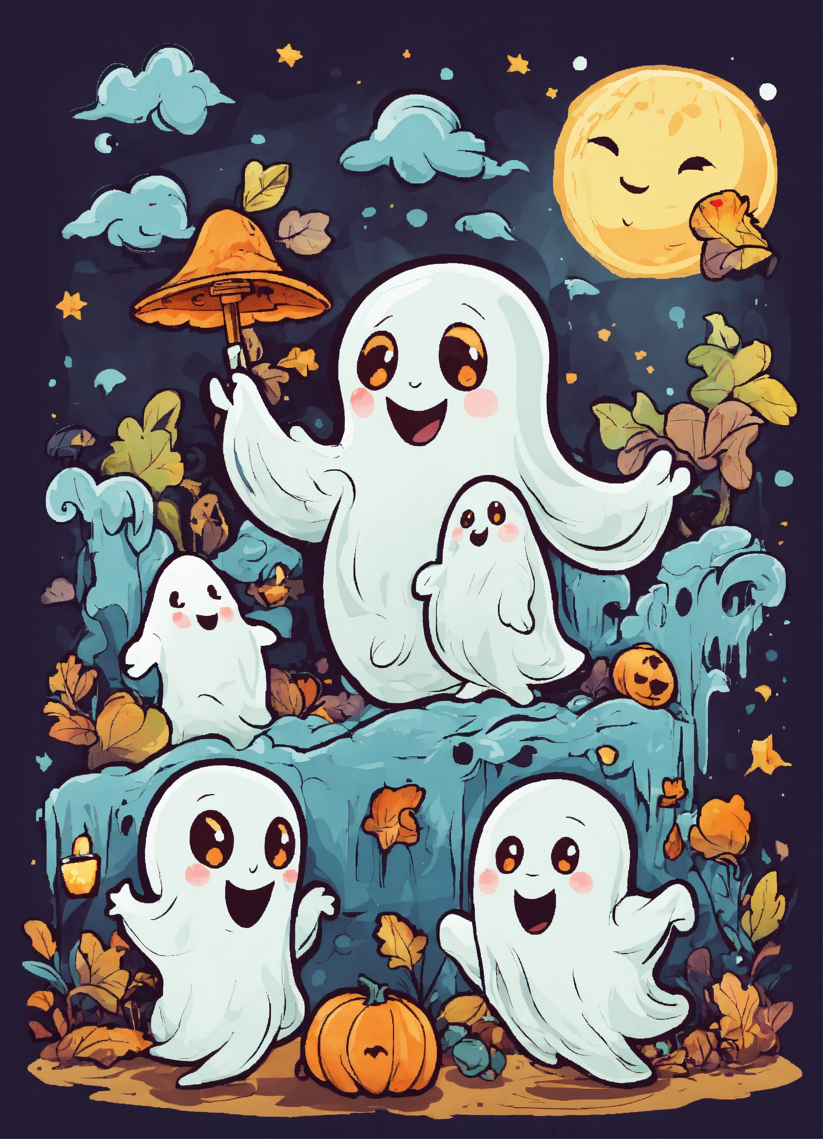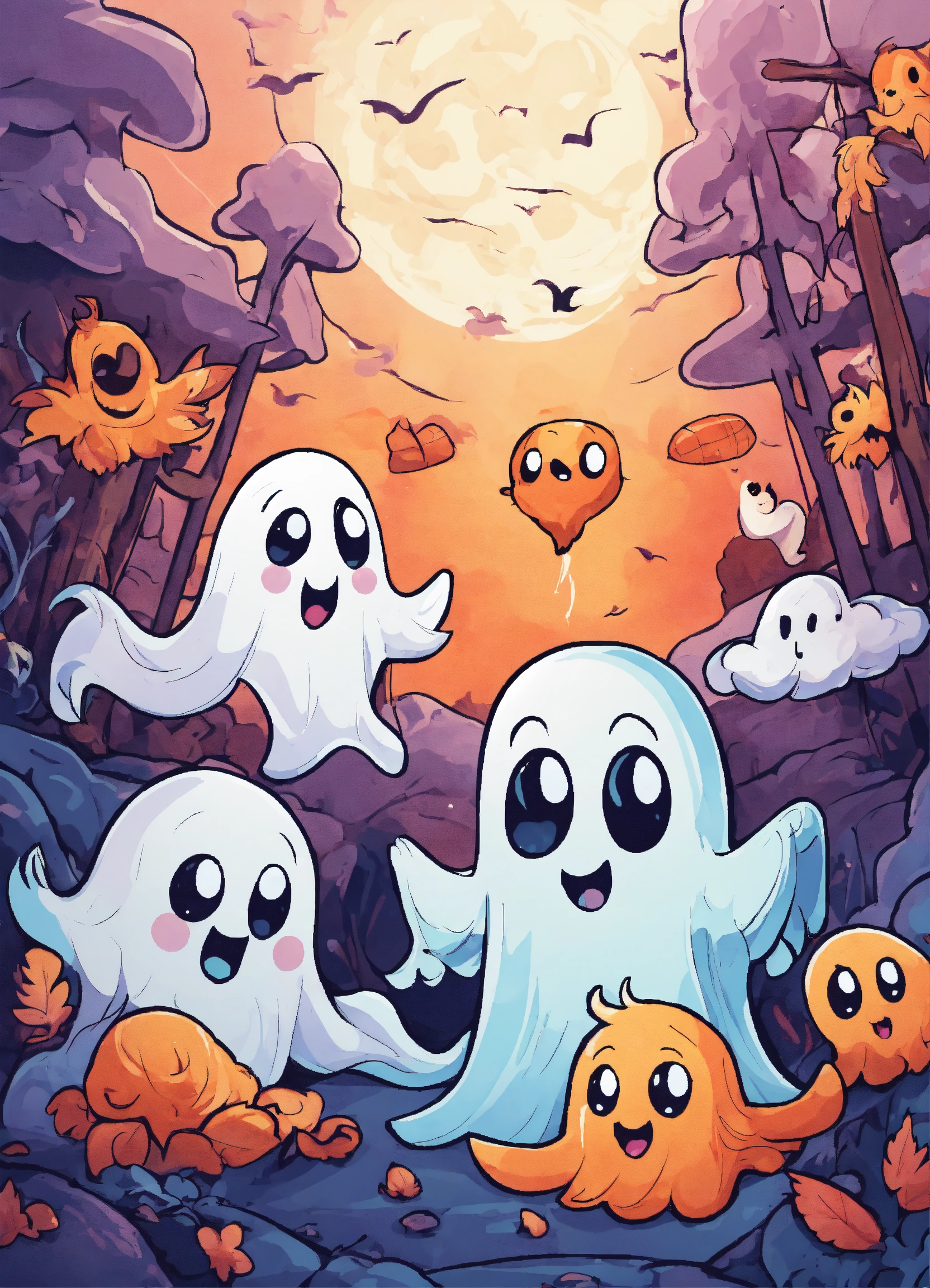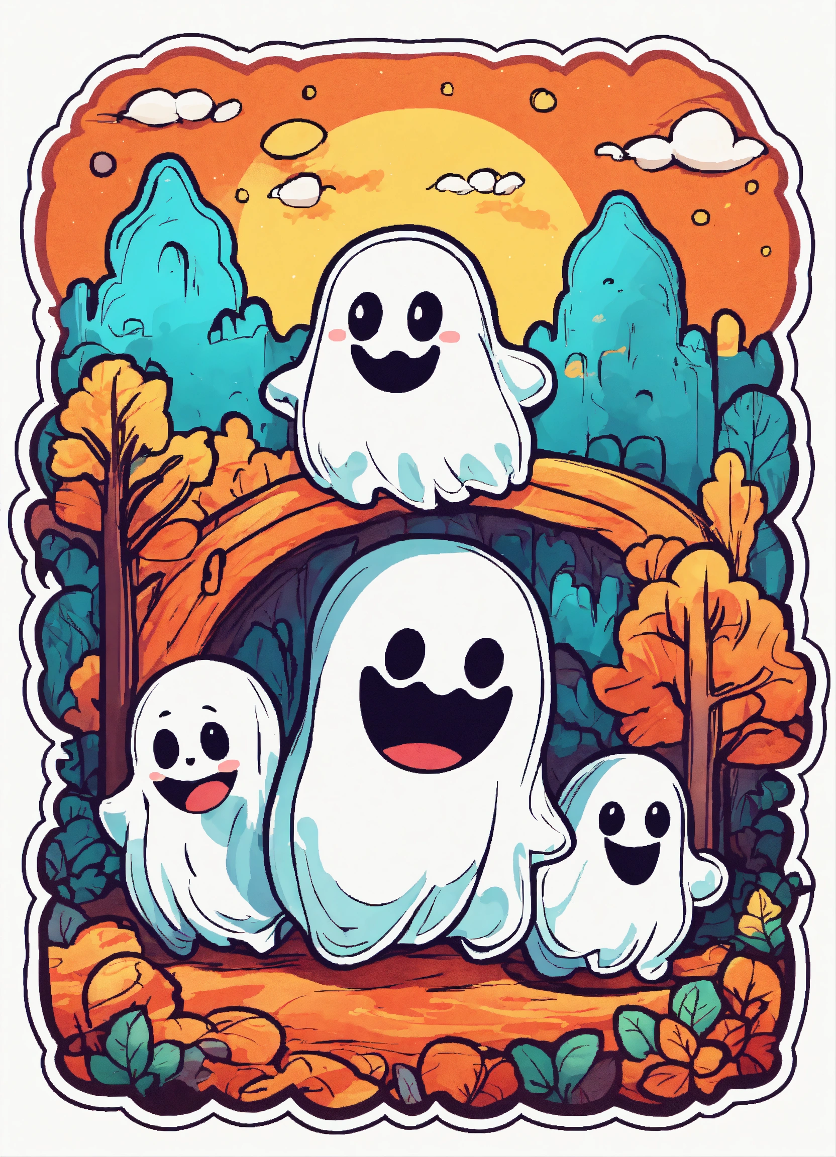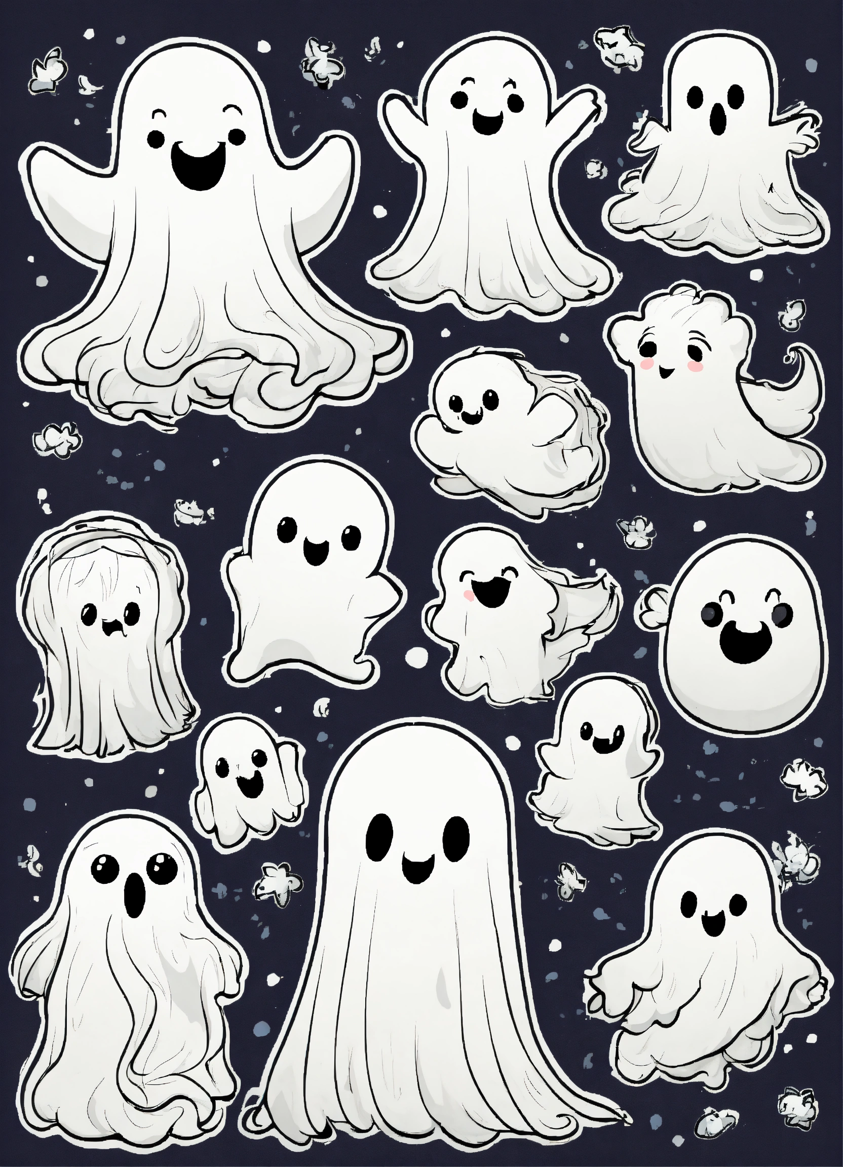 Generate a cute playful ghosts illustration, 4k resolution, cartoon-sticker style with clear lines on a pure white background suitable for a children's coloring book.