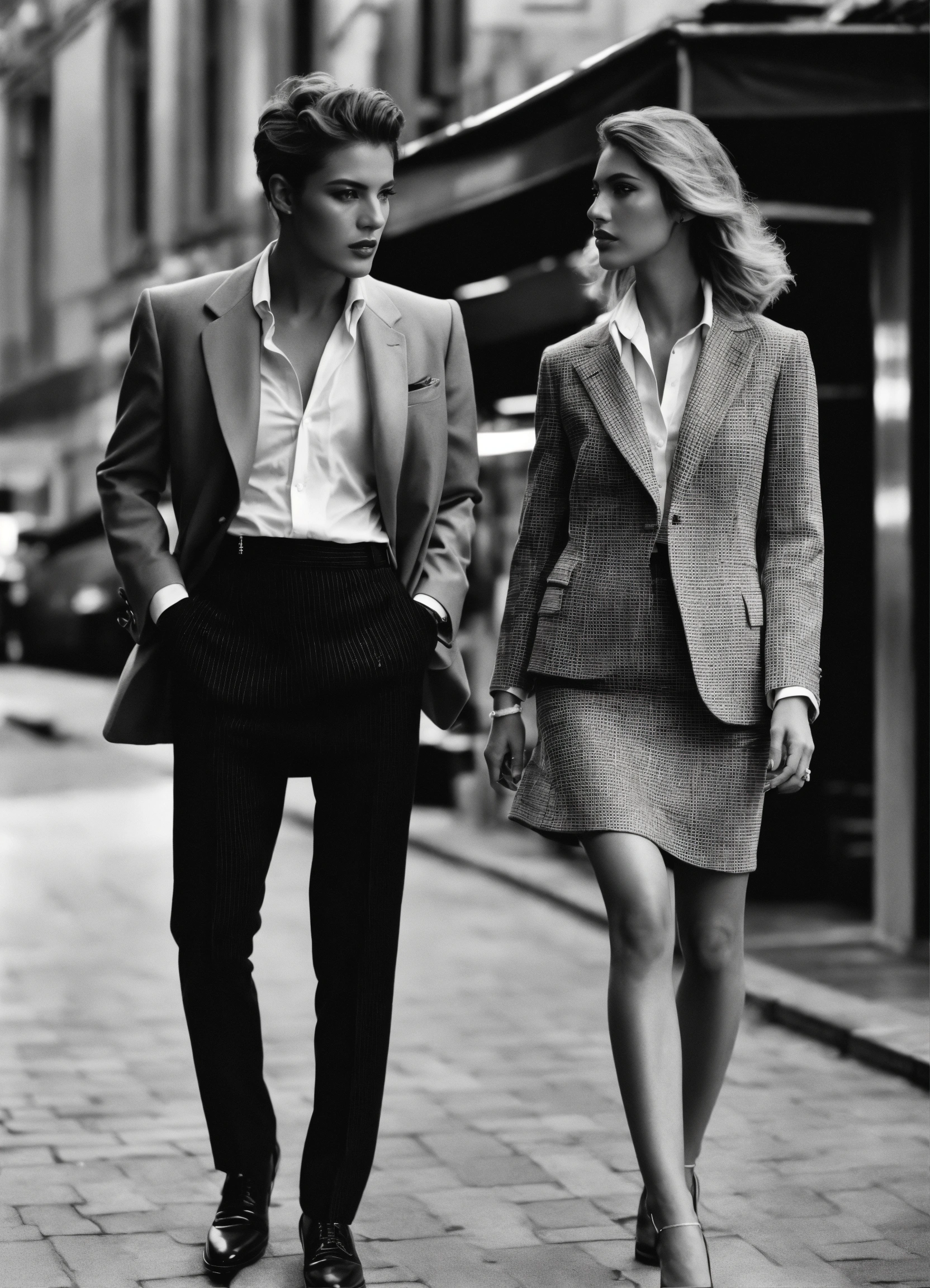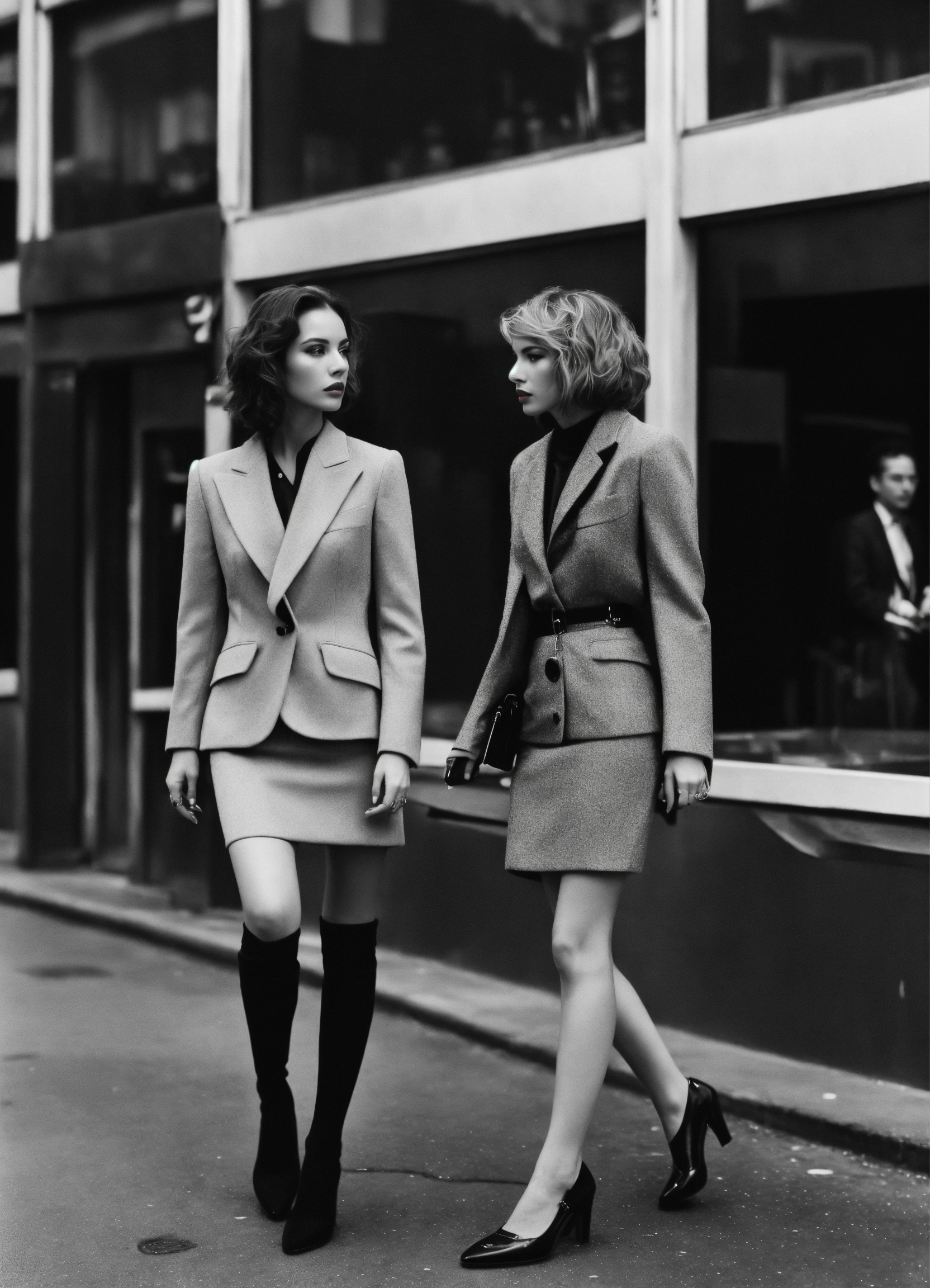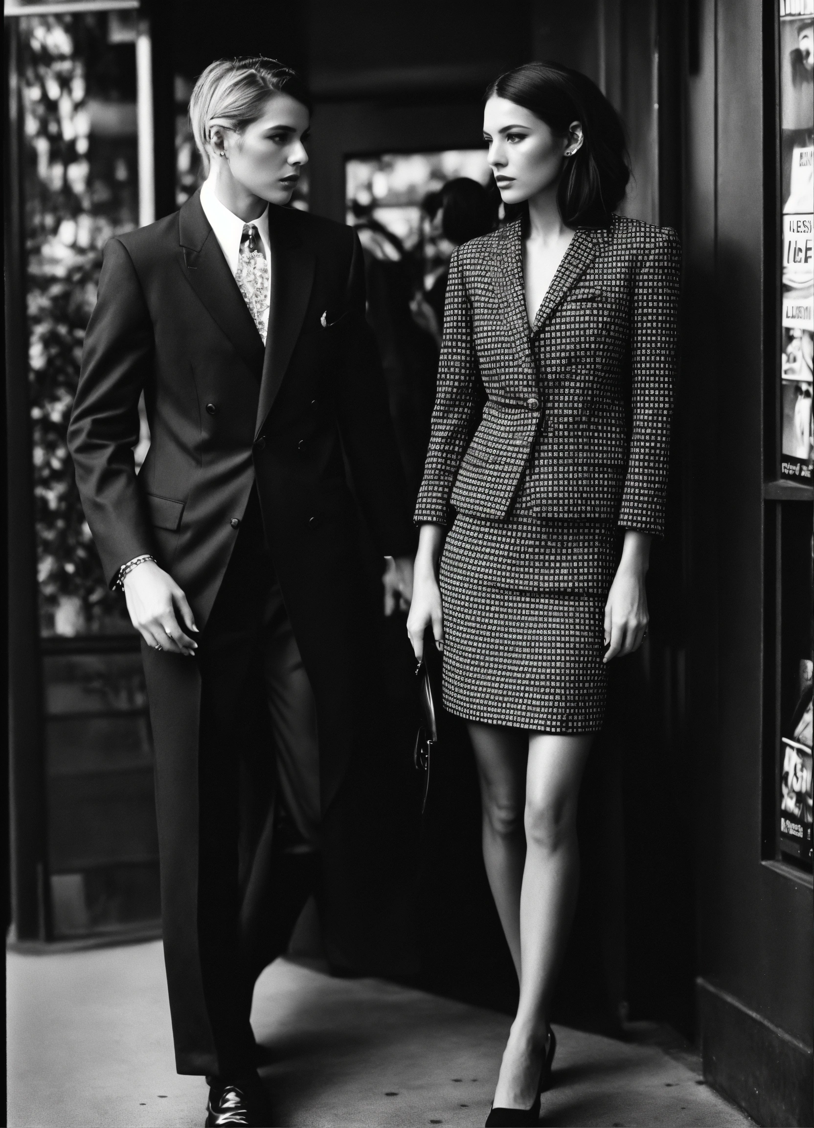 Extremely detailed photographic image, grained image, beautifully composed, monochrome image, 00's fashionable image, fashionable magazine photography, leica summicron 35mm f2.0, kodak 400tx, fashion photography, fashionable model, senior adult realistic realistic adult in a suit with mini skirt, facing each other with no intimacy